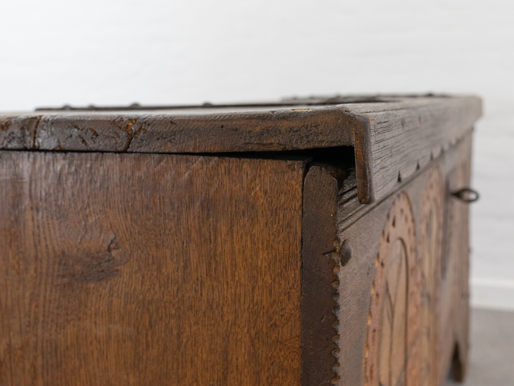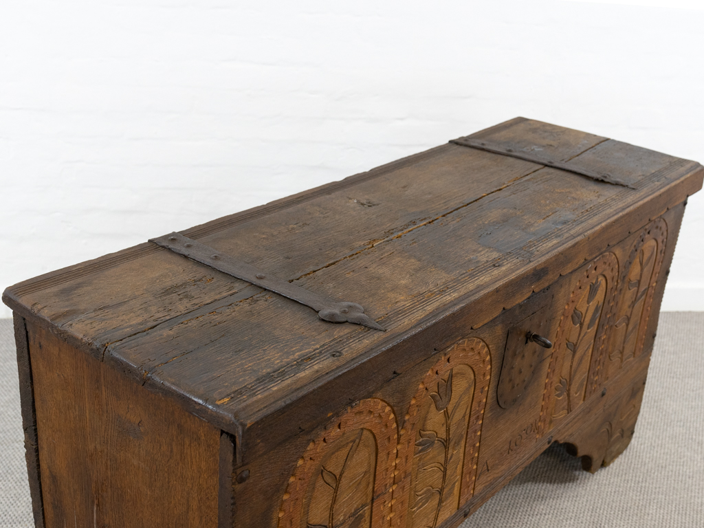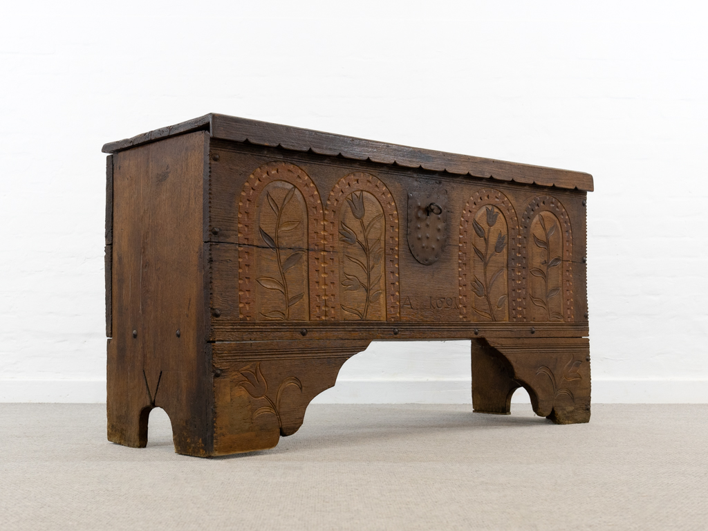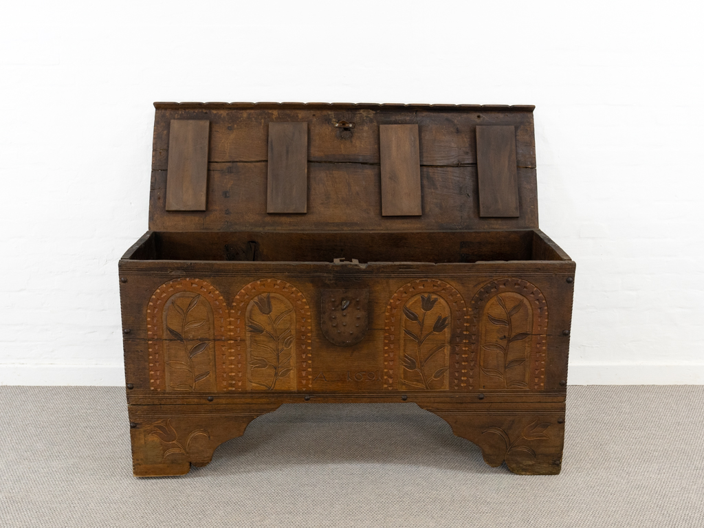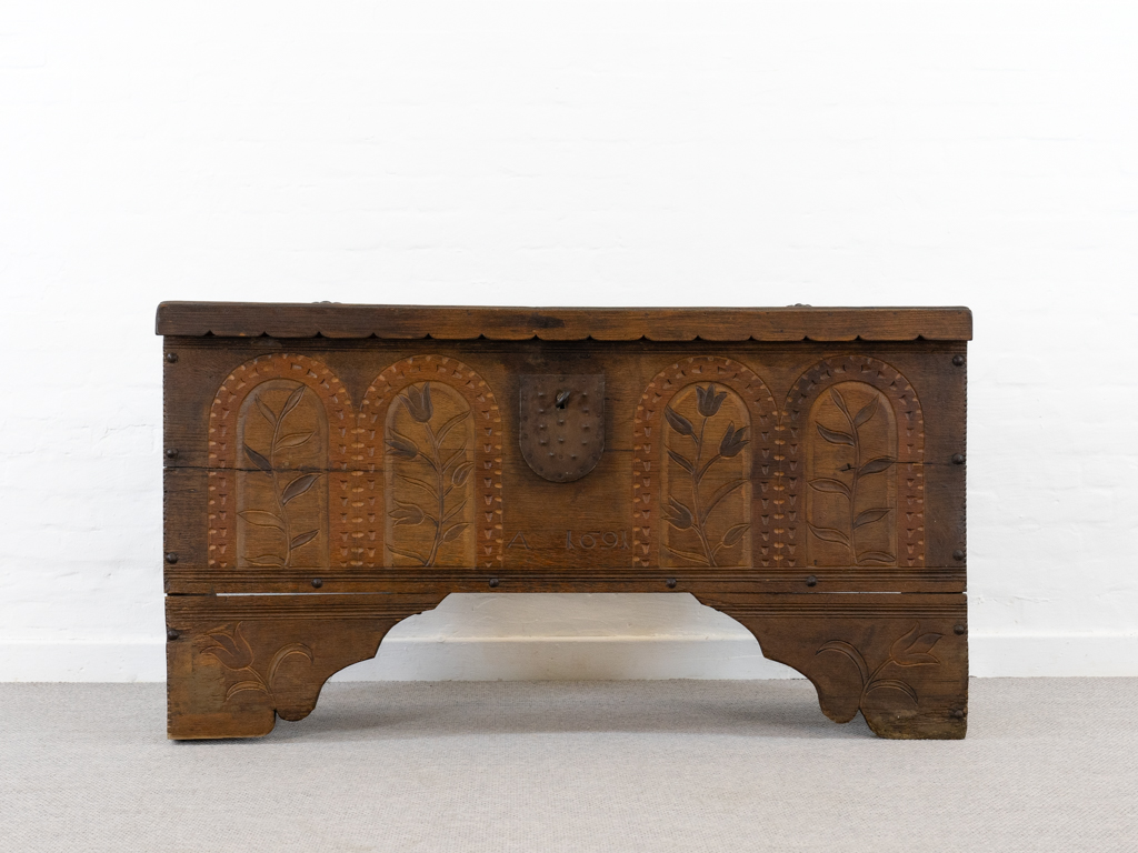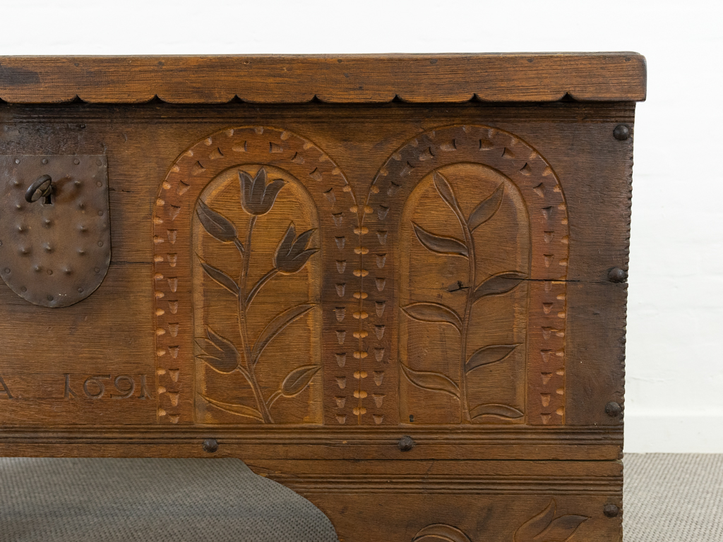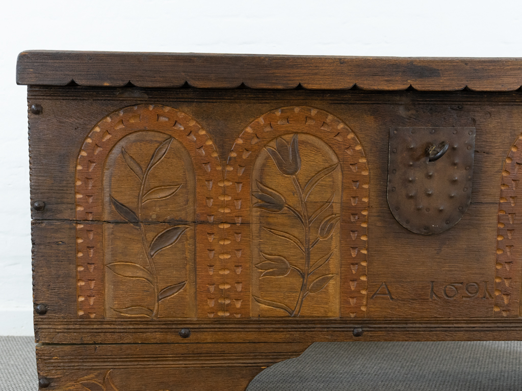Antike Flachdeckeltruhe aus dem 17. Jahrhundert. Renaissance-Frühbarock. Gefertigt 1691 in Eichenholz. Die Truhe war bis vor kurzem durchgängig 333 Jahre im Besitz einer niedersächsischen Anwaltsfamilie, die ursprünglich aus dem Raum Königsberg stammt. Die Front zeigt vier Arkaden mit floralen Schnitzereien. Original funktionierendes Schloss mit Schlüssel. Tolle Alterspatina. Der Deckel wurde innenseitig mit zusätzlichen Hölzern verstärkt. Das vordere linke Standfläche ist stärker abgenutzt, dadurch kippelt die Truhe etwas.
