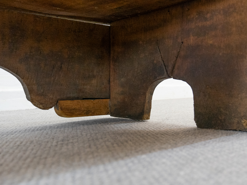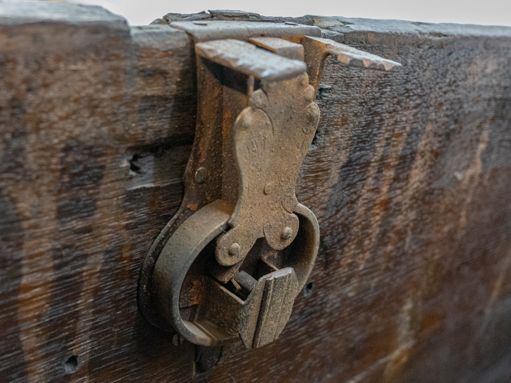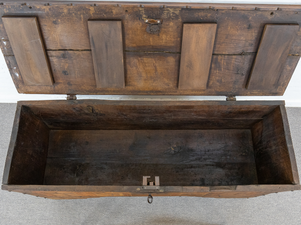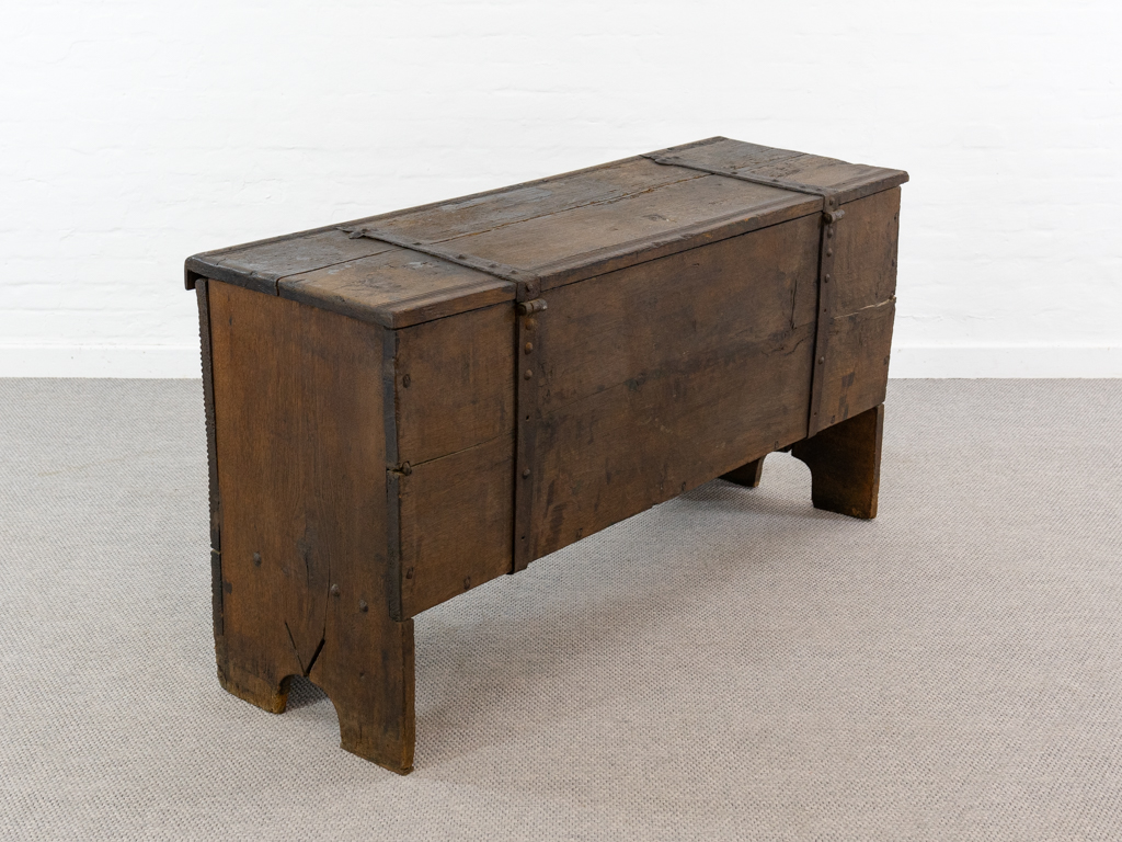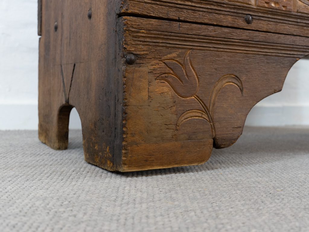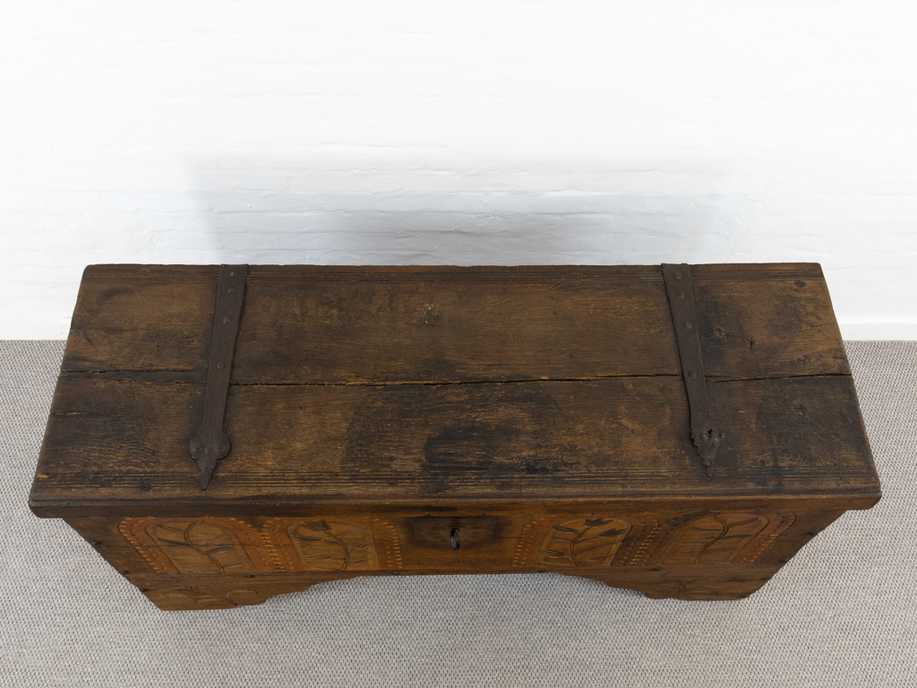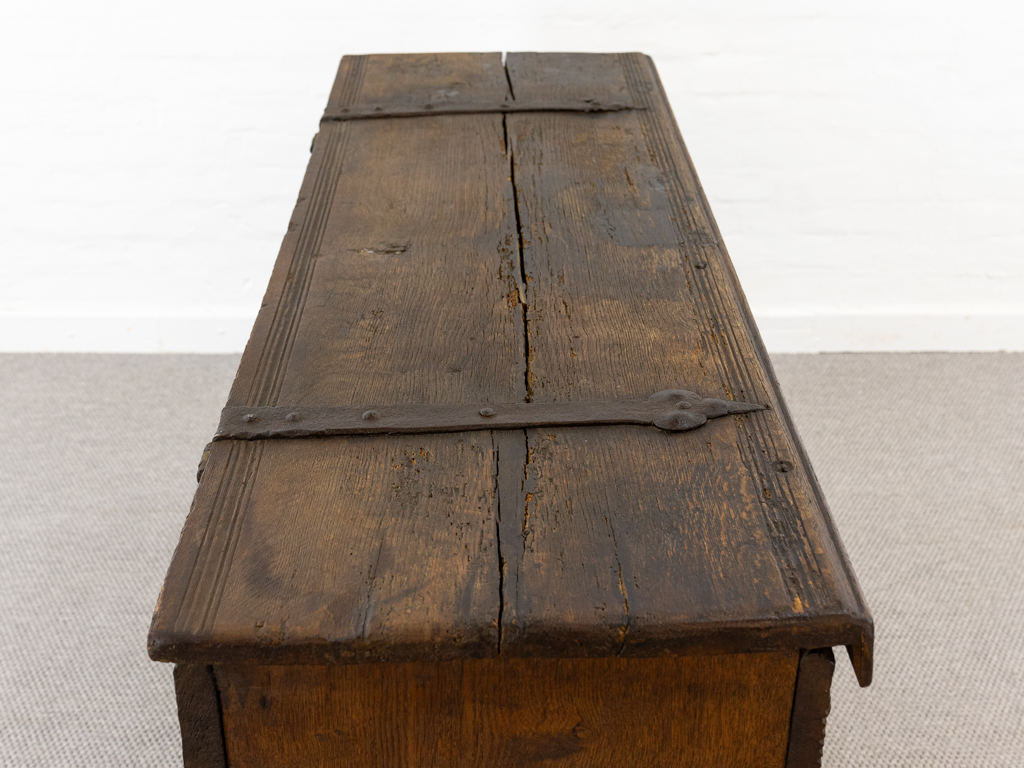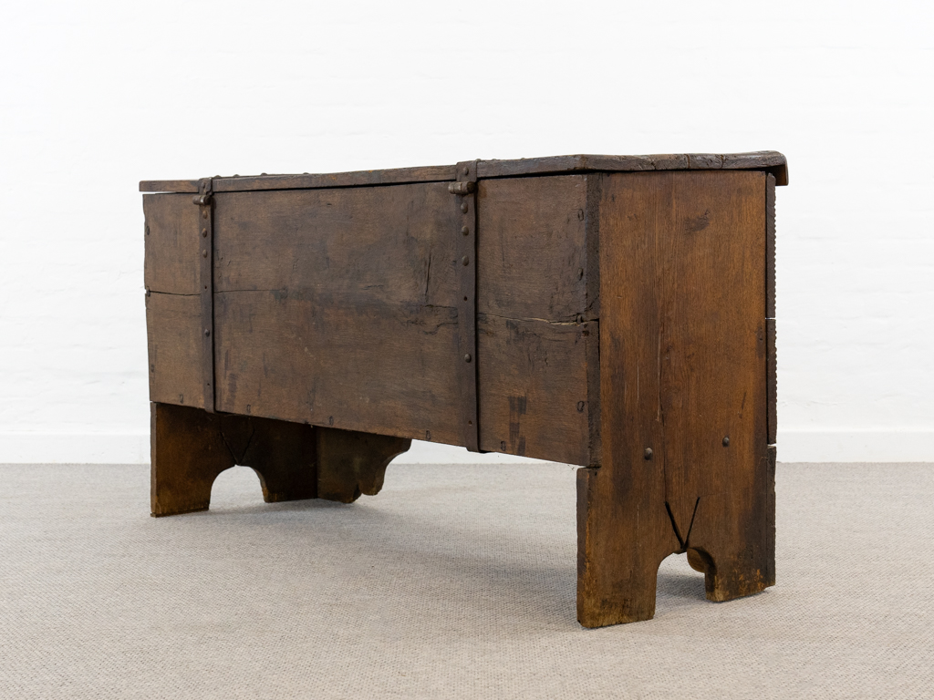 Antike Flachdeckeltruhe aus dem 17. Jahrhundert. Renaissance-Frühbarock. Gefertigt 1691 in Eichenholz. Die Truhe war bis vor kurzem durchgängig 333 Jahre im Besitz einer niedersächsischen Anwaltsfamilie, die ursprünglich aus dem Raum Königsberg stammt. Die Front zeigt vier Arkaden mit floralen Schnitzereien. Original funktionierendes Schloss mit Schlüssel. Tolle Alterspatina. Der Deckel wurde innenseitig mit zusätzlichen Hölzern verstärkt. Das vordere linke Standfläche ist stärker abgenutzt, dadurch kippelt die Truhe etwas.