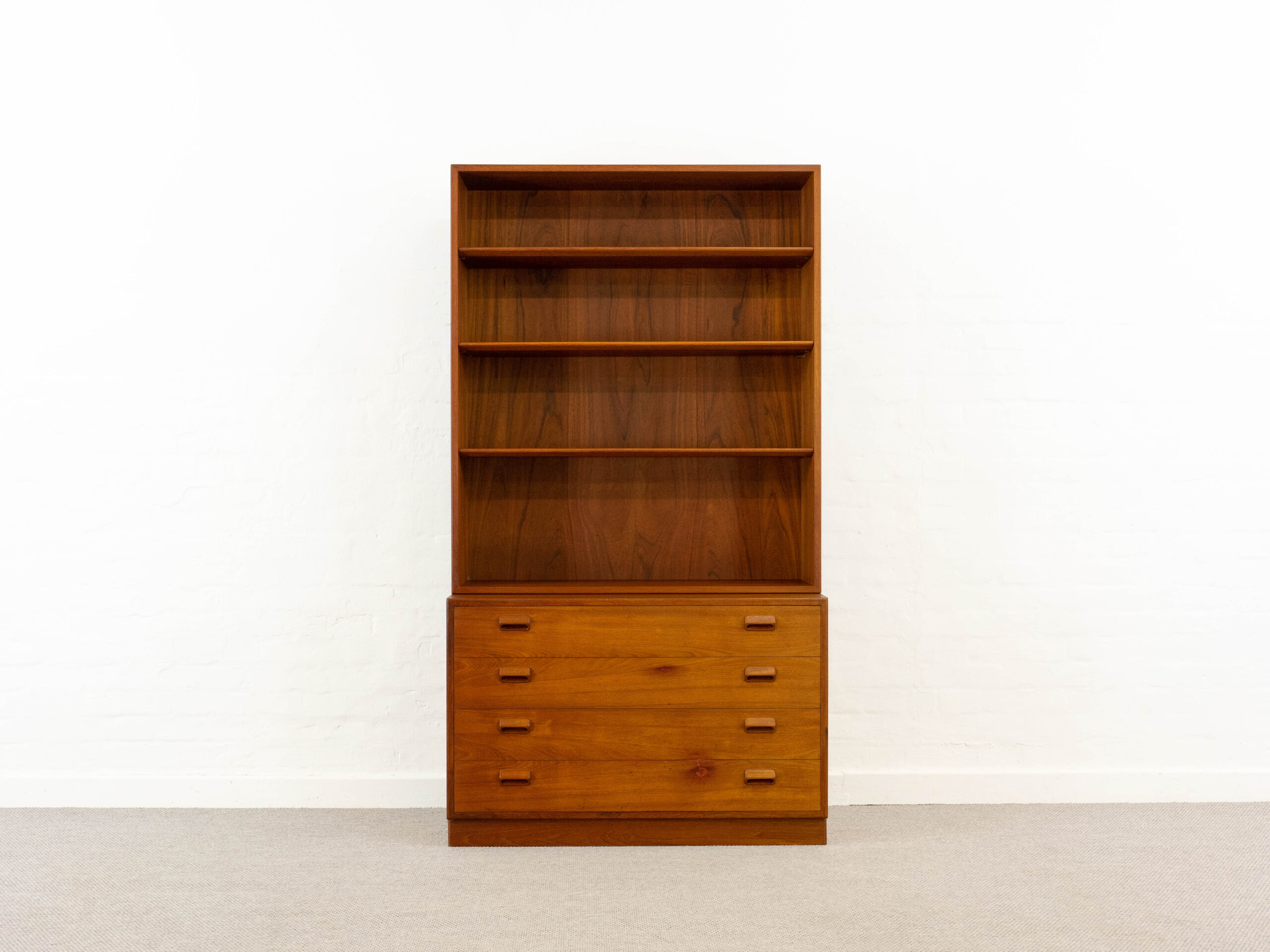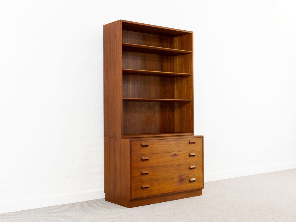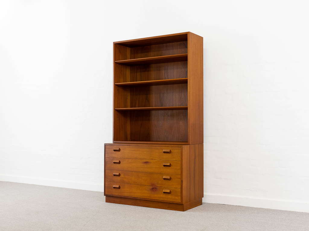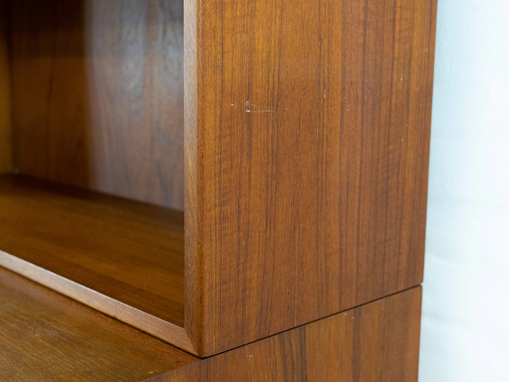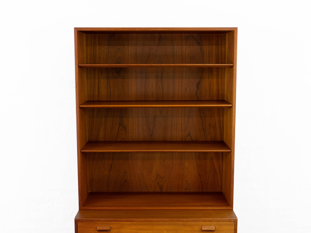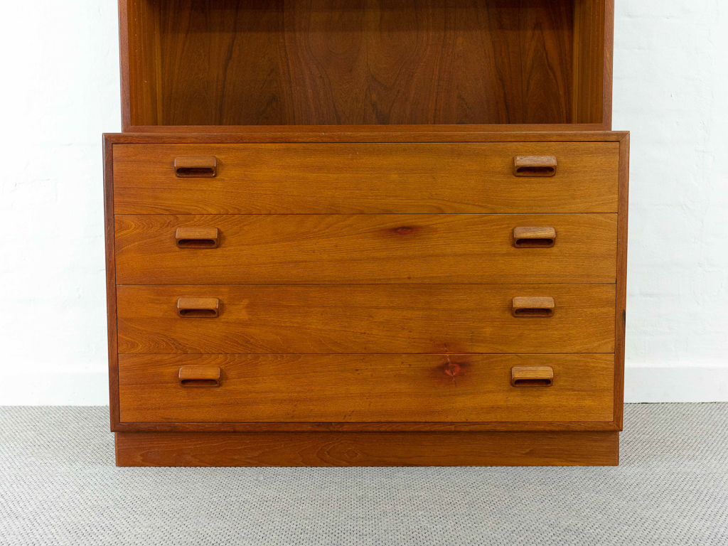 Borge Mogensen Schrankelement aus Teak, bestehend aus Kommode und aufgestelltem Regalteil. Beide Elemente gestempelt. Kommode mit 4 Auszügen und den charakteristischen Mogensen Griffmulden. Regal mit 3 Regalbrettern auf Messingbodenhaltern. Altersgemäßer gebrauchter Zustand mit Kratzern, Gebrauchsspuren und kleinerem Abplatzer im Fussbereich. Die rechte Regalseite weist 2 Bohrungen auf. Bitte sehen Sie sich die beigefügten Bilder an.