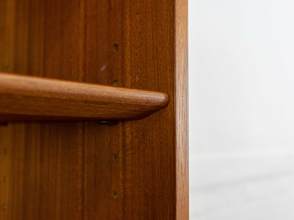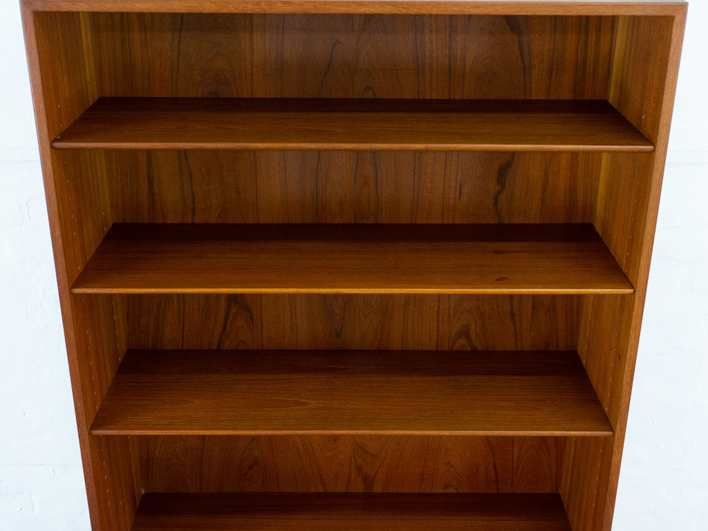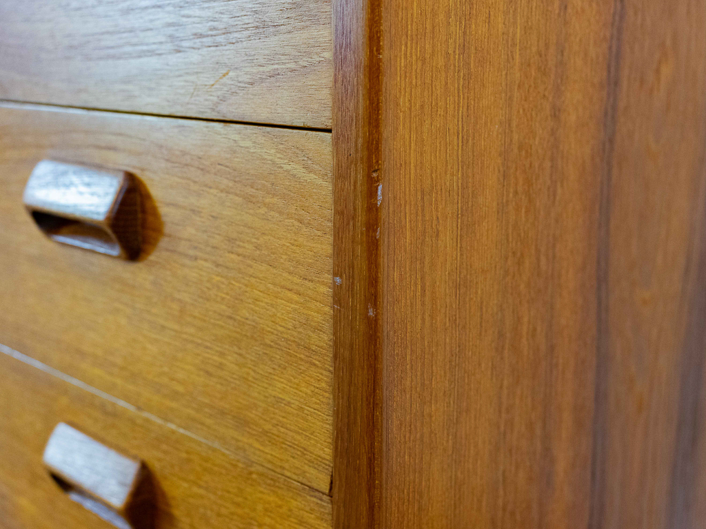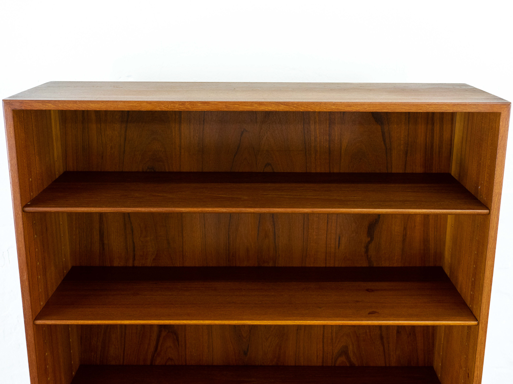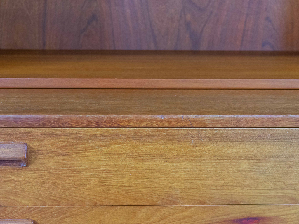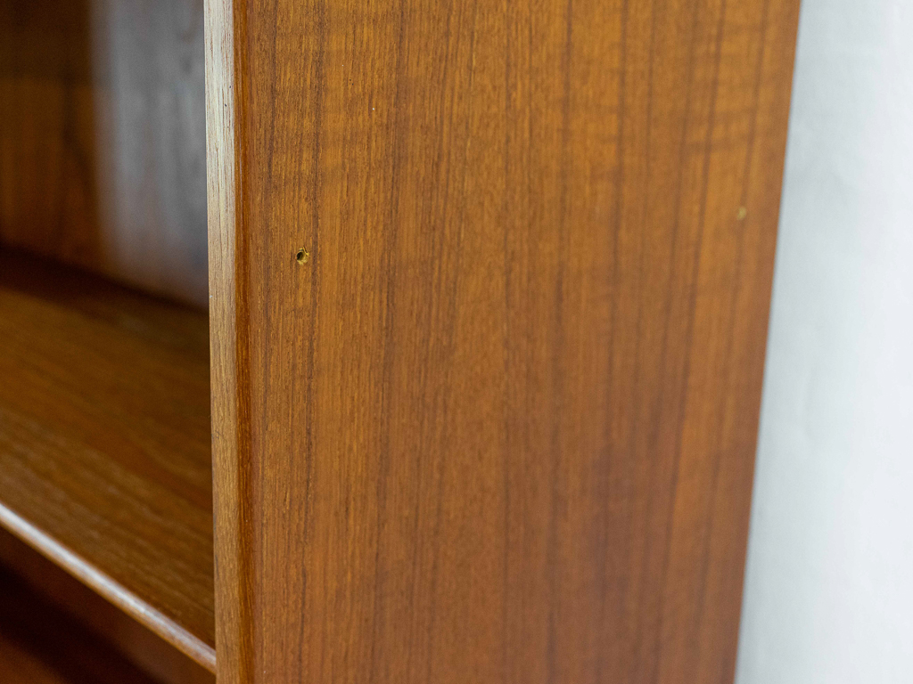 Borge Mogensen Schrankelement aus Teak, bestehend aus Kommode und aufgestelltem Regalteil. Beide Elemente gestempelt. Kommode mit 4 Auszügen und den charakteristischen Mogensen Griffmulden. Regal mit 3 Regalbrettern auf Messingbodenhaltern. Altersgemäßer gebrauchter Zustand mit Kratzern, Gebrauchsspuren und kleinerem Abplatzer im Fussbereich. Die rechte Regalseite weist 2 Bohrungen auf. Bitte sehen Sie sich die beigefügten Bilder an.