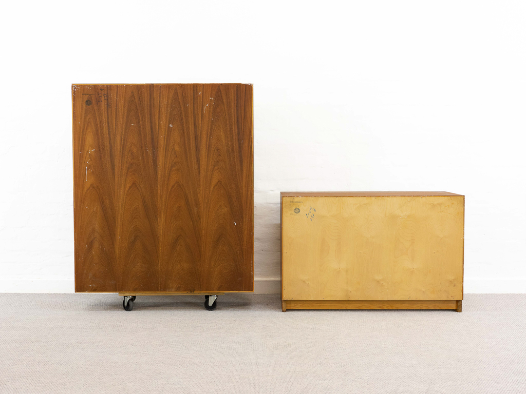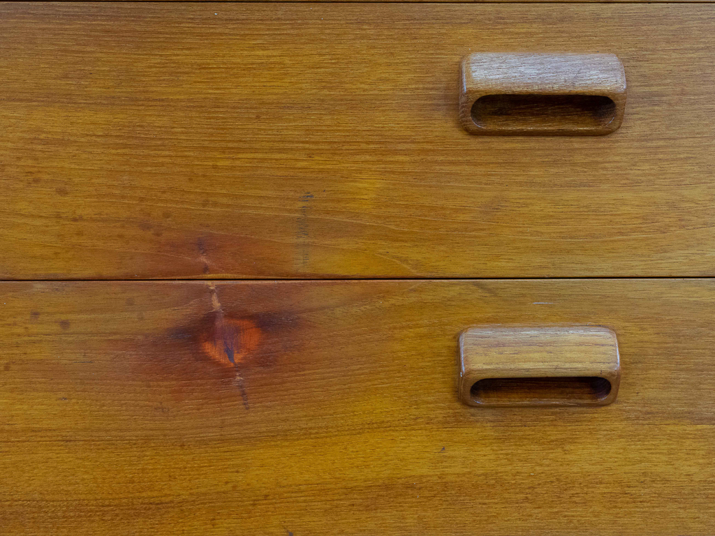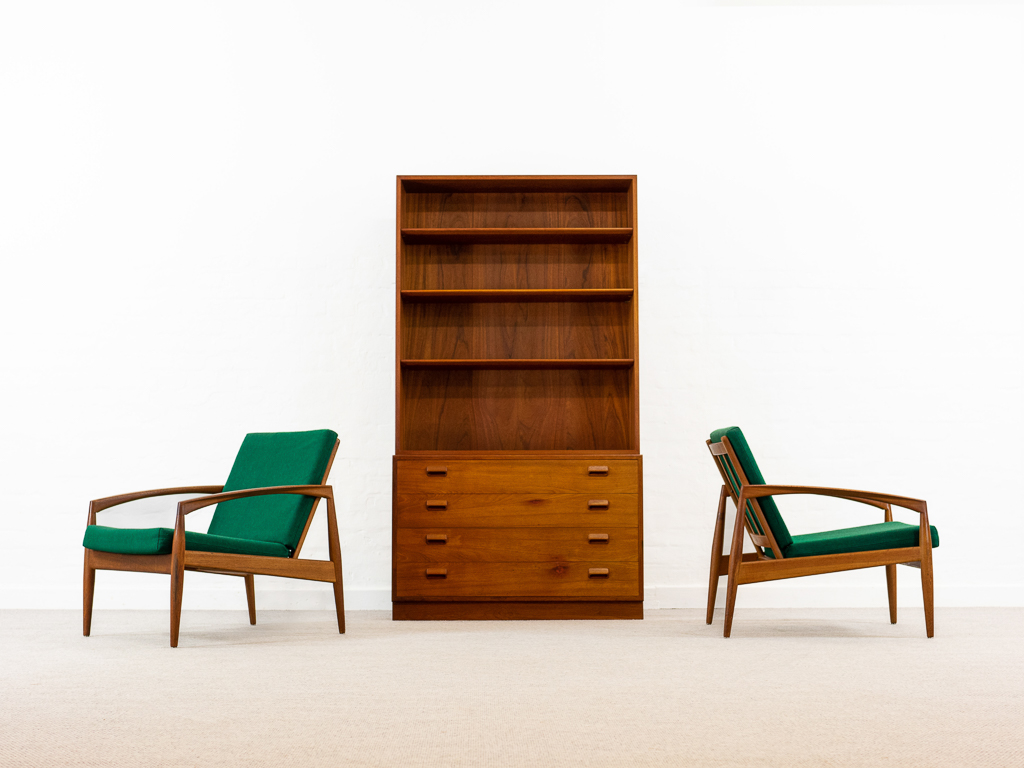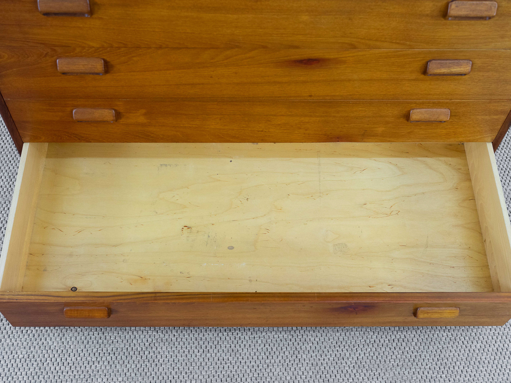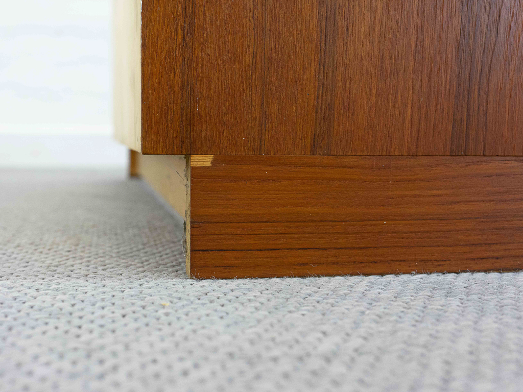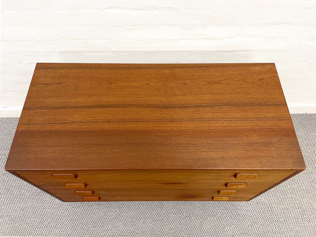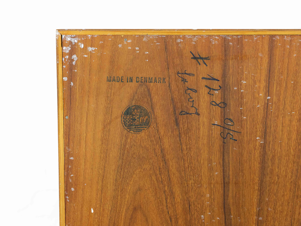 Borge Mogensen Schrankelement aus Teak, bestehend aus Kommode und aufgestelltem Regalteil. Beide Elemente gestempelt. Kommode mit 4 Auszügen und den charakteristischen Mogensen Griffmulden. Regal mit 3 Regalbrettern auf Messingbodenhaltern. Altersgemäßer gebrauchter Zustand mit Kratzern, Gebrauchsspuren und kleinerem Abplatzer im Fussbereich. Die rechte Regalseite weist 2 Bohrungen auf. Bitte sehen Sie sich die beigefügten Bilder an.