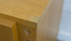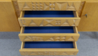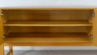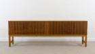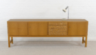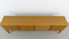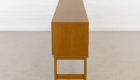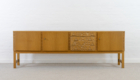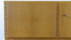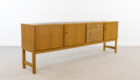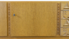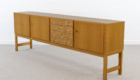 Midcentury Sideboard aus den 1960/70er Jahren. Ausgeführt in Eichenfurnier. Front der Schubladen und Rahmen mit geometrischer Ornamentik. Super viel Stauraum mit 3 Türen sowie 4 Schubladen. Zwei Schlüssel vorhanden. Guter gebrauchter Zustand. Alters-und Gebrauchsspuren vorhanden. Linke Tür weist Abrieb auf. Ecke mit Verfärbung. Maße: Breite: 240cm, Tiefe: 43.5cm, Höhe: 80.5cm. Nichtraucherobjekt.