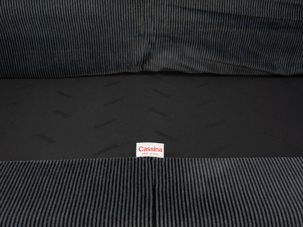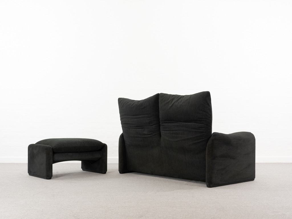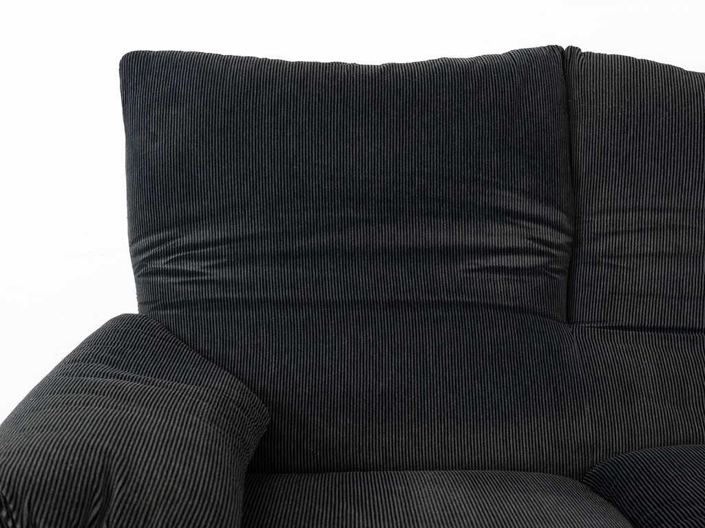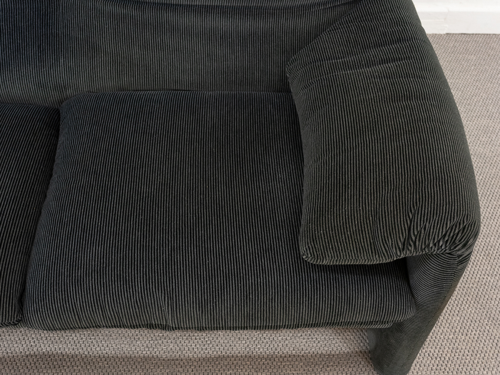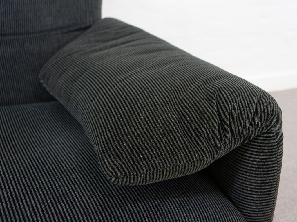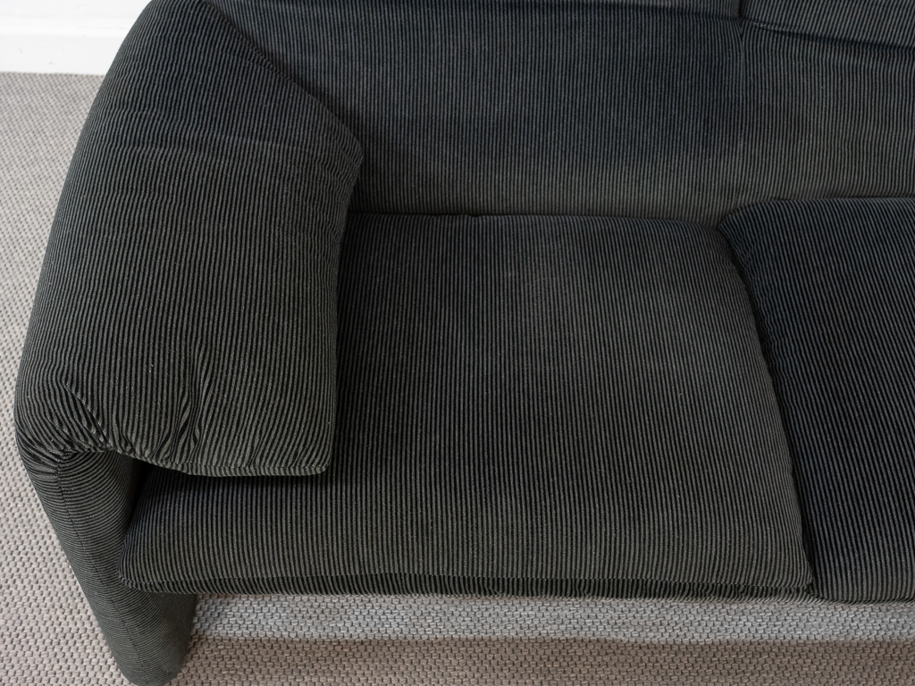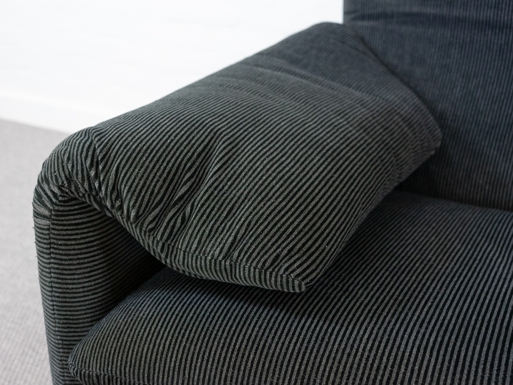 Maralunga 2-Sitzer Sofa von Cassina, entworfen 1973 von Vico Magistretti. Dieses Sofa verfügt über faltbare Rückenlehnen um verschiedene Sitzpositionen zu ermöglichen. Gepolstert im originalem dunkelgrau gestreiftem Cassina Soff. Das Sofa ist mit Herstelleretikett gelabelt sowie Cassina Schriftzug im Unterstoff. Höhe der niedrigen Position Rückenlehne 70cm, Höhe der hohen Position Rückenlehne: 100cm. Nichtraucher-Objekt. Vernünftiger gebrauchter Zustand. Alters- und Nutzungsspuren. Der Fusshocker weist 2 größere Flecken im Kissen auf. Bitte sehen Sie sich die beigefügten Fotos an.