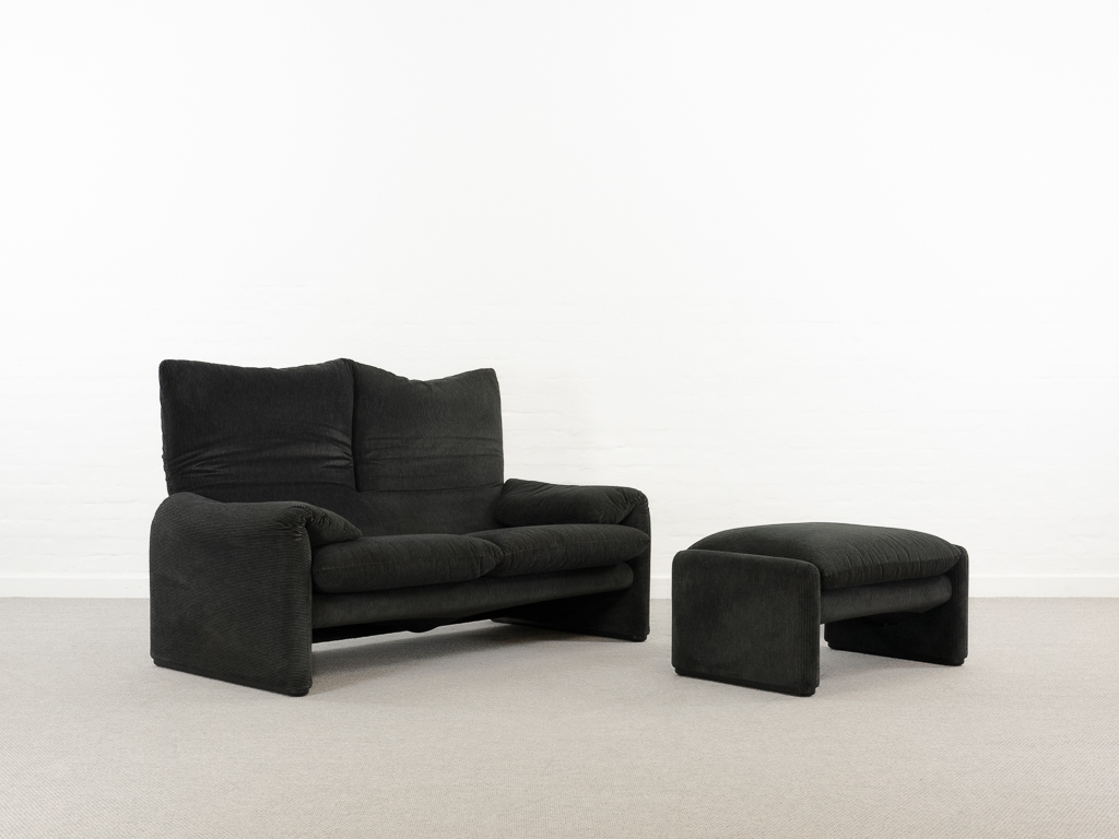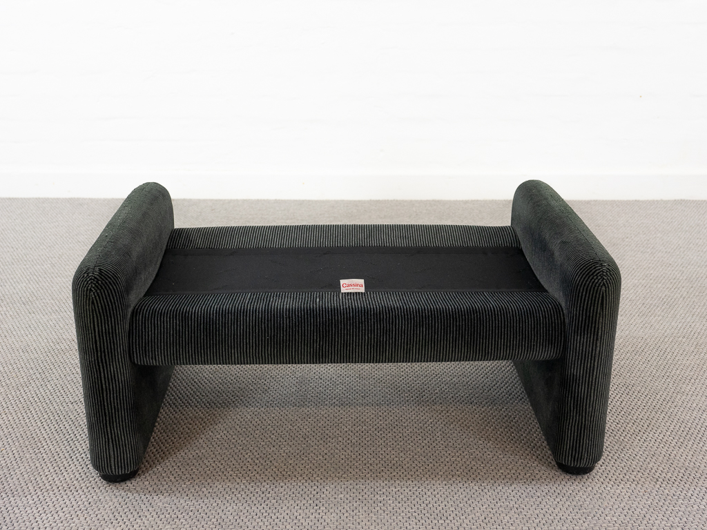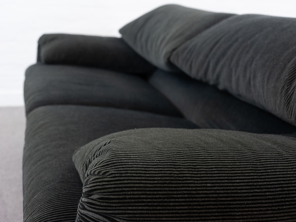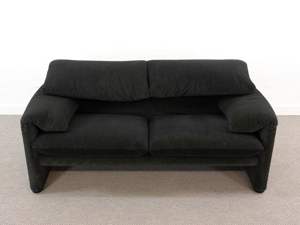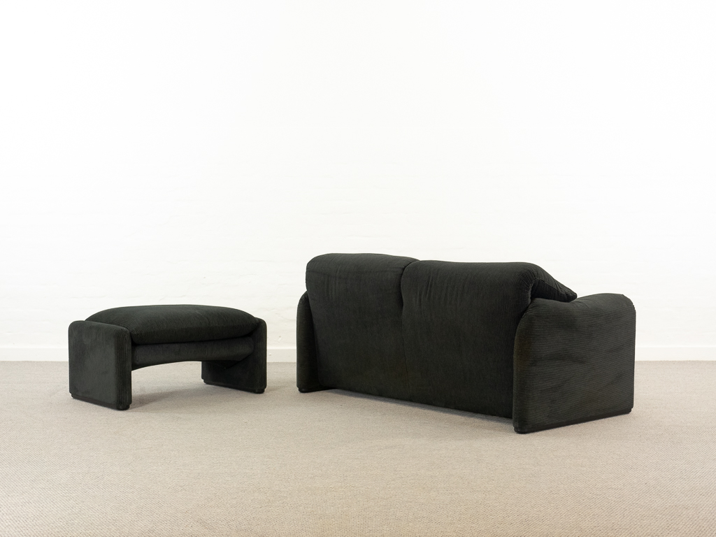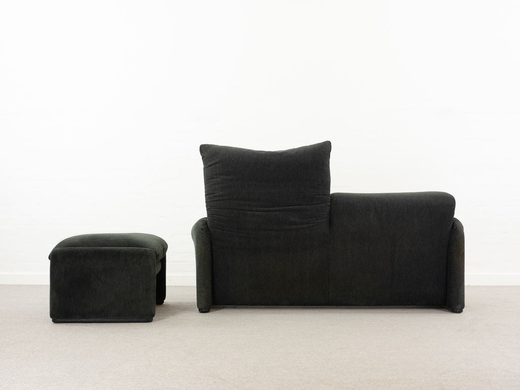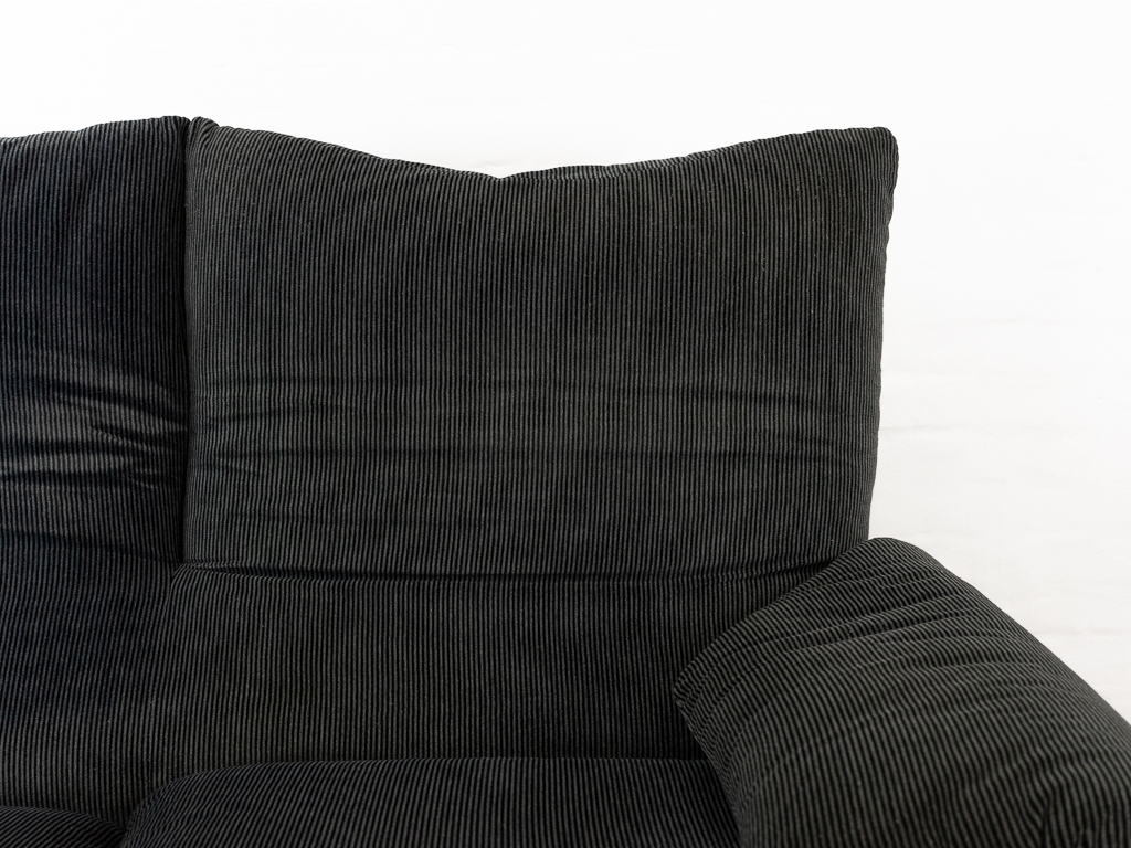 Maralunga 2-Sitzer Sofa von Cassina, entworfen 1973 von Vico Magistretti. Dieses Sofa verfügt über faltbare Rückenlehnen um verschiedene Sitzpositionen zu ermöglichen. Gepolstert im originalem dunkelgrau gestreiftem Cassina Soff. Das Sofa ist mit Herstelleretikett gelabelt sowie Cassina Schriftzug im Unterstoff. Höhe der niedrigen Position Rückenlehne 70cm, Höhe der hohen Position Rückenlehne: 100cm. Nichtraucher-Objekt. Vernünftiger gebrauchter Zustand. Alters- und Nutzungsspuren. Der Fusshocker weist 2 größere Flecken im Kissen auf. Bitte sehen Sie sich die beigefügten Fotos an.