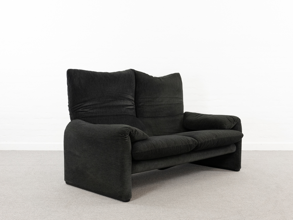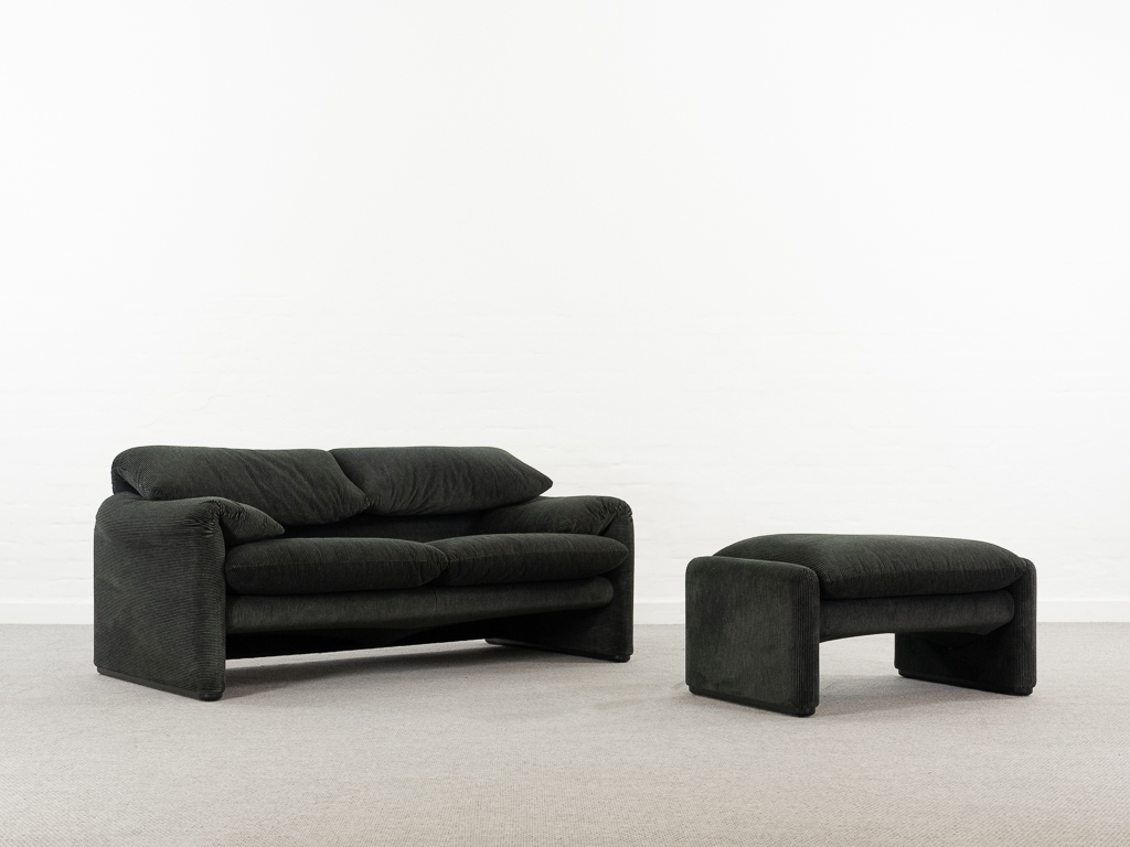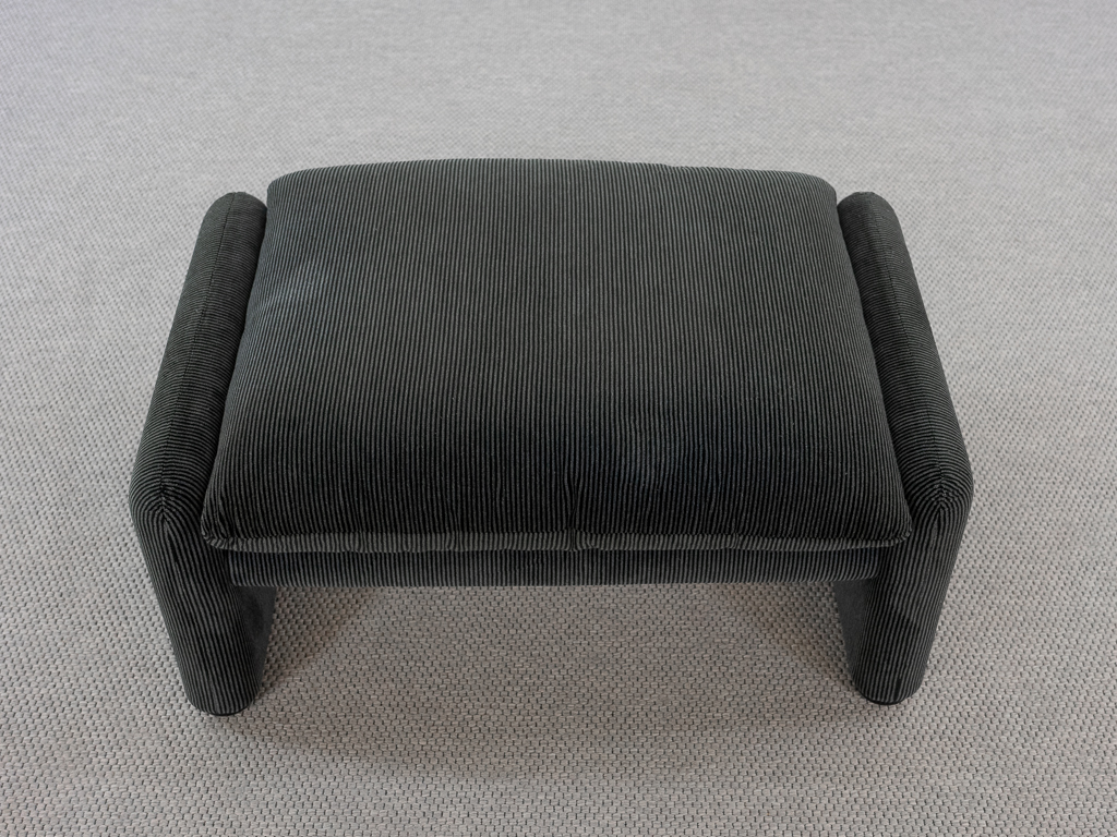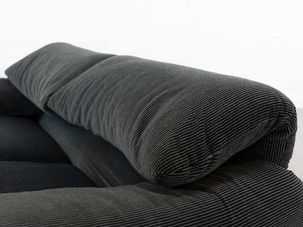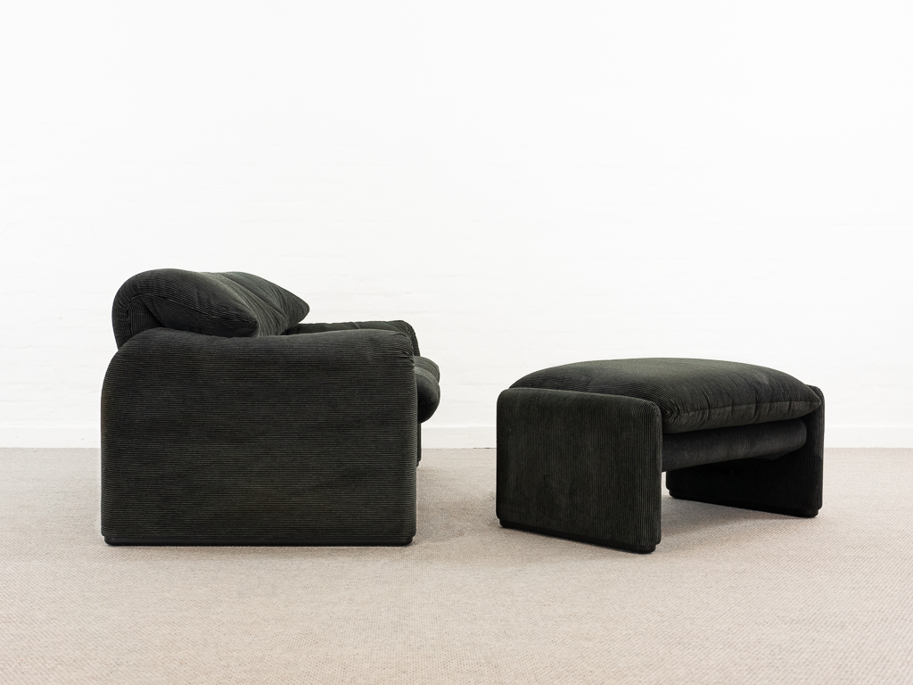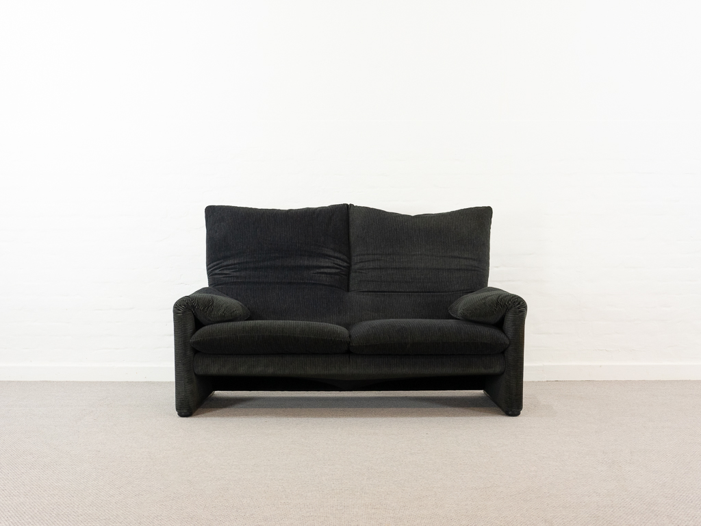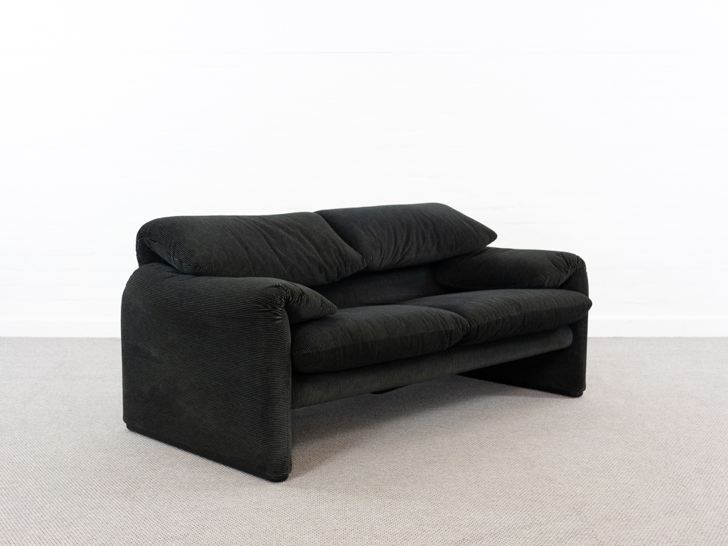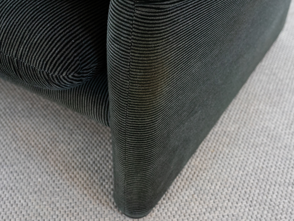 Maralunga 2-Sitzer Sofa von Cassina, entworfen 1973 von Vico Magistretti. Dieses Sofa verfügt über faltbare Rückenlehnen um verschiedene Sitzpositionen zu ermöglichen. Gepolstert im originalem dunkelgrau gestreiftem Cassina Soff. Das Sofa ist mit Herstelleretikett gelabelt sowie Cassina Schriftzug im Unterstoff. Höhe der niedrigen Position Rückenlehne 70cm, Höhe der hohen Position Rückenlehne: 100cm. Nichtraucher-Objekt. Vernünftiger gebrauchter Zustand. Alters- und Nutzungsspuren. Der Fusshocker weist 2 größere Flecken im Kissen auf. Bitte sehen Sie sich die beigefügten Fotos an.