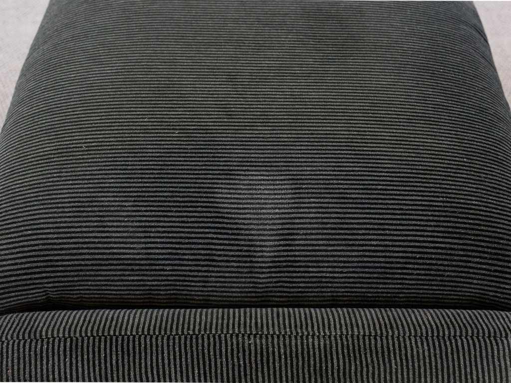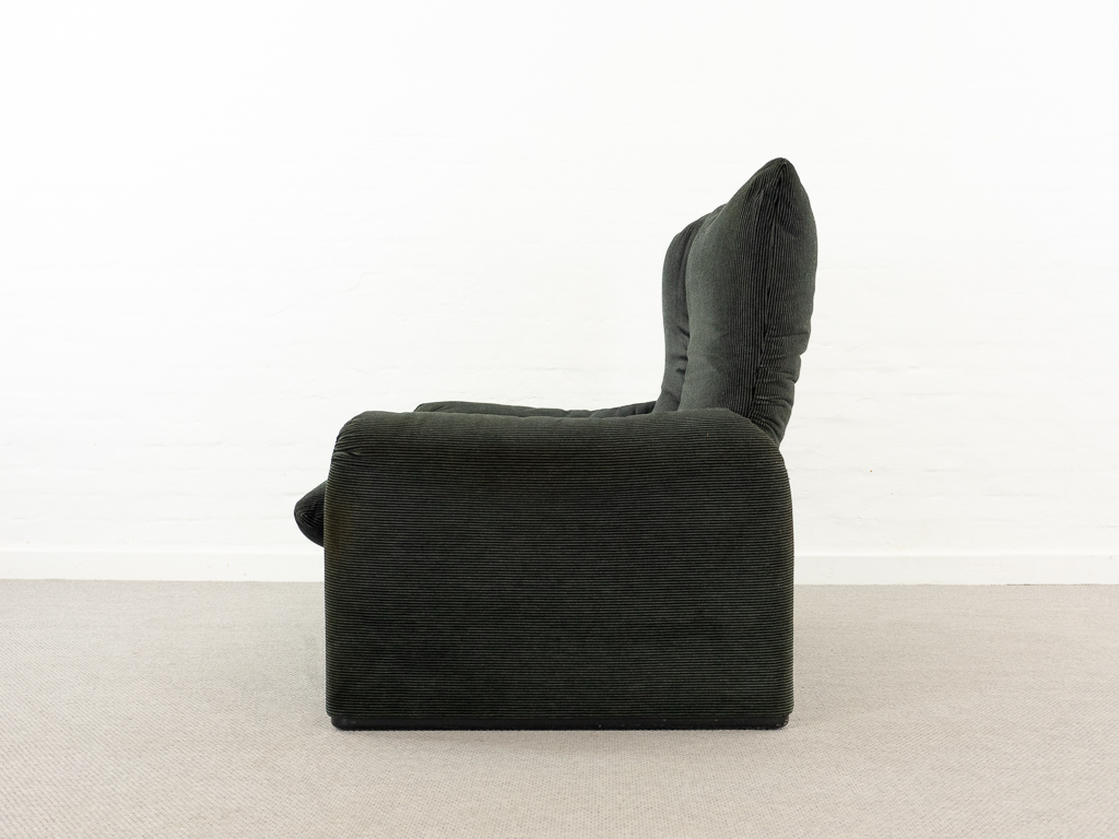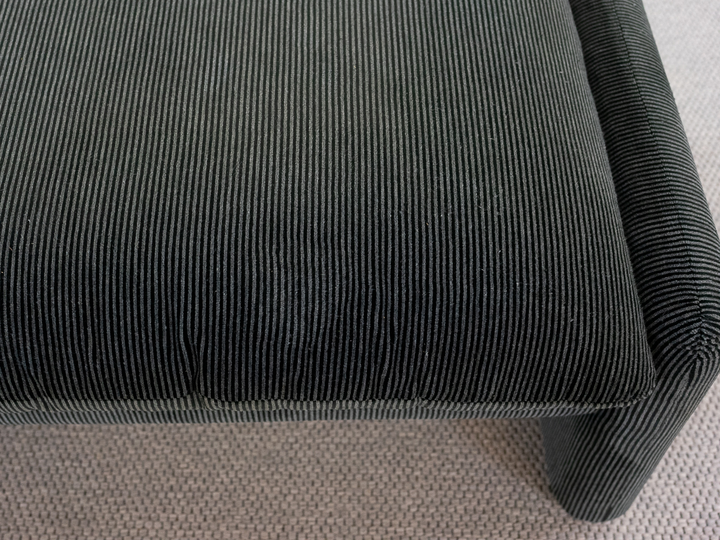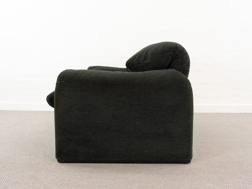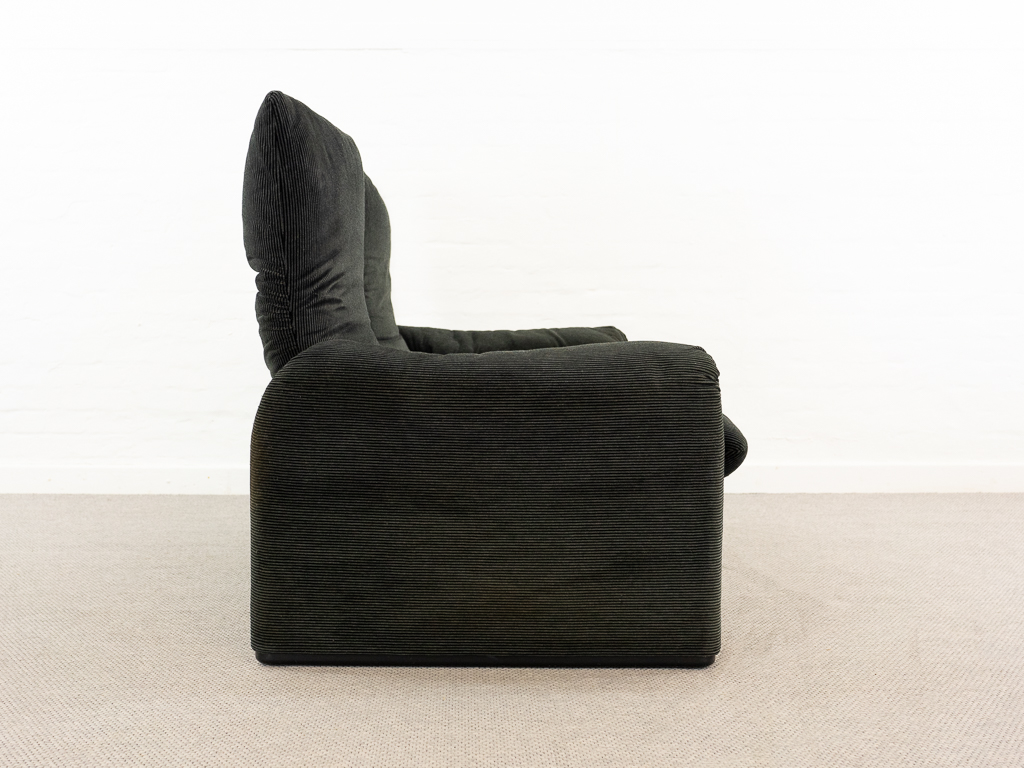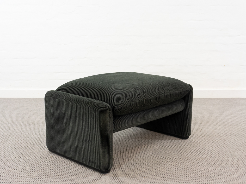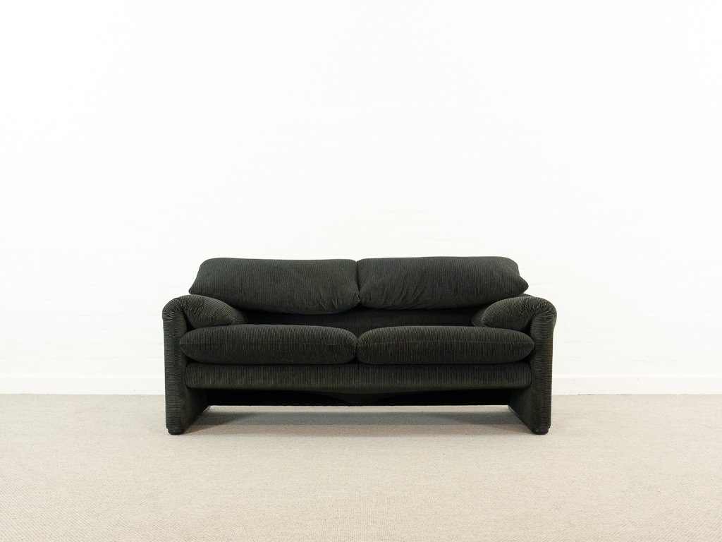 Maralunga 2-Sitzer Sofa von Cassina, entworfen 1973 von Vico Magistretti. Dieses Sofa verfügt über faltbare Rückenlehnen um verschiedene Sitzpositionen zu ermöglichen. Gepolstert im originalem dunkelgrau gestreiftem Cassina Soff. Das Sofa ist mit Herstelleretikett gelabelt sowie Cassina Schriftzug im Unterstoff. Höhe der niedrigen Position Rückenlehne 70cm, Höhe der hohen Position Rückenlehne: 100cm. Nichtraucher-Objekt. Vernünftiger gebrauchter Zustand. Alters- und Nutzungsspuren. Der Fusshocker weist 2 größere Flecken im Kissen auf. Bitte sehen Sie sich die beigefügten Fotos an.