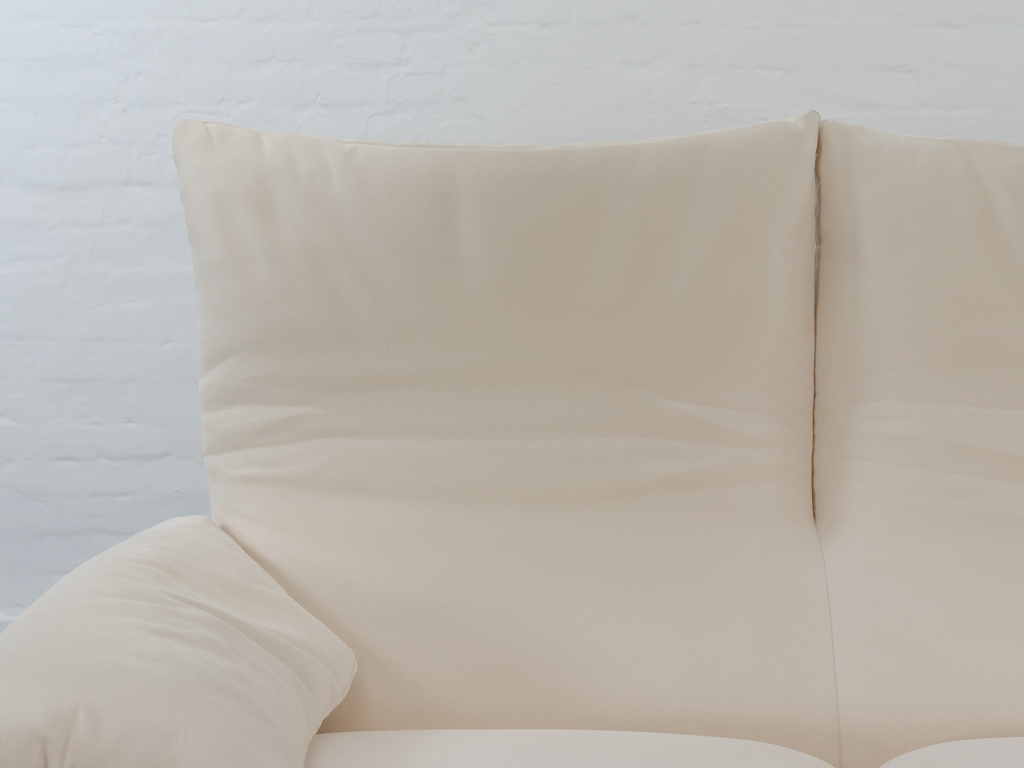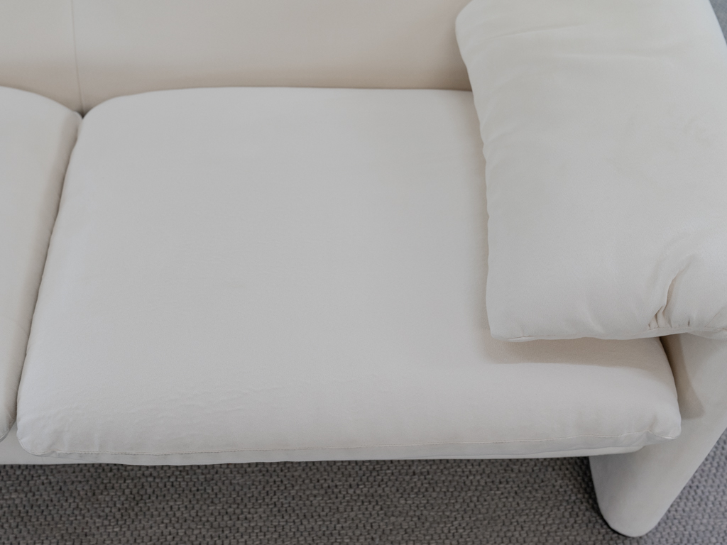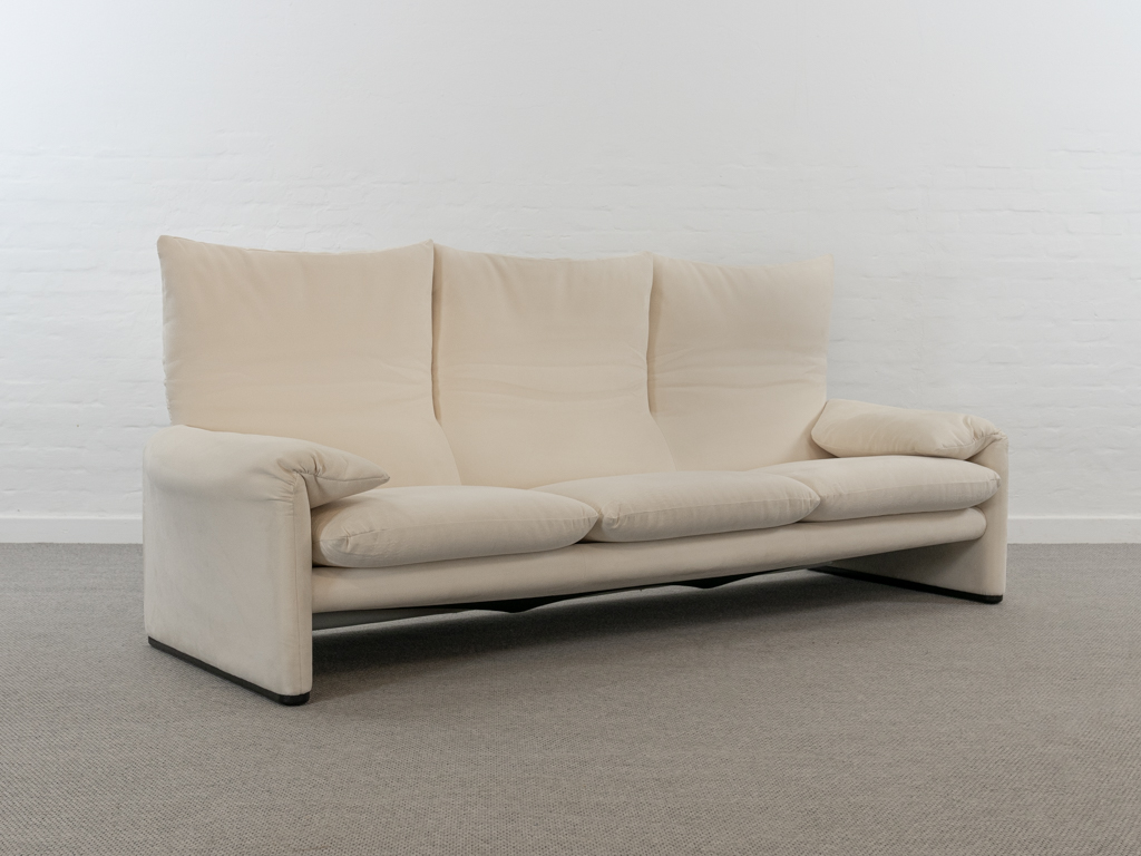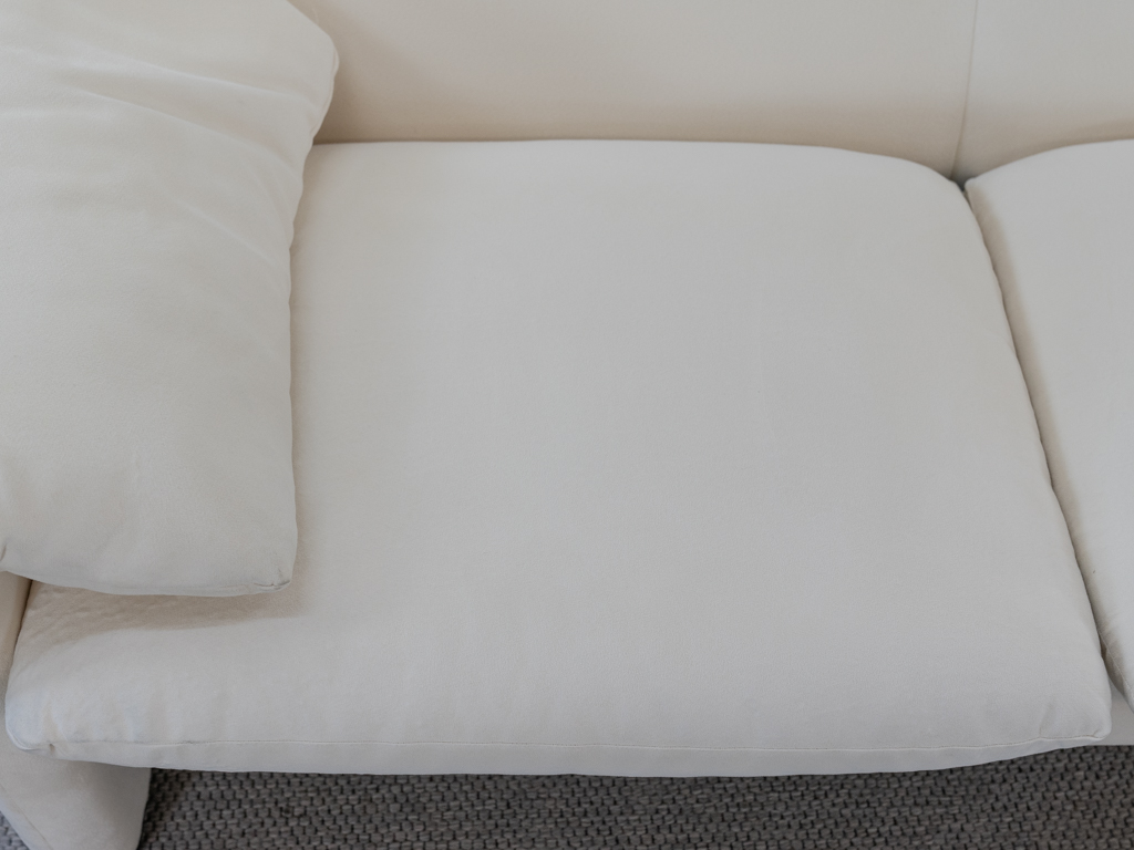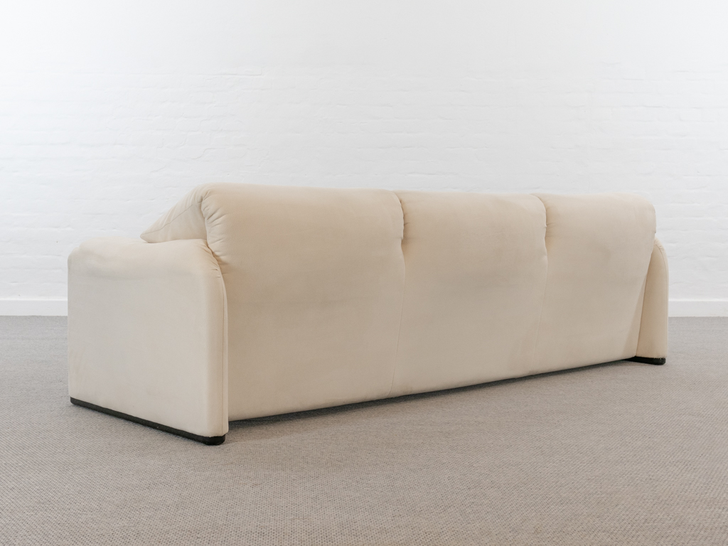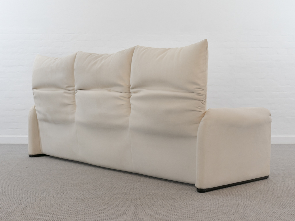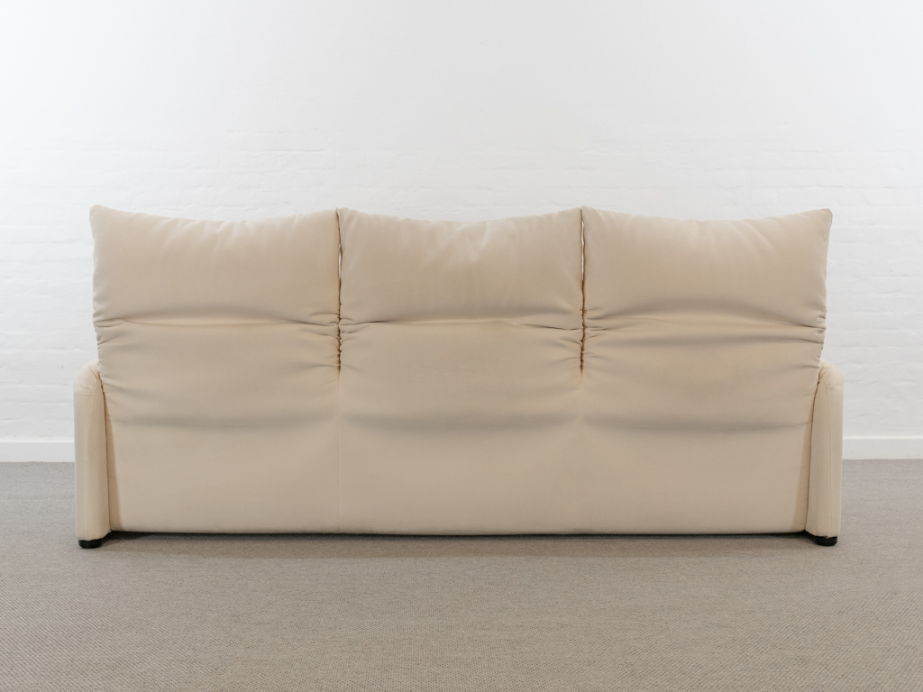 Maralunga 3-Sitzer Sofa von Cassina, entworfen 1973 von Vico Magistretti. Dieses Sofa verfügt über faltbare Rückenlehnen um verschiedene Sitzpositionen zu ermöglichen. Vom Vorbesitzer in weißem Microfaserstoff gepolstert. Der Stoff zeigt an den Kissen Blasenbildung. Bezeichnet mit Cassina Schriftzug im Unterstoff. Leichte Alters- und Gebrauchsspuren. Top Sitzkomfort. Nichtraucherobjekt. Höhe niedrige Position 72cm, Höhe hohe Position: 100cm.