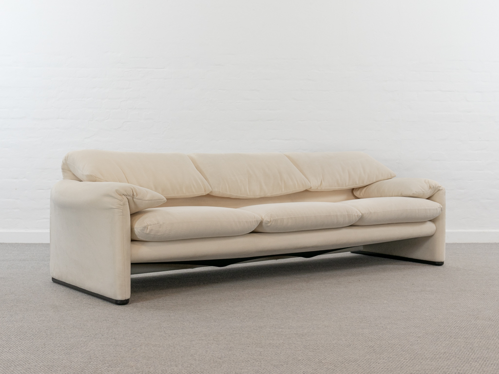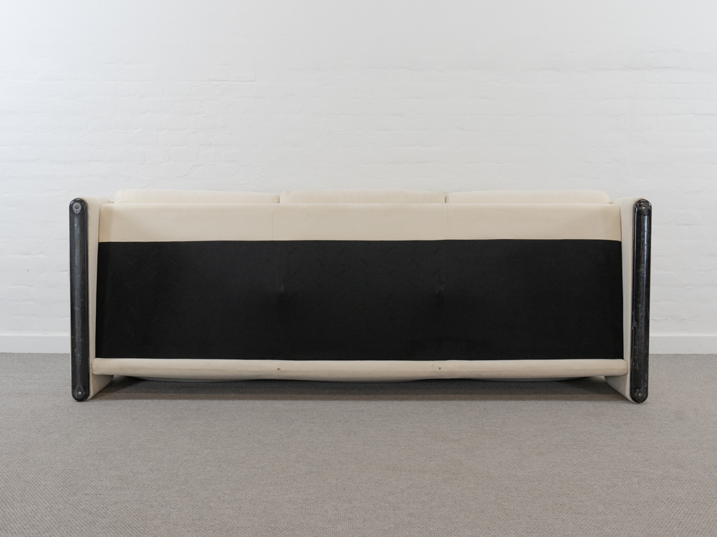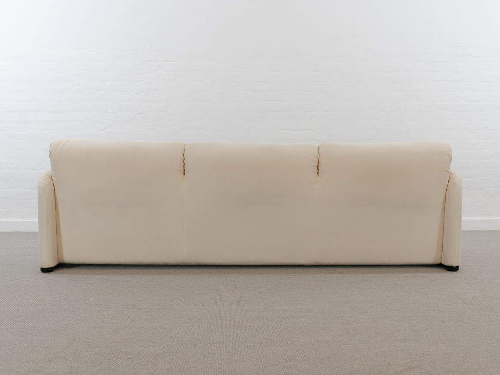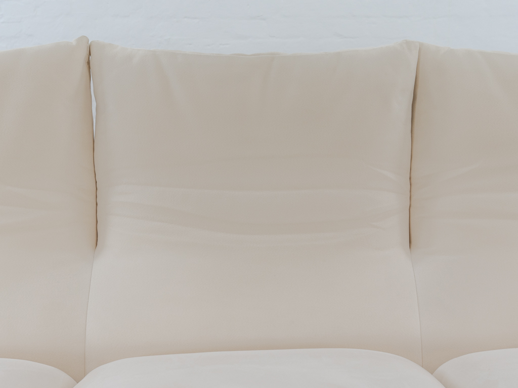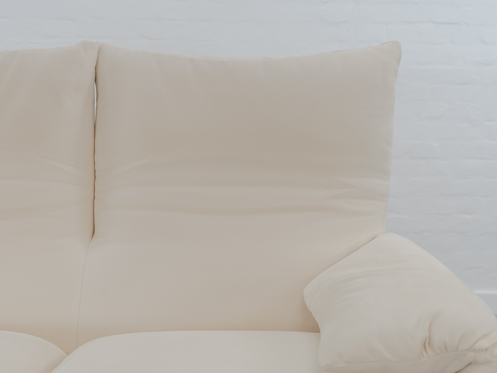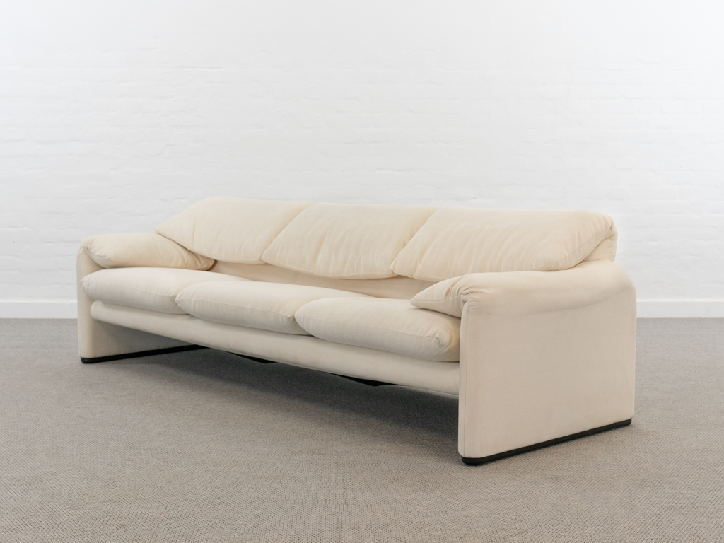 Maralunga 3-Sitzer Sofa von Cassina, entworfen 1973 von Vico Magistretti. Dieses Sofa verfügt über faltbare Rückenlehnen um verschiedene Sitzpositionen zu ermöglichen. Vom Vorbesitzer in weißem Microfaserstoff gepolstert. Der Stoff zeigt an den Kissen Blasenbildung. Bezeichnet mit Cassina Schriftzug im Unterstoff. Leichte Alters- und Gebrauchsspuren. Top Sitzkomfort. Nichtraucherobjekt. Höhe niedrige Position 72cm, Höhe hohe Position: 100cm.