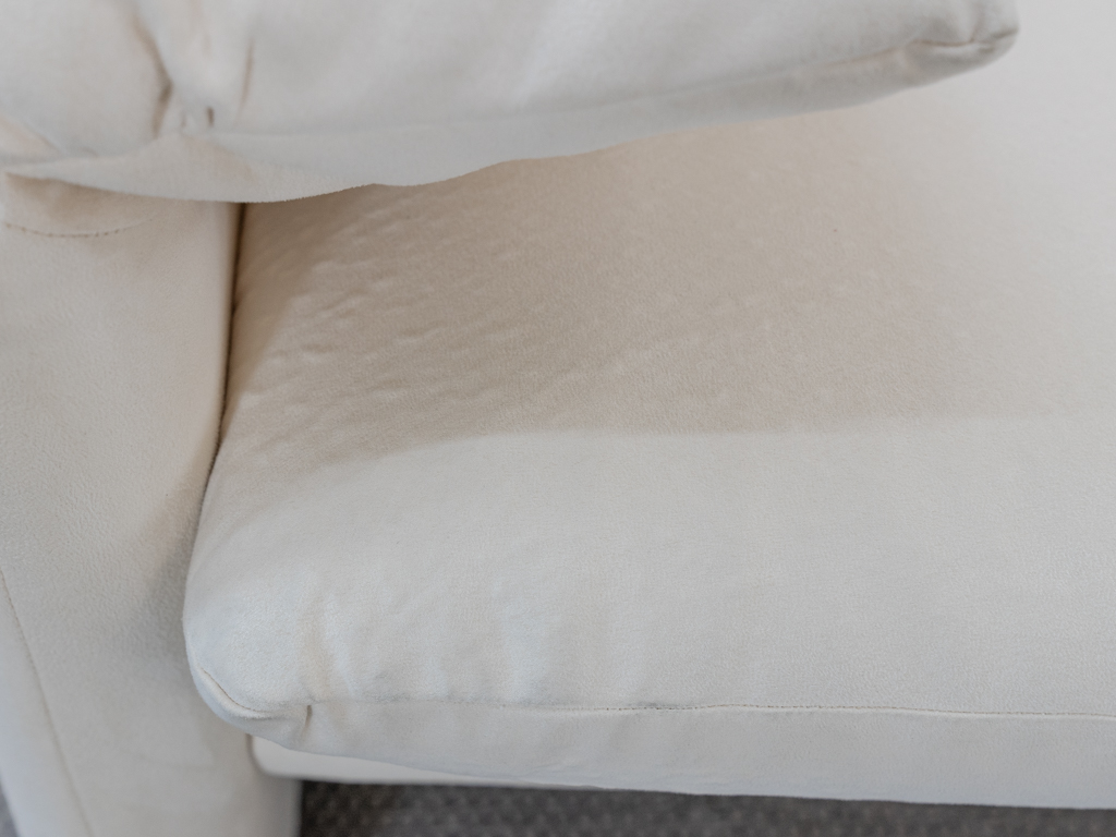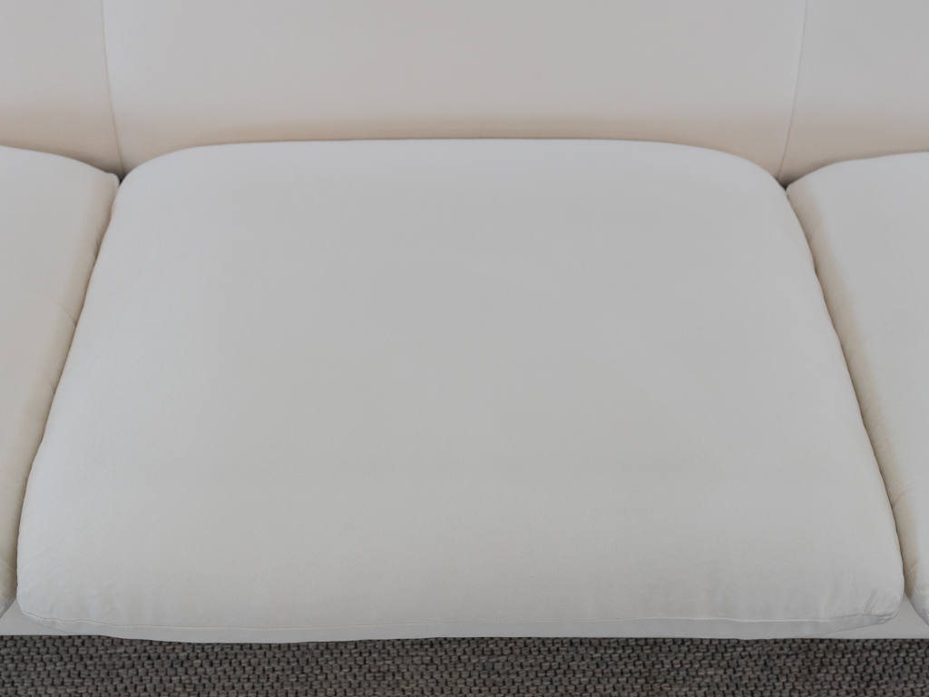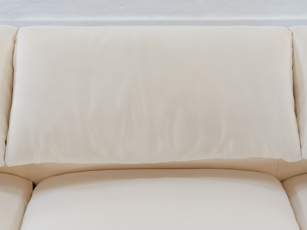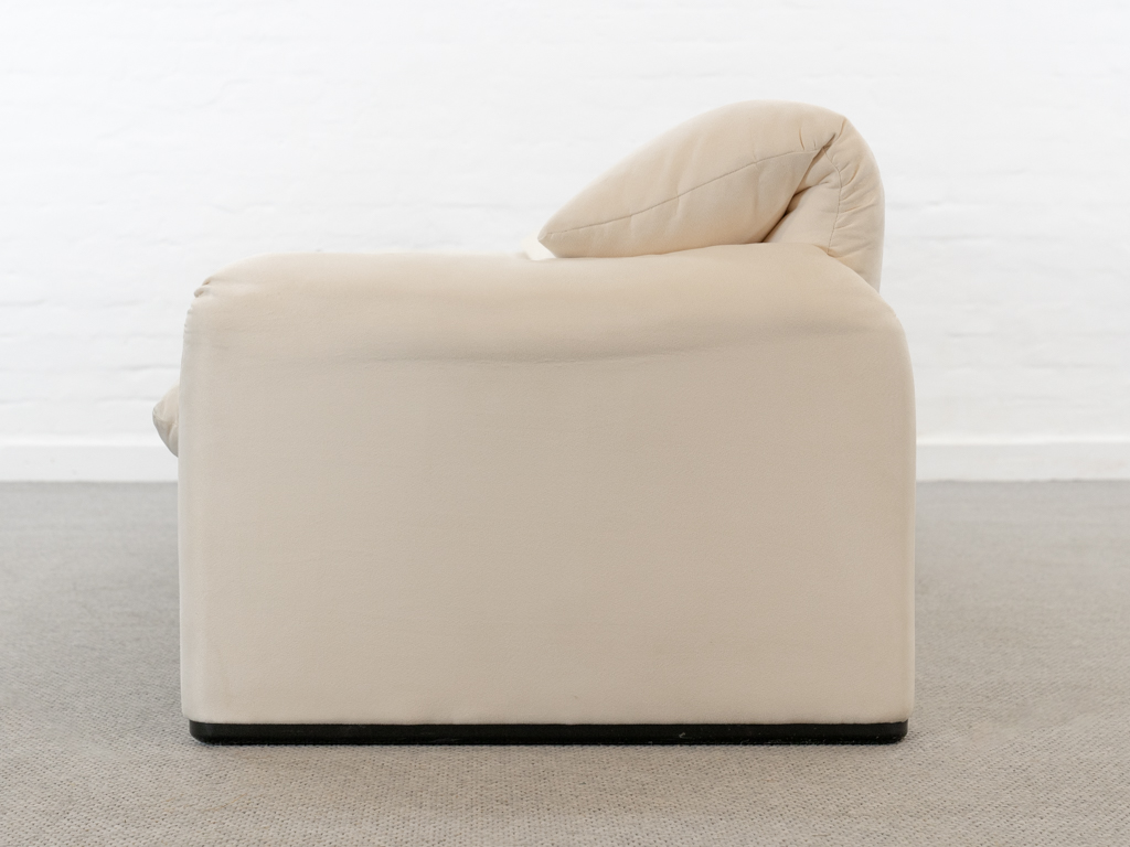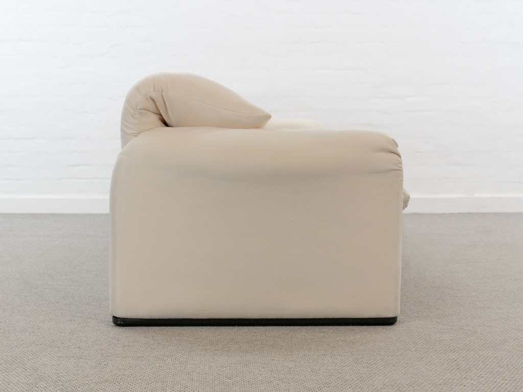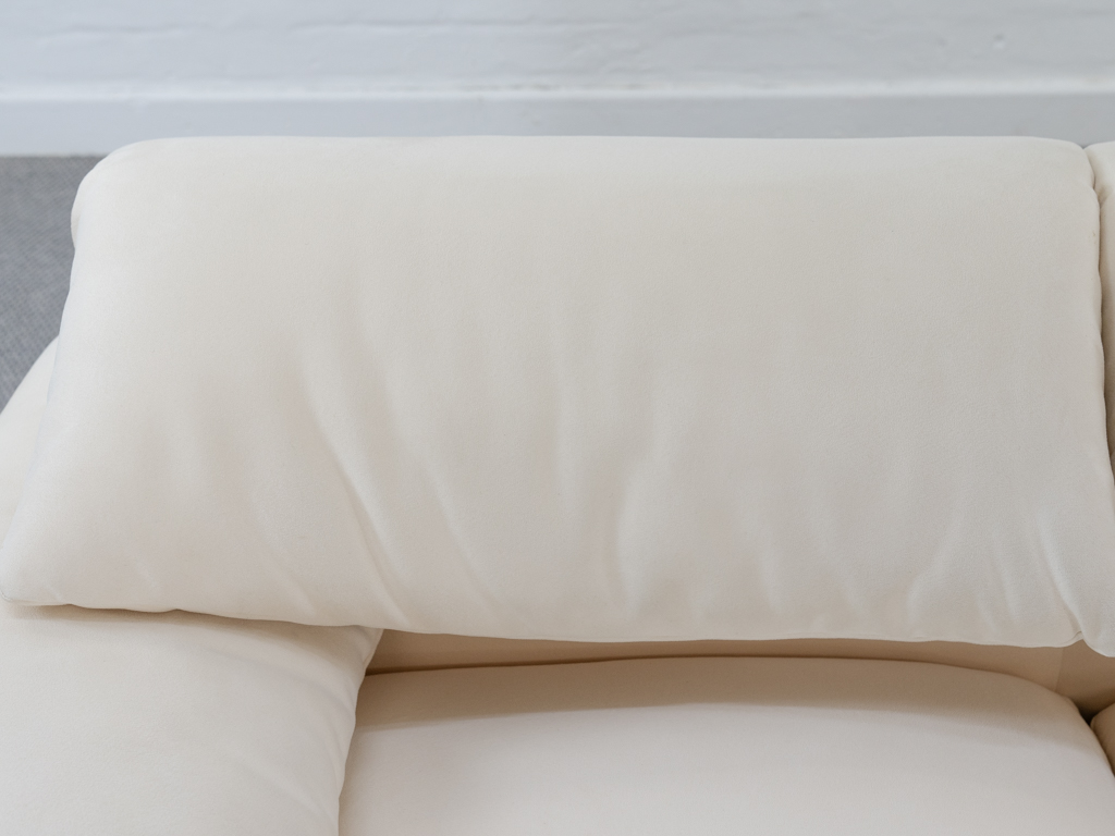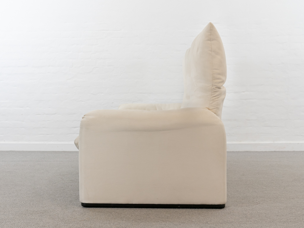 Maralunga 3-Sitzer Sofa von Cassina, entworfen 1973 von Vico Magistretti. Dieses Sofa verfügt über faltbare Rückenlehnen um verschiedene Sitzpositionen zu ermöglichen. Vom Vorbesitzer in weißem Microfaserstoff gepolstert. Der Stoff zeigt an den Kissen Blasenbildung. Bezeichnet mit Cassina Schriftzug im Unterstoff. Leichte Alters- und Gebrauchsspuren. Top Sitzkomfort. Nichtraucherobjekt. Höhe niedrige Position 72cm, Höhe hohe Position: 100cm.