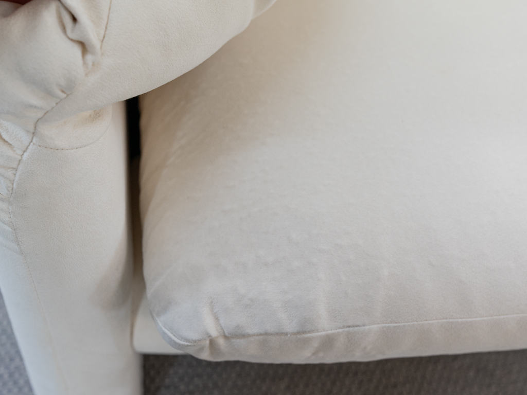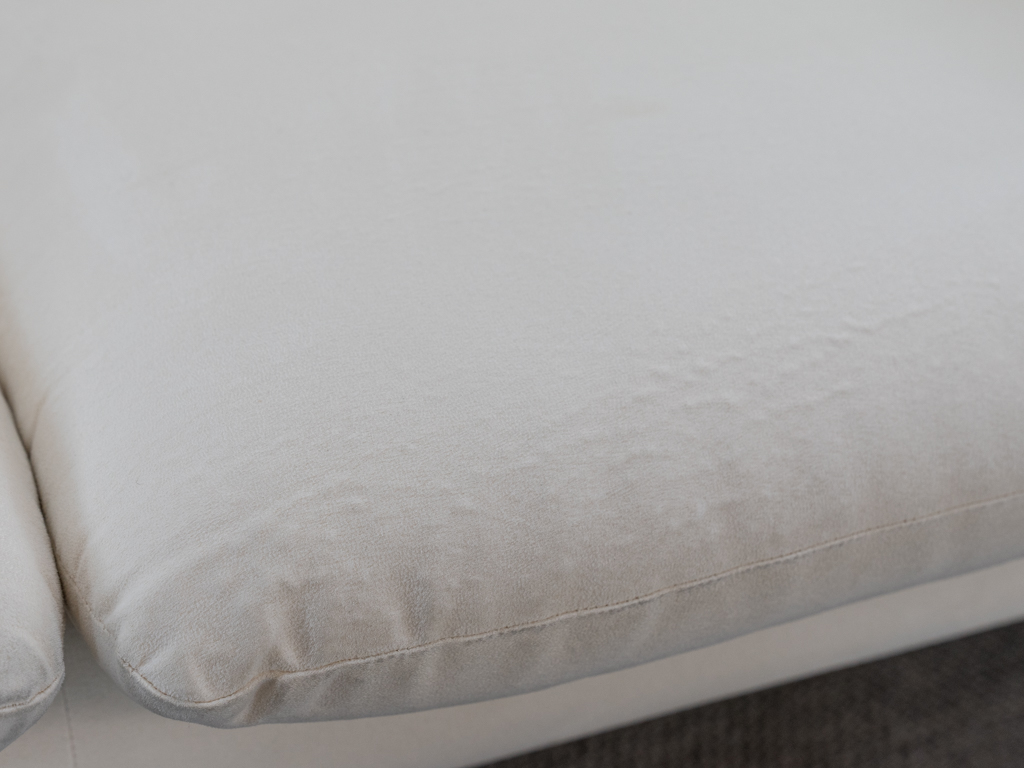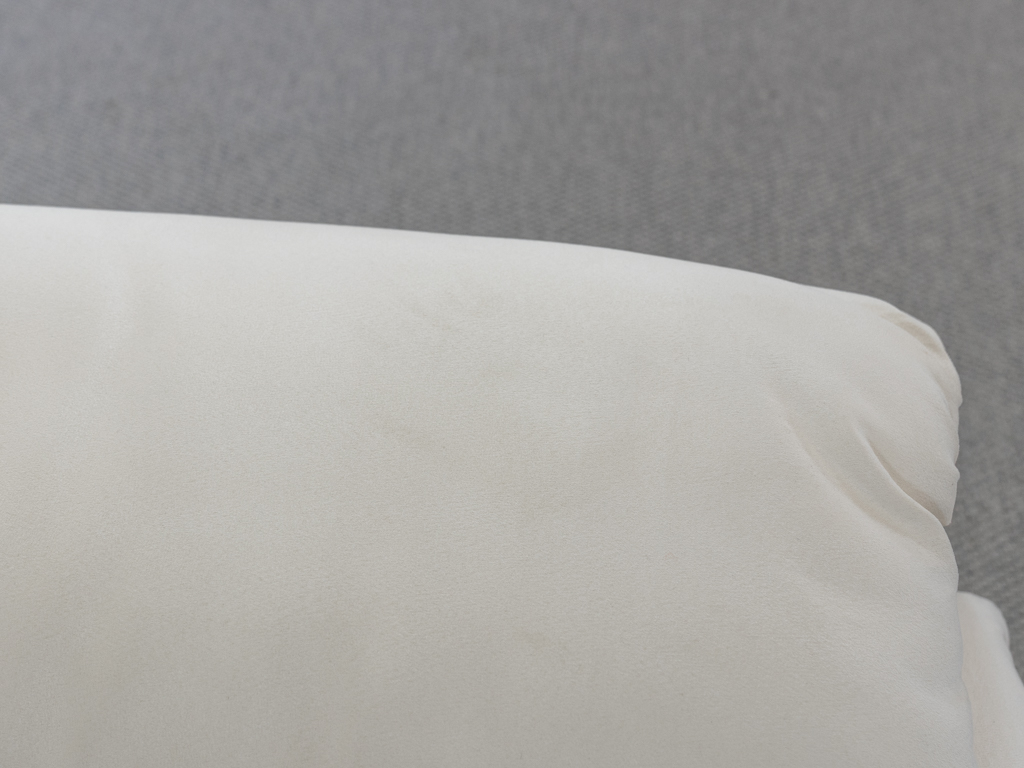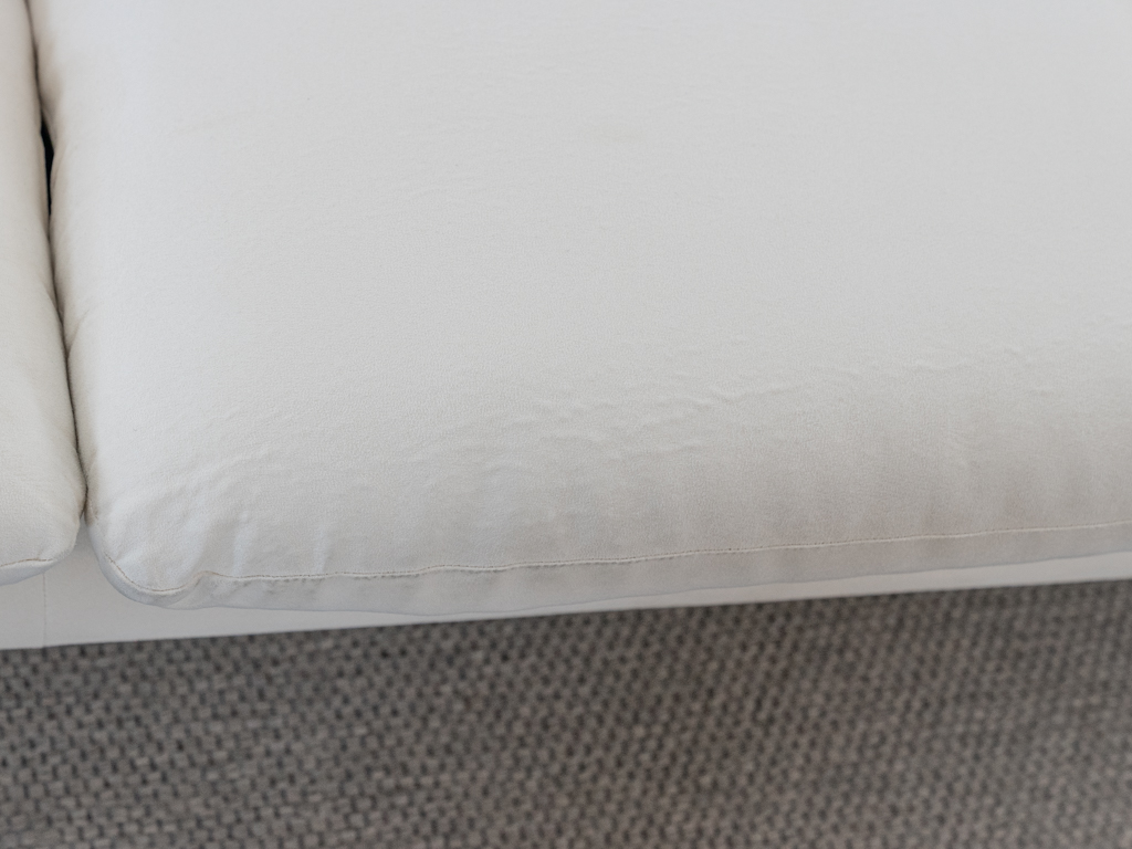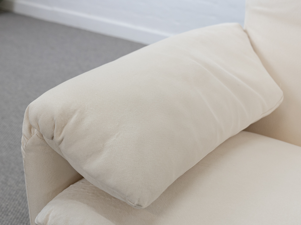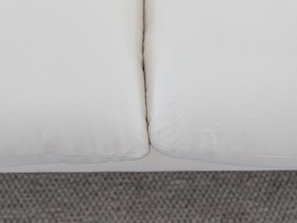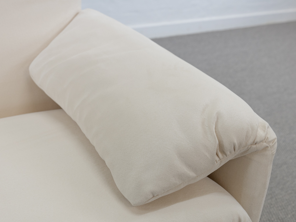 Maralunga 3-Sitzer Sofa von Cassina, entworfen 1973 von Vico Magistretti. Dieses Sofa verfügt über faltbare Rückenlehnen um verschiedene Sitzpositionen zu ermöglichen. Vom Vorbesitzer in weißem Microfaserstoff gepolstert. Der Stoff zeigt an den Kissen Blasenbildung. Bezeichnet mit Cassina Schriftzug im Unterstoff. Leichte Alters- und Gebrauchsspuren. Top Sitzkomfort. Nichtraucherobjekt. Höhe niedrige Position 72cm, Höhe hohe Position: 100cm.