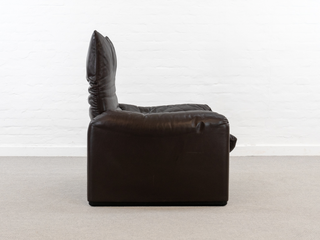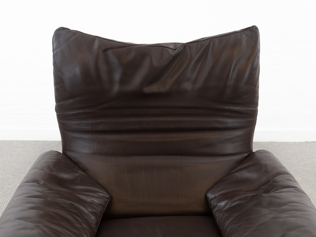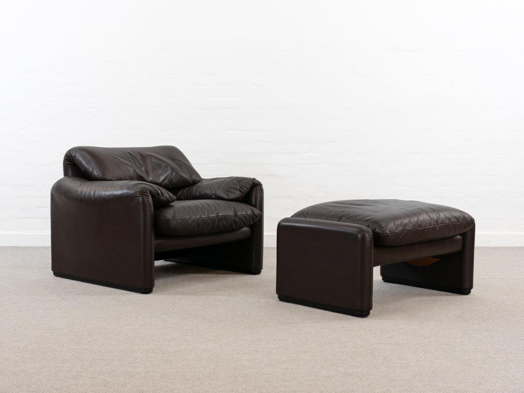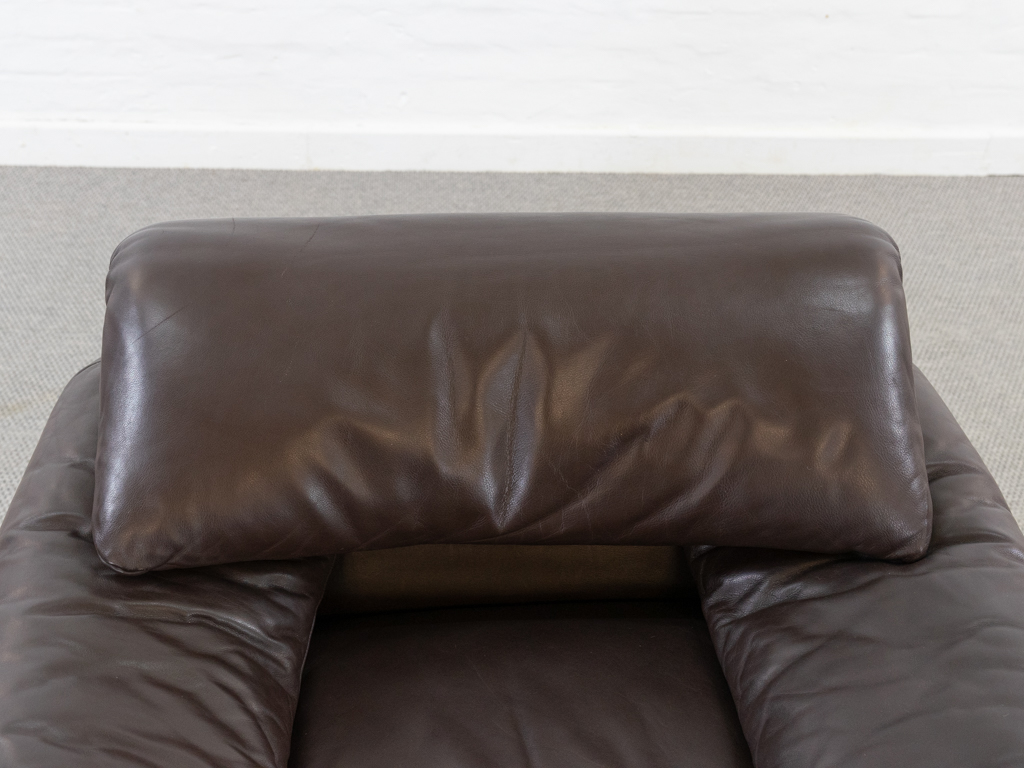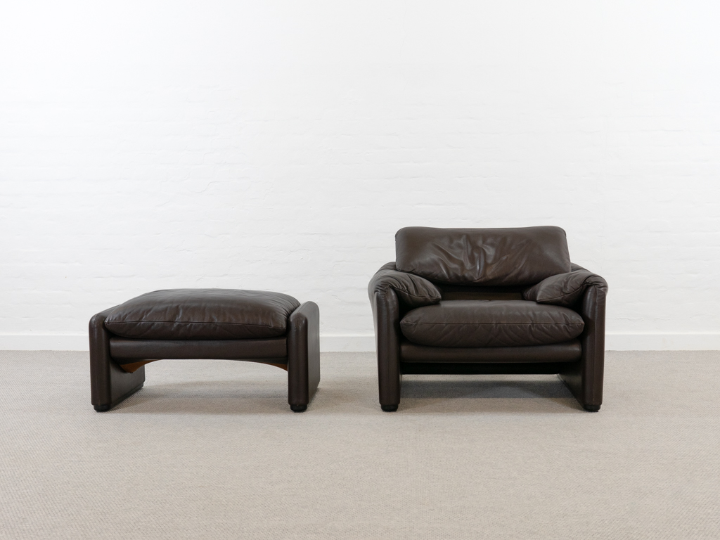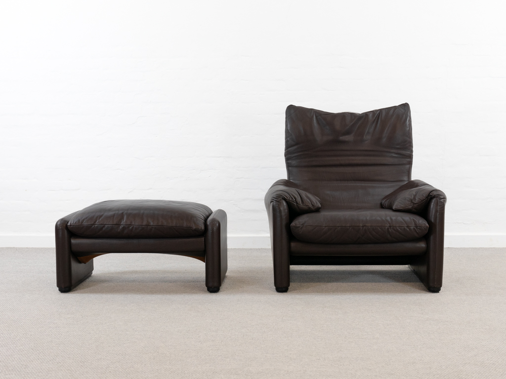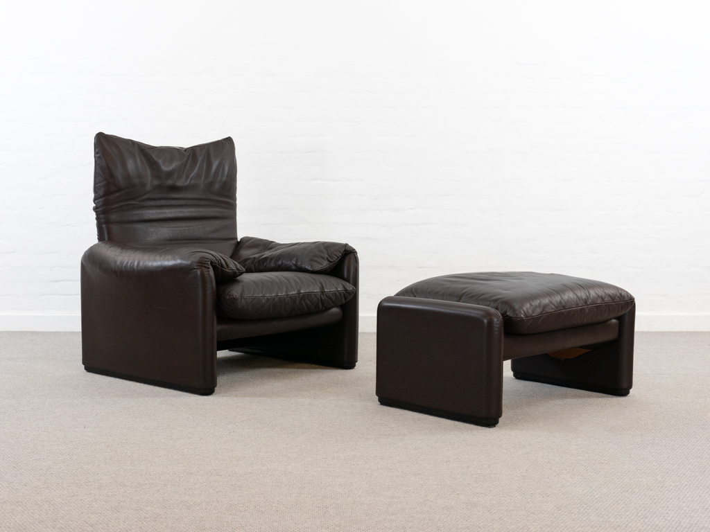 Maralunga Sessel und Fusshocker von Cassina, entworfen 1973 von Vico Magistretti. Ausführung in dunkelbraunem Leder. Der Sessel verfügt über eine faltbare Rückenlehne um verschiedene Sitzpositionen zu ermöglichen. Der Sessel ist mit Herstelleretikett gekennzeichnet. Höhe der niedrigen Position Rückenlehne 72cm, Höhe der hohen Position Rückenlehne: 100cm. Nichtraucher-Objekt. Guter vintage Zustand. Leichte Alters- und Gebrauchsspuren vorhanden. Kratzer und Patina an der rechten Seite. Bitte sehen Sie sich die beigefügten Fotos an. Maße Sessel: B: 100cm, H: 72cm, Tiefe: 85cm, Sitzhöhe ca. 45cm. Maße Hocker: B: 86cm, T: 60cm, H: 45cm