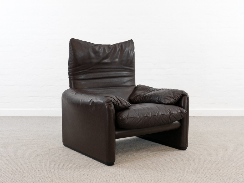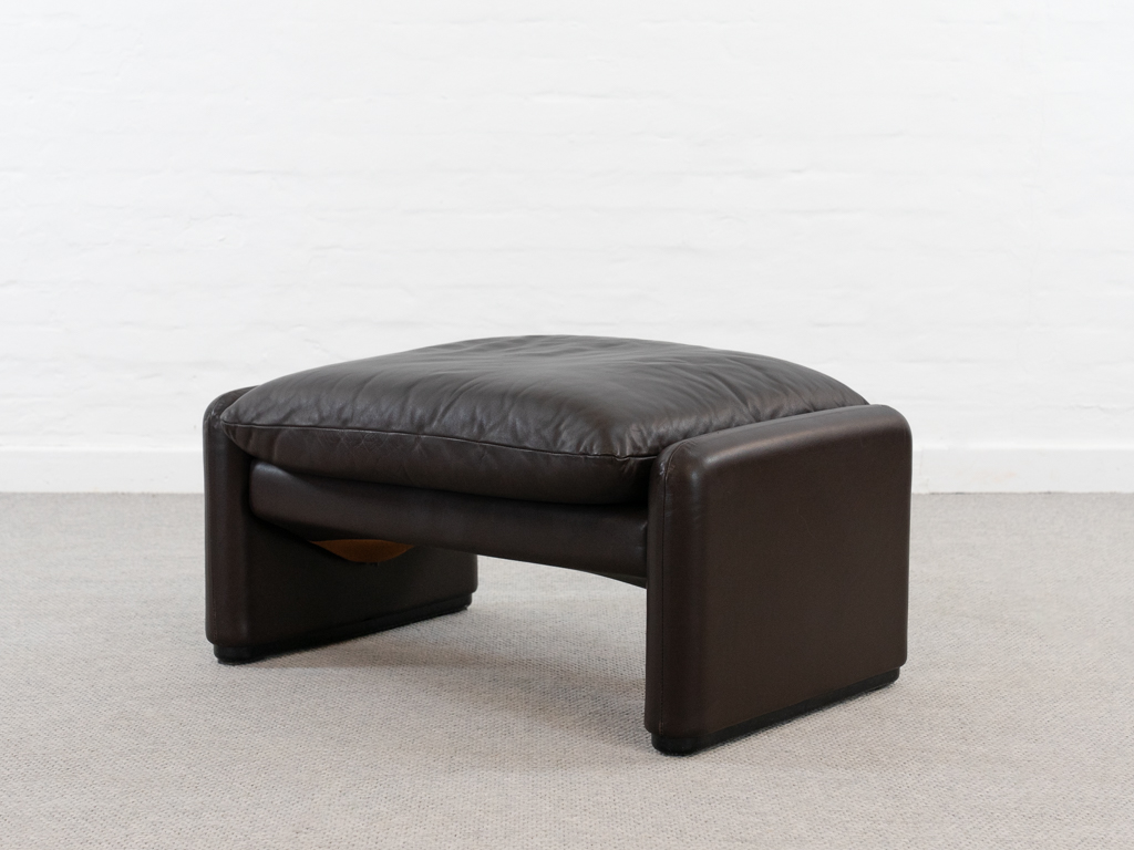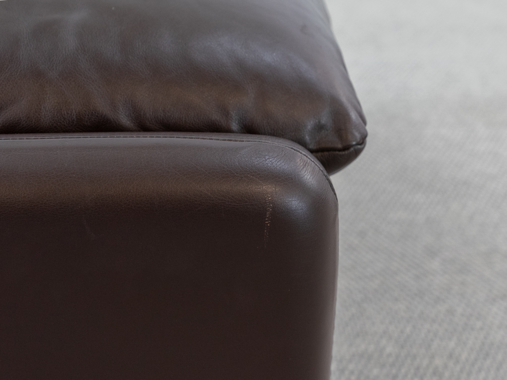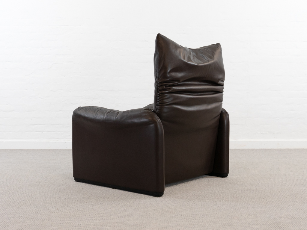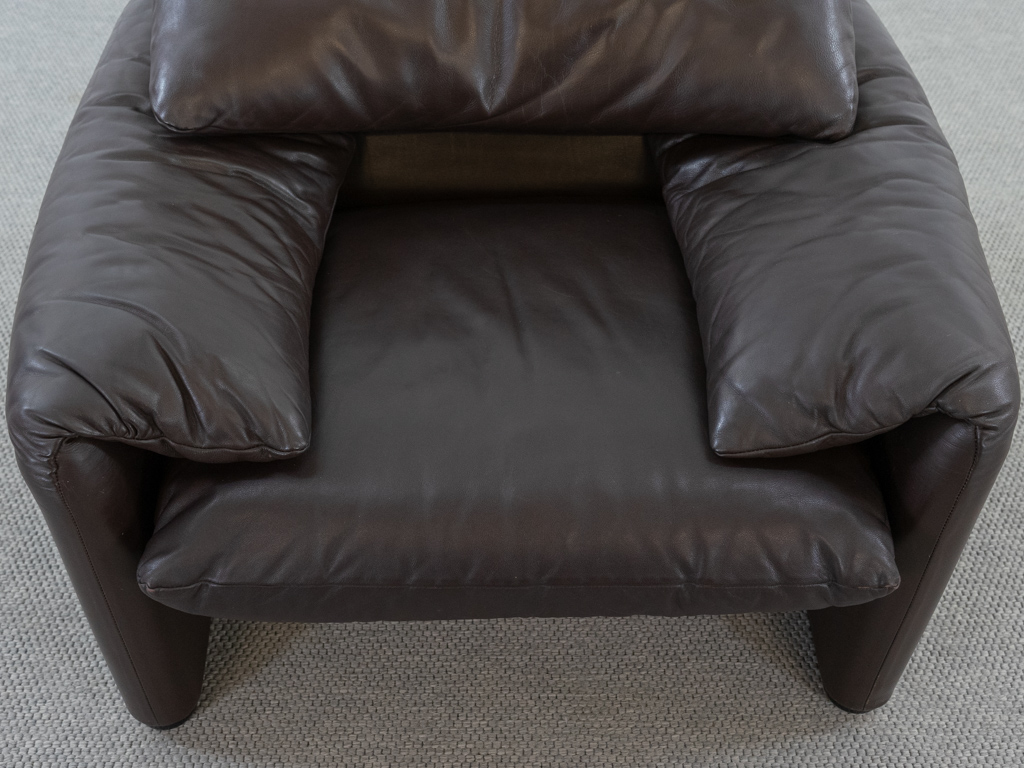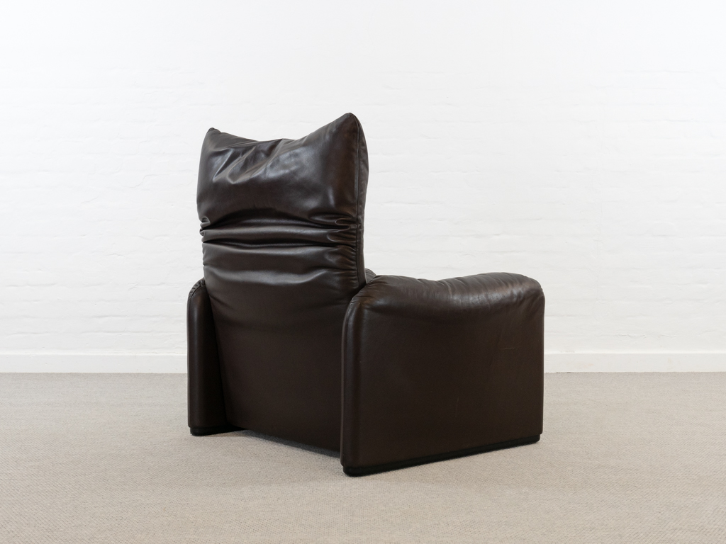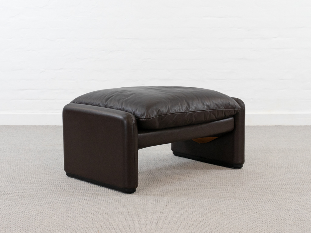 Maralunga Sessel und Fusshocker von Cassina, entworfen 1973 von Vico Magistretti. Ausführung in dunkelbraunem Leder. Der Sessel verfügt über eine faltbare Rückenlehne um verschiedene Sitzpositionen zu ermöglichen. Der Sessel ist mit Herstelleretikett gekennzeichnet. Höhe der niedrigen Position Rückenlehne 72cm, Höhe der hohen Position Rückenlehne: 100cm. Nichtraucher-Objekt. Guter vintage Zustand. Leichte Alters- und Gebrauchsspuren vorhanden. Kratzer und Patina an der rechten Seite. Bitte sehen Sie sich die beigefügten Fotos an. Maße Sessel: B: 100cm, H: 72cm, Tiefe: 85cm, Sitzhöhe ca. 45cm. Maße Hocker: B: 86cm, T: 60cm, H: 45cm