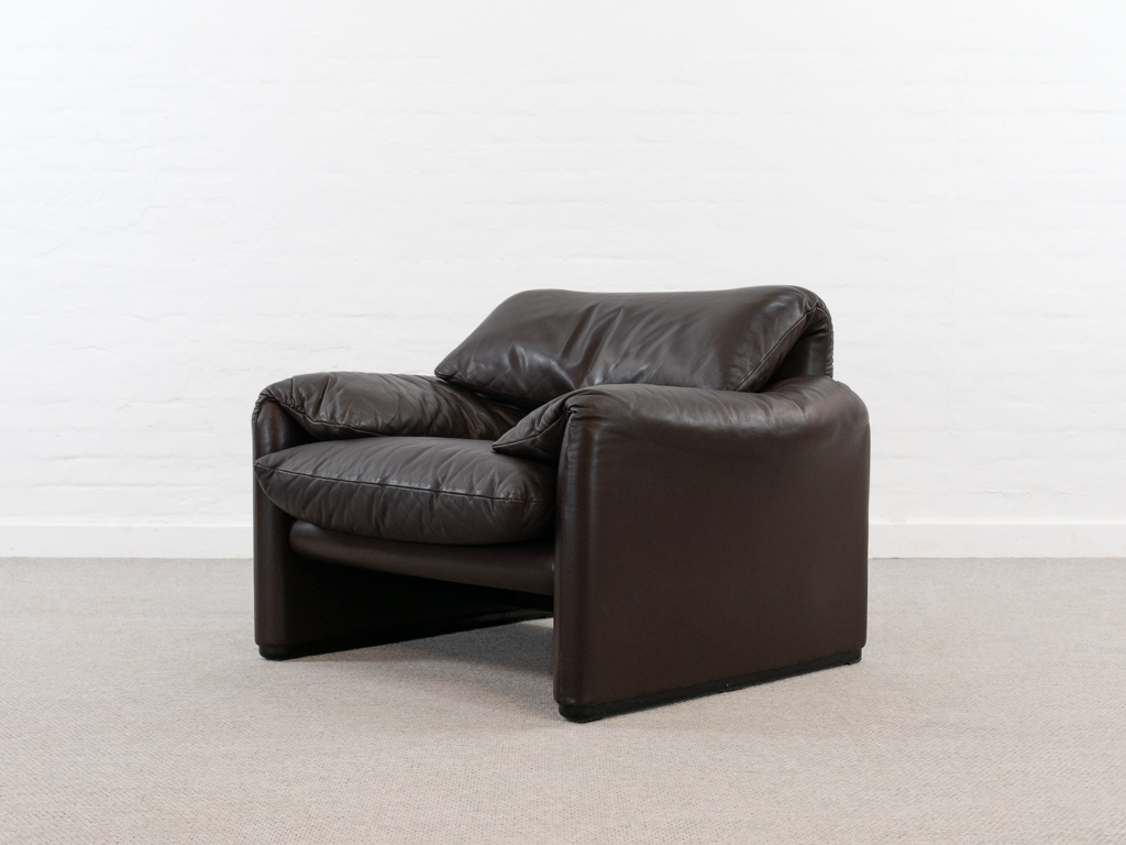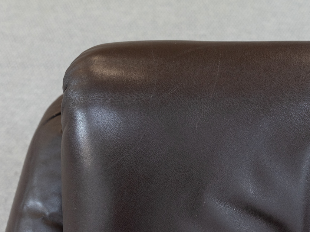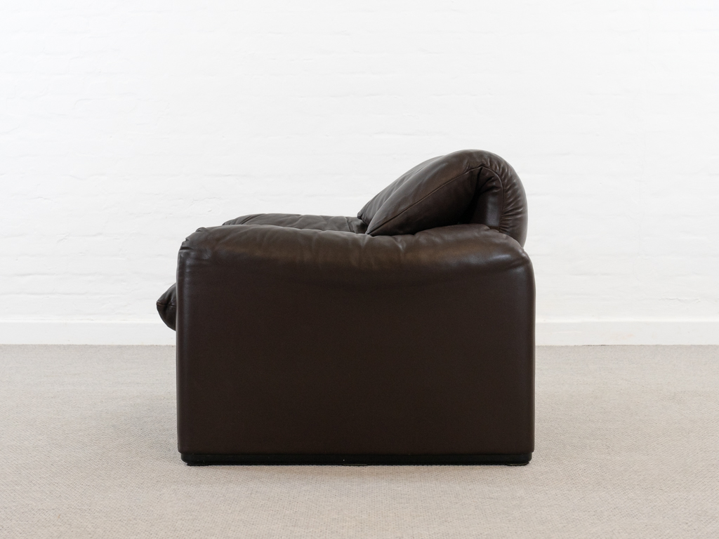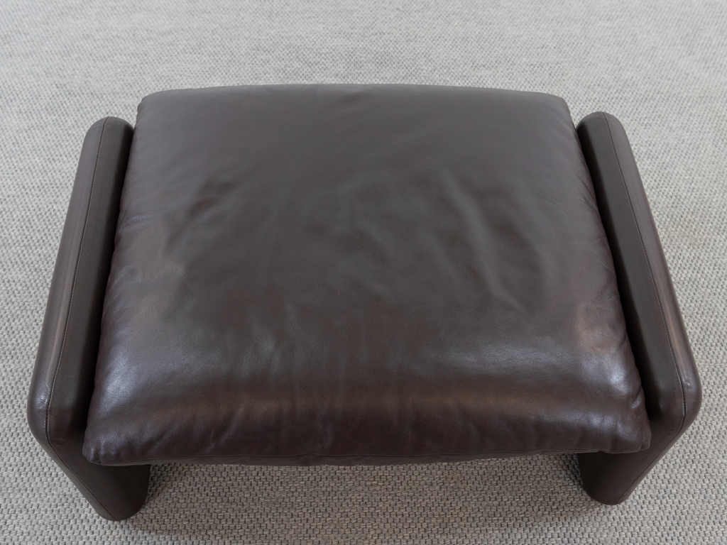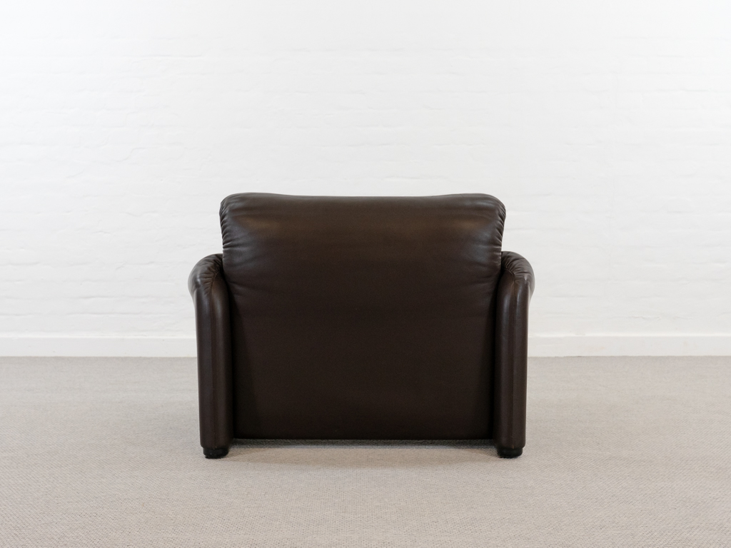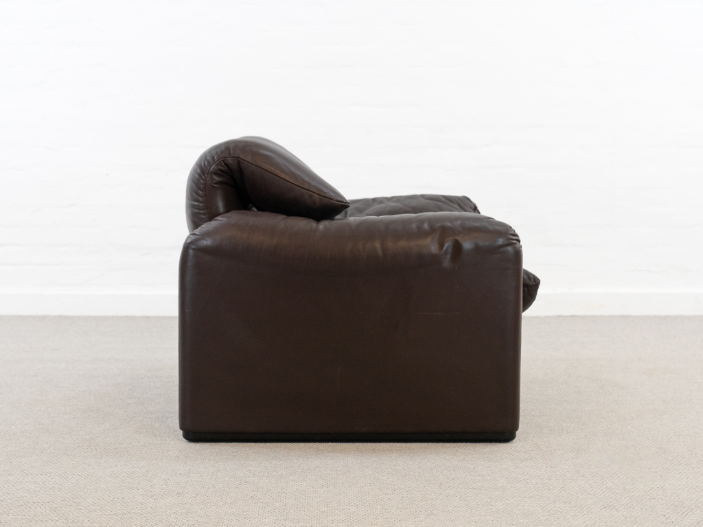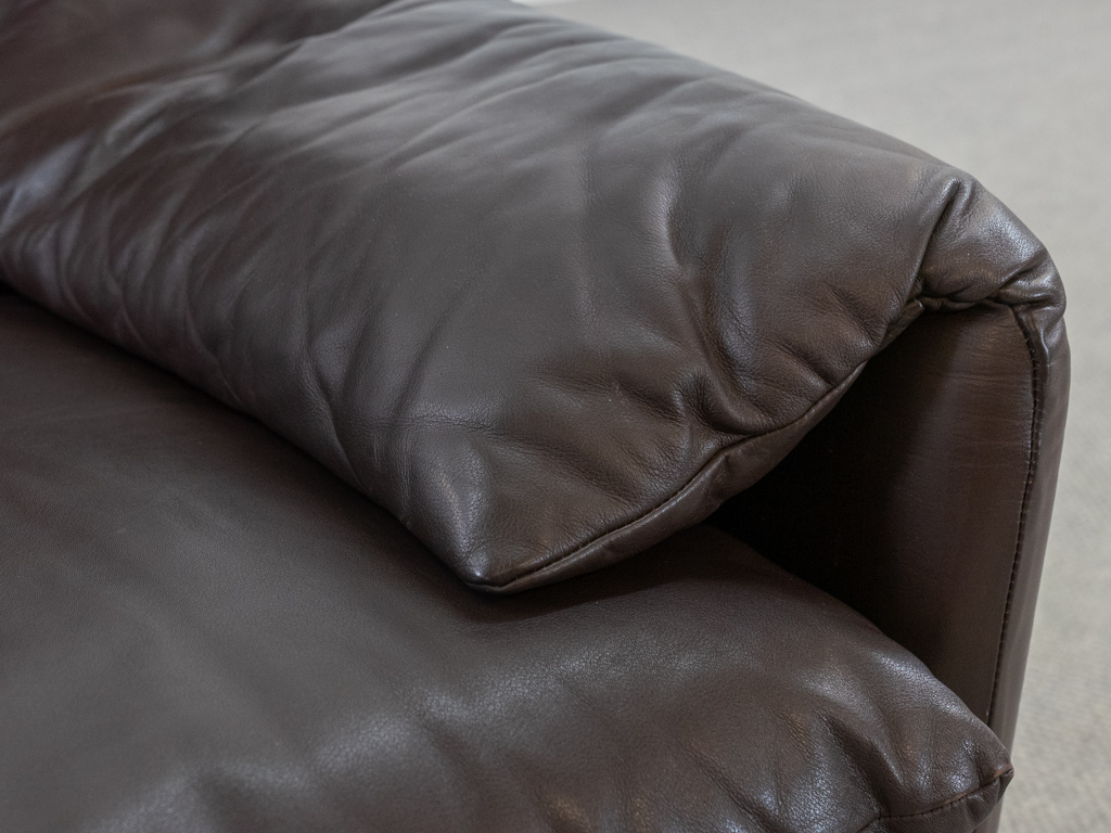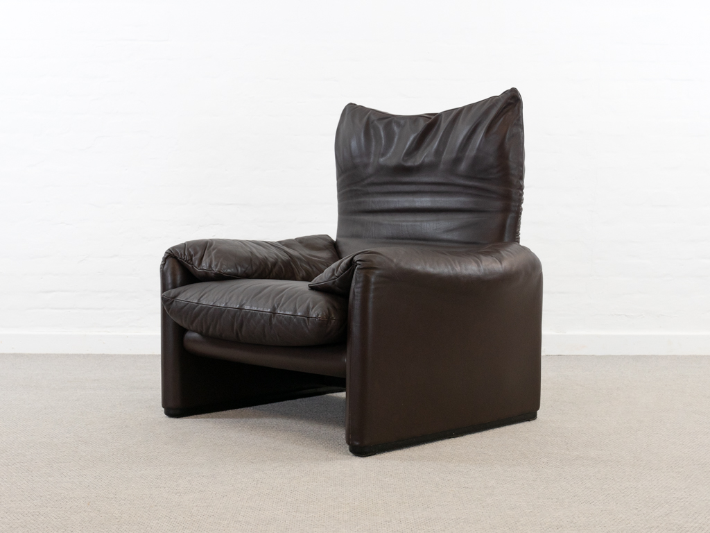 Maralunga Sessel und Fusshocker von Cassina, entworfen 1973 von Vico Magistretti. Ausführung in dunkelbraunem Leder. Der Sessel verfügt über eine faltbare Rückenlehne um verschiedene Sitzpositionen zu ermöglichen. Der Sessel ist mit Herstelleretikett gekennzeichnet. Höhe der niedrigen Position Rückenlehne 72cm, Höhe der hohen Position Rückenlehne: 100cm. Nichtraucher-Objekt. Guter vintage Zustand. Leichte Alters- und Gebrauchsspuren vorhanden. Kratzer und Patina an der rechten Seite. Bitte sehen Sie sich die beigefügten Fotos an. Maße Sessel: B: 100cm, H: 72cm, Tiefe: 85cm, Sitzhöhe ca. 45cm. Maße Hocker: B: 86cm, T: 60cm, H: 45cm