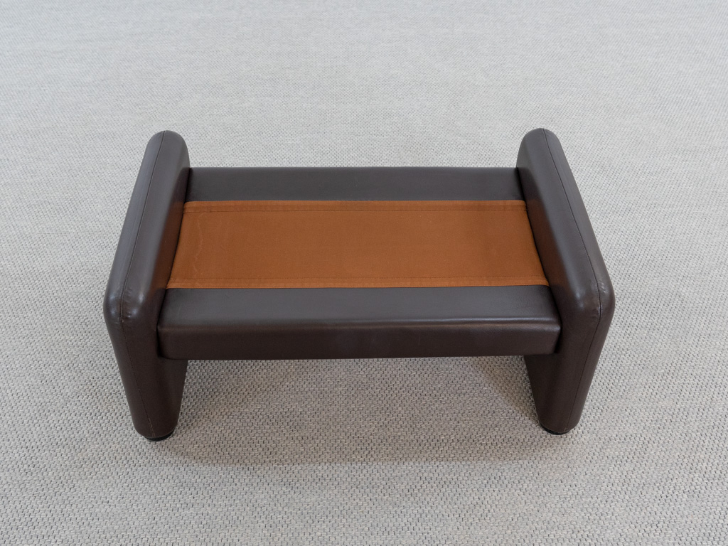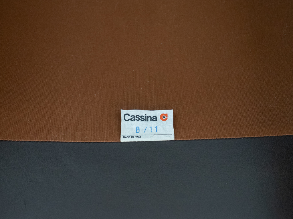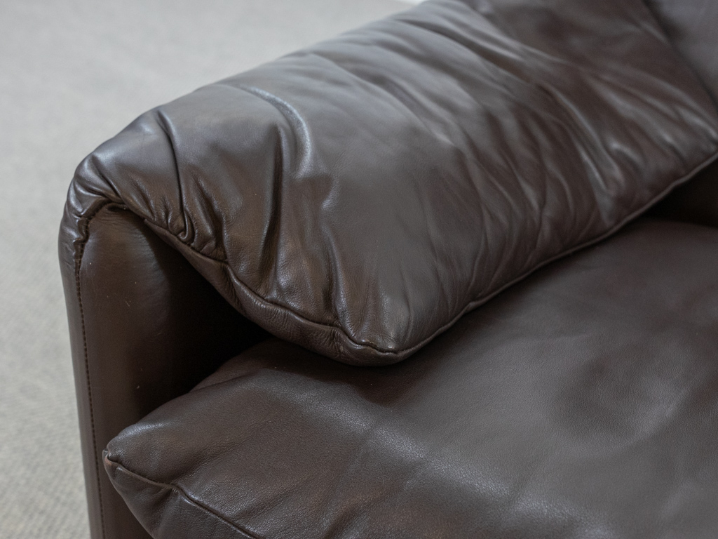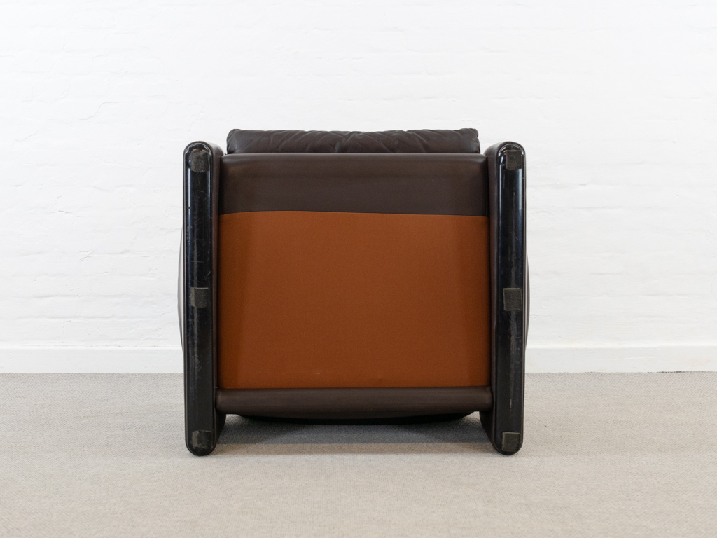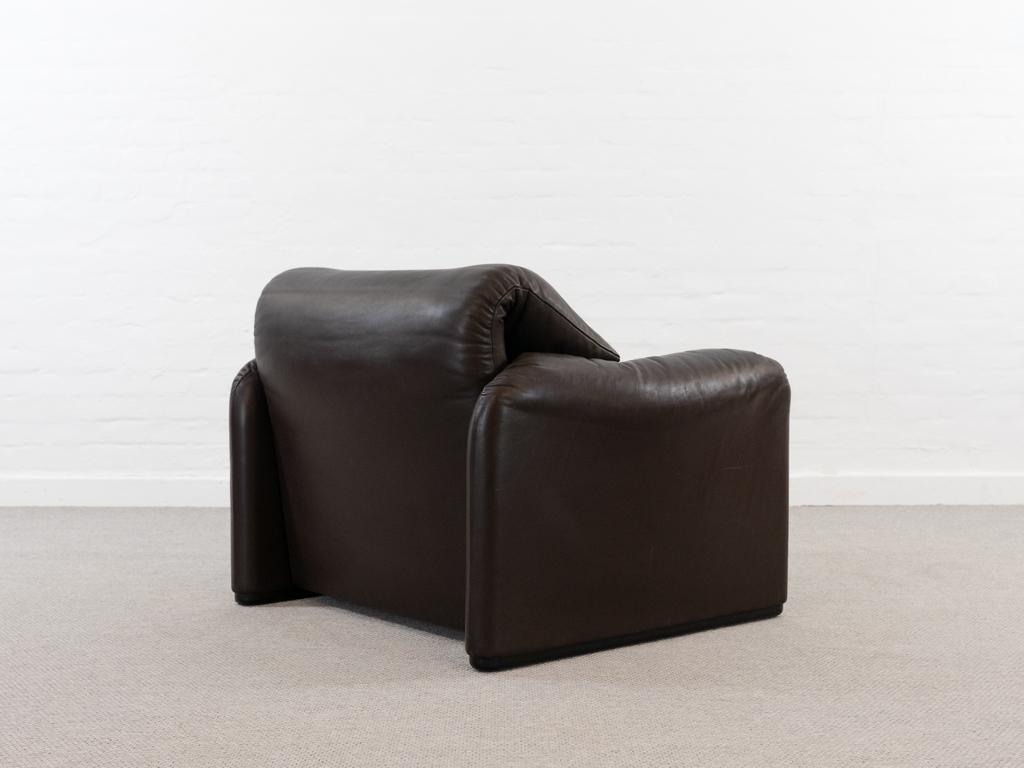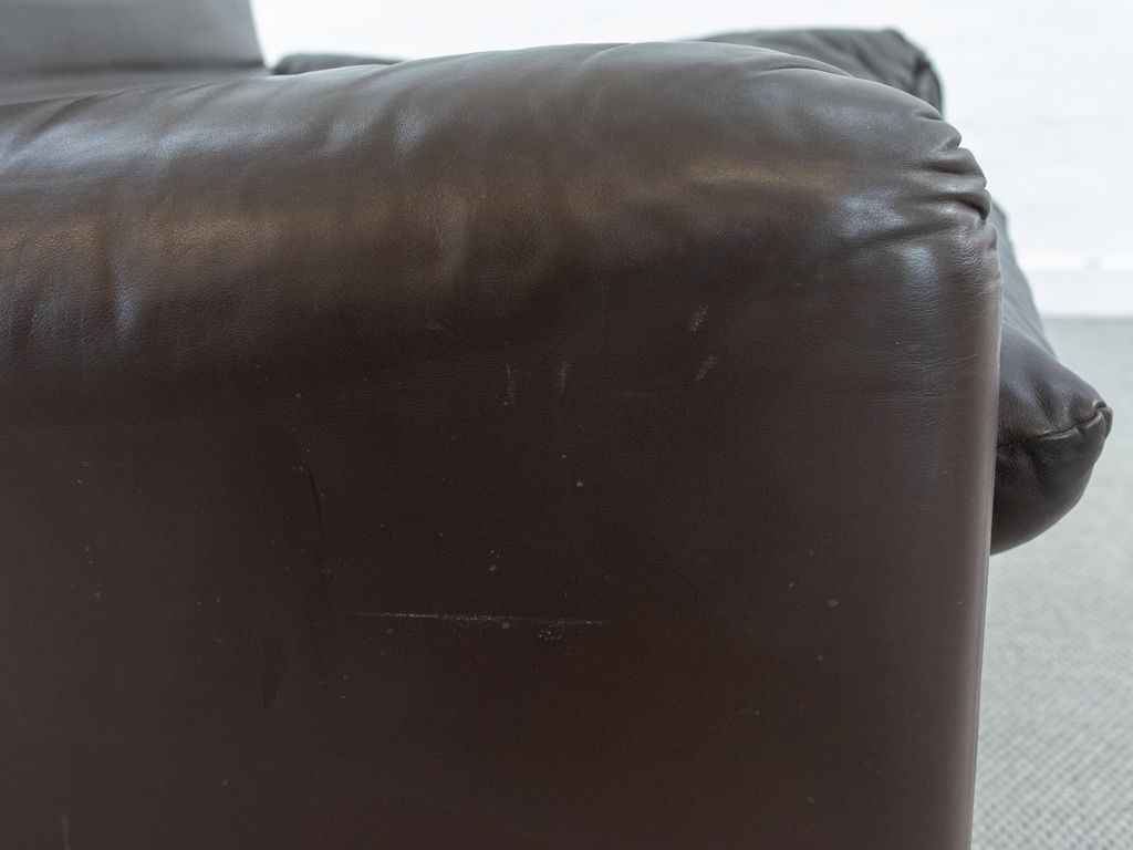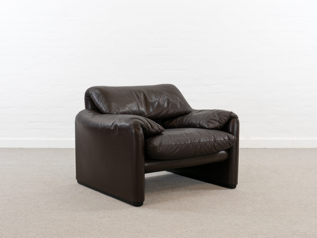 Maralunga Sessel und Fusshocker von Cassina, entworfen 1973 von Vico Magistretti. Ausführung in dunkelbraunem Leder. Der Sessel verfügt über eine faltbare Rückenlehne um verschiedene Sitzpositionen zu ermöglichen. Der Sessel ist mit Herstelleretikett gekennzeichnet. Höhe der niedrigen Position Rückenlehne 72cm, Höhe der hohen Position Rückenlehne: 100cm. Nichtraucher-Objekt. Guter vintage Zustand. Leichte Alters- und Gebrauchsspuren vorhanden. Kratzer und Patina an der rechten Seite. Bitte sehen Sie sich die beigefügten Fotos an. Maße Sessel: B: 100cm, H: 72cm, Tiefe: 85cm, Sitzhöhe ca. 45cm. Maße Hocker: B: 86cm, T: 60cm, H: 45cm