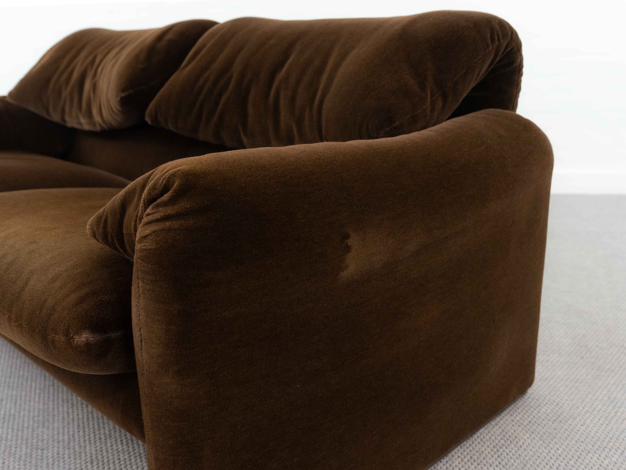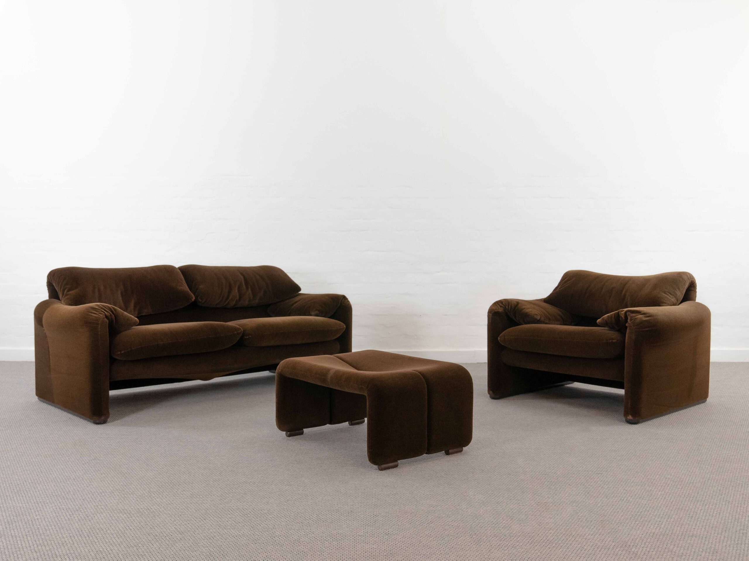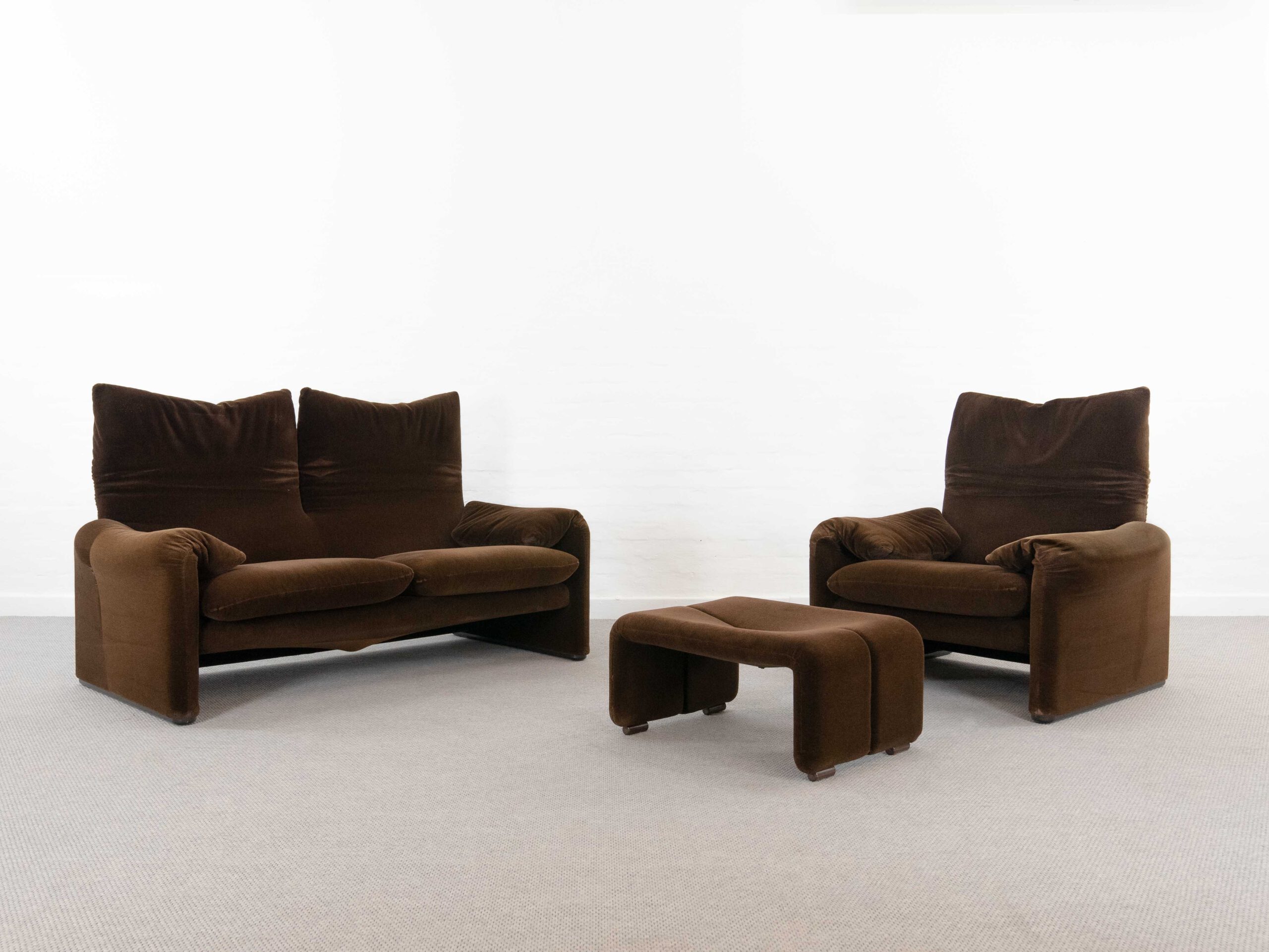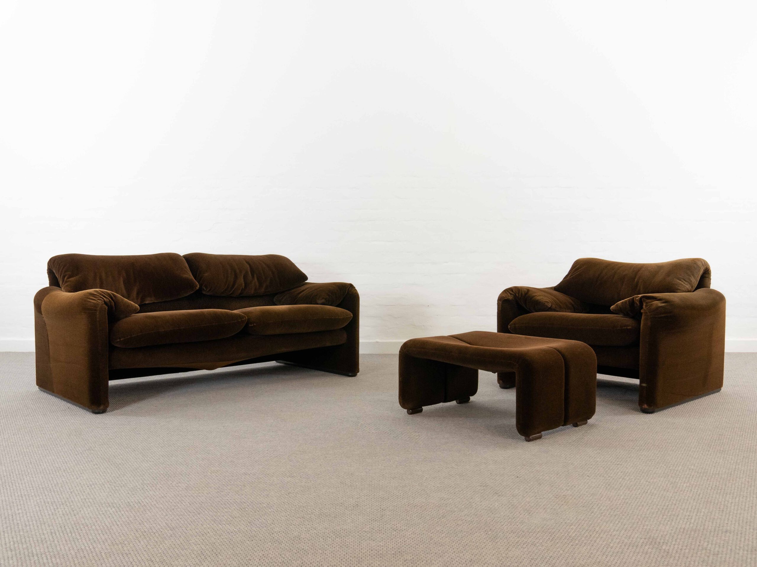 Sitzgruppe bestehend aus Cassina Maralunga 2-sitzer Sofa, Maralunga Sessel sowie einem B&B Italia Fusshocker. Die Sitzgruppe wurde in den frühen 80ern mit einem dunkelbraunem teddy-/samtähnlichem Stoff bezogen, daher ist kein Herstelleretikett mehr vorhanden. Nichtraucherobjekt. Die Rückenlehnenmechanik funktioniert, gutes Sitzgefühl, nicht durchgesessen. Der Stoff weist etwas Abrieb an den Fusskanten und teilw. an den Kissenecken des Sofas und des Sessels auf. Bitte sehen sie sich die beigefügten Fotos an. Die rechte Seite des Sofas weist eine Verfärbung auf, da das Sofa seit den 80ern teilw. verdeckt gestanden hat und im vorderen Teil etwas mehr ausgeblichen ist. Der Hocker ist von B&B Italia, Entwurf von Afra&Tobia Scarpa, Modell Coronado. Maße Sofa: B.165cm, H.70/100, T.85 Maße Sessel: B.100, H.70/100, T.85