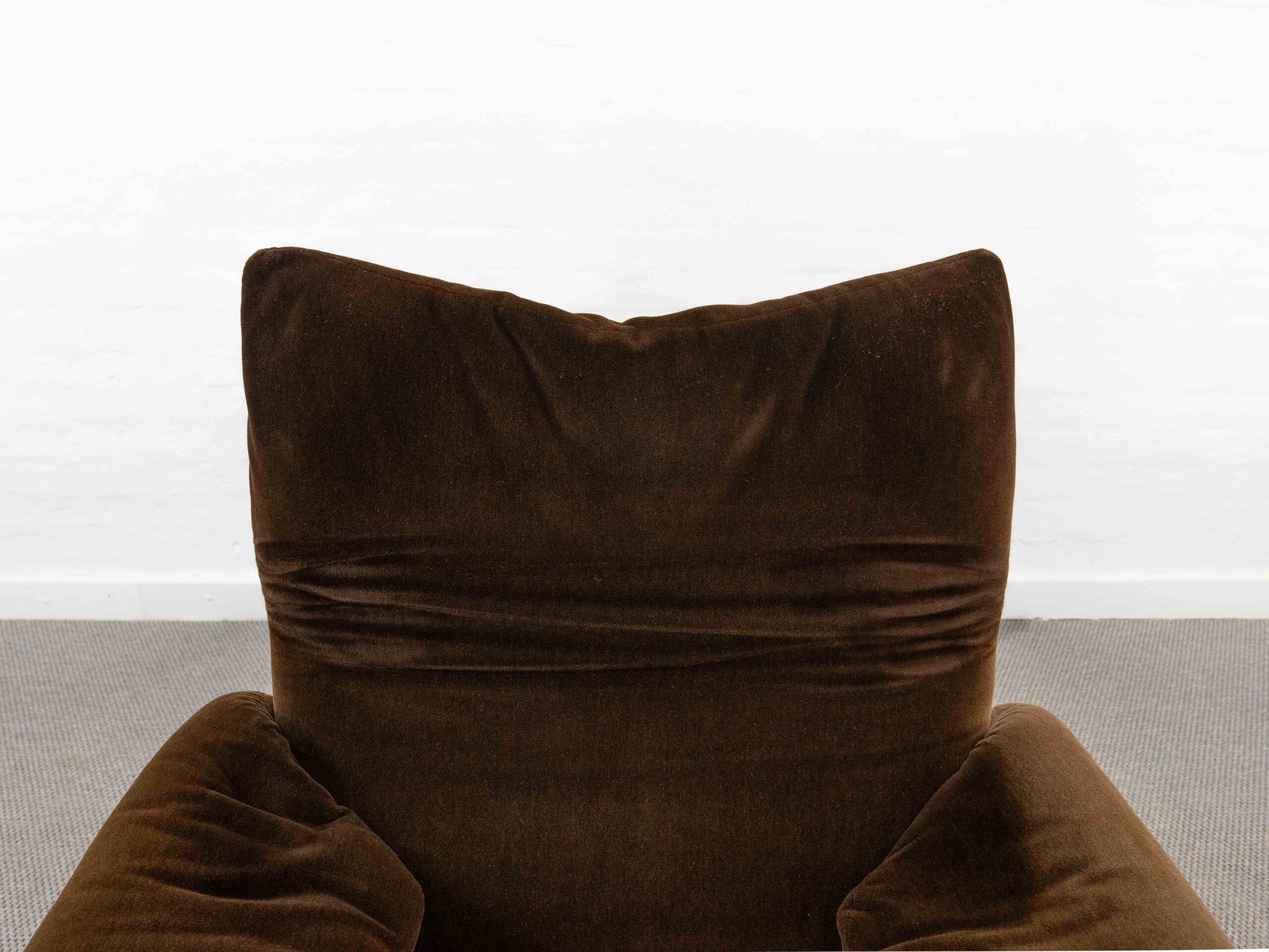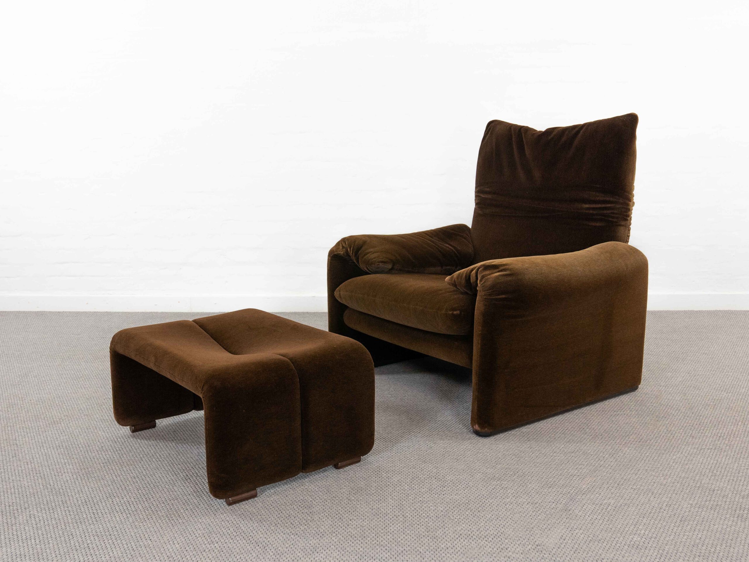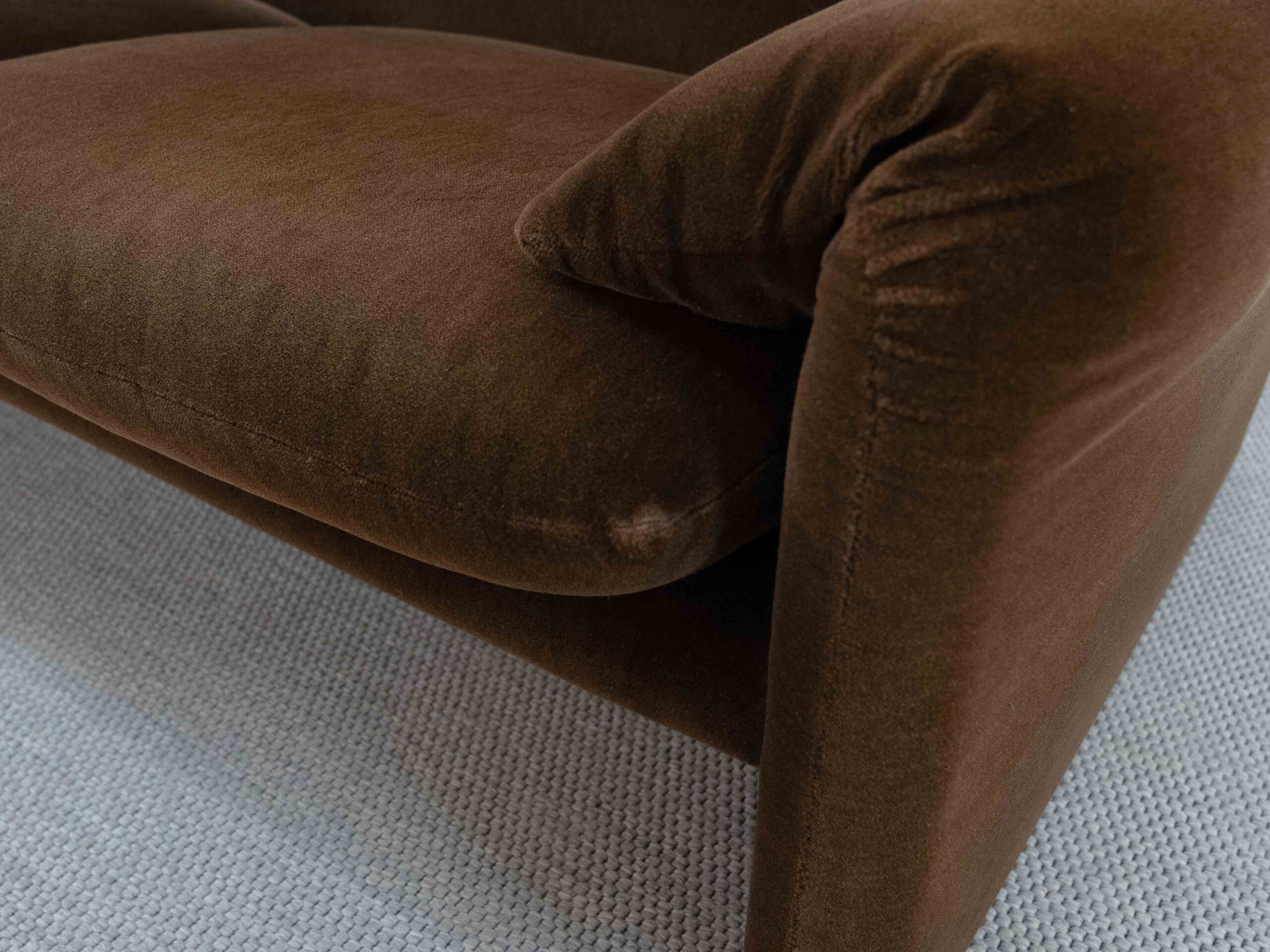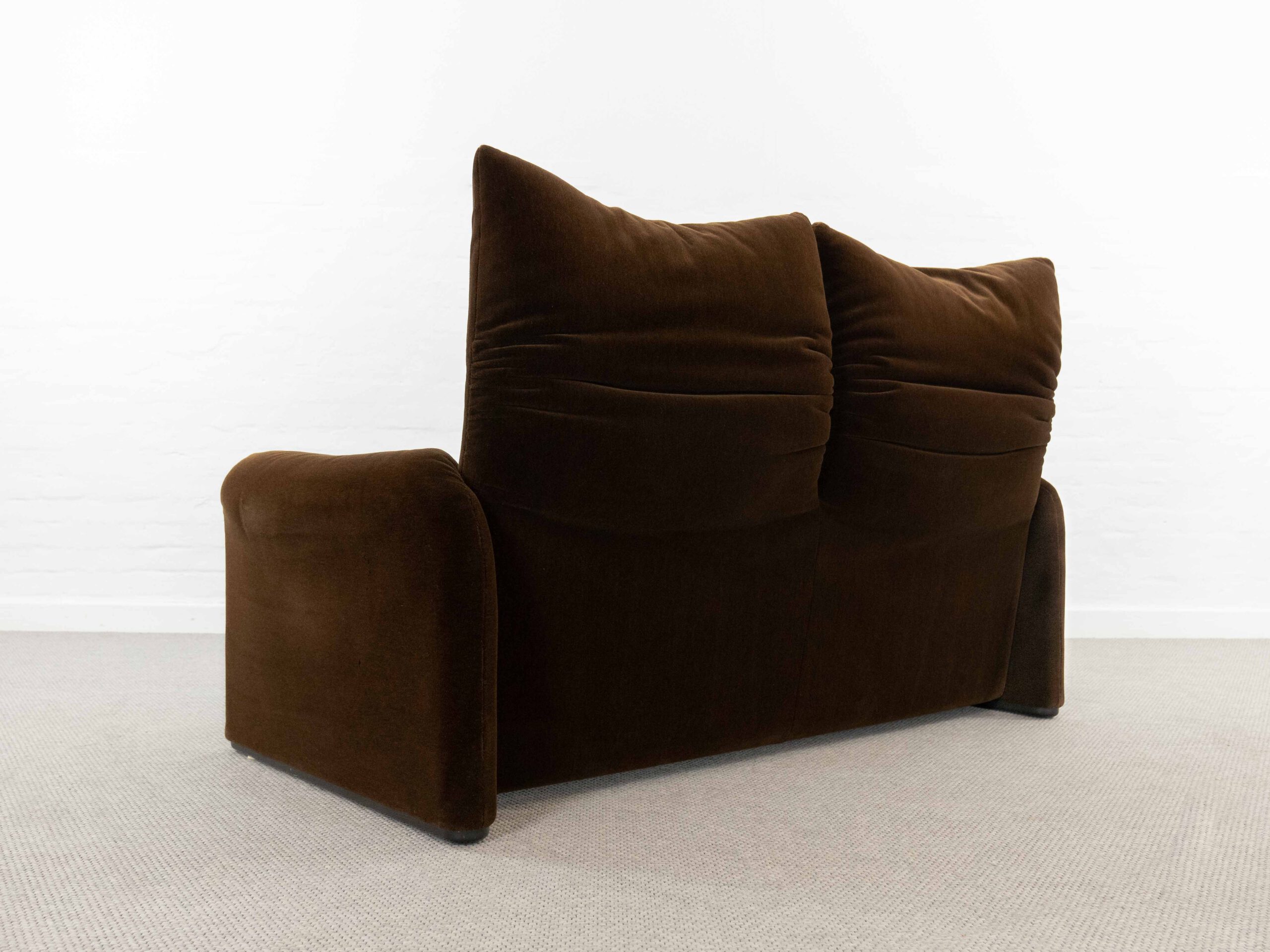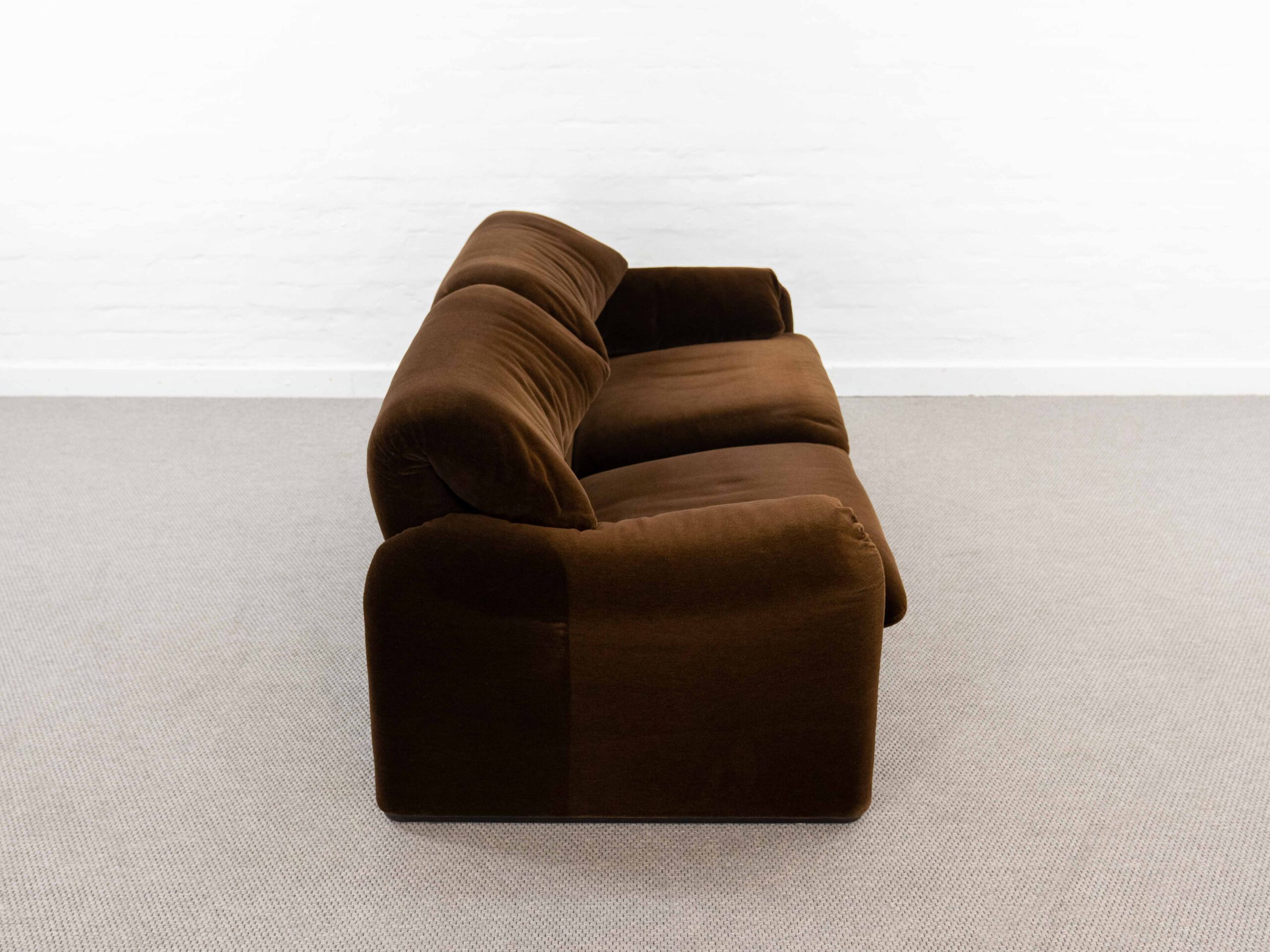 Sitzgruppe bestehend aus Cassina Maralunga 2-sitzer Sofa, Maralunga Sessel sowie einem B&B Italia Fusshocker. Die Sitzgruppe wurde in den frühen 80ern mit einem dunkelbraunem teddy-/samtähnlichem Stoff bezogen, daher ist kein Herstelleretikett mehr vorhanden. Nichtraucherobjekt. Die Rückenlehnenmechanik funktioniert, gutes Sitzgefühl, nicht durchgesessen. Der Stoff weist etwas Abrieb an den Fusskanten und teilw. an den Kissenecken des Sofas und des Sessels auf. Bitte sehen sie sich die beigefügten Fotos an. Die rechte Seite des Sofas weist eine Verfärbung auf, da das Sofa seit den 80ern teilw. verdeckt gestanden hat und im vorderen Teil etwas mehr ausgeblichen ist. Der Hocker ist von B&B Italia, Entwurf von Afra&Tobia Scarpa, Modell Coronado. Maße Sofa: B.165cm, H.70/100, T.85 Maße Sessel: B.100, H.70/100, T.85