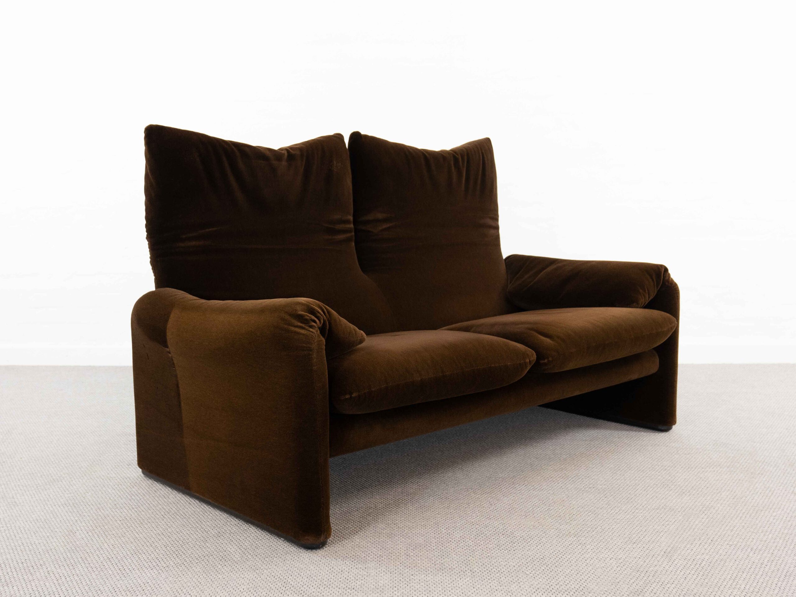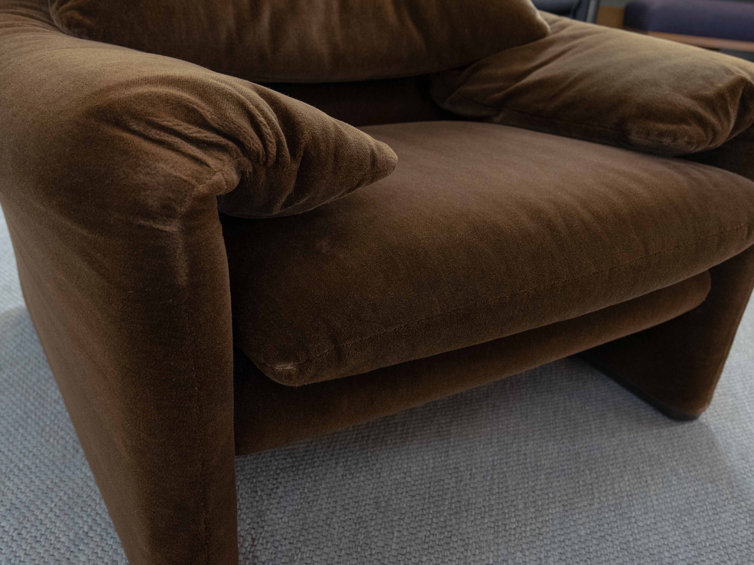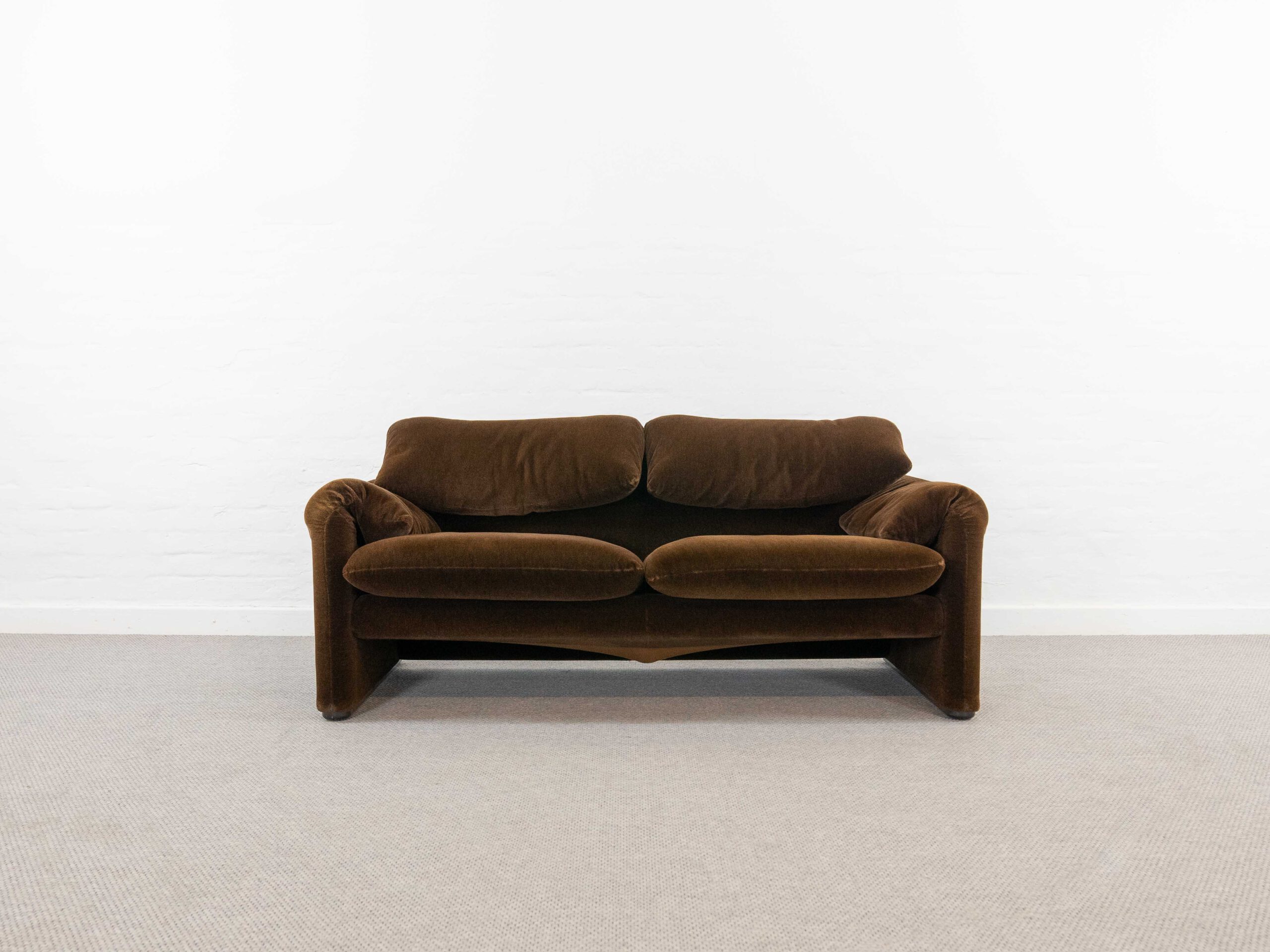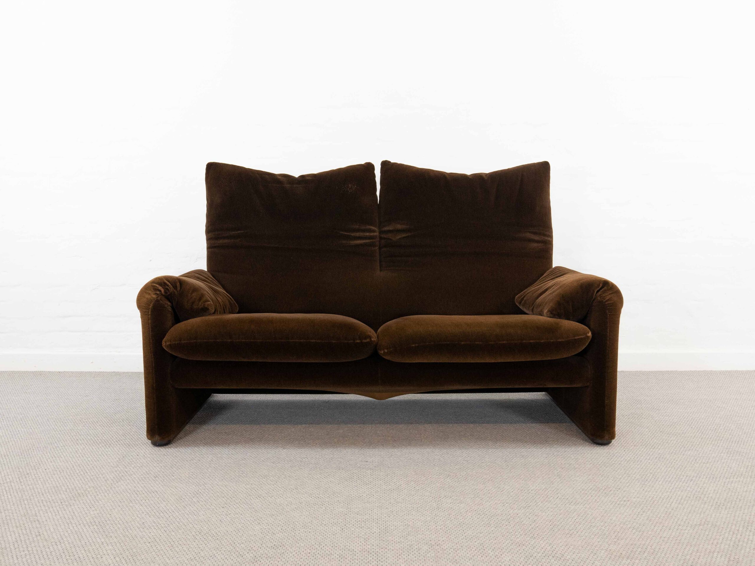 Sitzgruppe bestehend aus Cassina Maralunga 2-sitzer Sofa, Maralunga Sessel sowie einem B&B Italia Fusshocker. Die Sitzgruppe wurde in den frühen 80ern mit einem dunkelbraunem teddy-/samtähnlichem Stoff bezogen, daher ist kein Herstelleretikett mehr vorhanden. Nichtraucherobjekt. Die Rückenlehnenmechanik funktioniert, gutes Sitzgefühl, nicht durchgesessen. Der Stoff weist etwas Abrieb an den Fusskanten und teilw. an den Kissenecken des Sofas und des Sessels auf. Bitte sehen sie sich die beigefügten Fotos an. Die rechte Seite des Sofas weist eine Verfärbung auf, da das Sofa seit den 80ern teilw. verdeckt gestanden hat und im vorderen Teil etwas mehr ausgeblichen ist. Der Hocker ist von B&B Italia, Entwurf von Afra&Tobia Scarpa, Modell Coronado. Maße Sofa: B.165cm, H.70/100, T.85 Maße Sessel: B.100, H.70/100, T.85