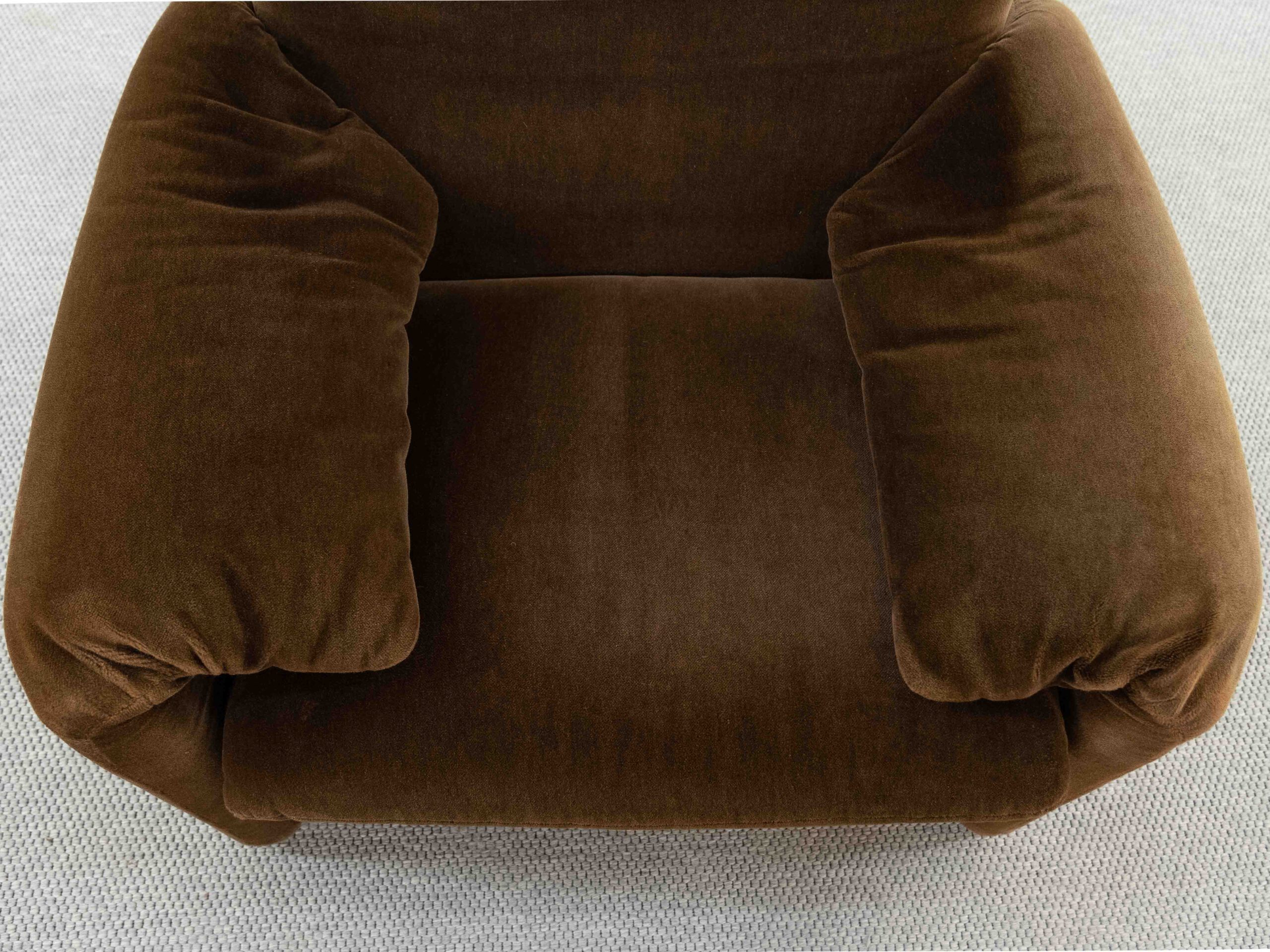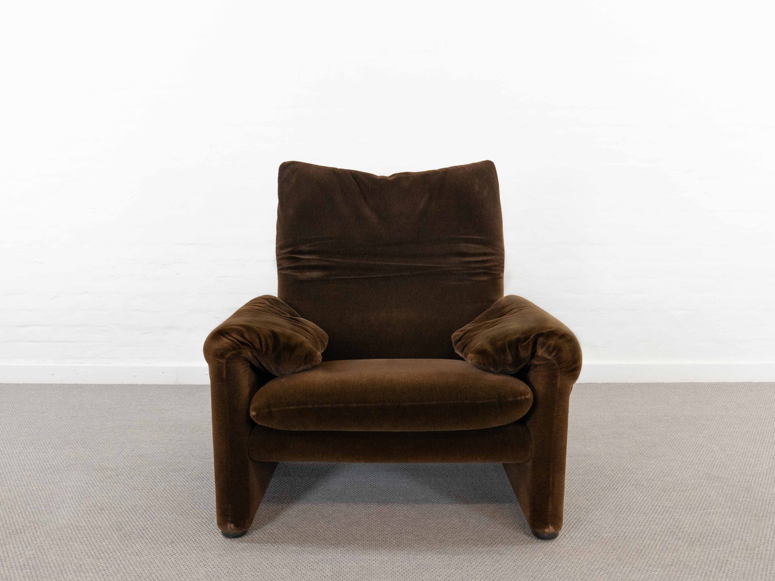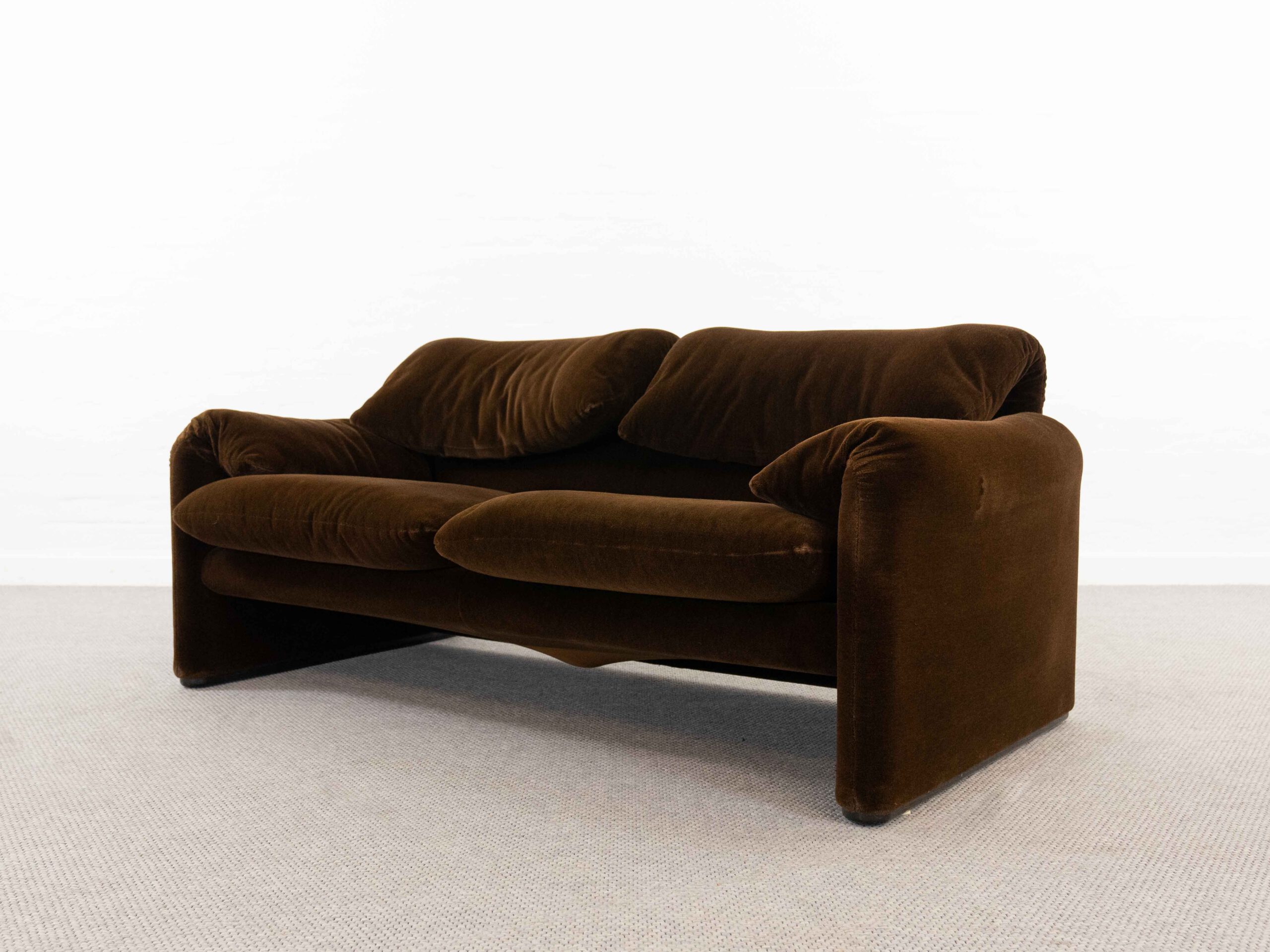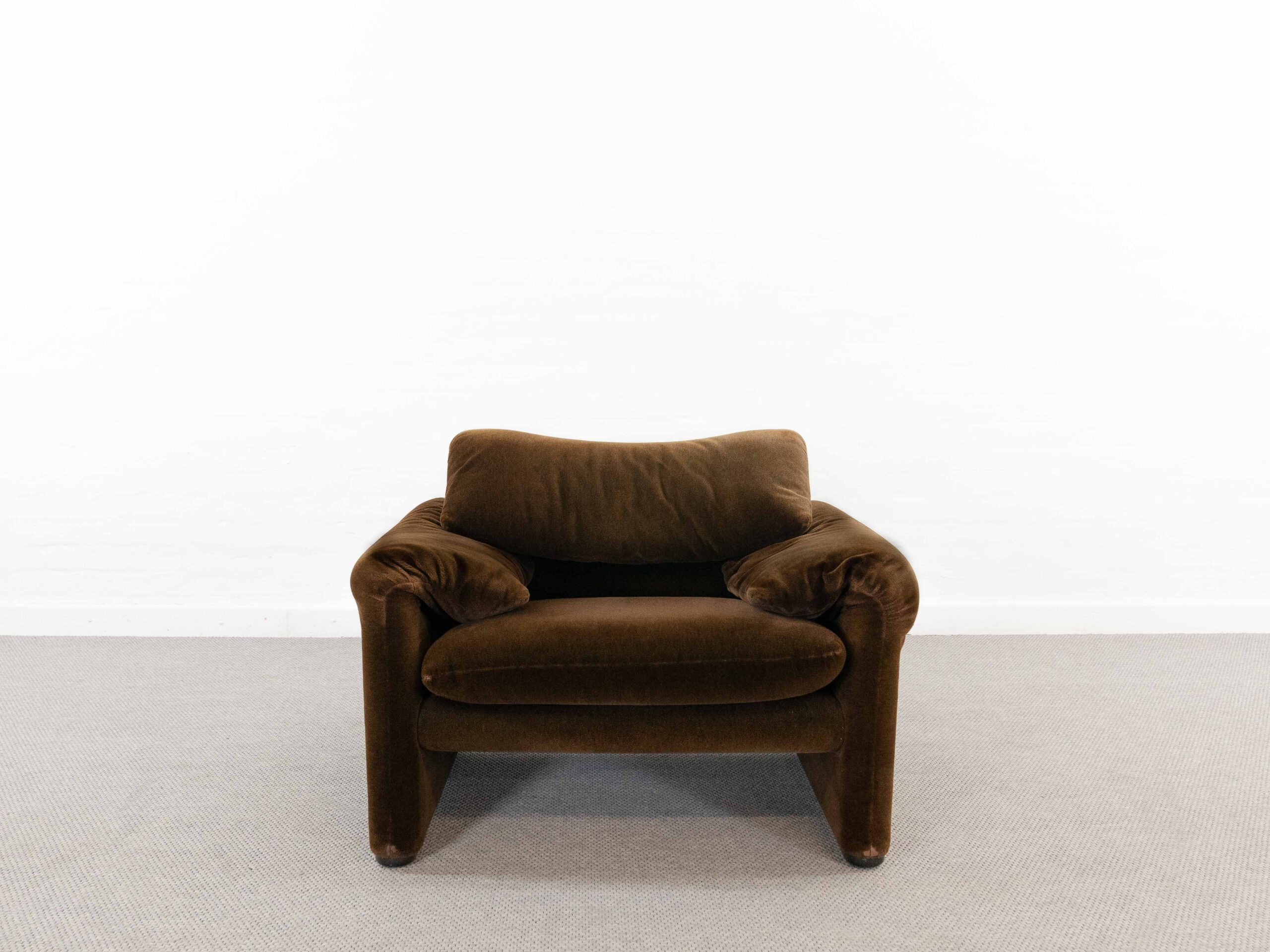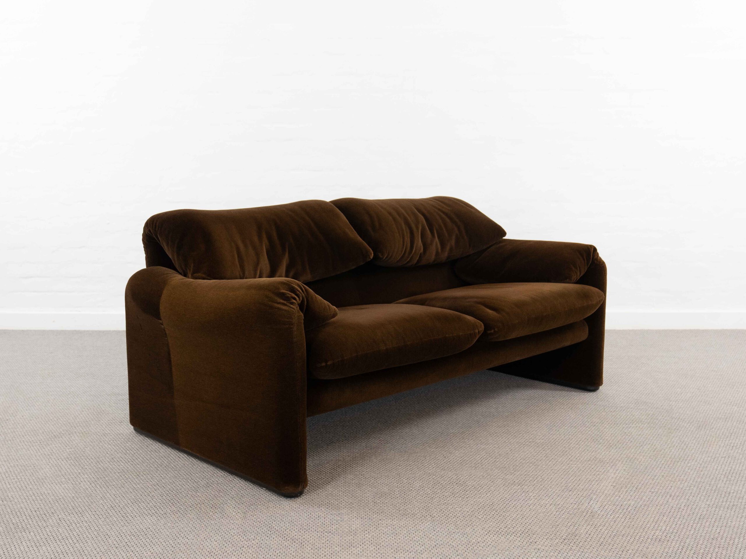 Sitzgruppe bestehend aus Cassina Maralunga 2-sitzer Sofa, Maralunga Sessel sowie einem B&B Italia Fusshocker. Die Sitzgruppe wurde in den frühen 80ern mit einem dunkelbraunem teddy-/samtähnlichem Stoff bezogen, daher ist kein Herstelleretikett mehr vorhanden. Nichtraucherobjekt. Die Rückenlehnenmechanik funktioniert, gutes Sitzgefühl, nicht durchgesessen. Der Stoff weist etwas Abrieb an den Fusskanten und teilw. an den Kissenecken des Sofas und des Sessels auf. Bitte sehen sie sich die beigefügten Fotos an. Die rechte Seite des Sofas weist eine Verfärbung auf, da das Sofa seit den 80ern teilw. verdeckt gestanden hat und im vorderen Teil etwas mehr ausgeblichen ist. Der Hocker ist von B&B Italia, Entwurf von Afra&Tobia Scarpa, Modell Coronado. Maße Sofa: B.165cm, H.70/100, T.85 Maße Sessel: B.100, H.70/100, T.85