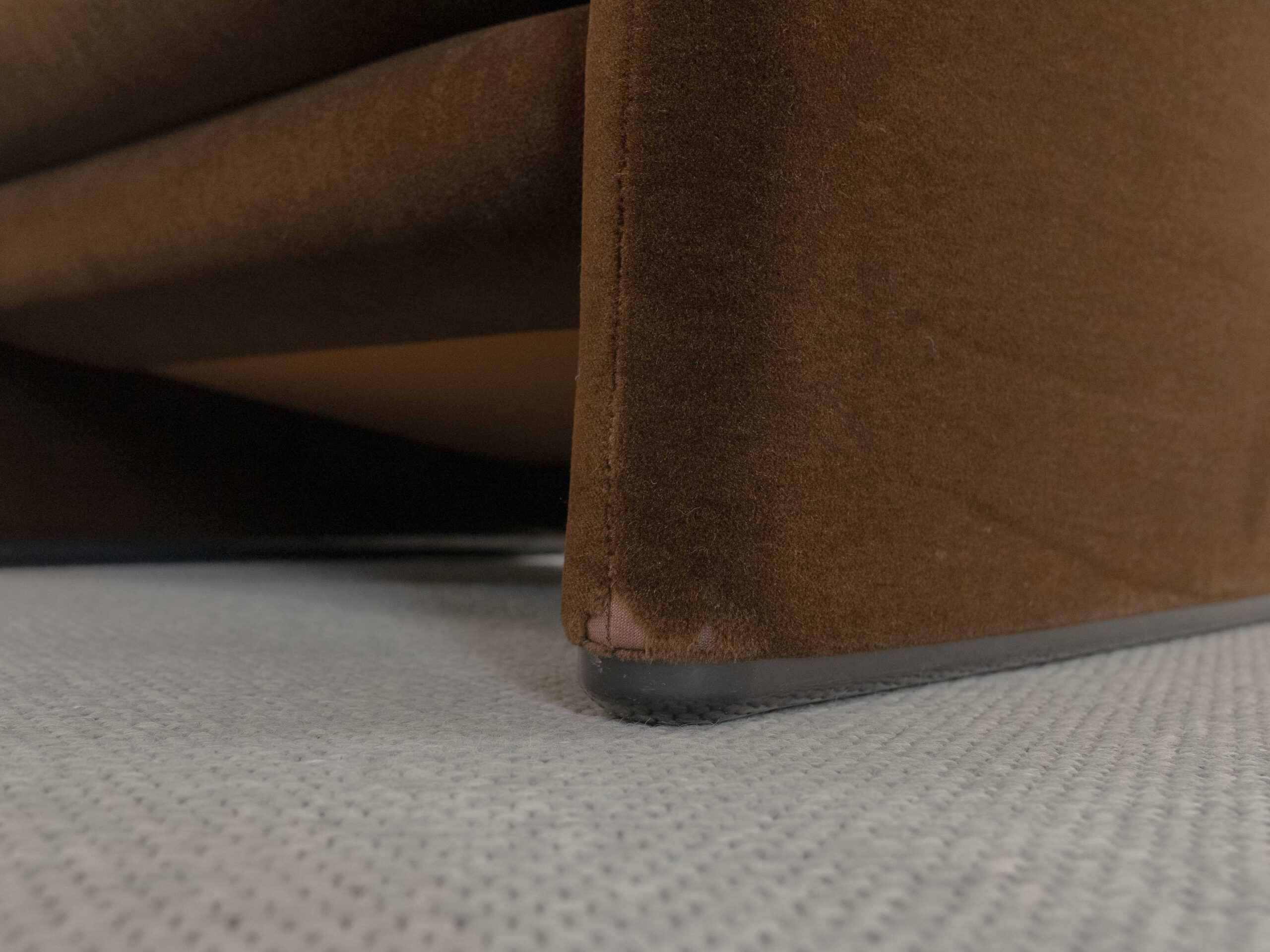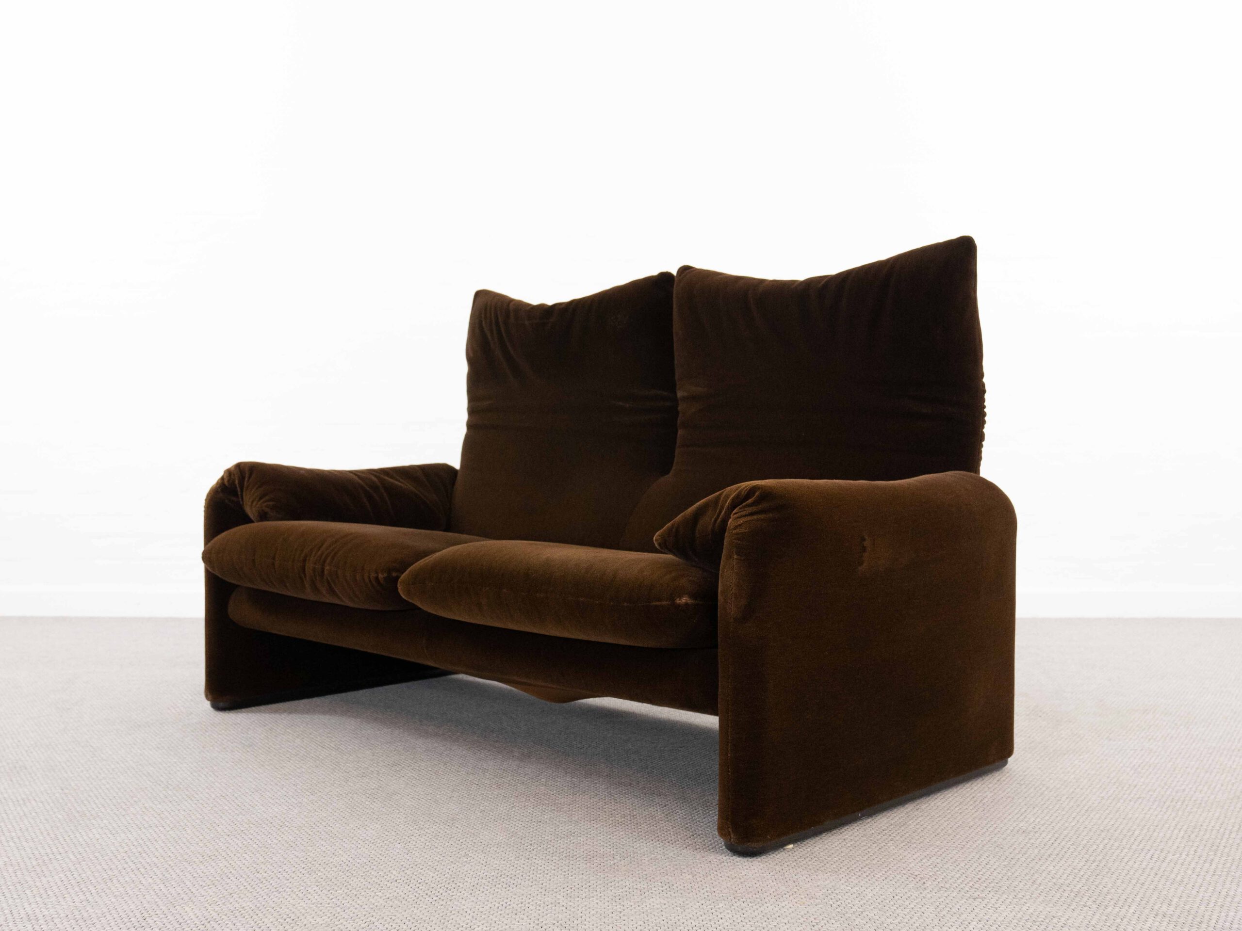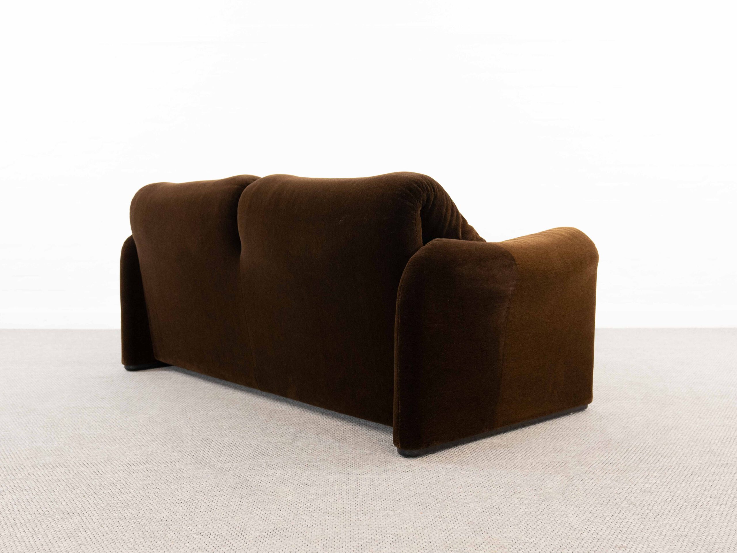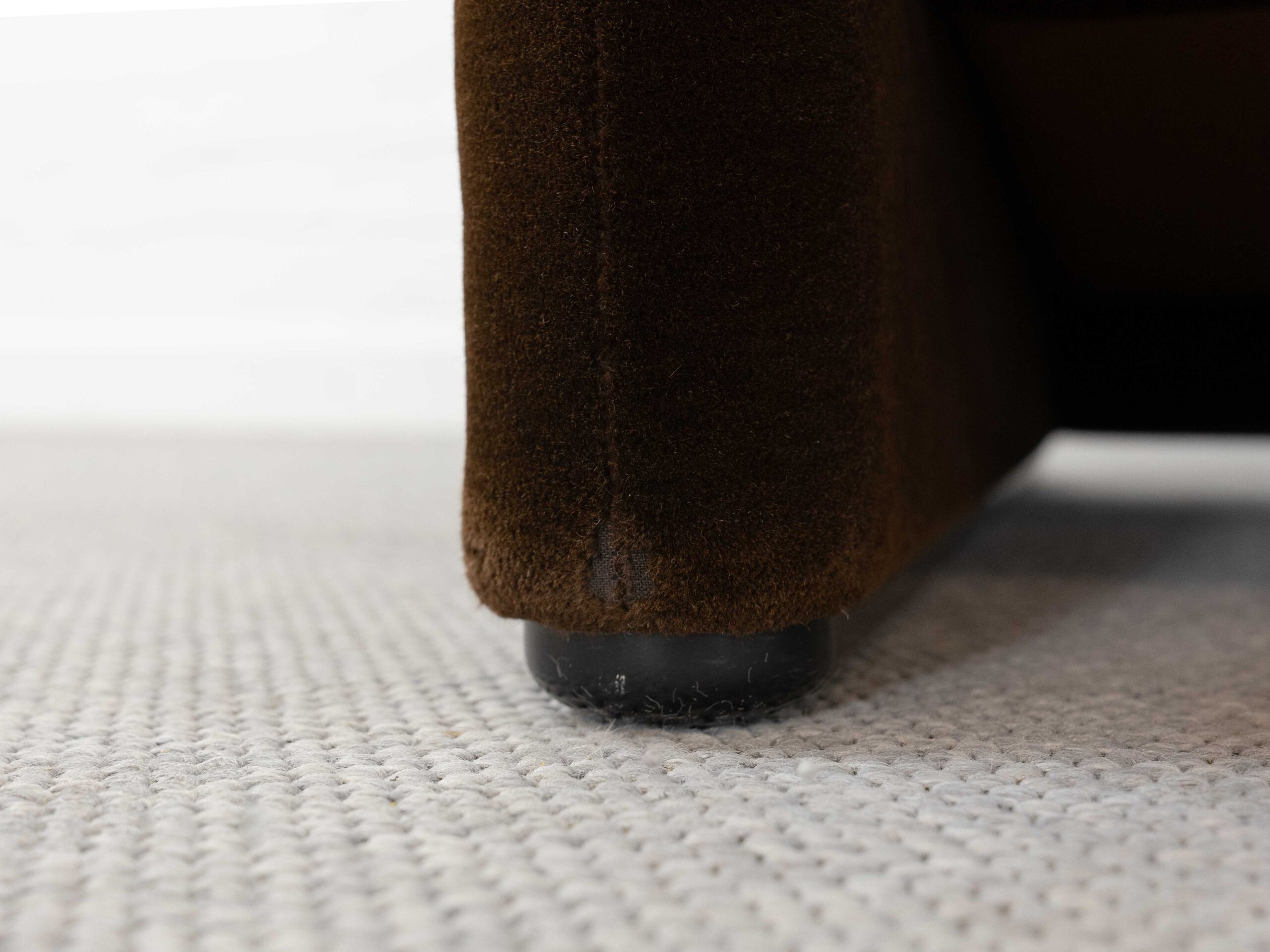Sitzgruppe bestehend aus Cassina Maralunga 2-sitzer Sofa, Maralunga Sessel sowie einem B&B Italia Fusshocker. Die Sitzgruppe wurde in den frühen 80ern mit einem dunkelbraunem teddy-/samtähnlichem Stoff bezogen, daher ist kein Herstelleretikett mehr vorhanden. Nichtraucherobjekt. Die Rückenlehnenmechanik funktioniert, gutes Sitzgefühl, nicht durchgesessen. Der Stoff weist etwas Abrieb an den Fusskanten und teilw. an den Kissenecken des Sofas und des Sessels auf. Bitte sehen sie sich die beigefügten Fotos an. Die rechte Seite des Sofas weist eine Verfärbung auf, da das Sofa seit den 80ern teilw. verdeckt gestanden hat und im vorderen Teil etwas mehr ausgeblichen ist. Der Hocker ist von B&B Italia, Entwurf von Afra&Tobia Scarpa, Modell Coronado. Maße Sofa: B.165cm, H.70/100, T.85 Maße Sessel: B.100, H.70/100, T.85