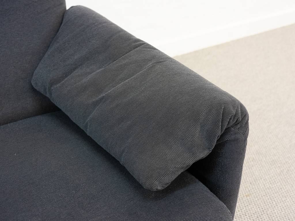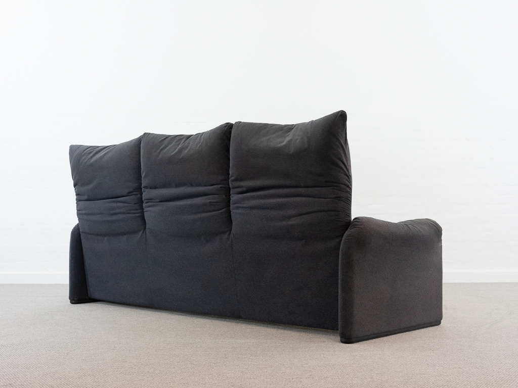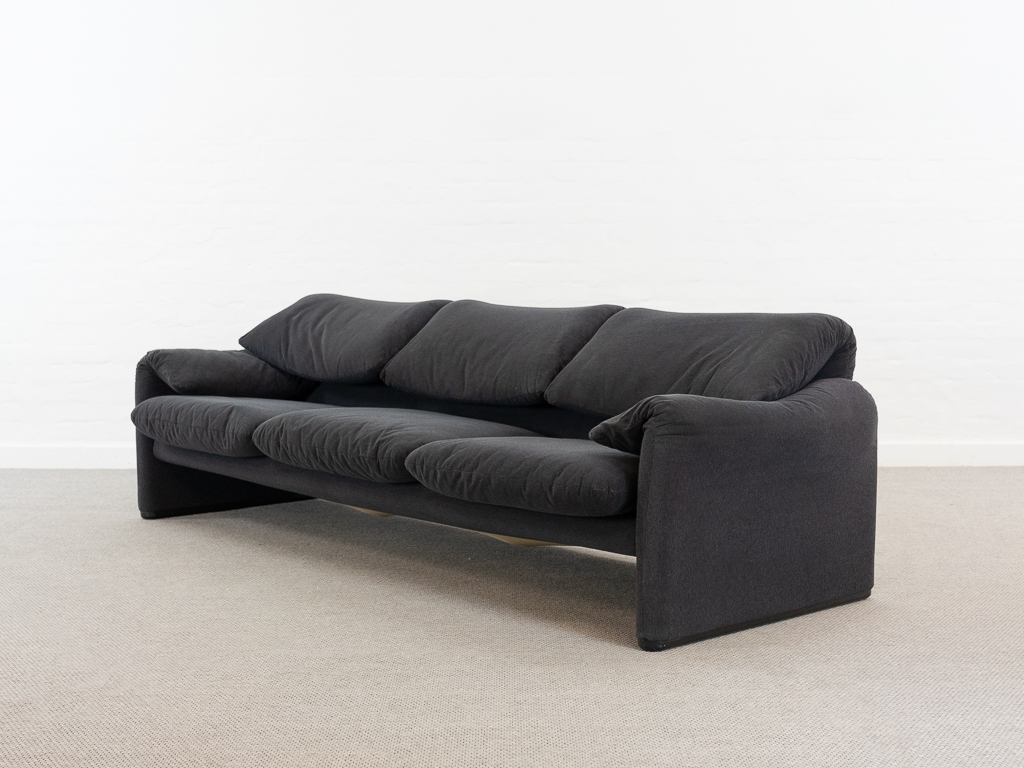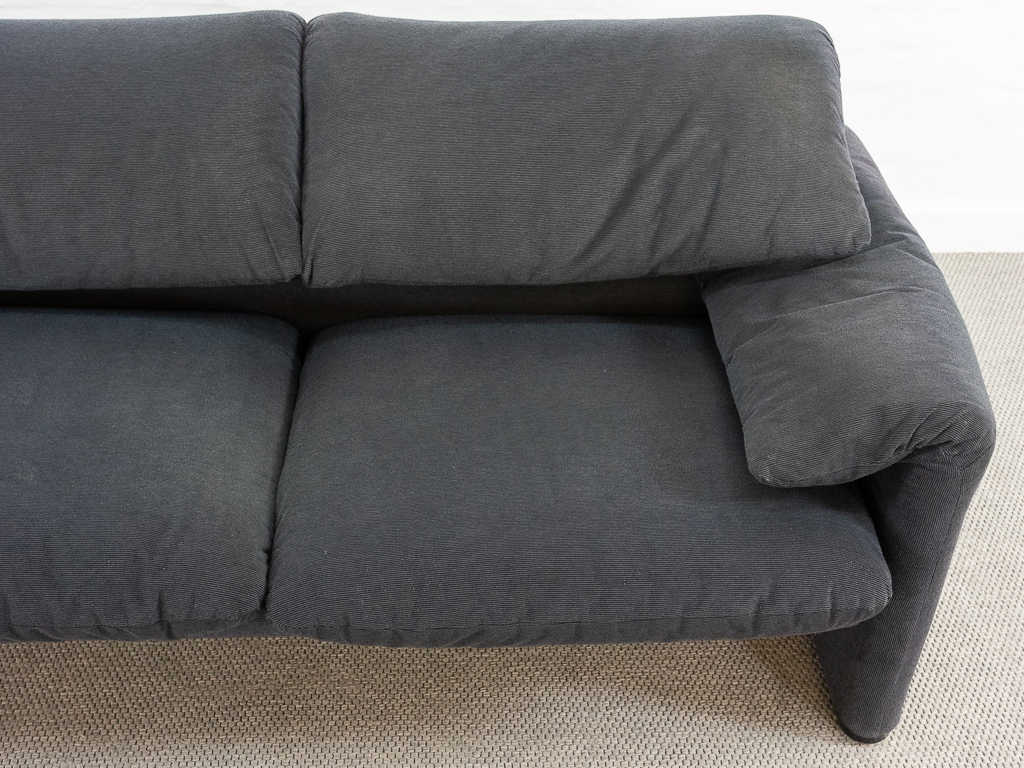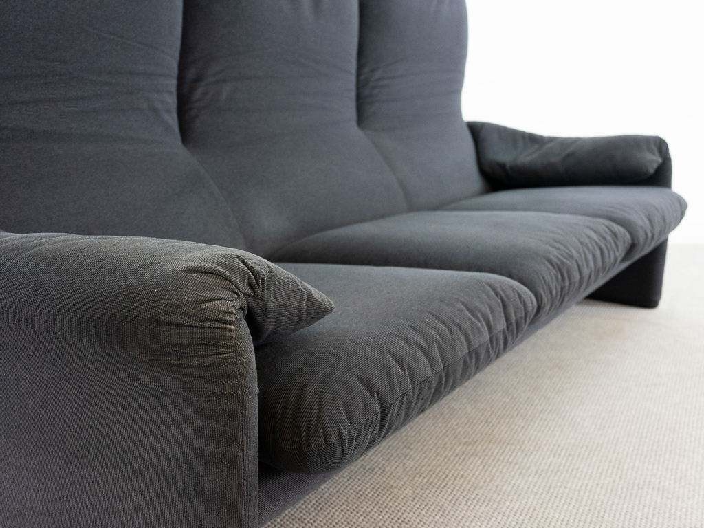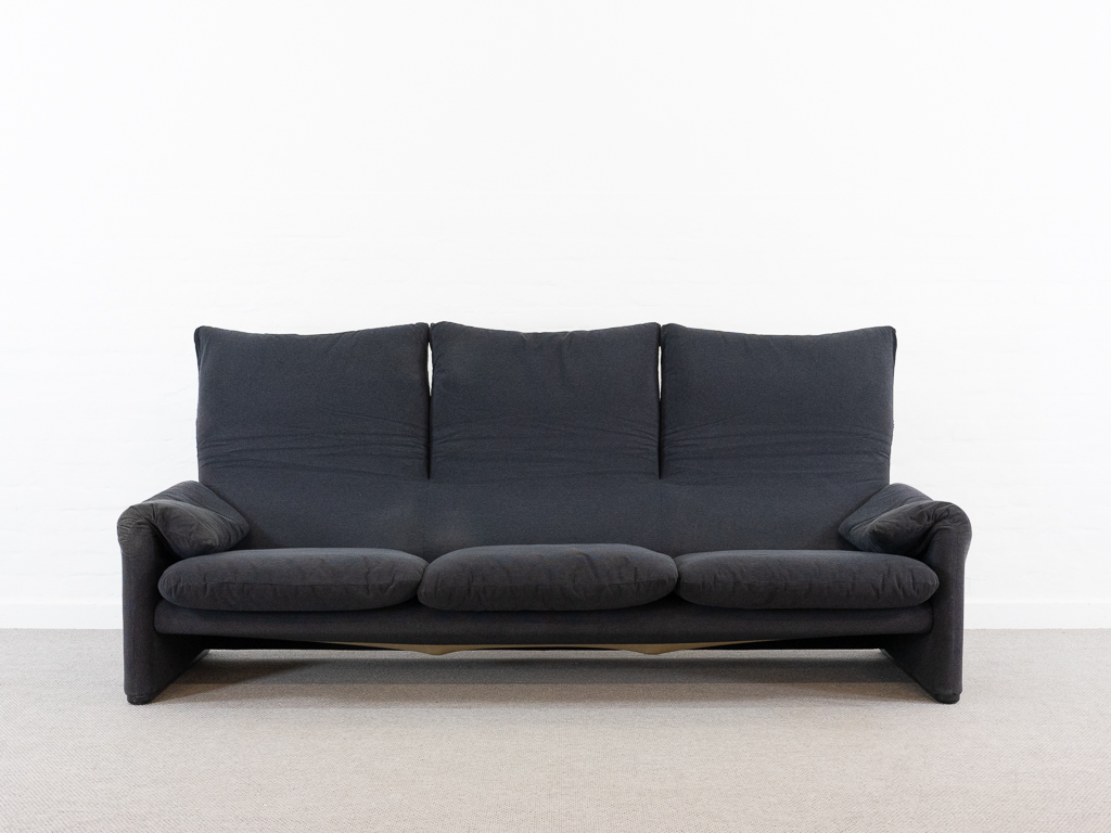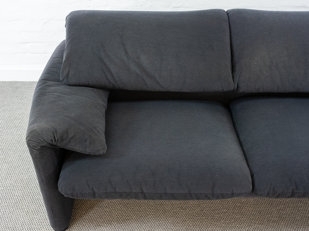 Maralunga 3-Sitzer Sofa von Cassina, entworfen 1973 von Vico Magistretti. Dieses Sofa verfügt über faltbare Rückenlehnen um verschiedene Sitzpositionen zu ermöglichen. Der Vorbesitzer hat das Sofa vor Jahren in grau-blauem Stoff polstern lassen, deshalb sind keine Herstellermarkungen mehr vorhanden. Höhe der niedrigen Position Rückenlehne 70cm, Höhe der hohen Position Rückenlehne: 100cm. Nichtraucher-Objekt. Deutliche Abnutzungs -und Gebrauchsspuren, insbesondere an den Armlehnen vorhanden. Teilweise ausgeblichen. Keine Flecken. Der Sitzkomfort ist gut. Das Sofa kann so benutzt werden, wir würden jedoch eine Neupolsterung empfehlen. Bitte sehen Sie sich die beigefügten Fotos an.
