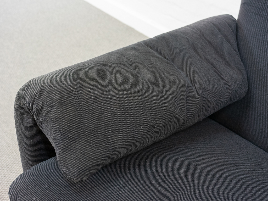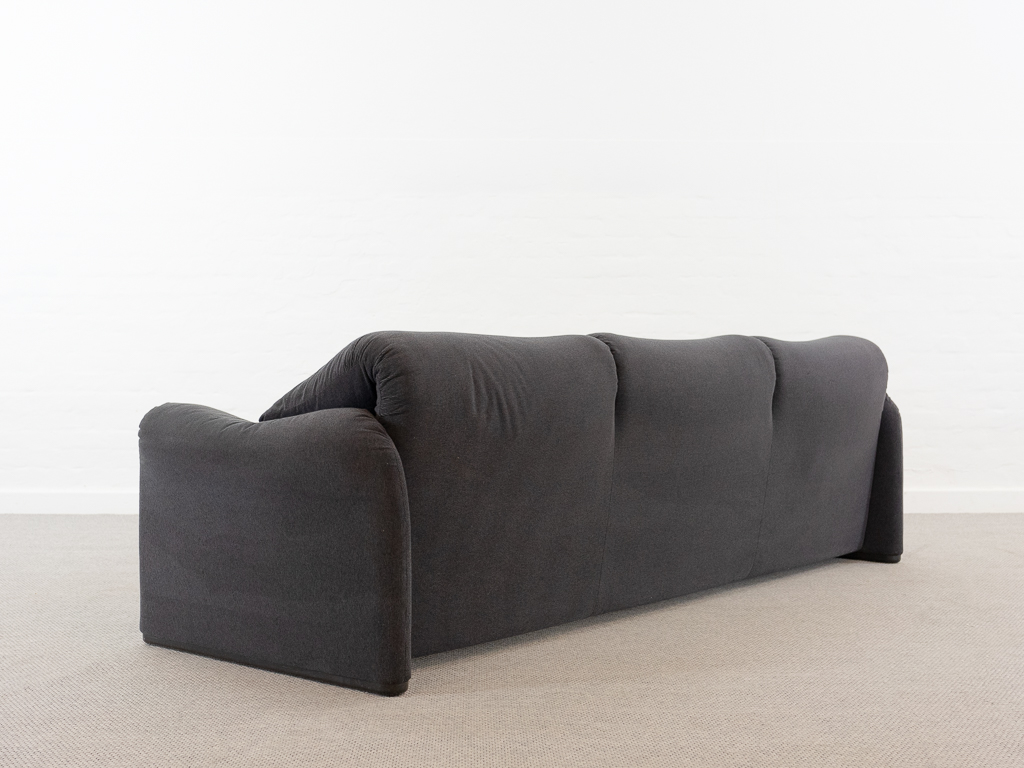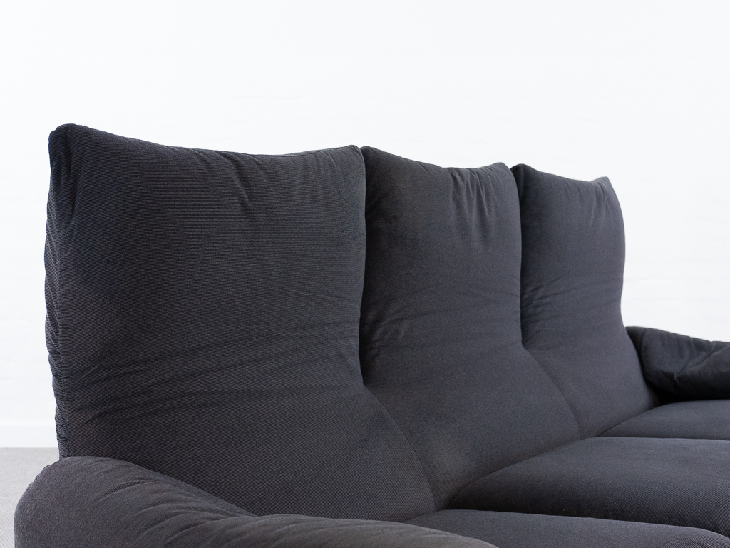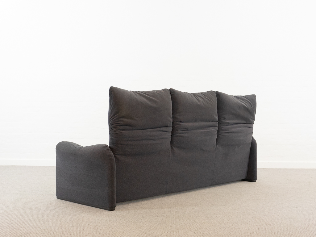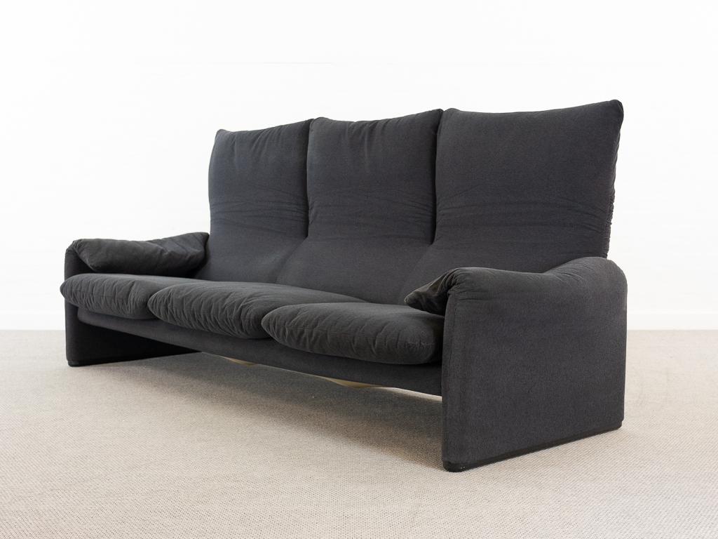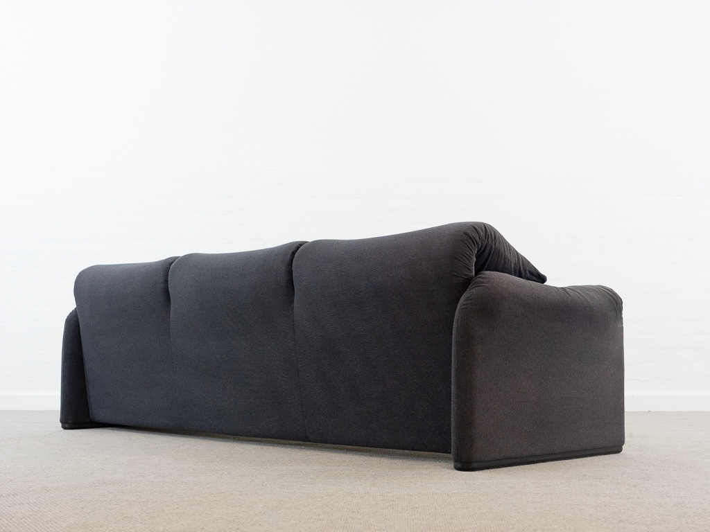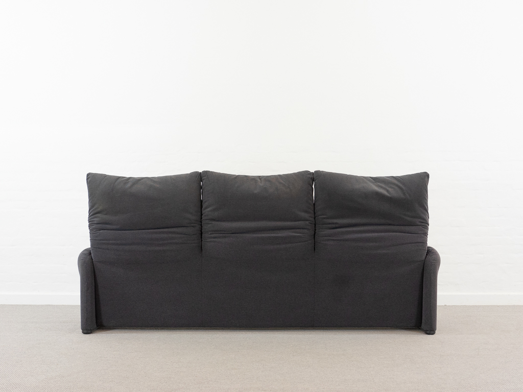 Maralunga 3-Sitzer Sofa von Cassina, entworfen 1973 von Vico Magistretti. Dieses Sofa verfügt über faltbare Rückenlehnen um verschiedene Sitzpositionen zu ermöglichen. Der Vorbesitzer hat das Sofa vor Jahren in grau-blauem Stoff polstern lassen, deshalb sind keine Herstellermarkungen mehr vorhanden. Höhe der niedrigen Position Rückenlehne 70cm, Höhe der hohen Position Rückenlehne: 100cm. Nichtraucher-Objekt. Deutliche Abnutzungs -und Gebrauchsspuren, insbesondere an den Armlehnen vorhanden. Teilweise ausgeblichen. Keine Flecken. Der Sitzkomfort ist gut. Das Sofa kann so benutzt werden, wir würden jedoch eine Neupolsterung empfehlen. Bitte sehen Sie sich die beigefügten Fotos an.