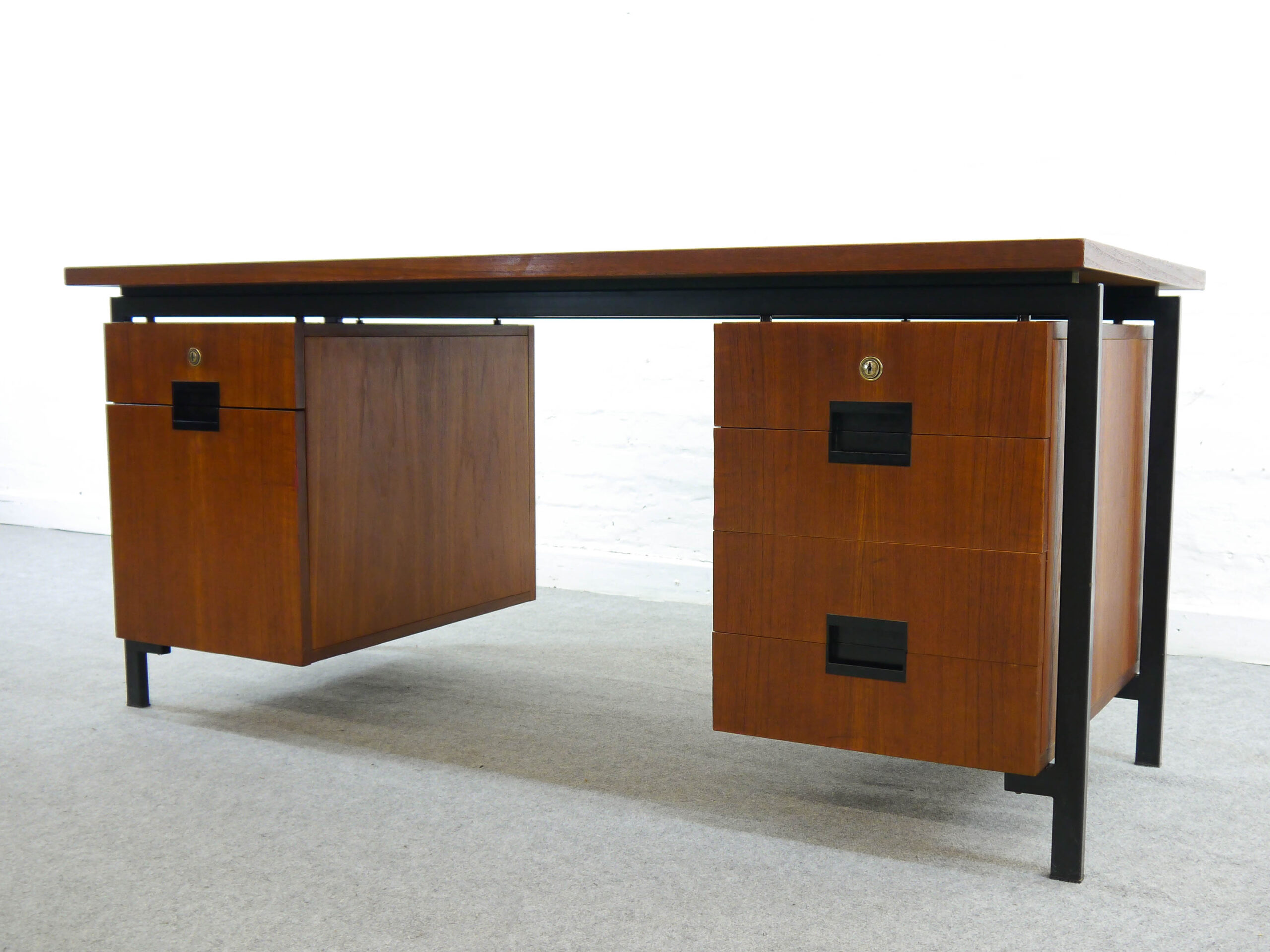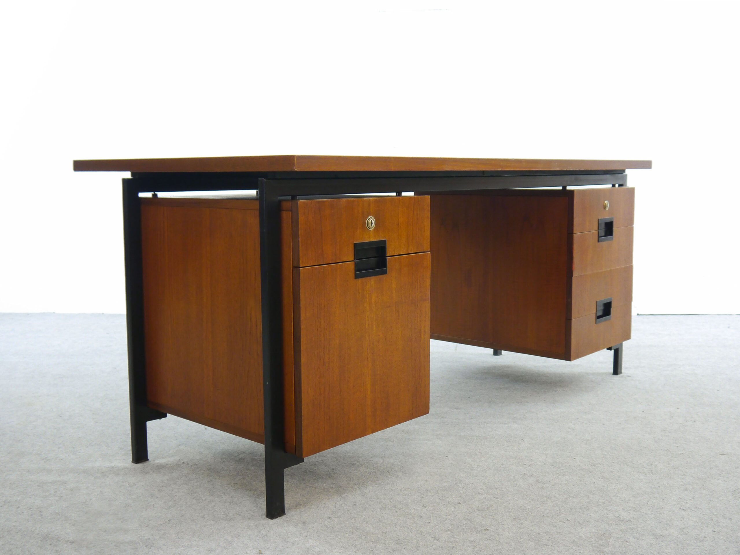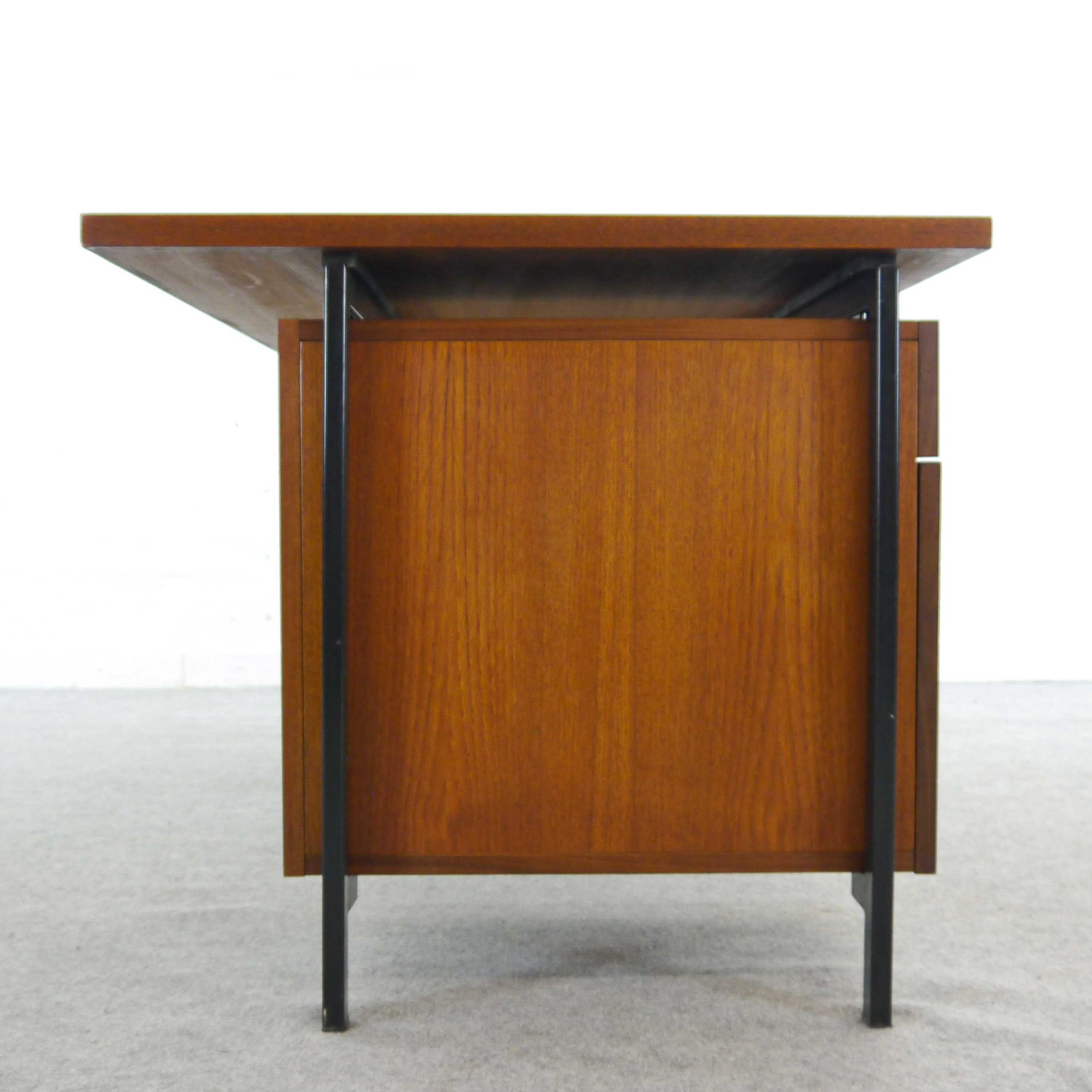 Teak Schreibtisch aus den 50er Jahren von Cees Braakman entworfen, hergestellt von Pastoe, Niederlande. Geschwärzter Stahlrahmen mit eingehängten Kästen. 5 Schubladen, 1 Hängeregistratur. Breite: 157cm, Tiefe: 79cm, Höhe: 72cm.