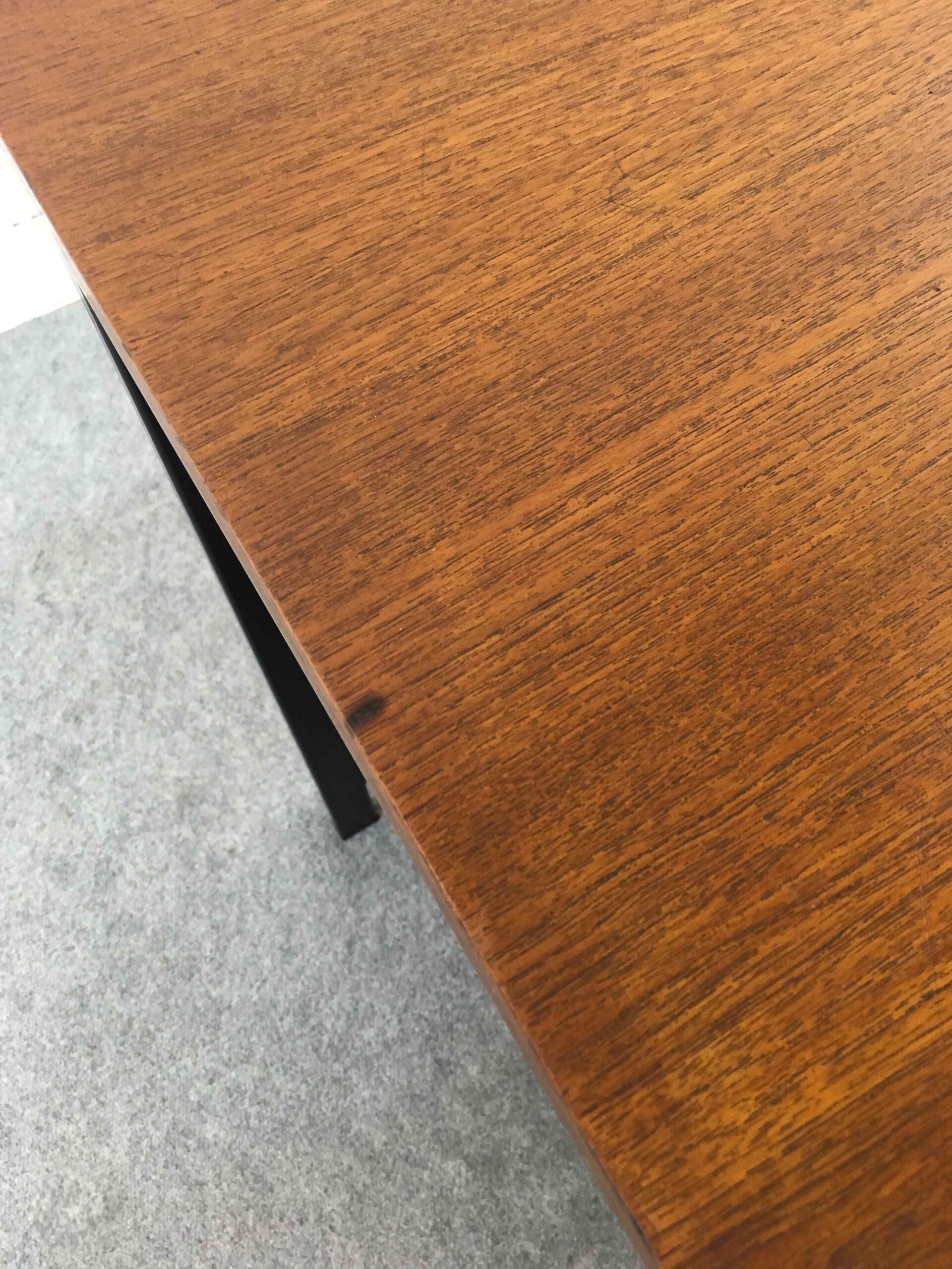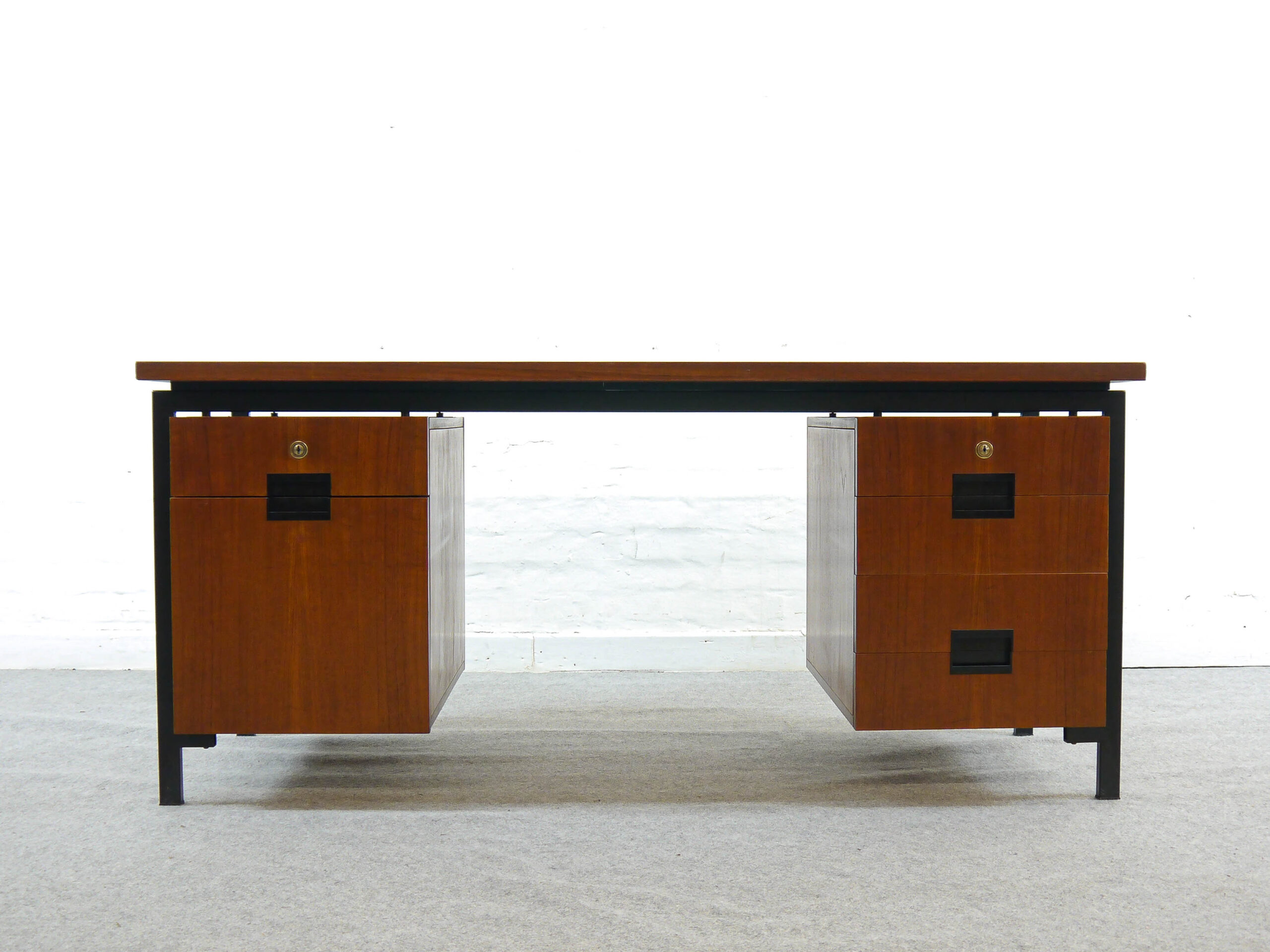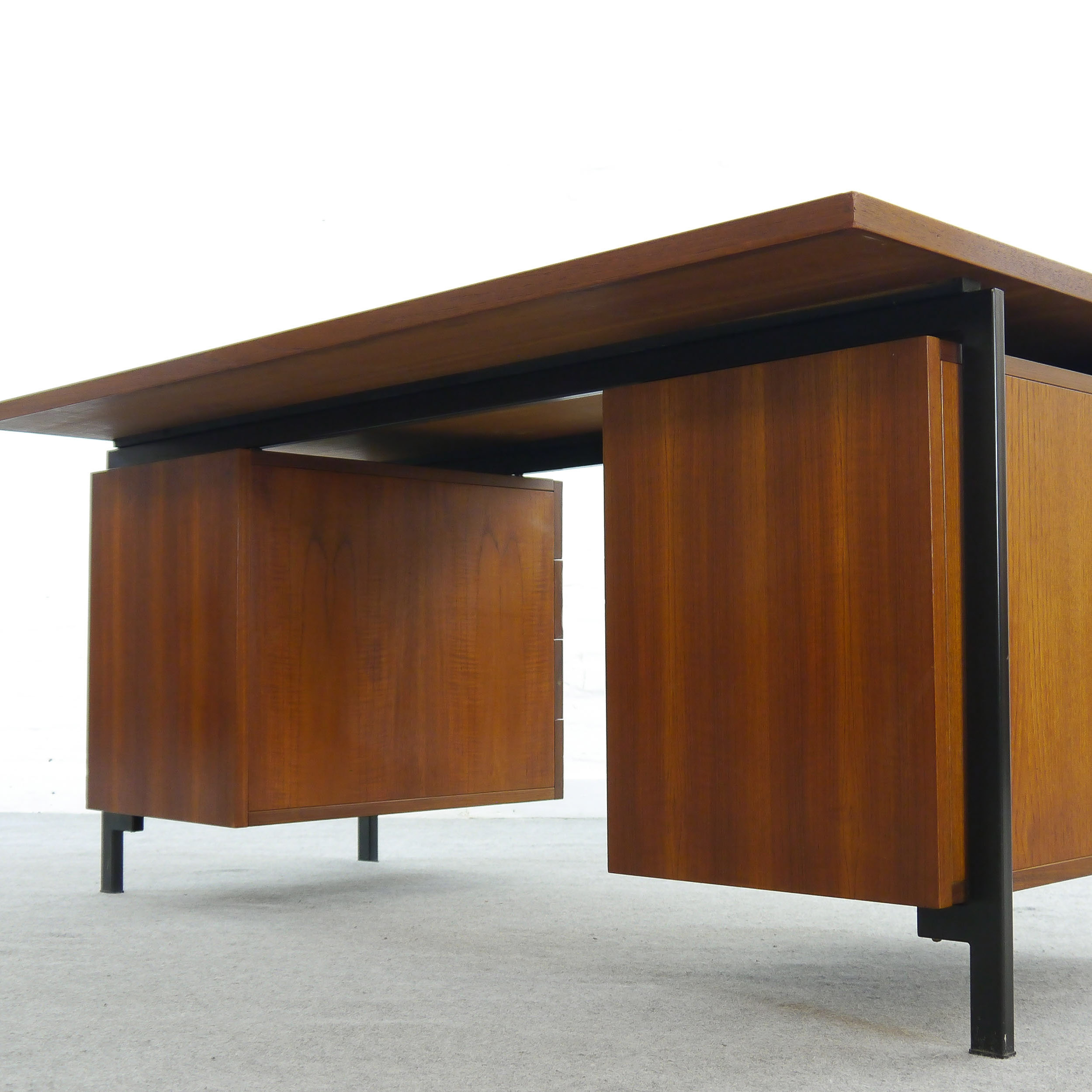 Teak Schreibtisch aus den 50er Jahren von Cees Braakman entworfen, hergestellt von Pastoe, Niederlande. Geschwärzter Stahlrahmen mit eingehängten Kästen. 5 Schubladen, 1 Hängeregistratur. Breite: 157cm, Tiefe: 79cm, Höhe: 72cm.