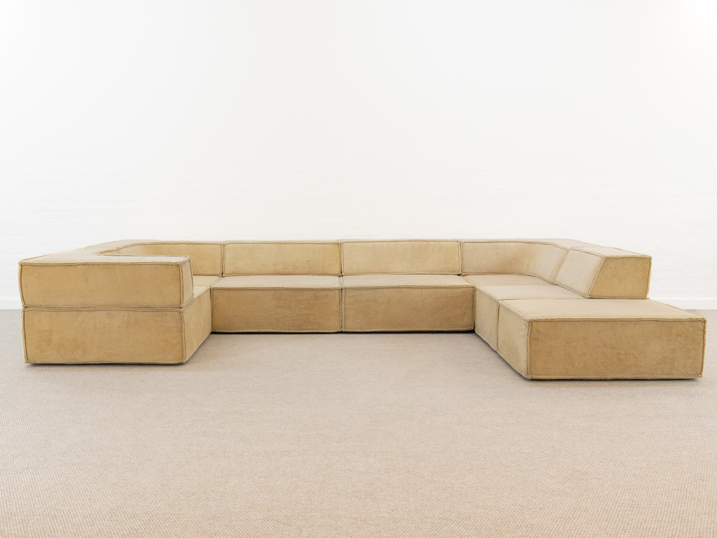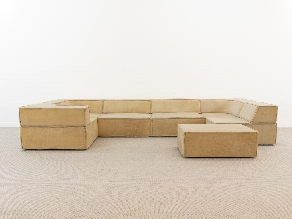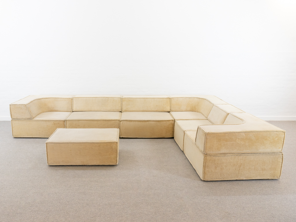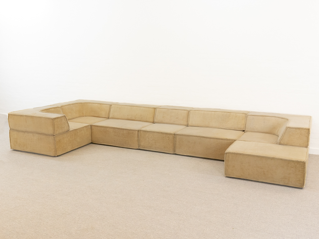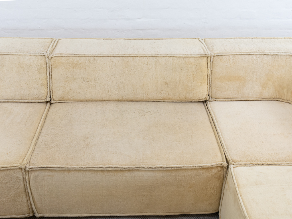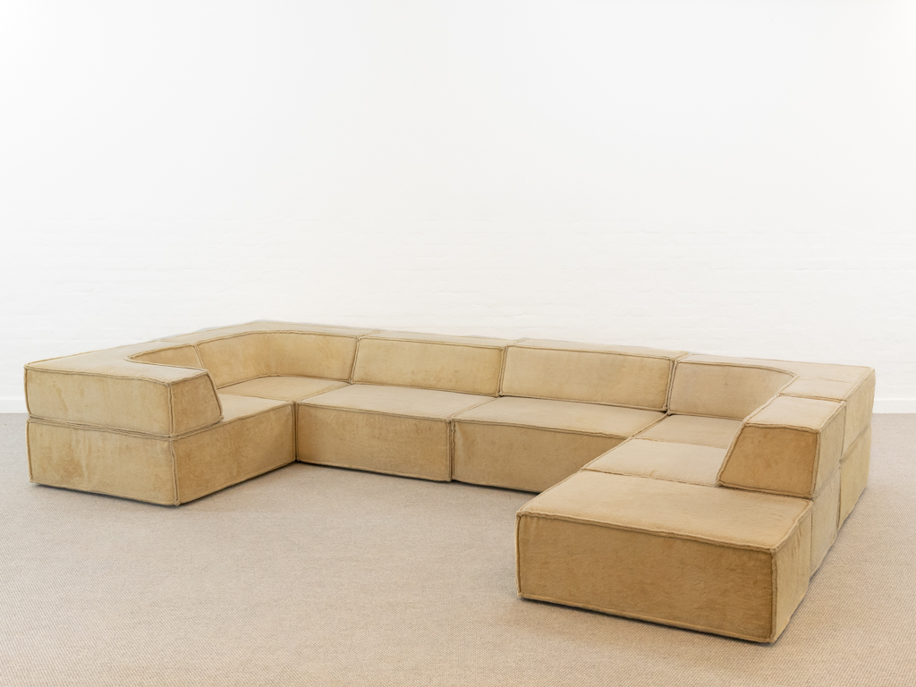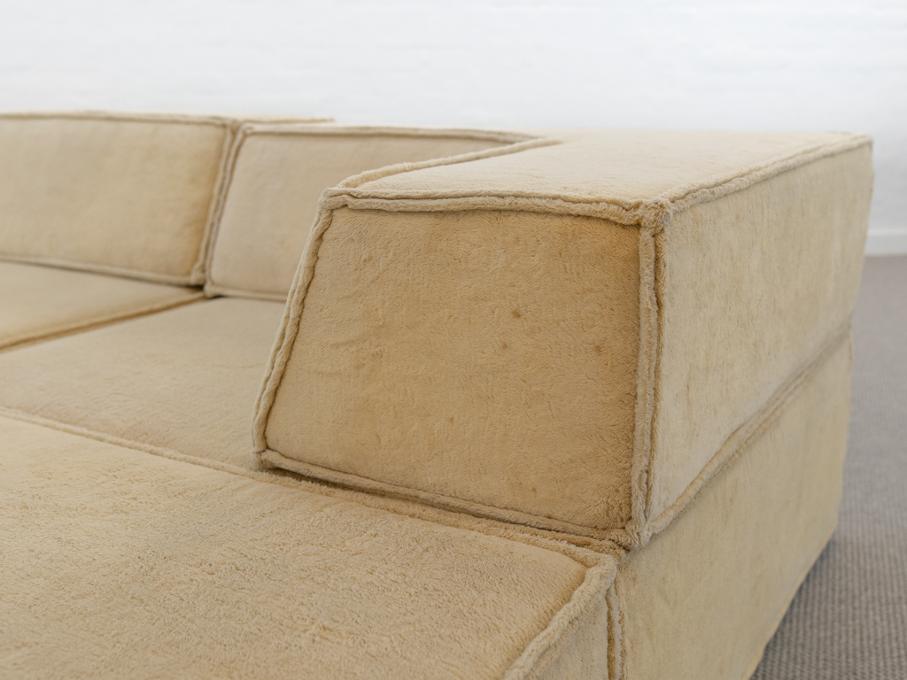 Vintage COR TRIO SOFA – Große modulare Wohnlandschaft. Entworfen 1973 von Franz Hero und Karl Odermatt, Team Form AG, Schweiz. Das Sofa ist in seinem originalem sandfarbenem Teddystoff bezogen. Alle Module können frei angeordnet werden. Auch die Rückenlehnen können frei positioniert werden. Auf der Unterseite befindet sich eine Art Stopperstoff der das Verrutschen der Rückenteile verhindert. Nimmt man die Rückenlehnen weg, so kann es auch als bequemes Bett verwendet werden. An den Füßen mit COR Schriftzug bezeichnet. Zum Set gehören 5 Sitzelemente 95x95cm, H.38cm, 2 Sitzelemente 66X95cm, H. 38 cm, 3 Eck-Rückenelemente, 2 Rückenelemente 95cm, 1 Rückenelement 66cm. Das Sofa wurde professionell gereinigt, jedoch sind einige Flecken verblieben. Das Sofa weist Gebrauchsspuren und Zeichen der Zeit auf. Nichtraucher-Objekt.