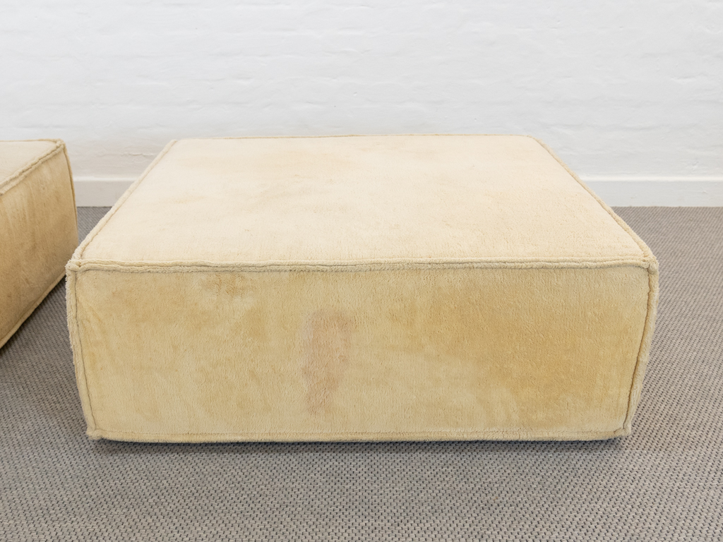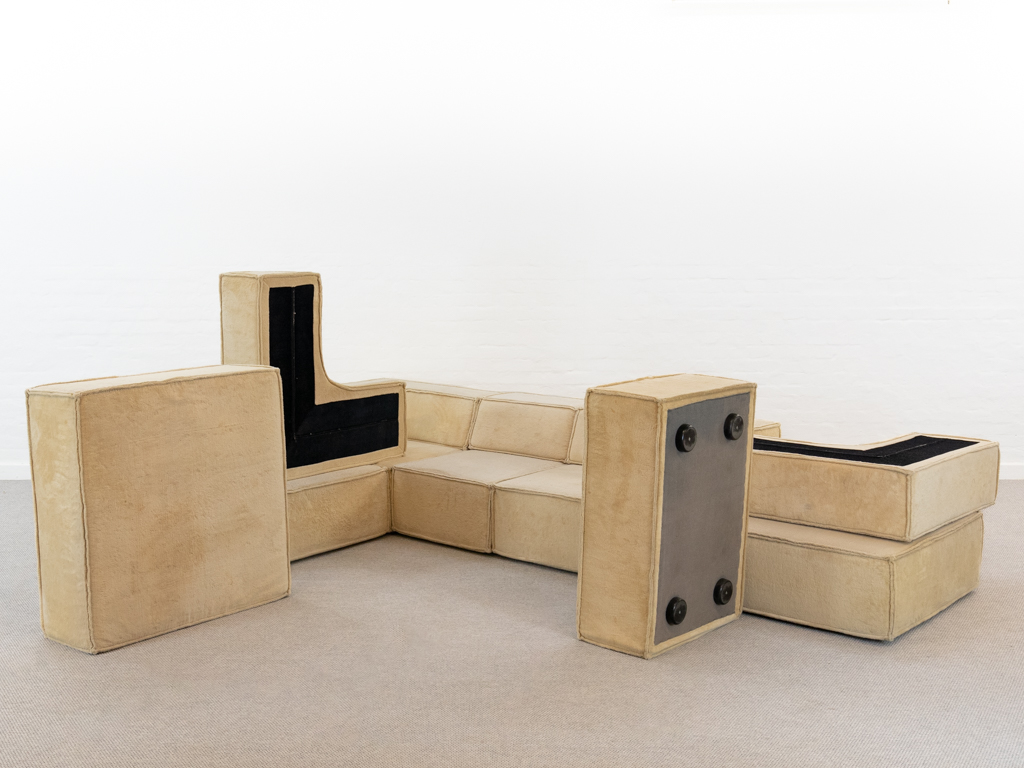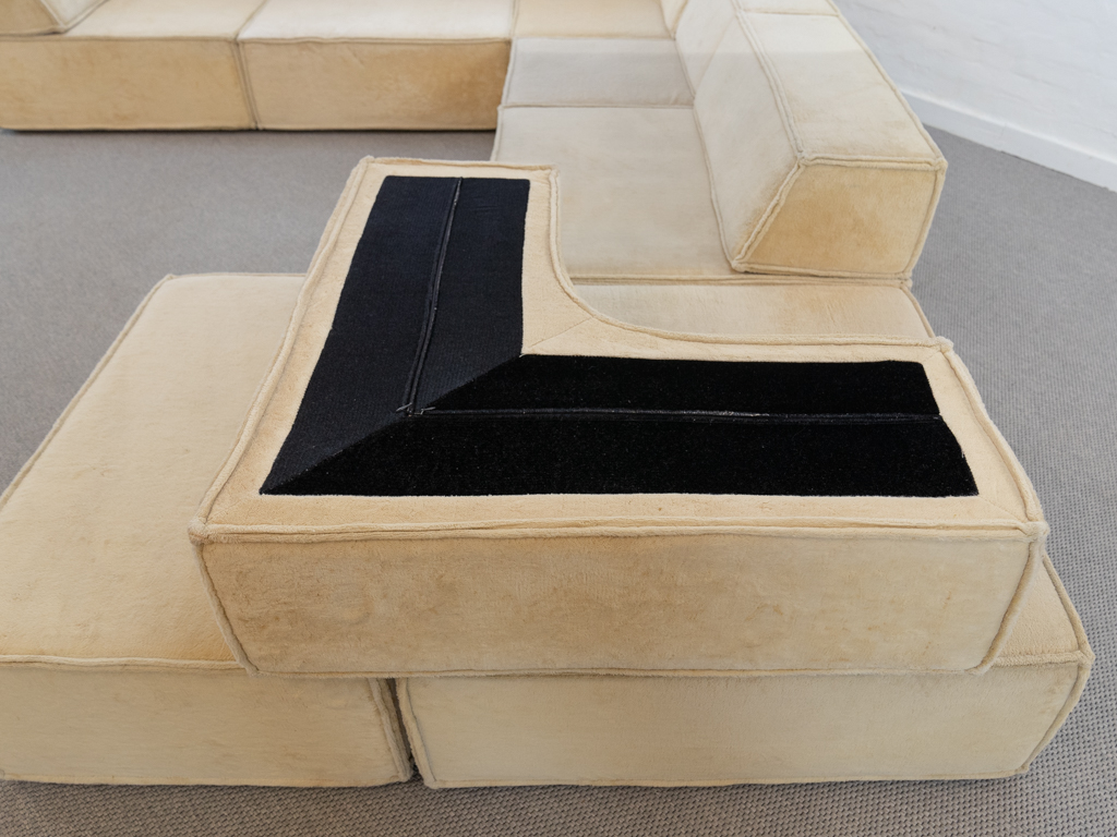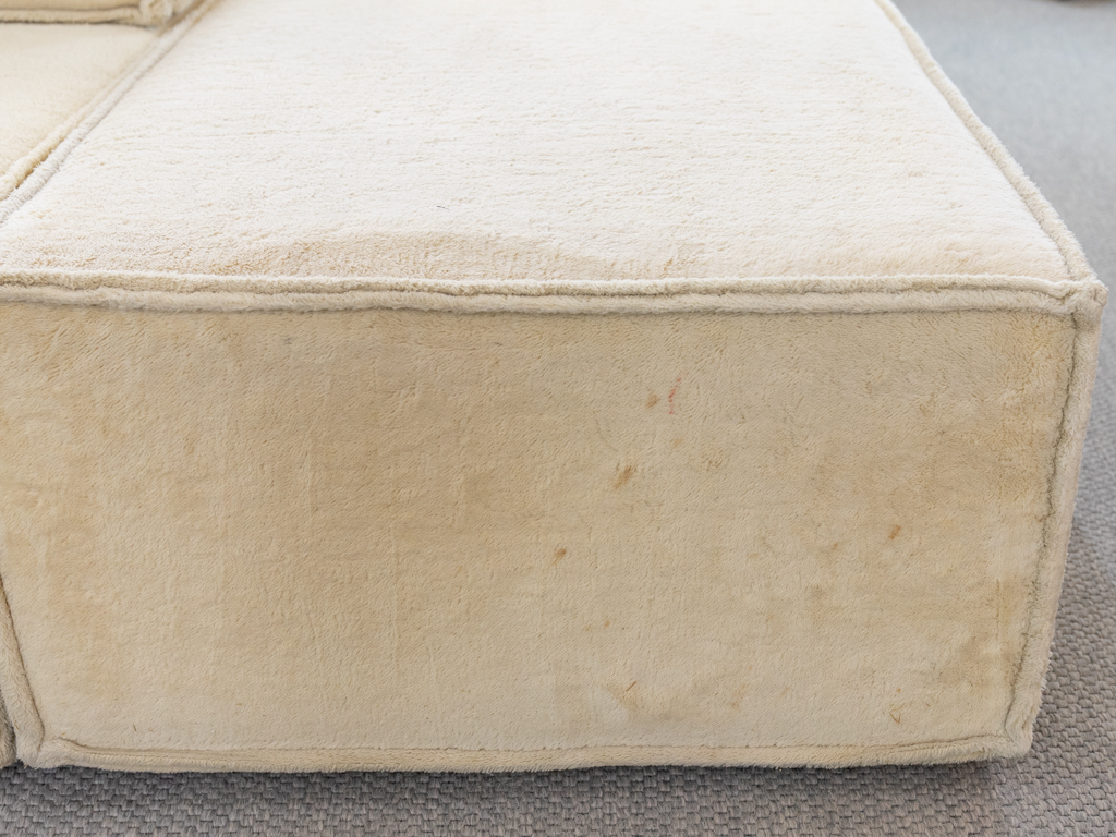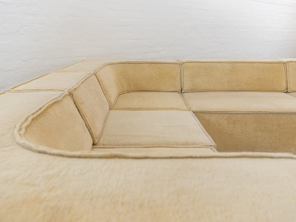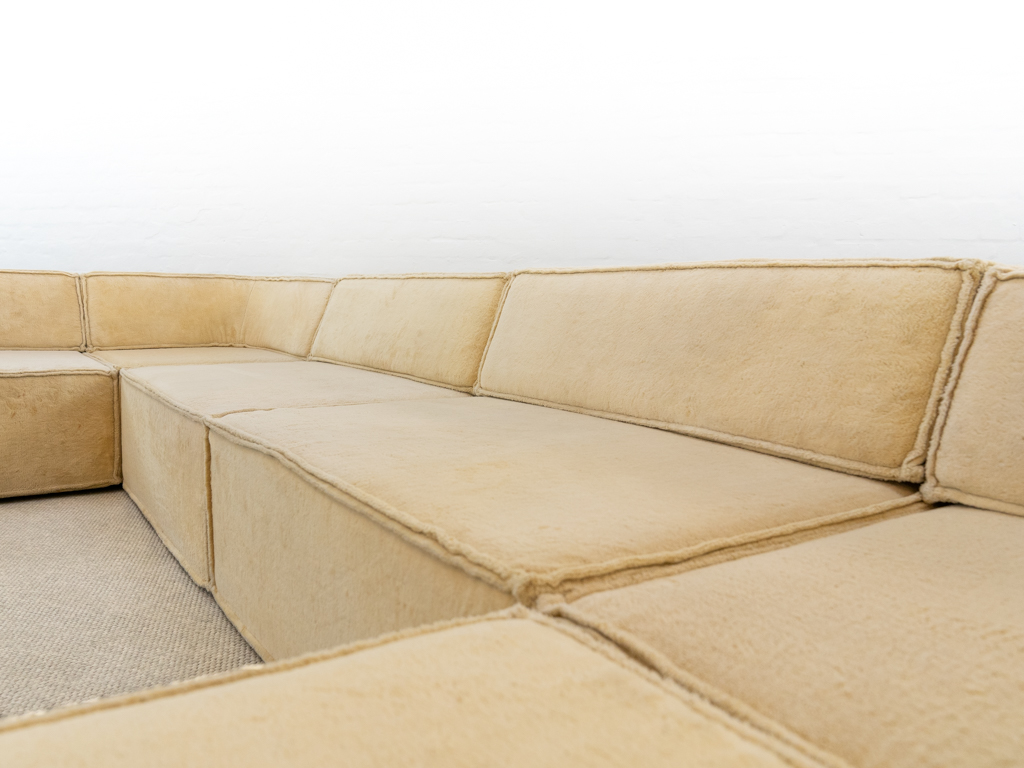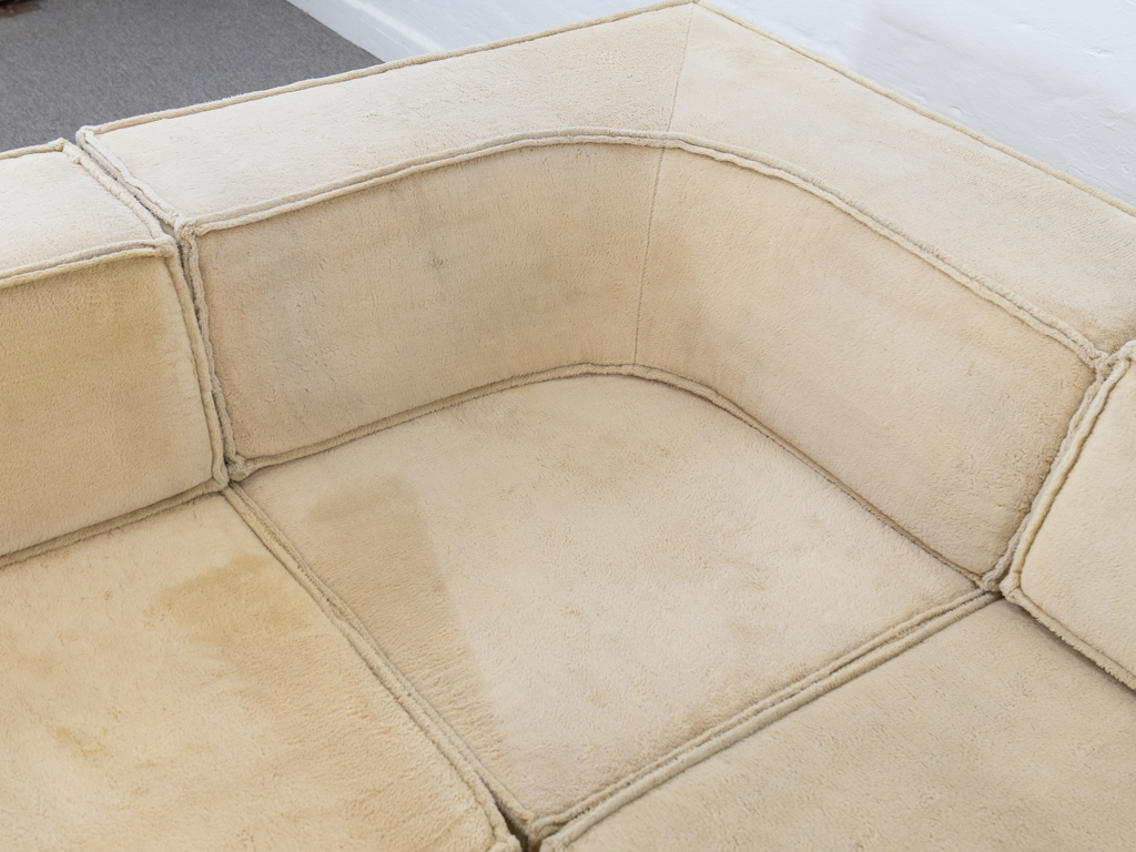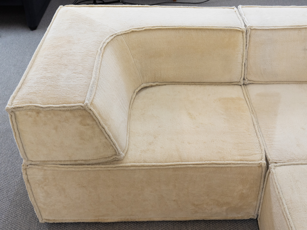 Vintage COR TRIO SOFA – Große modulare Wohnlandschaft. Entworfen 1973 von Franz Hero und Karl Odermatt, Team Form AG, Schweiz. Das Sofa ist in seinem originalem sandfarbenem Teddystoff bezogen. Alle Module können frei angeordnet werden. Auch die Rückenlehnen können frei positioniert werden. Auf der Unterseite befindet sich eine Art Stopperstoff der das Verrutschen der Rückenteile verhindert. Nimmt man die Rückenlehnen weg, so kann es auch als bequemes Bett verwendet werden. An den Füßen mit COR Schriftzug bezeichnet. Zum Set gehören 5 Sitzelemente 95x95cm, H.38cm, 2 Sitzelemente 66X95cm, H. 38 cm, 3 Eck-Rückenelemente, 2 Rückenelemente 95cm, 1 Rückenelement 66cm. Das Sofa wurde professionell gereinigt, jedoch sind einige Flecken verblieben. Das Sofa weist Gebrauchsspuren und Zeichen der Zeit auf. Nichtraucher-Objekt.