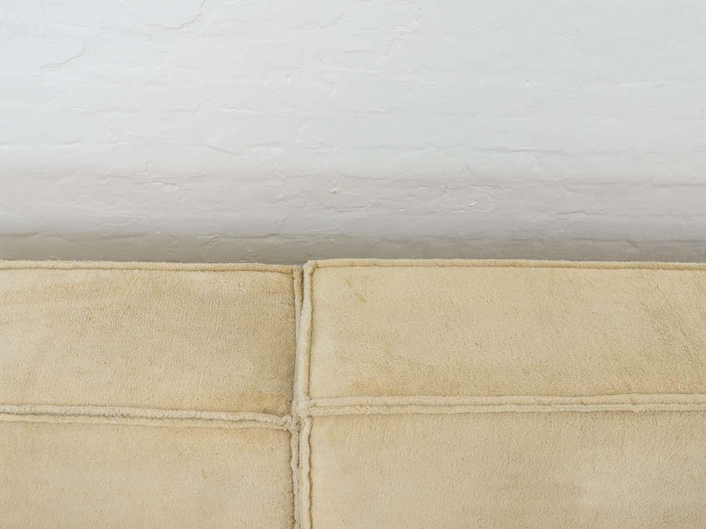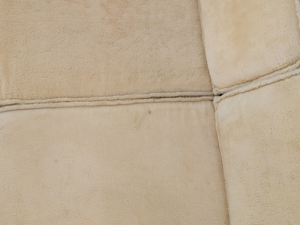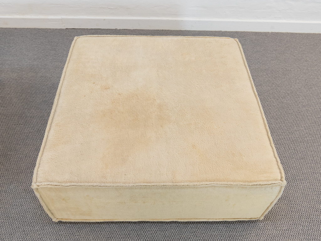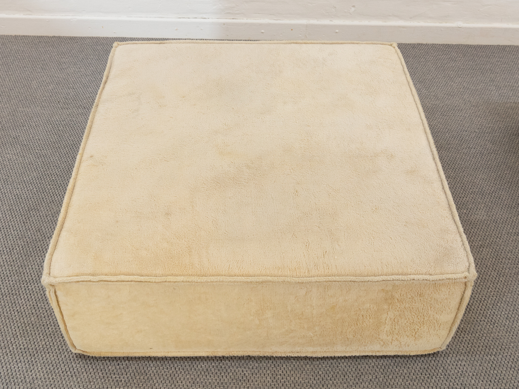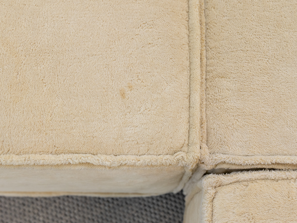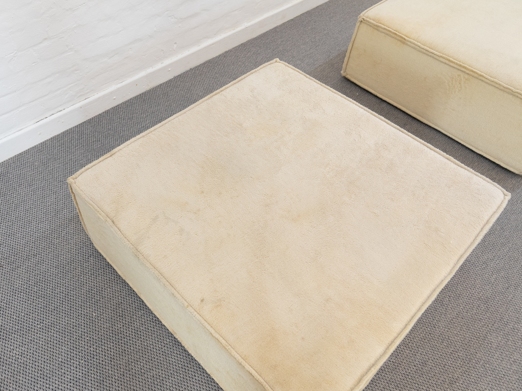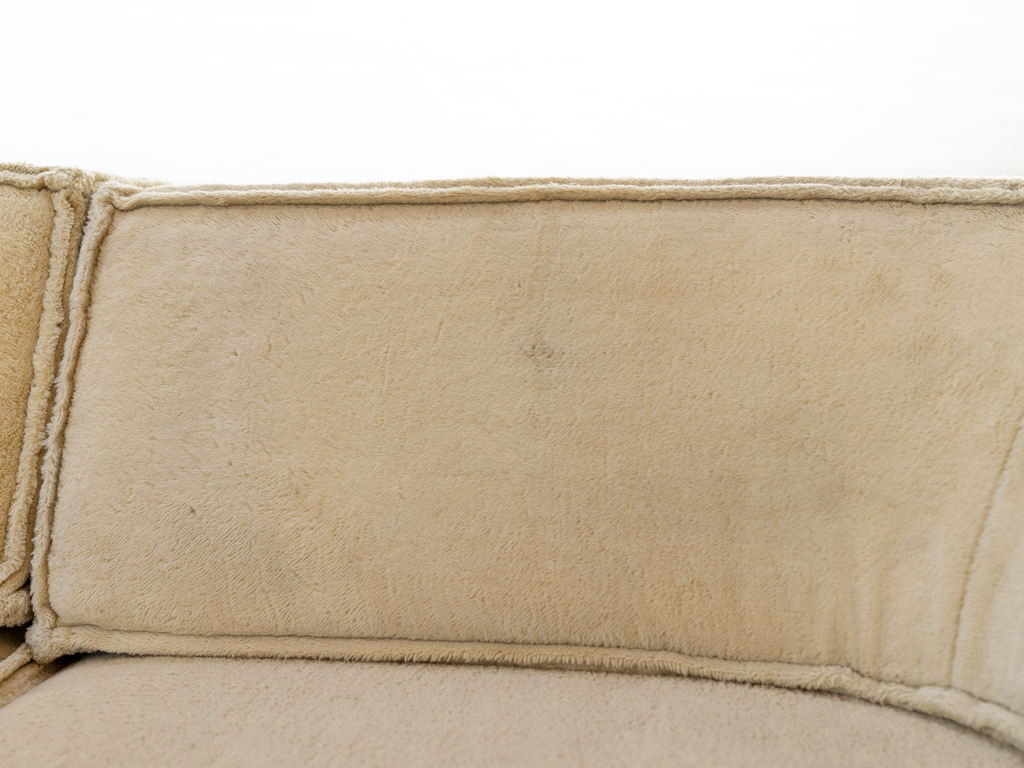 Vintage COR TRIO SOFA – Große modulare Wohnlandschaft. Entworfen 1973 von Franz Hero und Karl Odermatt, Team Form AG, Schweiz. Das Sofa ist in seinem originalem sandfarbenem Teddystoff bezogen. Alle Module können frei angeordnet werden. Auch die Rückenlehnen können frei positioniert werden. Auf der Unterseite befindet sich eine Art Stopperstoff der das Verrutschen der Rückenteile verhindert. Nimmt man die Rückenlehnen weg, so kann es auch als bequemes Bett verwendet werden. An den Füßen mit COR Schriftzug bezeichnet. Zum Set gehören 5 Sitzelemente 95x95cm, H.38cm, 2 Sitzelemente 66X95cm, H. 38 cm, 3 Eck-Rückenelemente, 2 Rückenelemente 95cm, 1 Rückenelement 66cm. Das Sofa wurde professionell gereinigt, jedoch sind einige Flecken verblieben. Das Sofa weist Gebrauchsspuren und Zeichen der Zeit auf. Nichtraucher-Objekt.