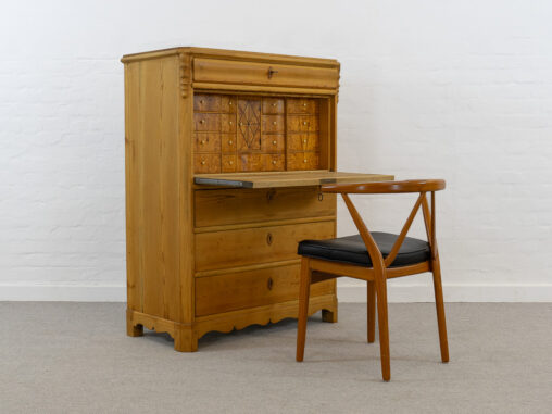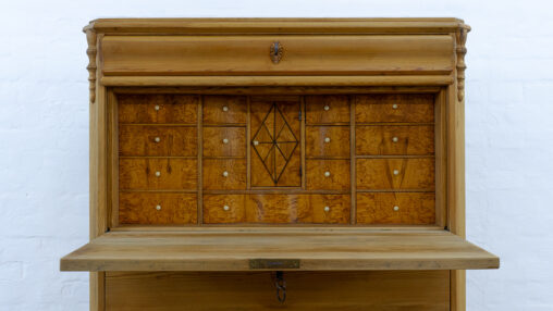 Secretary from the late Biedermeier period, approx. 1845-1860. With 4 lockable drawers and a writing flap. Behind the flap are 15 smaller drawers and a small door veneered…