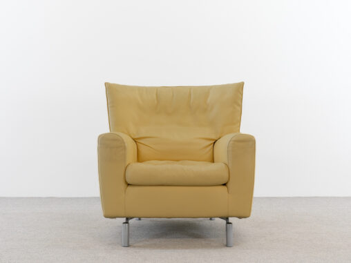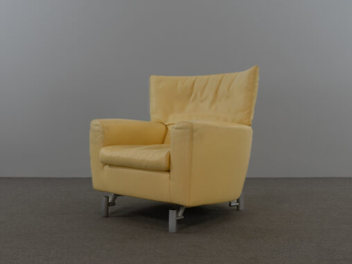 Armchair, “Drop” model, designed by Gerard Van den Berg for Molteni & C. 1990s. Upholstered in original light yellow leather. Manufacturer’s mark on the base. This armchair captivates…