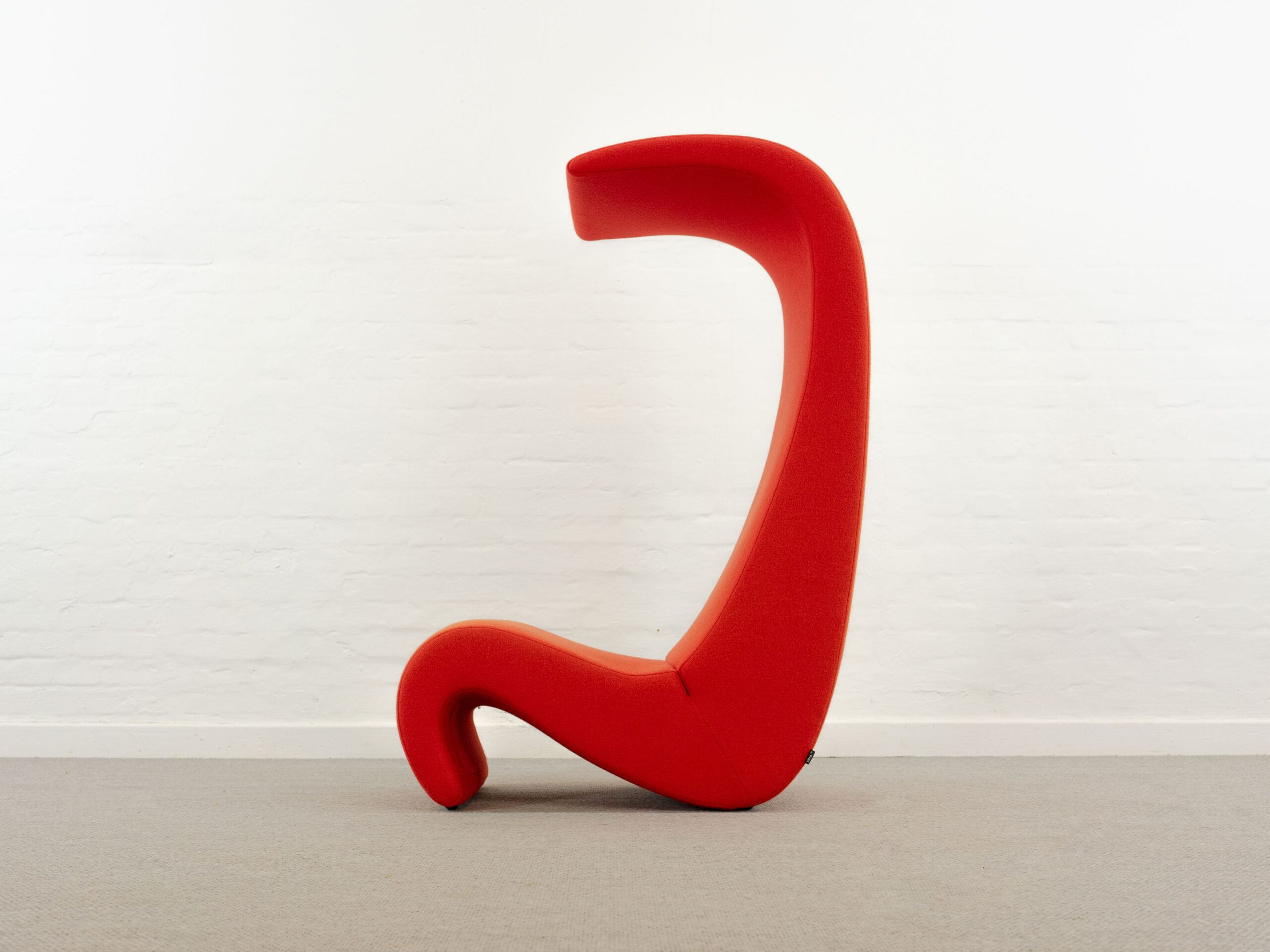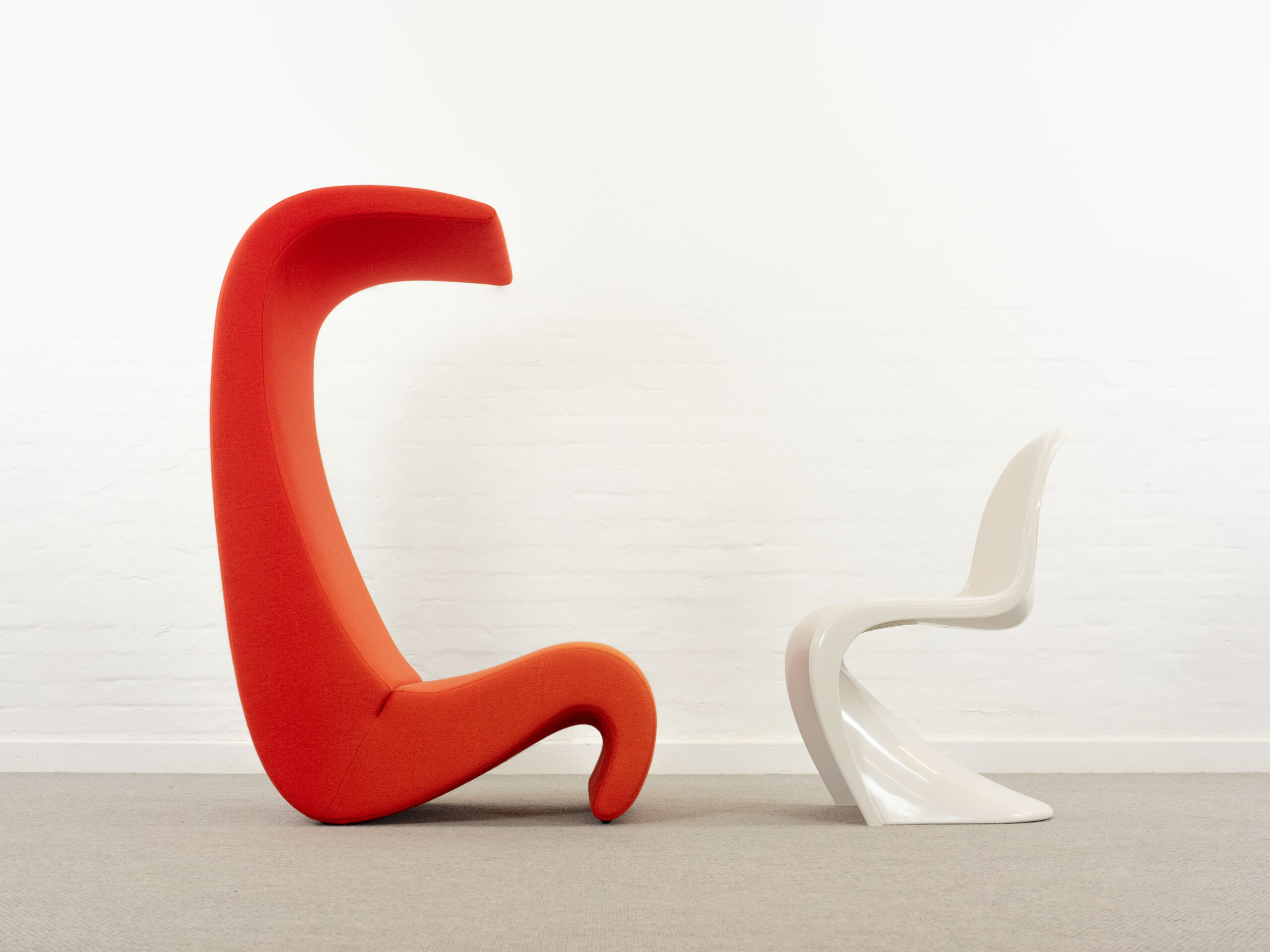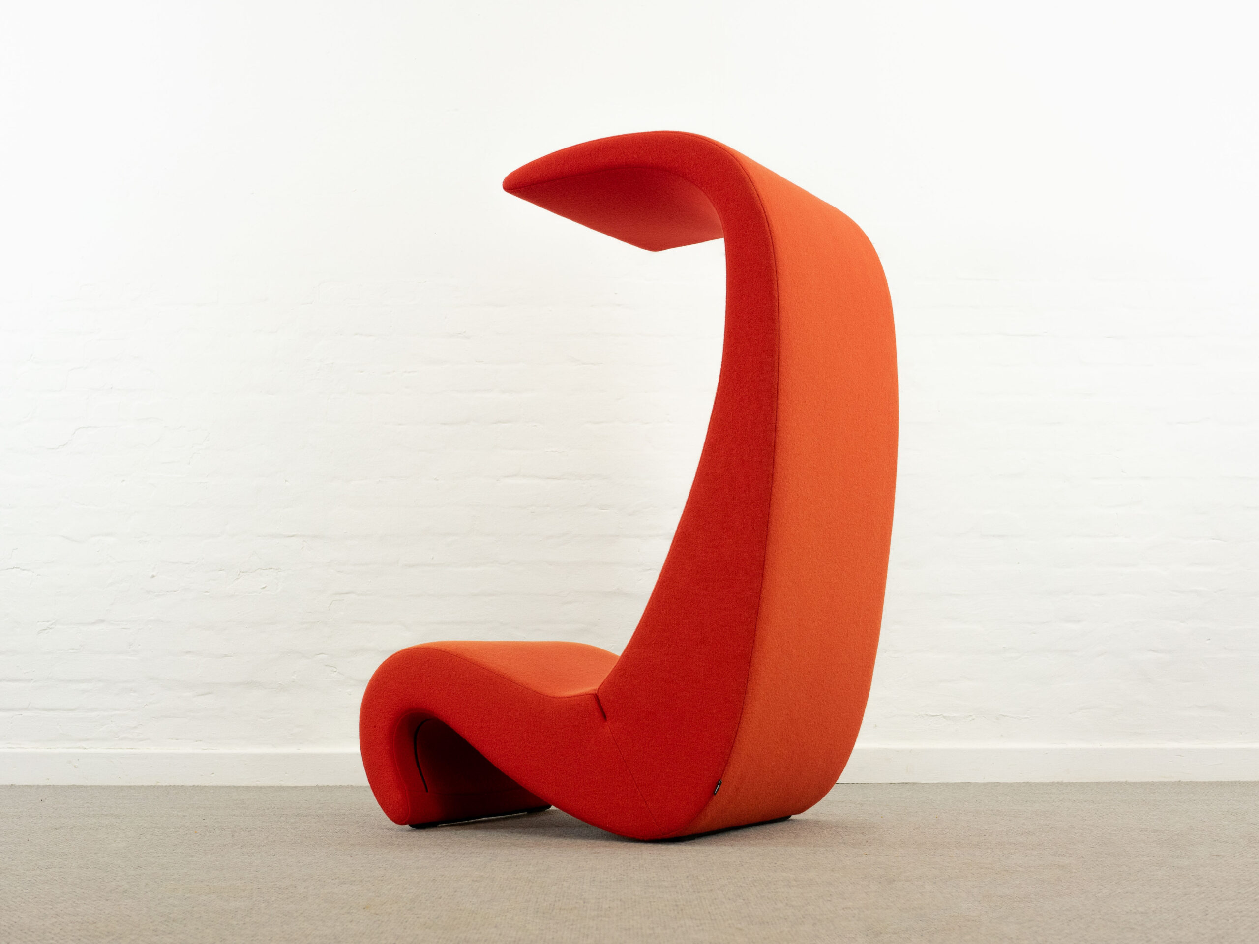 Verner Pantons developed the Amoeba Chair for the famous Visiona-Exhibition in several Versions. This is the highback version which leads the backrest above the head and enfolds as a canopy over the sitting. This communicates comfort and safety and gives a feeling of retreat. This a recent edition, labeled by Vitra. Was a exhibition piece since. On the left front, fabric is slightly faded. Non-smoking piece. Dimensions: H.127.5cm, W.62cm, D.88cm, Seatheight ca.27cm. 19% VAT will be shown on the invoice, if acquired in EU. The white Panton chair is not part of this offer. The chair can be acquired separately.