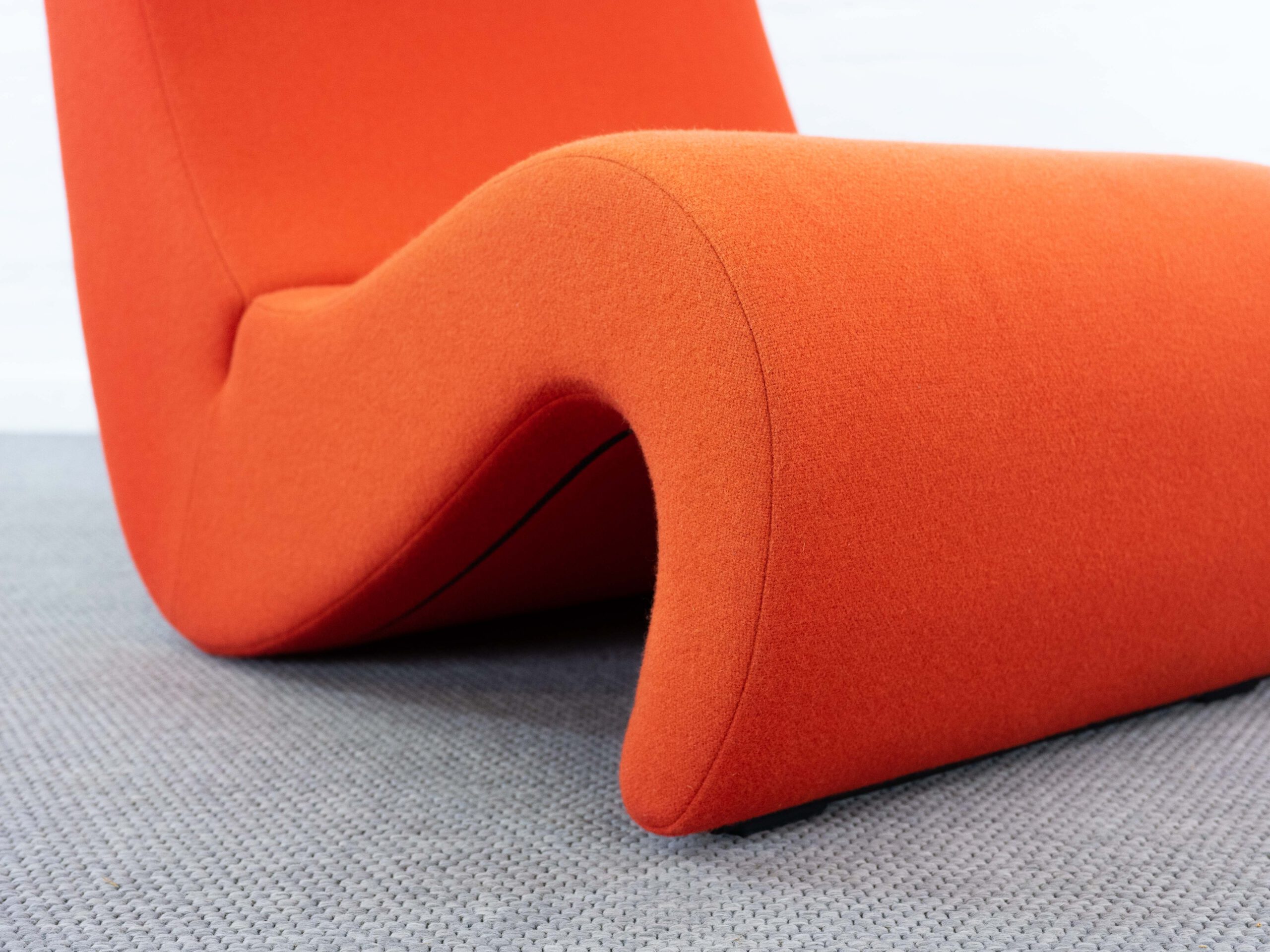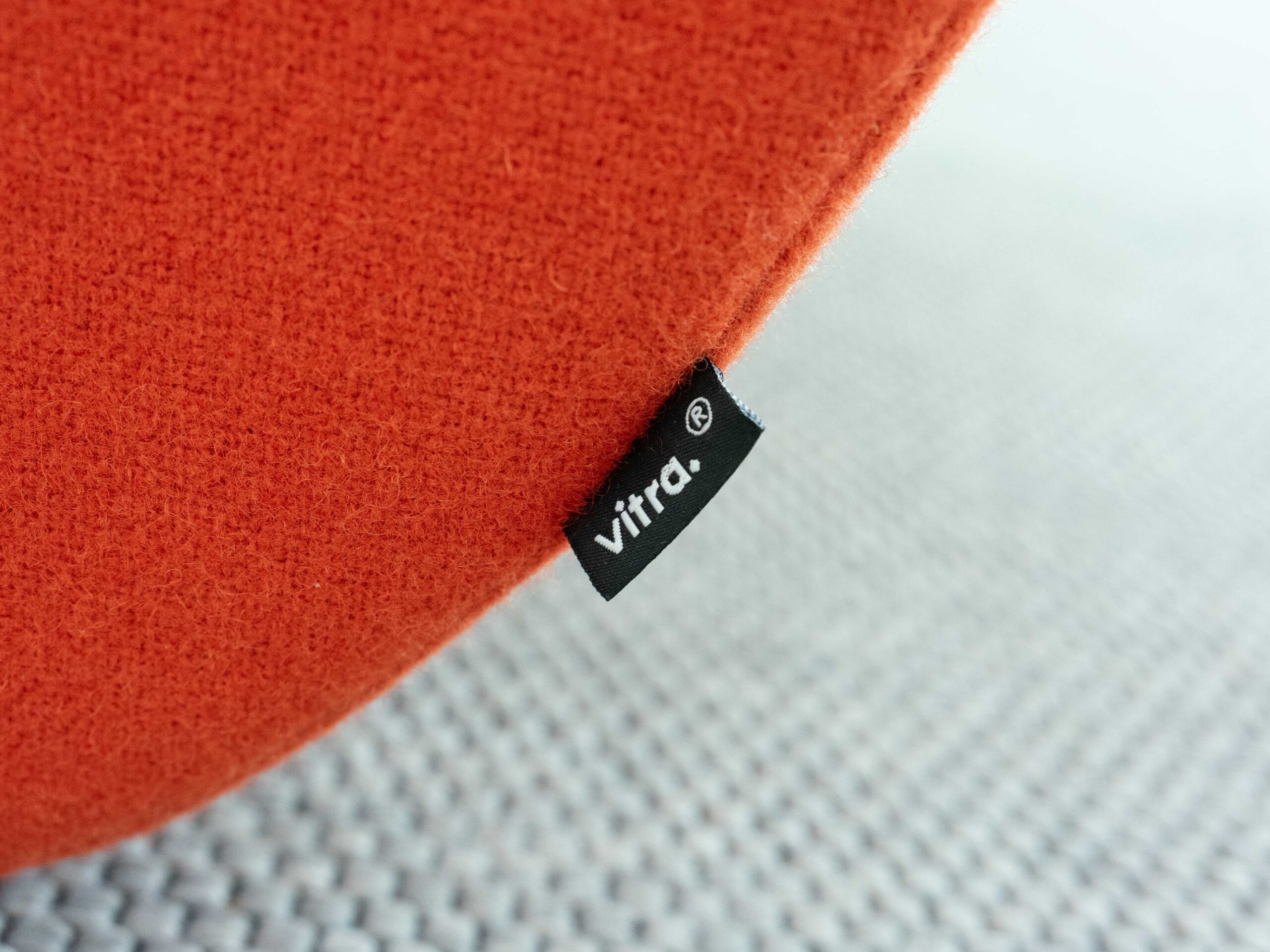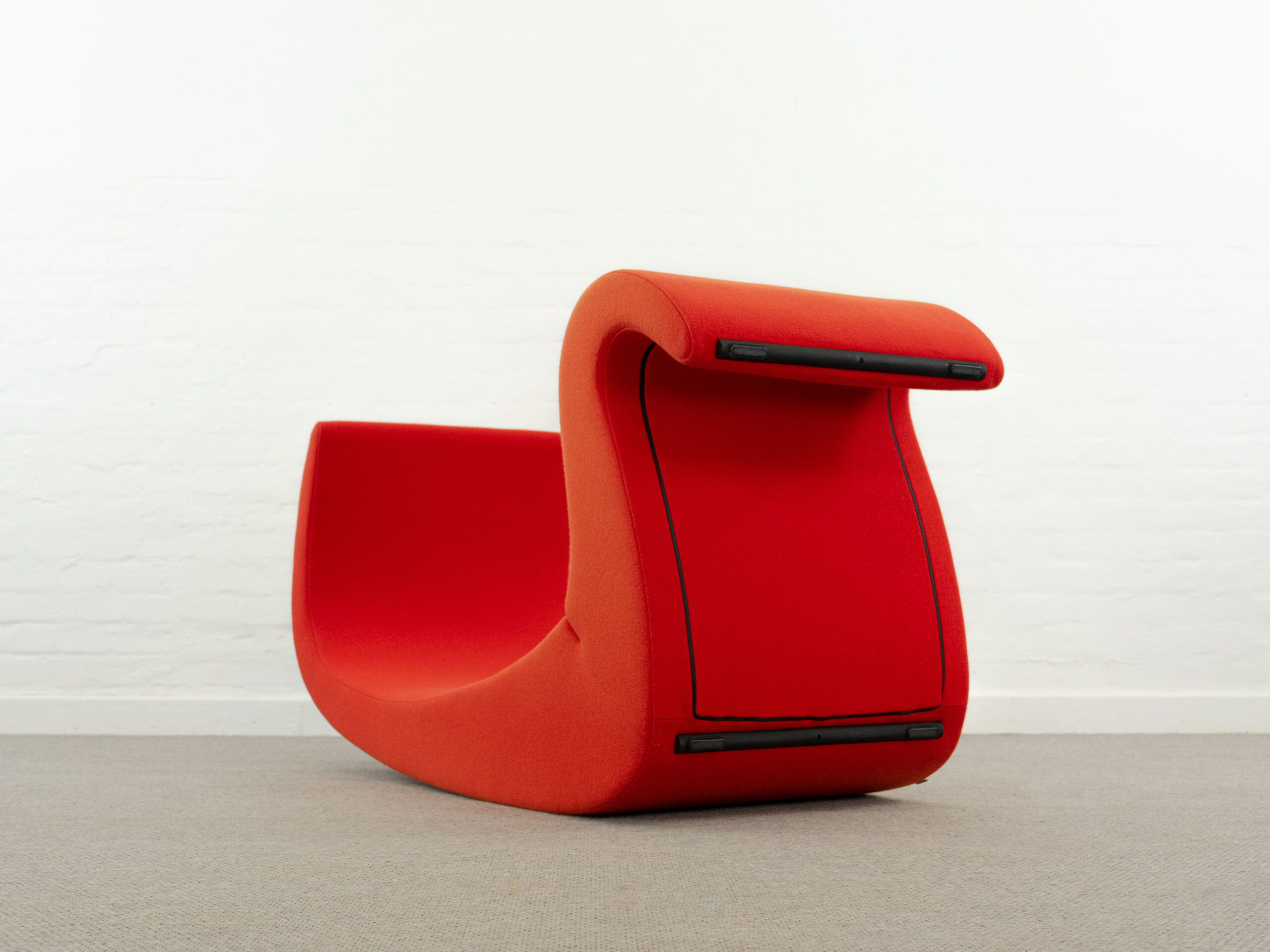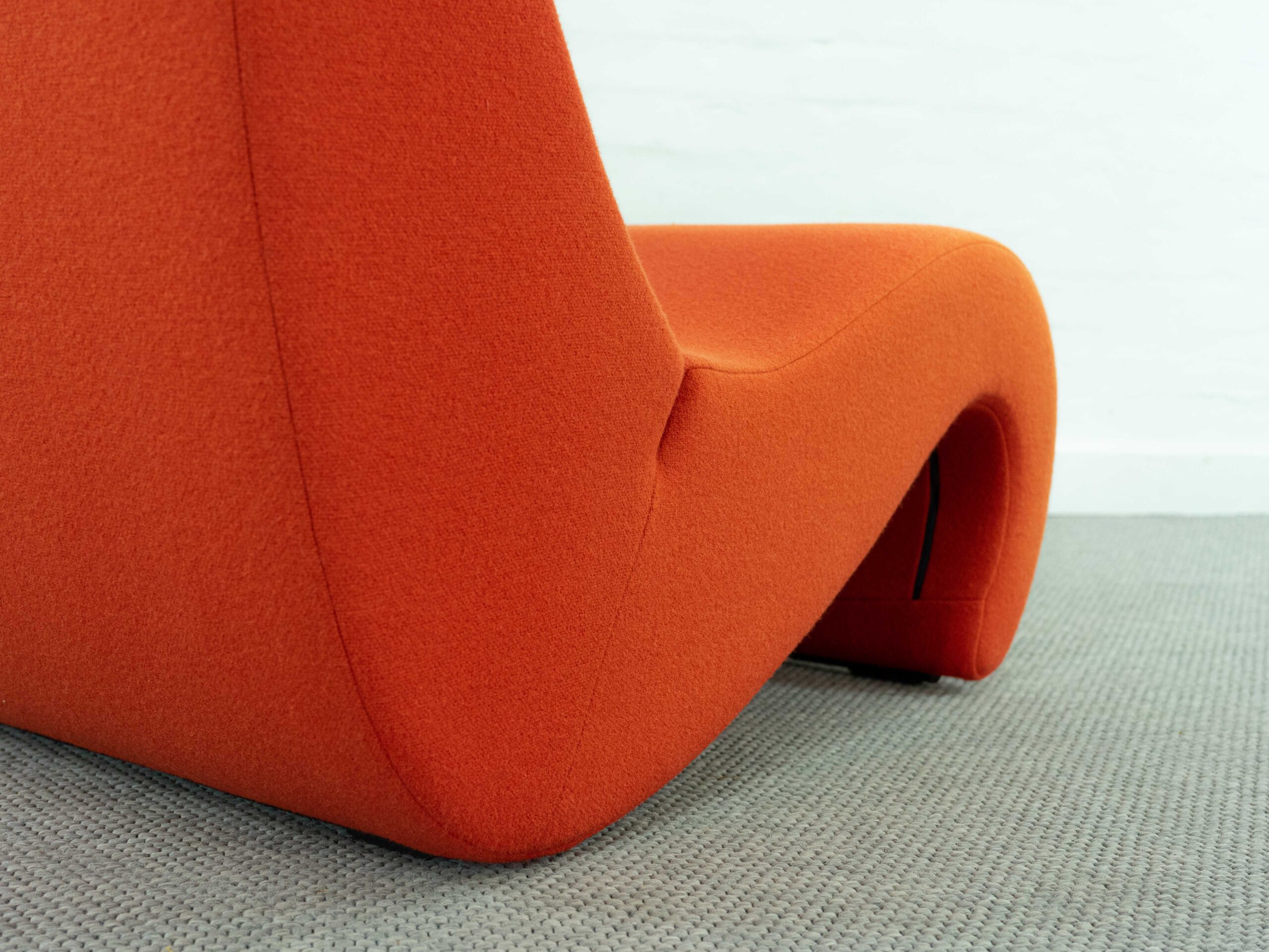 Verner Pantons developed the Amoeba Chair for the famous Visiona-Exhibition in several Versions. This is the highback version which leads the backrest above the head and enfolds as a canopy over the sitting. This communicates comfort and safety and gives a feeling of retreat. This a recent edition, labeled by Vitra. Was a exhibition piece since. On the left front, fabric is slightly faded. Non-smoking piece. Dimensions: H.127.5cm, W.62cm, D.88cm, Seatheight ca.27cm. 19% VAT will be shown on the invoice, if acquired in EU. The white Panton chair is not part of this offer. The chair can be acquired separately.