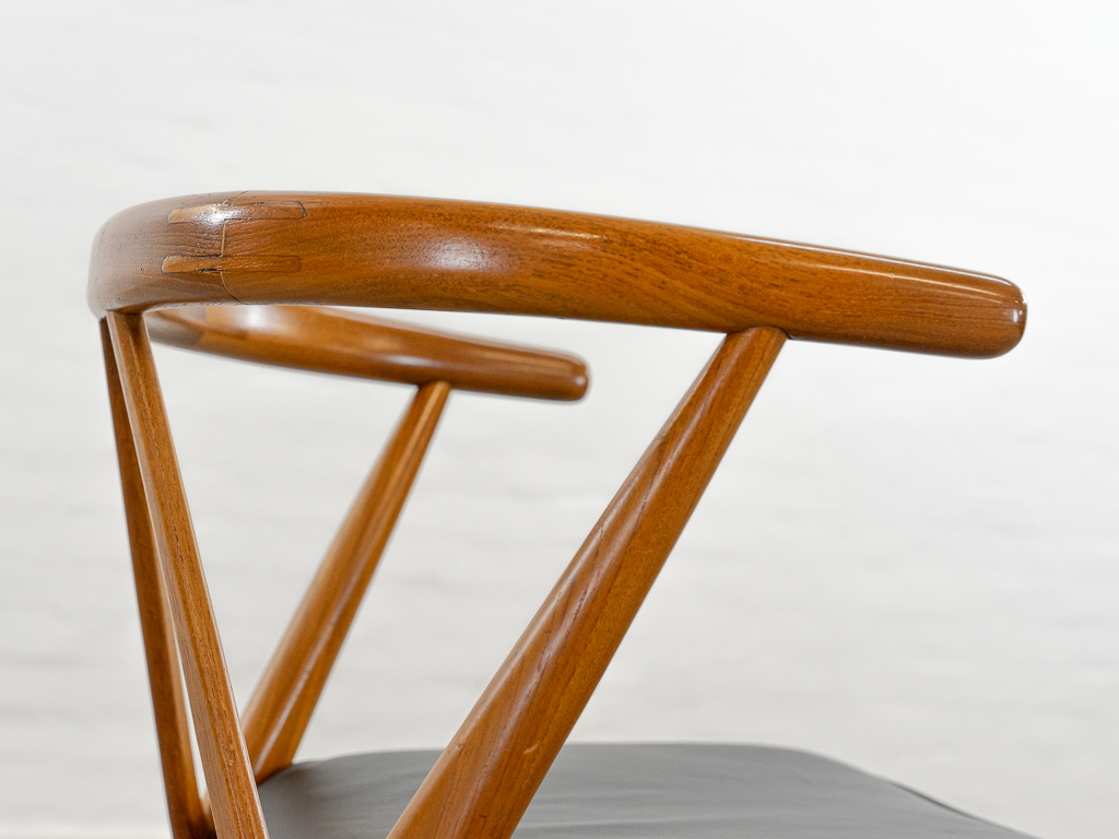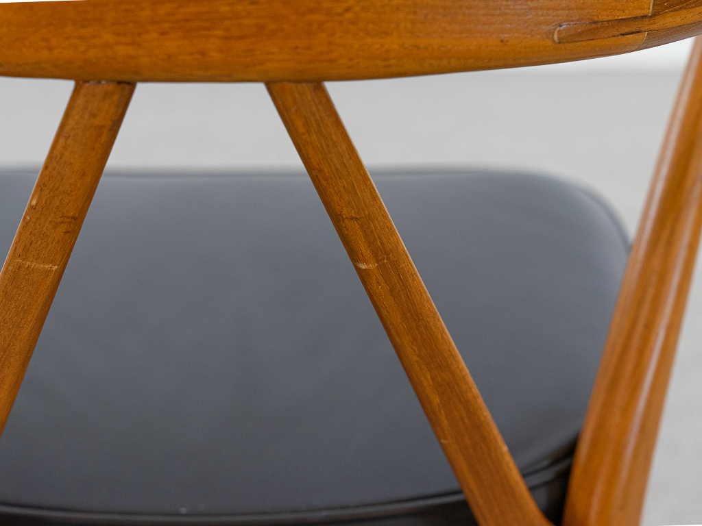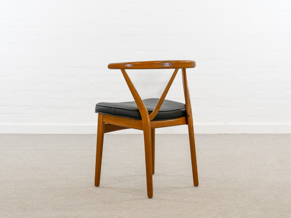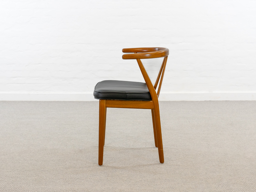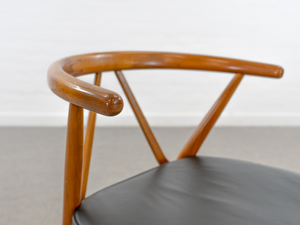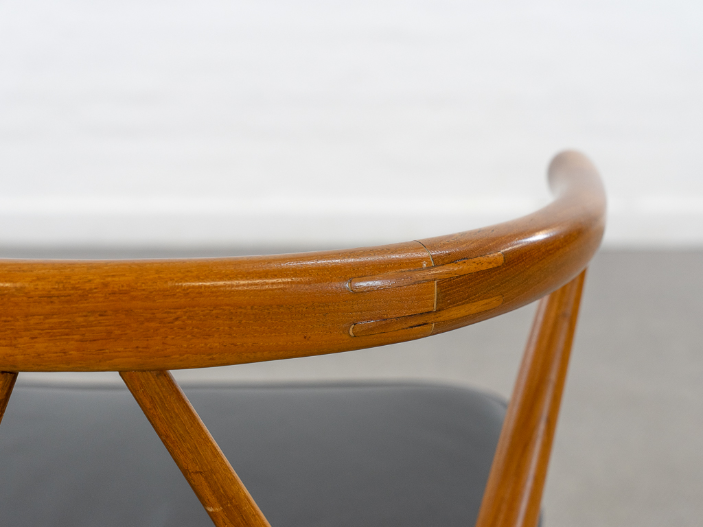 Armchair or desk chair, model 255, designed by Henning Kjaernulf for Bruno Hansen, Denmark, 1960s. The chair is made of teak. The striking lines of the backrest give these chairs a very open and recognizable design. W. 55 cm, D. 50 cm, H. 74 cm. Minor signs of age and wear present. The previous owner had the seat upholstered in black leather.