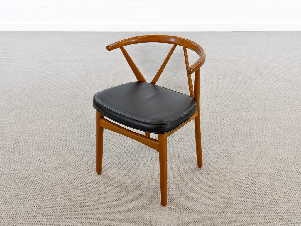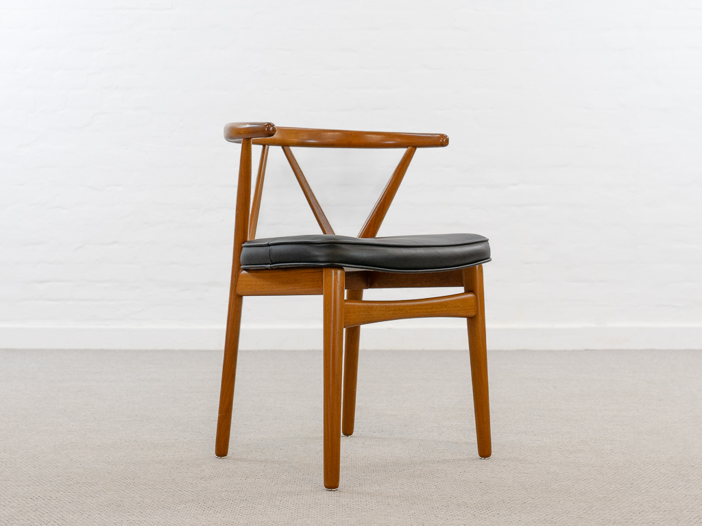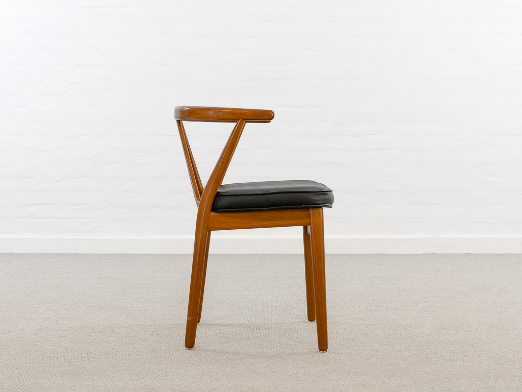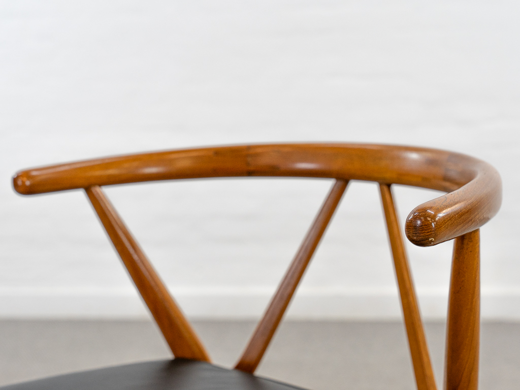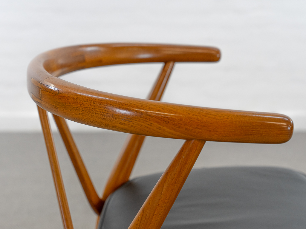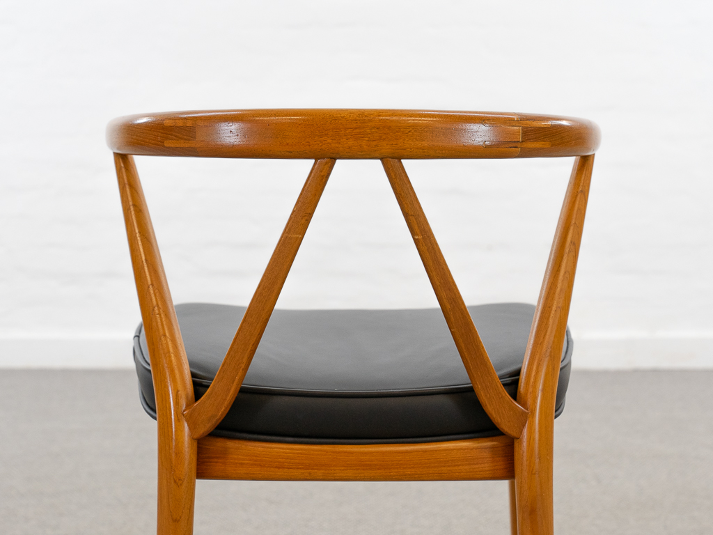 Armchair or desk chair, model 255, designed by Henning Kjaernulf for Bruno Hansen, Denmark, 1960s. The chair is made of teak. The striking lines of the backrest give these chairs a very open and recognizable design. W. 55 cm, D. 50 cm, H. 74 cm. Minor signs of age and wear present. The previous owner had the seat upholstered in black leather.