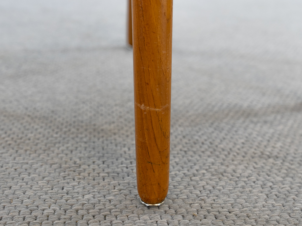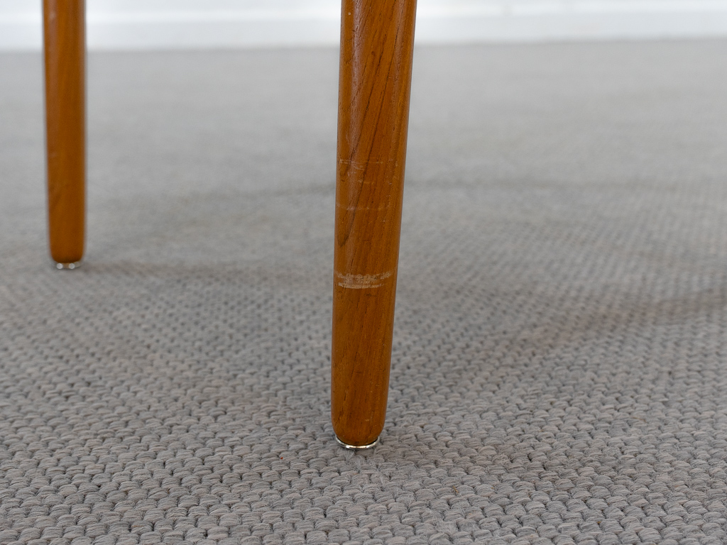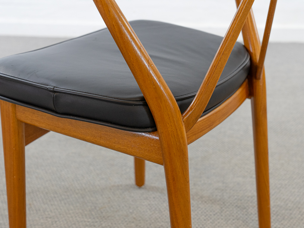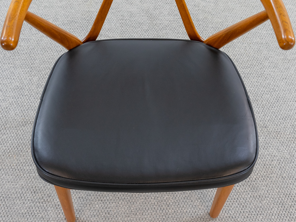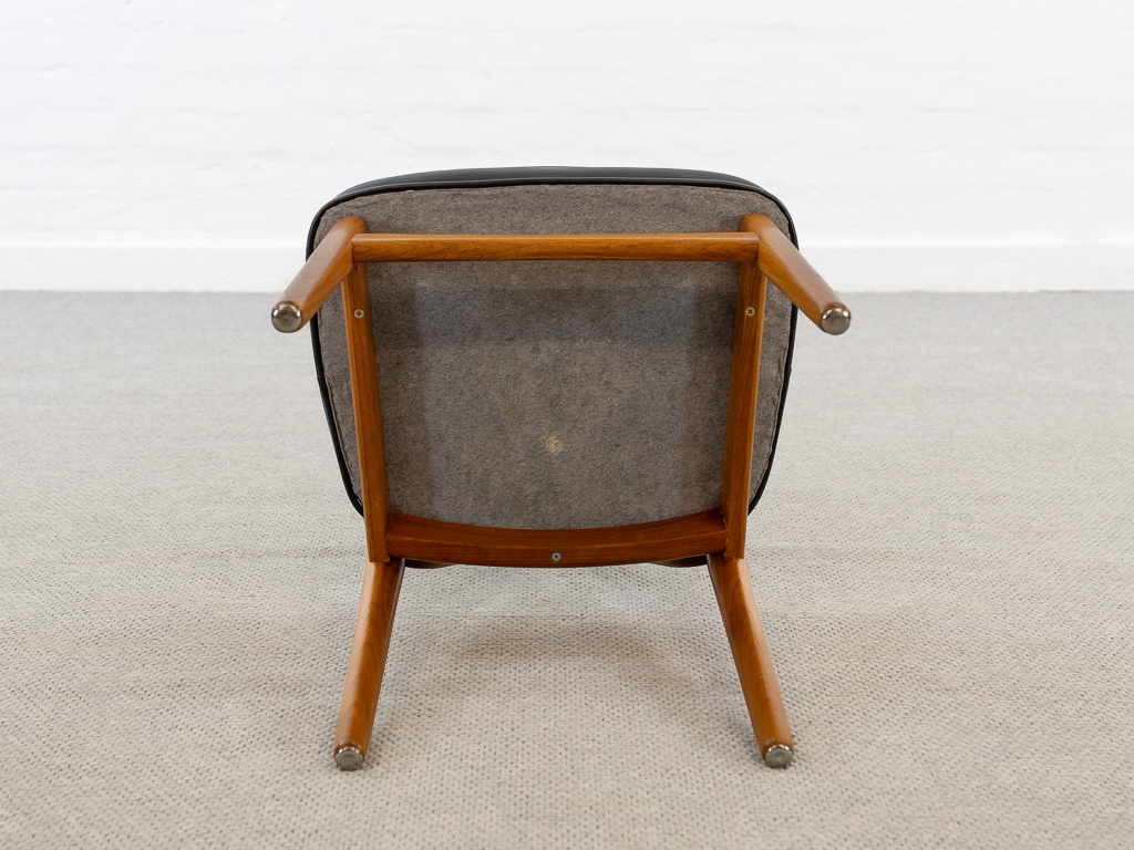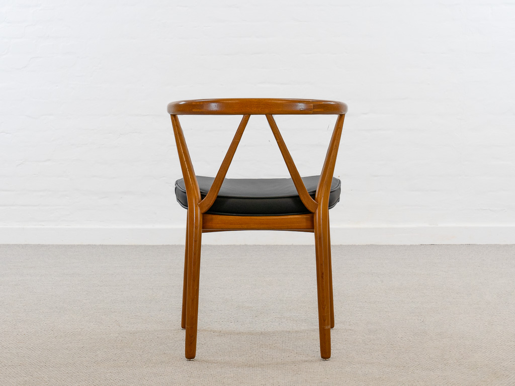 Armchair or desk chair, model 255, designed by Henning Kjaernulf for Bruno Hansen, Denmark, 1960s. The chair is made of teak. The striking lines of the backrest give these chairs a very open and recognizable design. W. 55 cm, D. 50 cm, H. 74 cm. Minor signs of age and wear present. The previous owner had the seat upholstered in black leather.