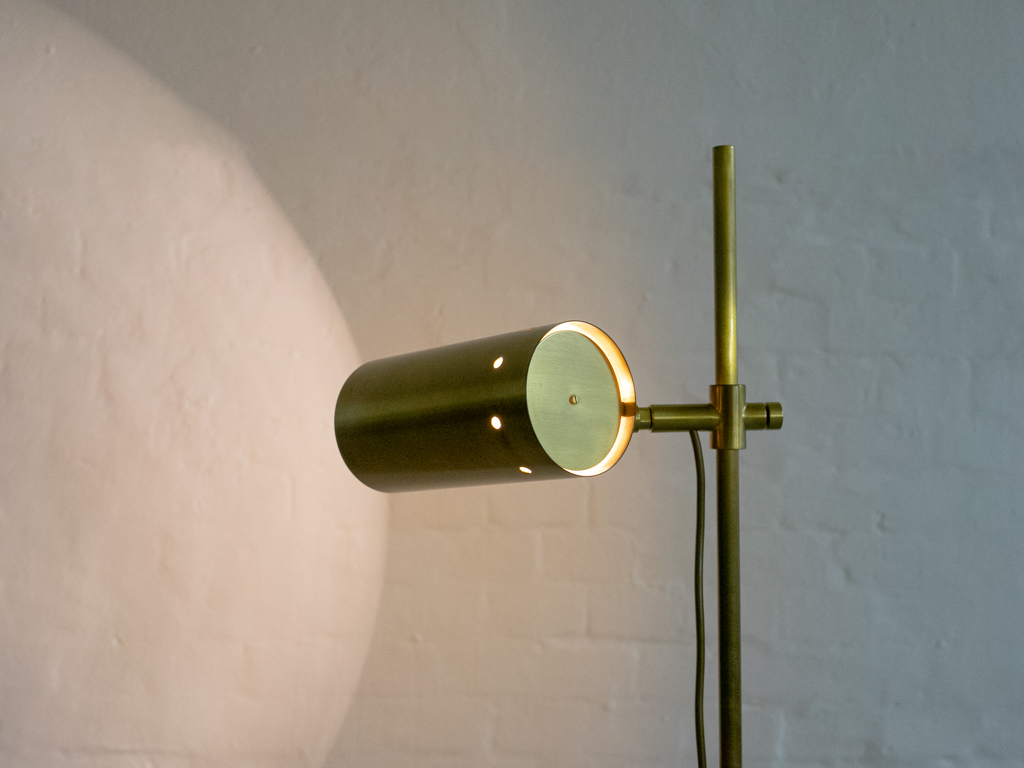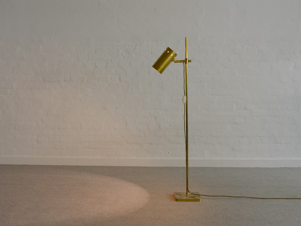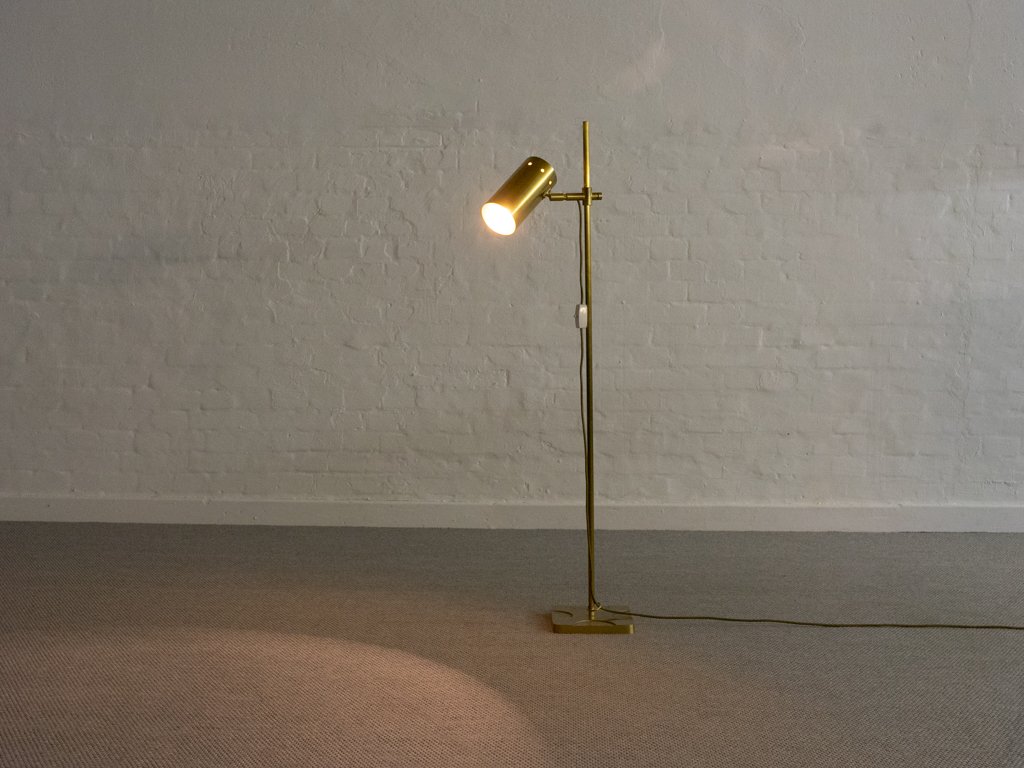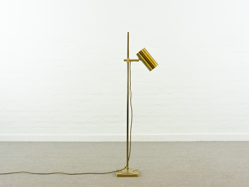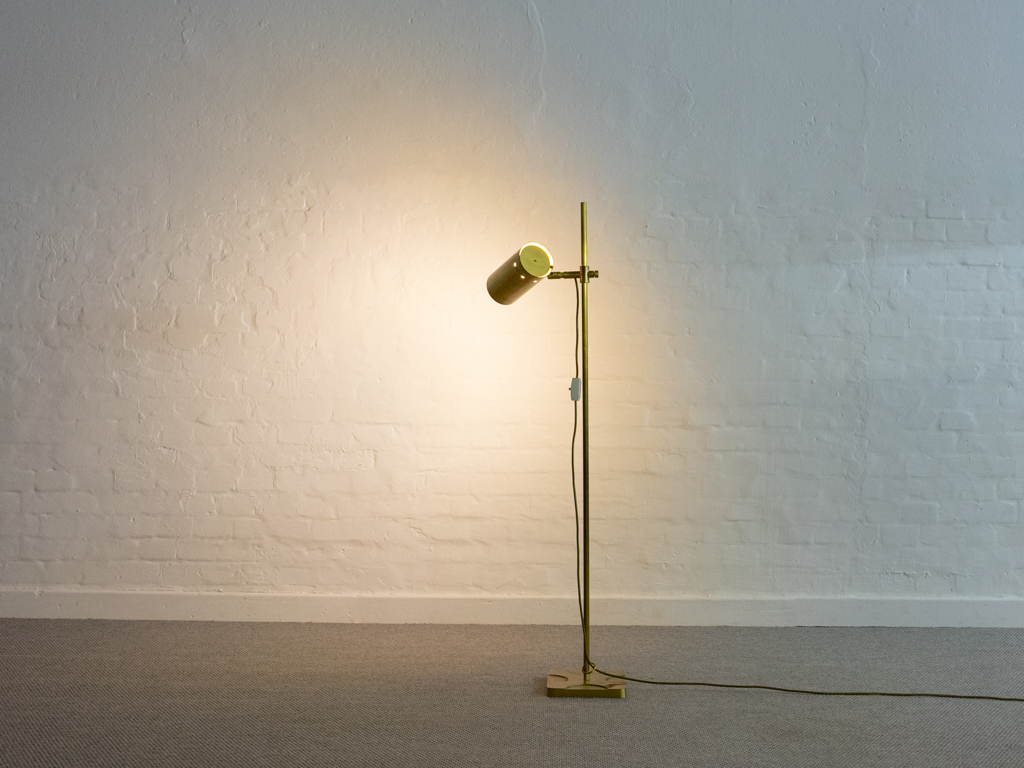Adjustable Floorlamp / Spot from the 60s. Designer and Manufacturer unknown. Height 129cm, Spotdiameter 10cm, Spotlength 20cm. E27 Socket. Minor signs of use and age, remains in good condition.