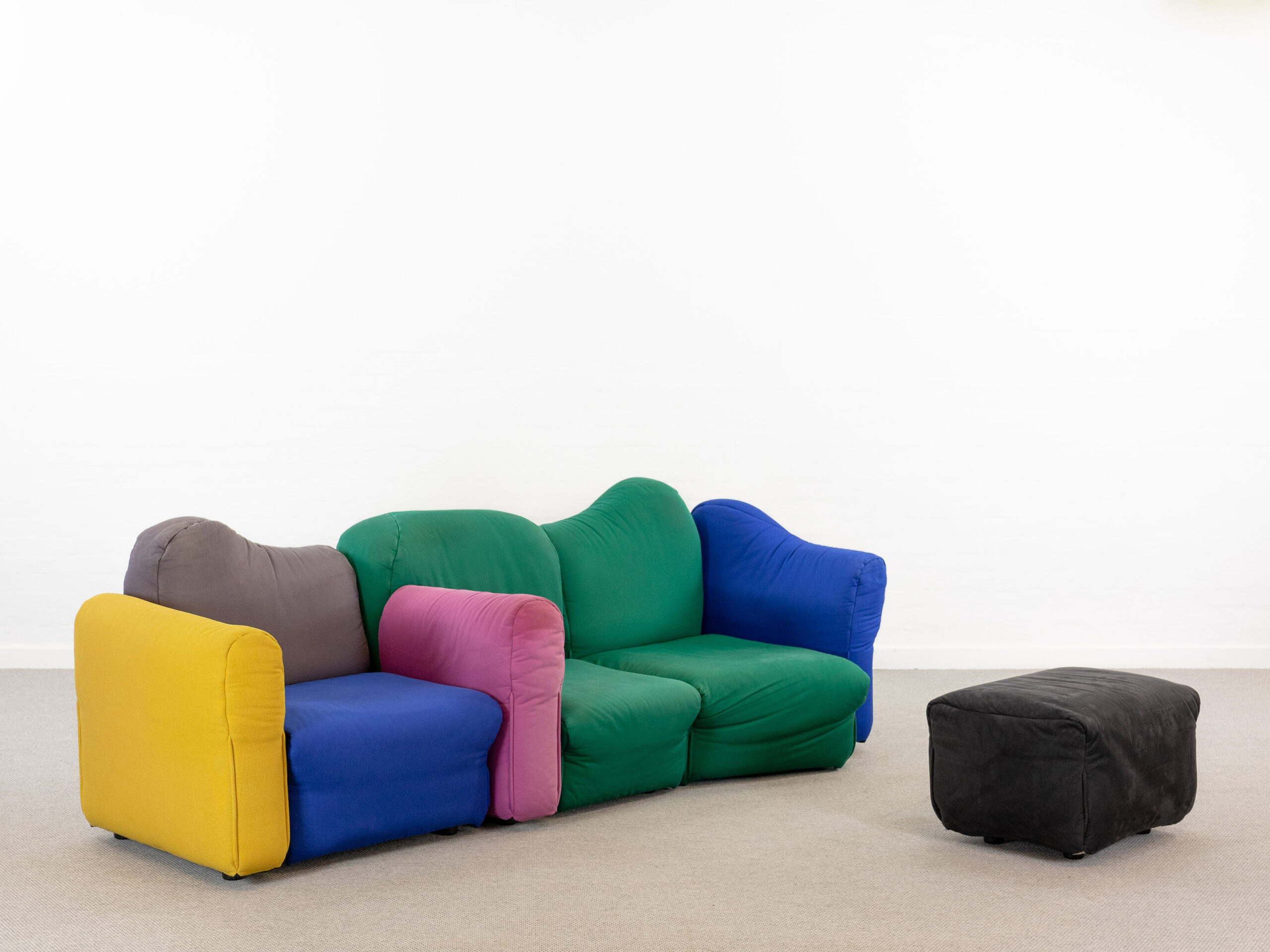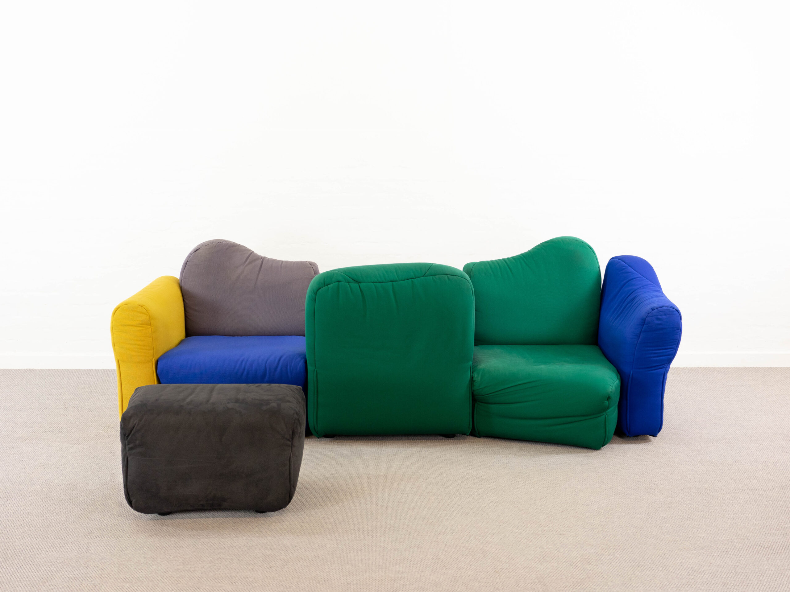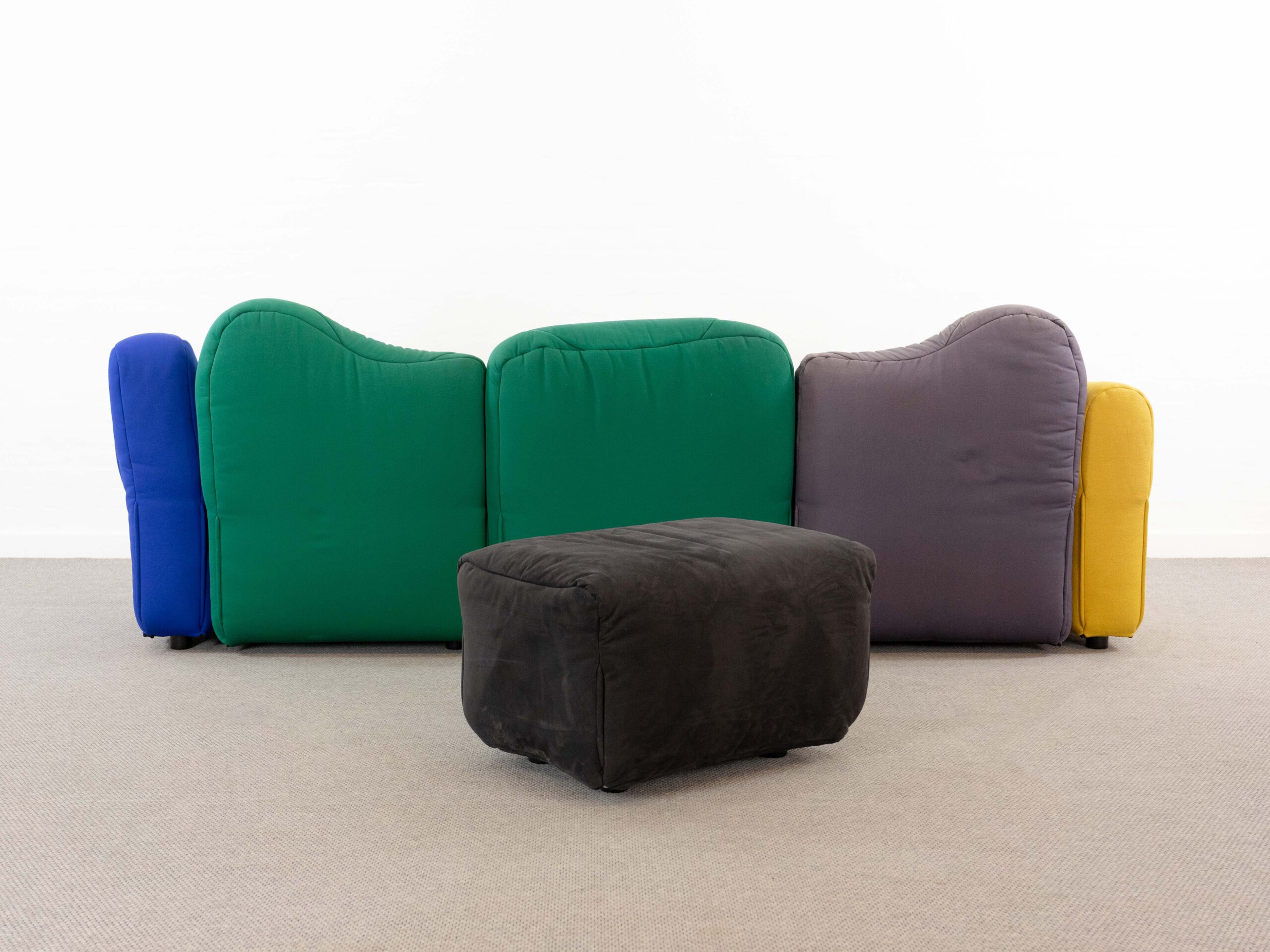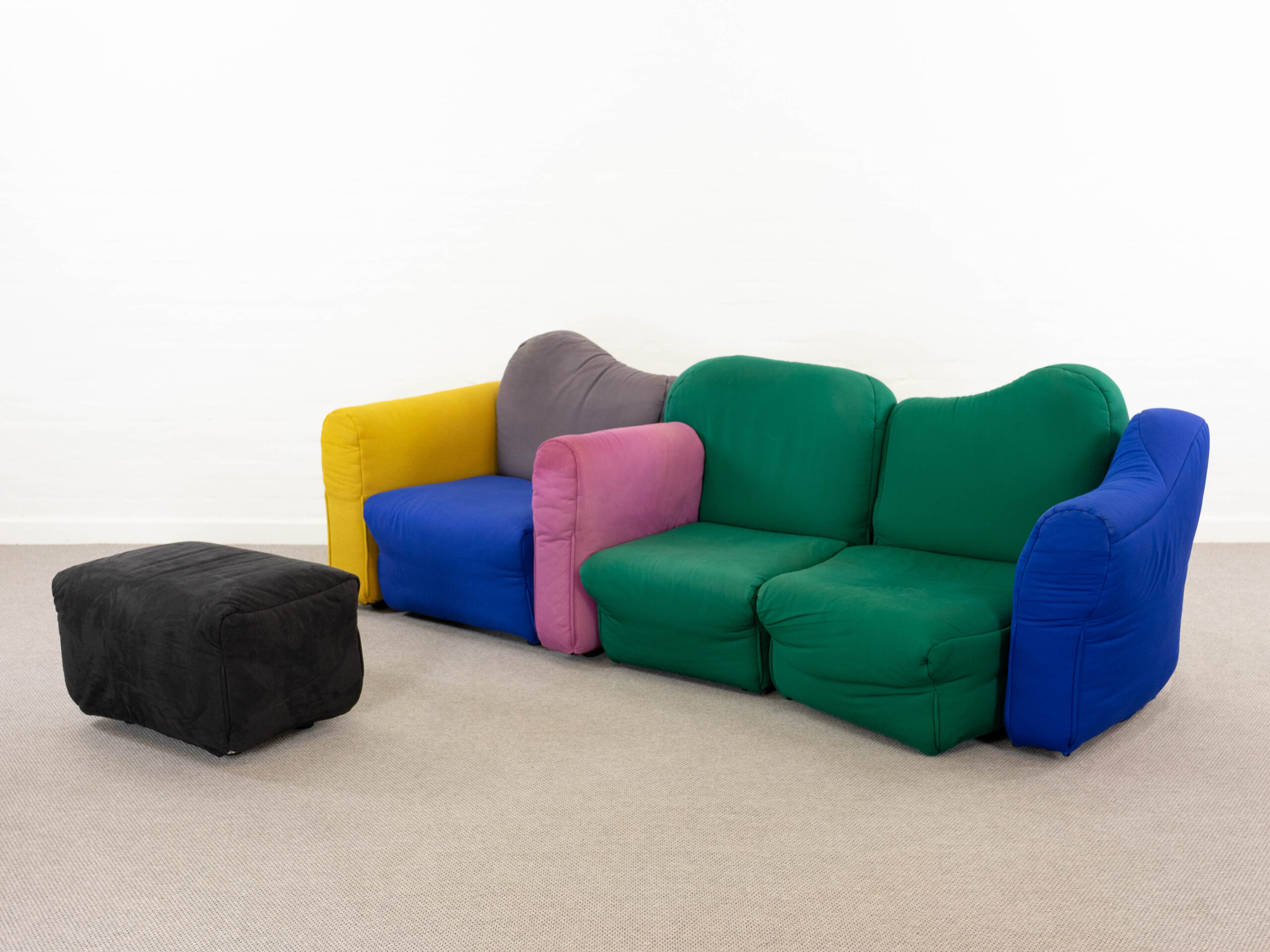 Rare modular Cannaregio Sofa by Gaetano Pesce. Postmodern / Memphis Design from 1986, manufactured by Cassina, Italy. Comes with original footrest in black fabrics. Original Upholsterey in green, blue, grey, yellow and pink fabrics. Extendable with other Cannaregio Modules; Sofa comes with 4 connectors. Cassina Logo on inside of the fabrics. Good used condition. Small stains on left green seat area, strong use at pink armrest, bleaching from sunlight and general use and wear. I gladly send more images on request.