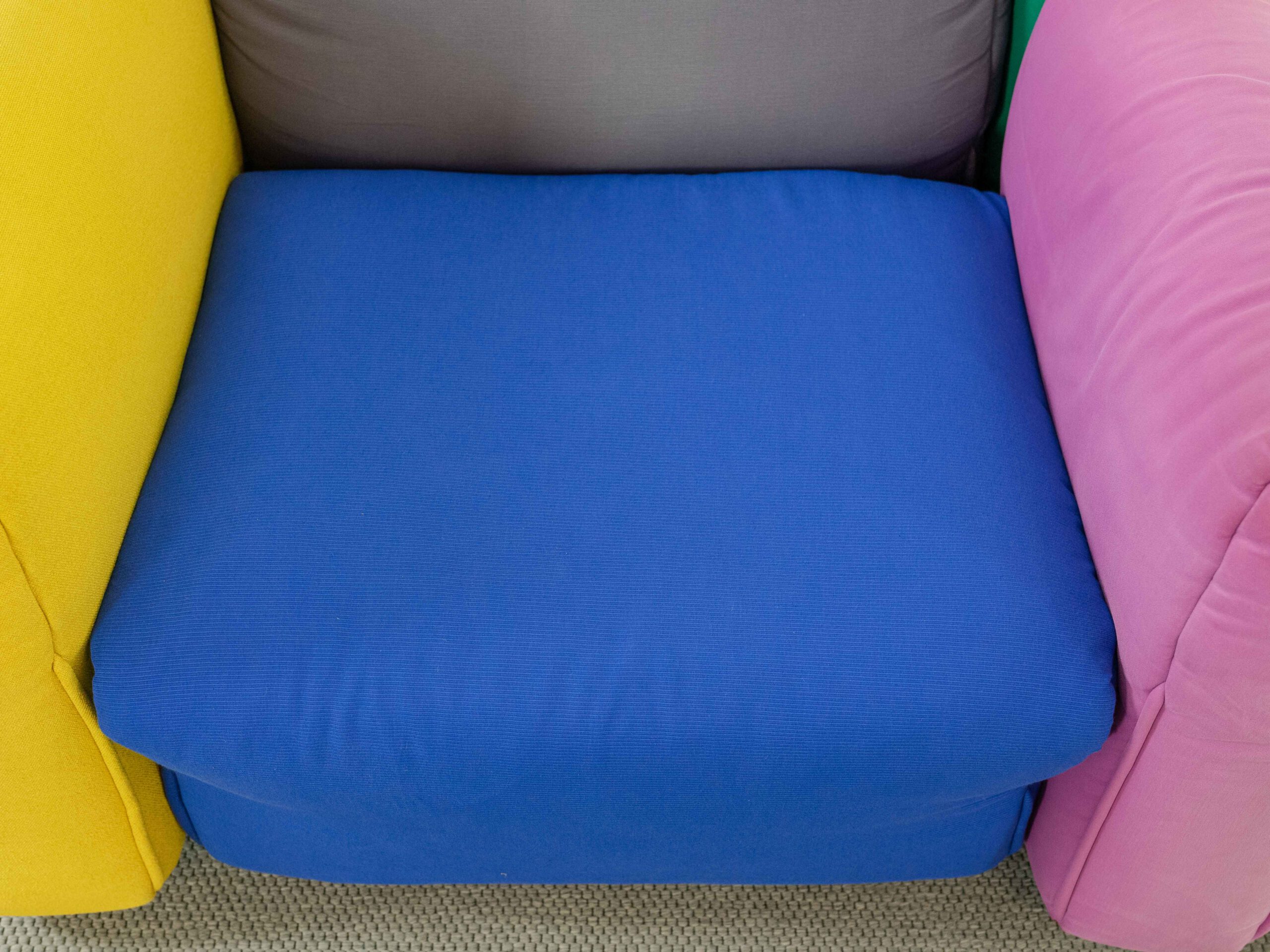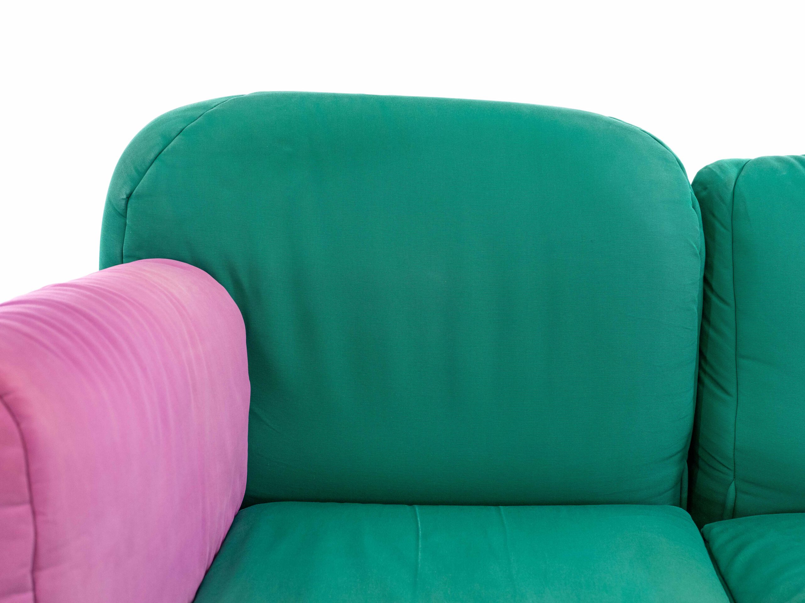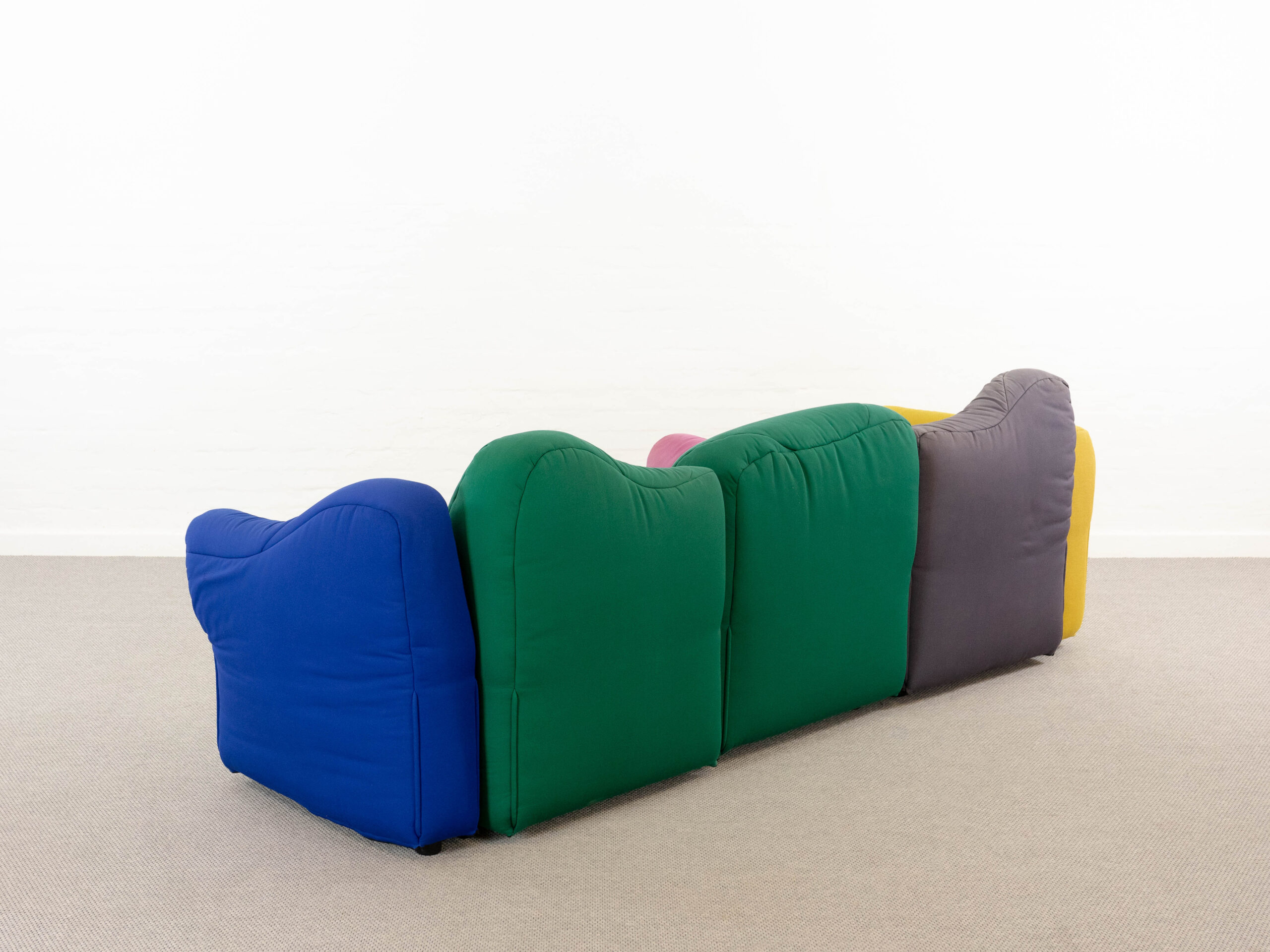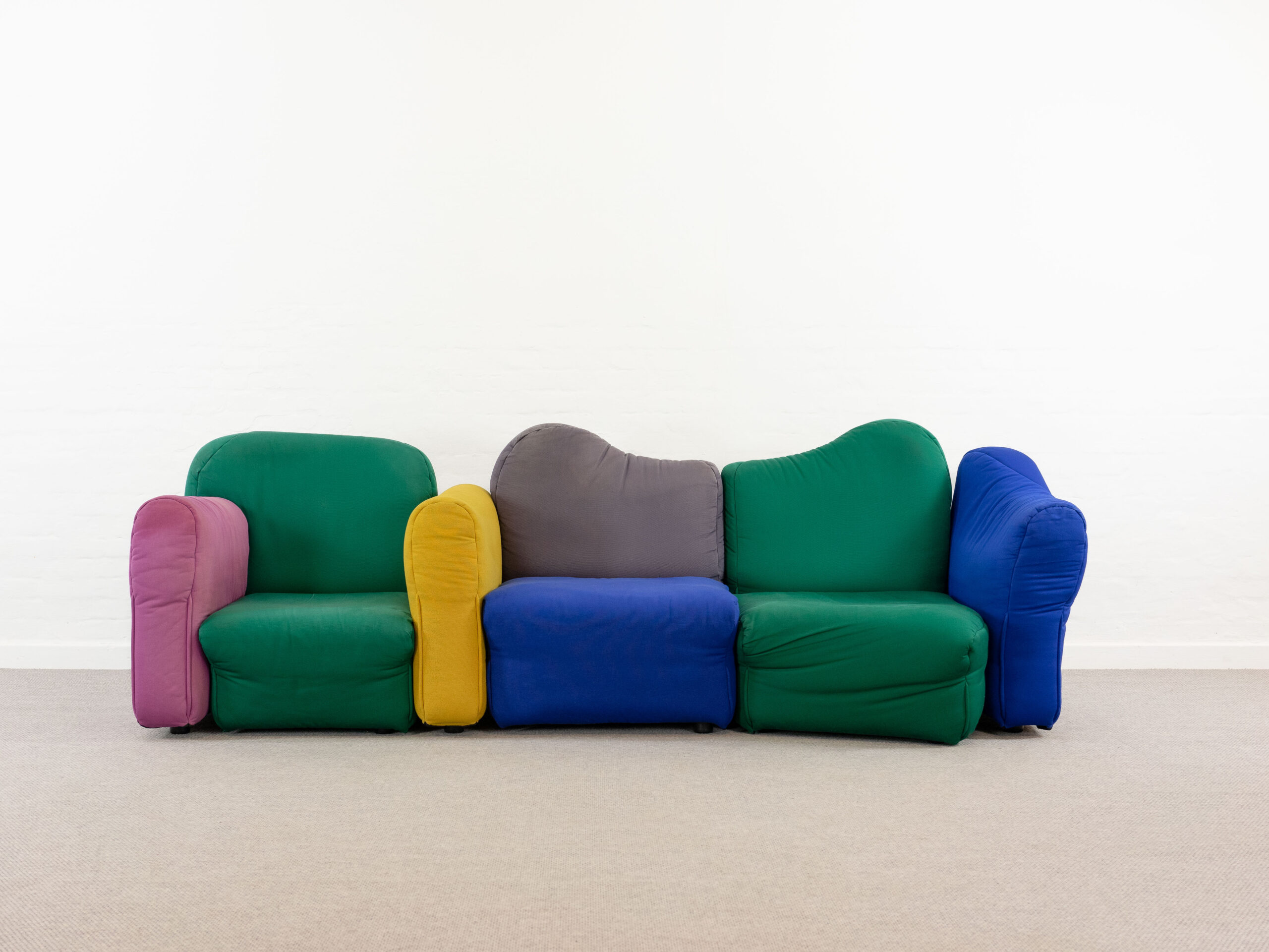 Rare modular Cannaregio Sofa by Gaetano Pesce. Postmodern / Memphis Design from 1986, manufactured by Cassina, Italy. Comes with original footrest in black fabrics. Original Upholsterey in green, blue, grey, yellow and pink fabrics. Extendable with other Cannaregio Modules; Sofa comes with 4 connectors. Cassina Logo on inside of the fabrics. Good used condition. Small stains on left green seat area, strong use at pink armrest, bleaching from sunlight and general use and wear. I gladly send more images on request.