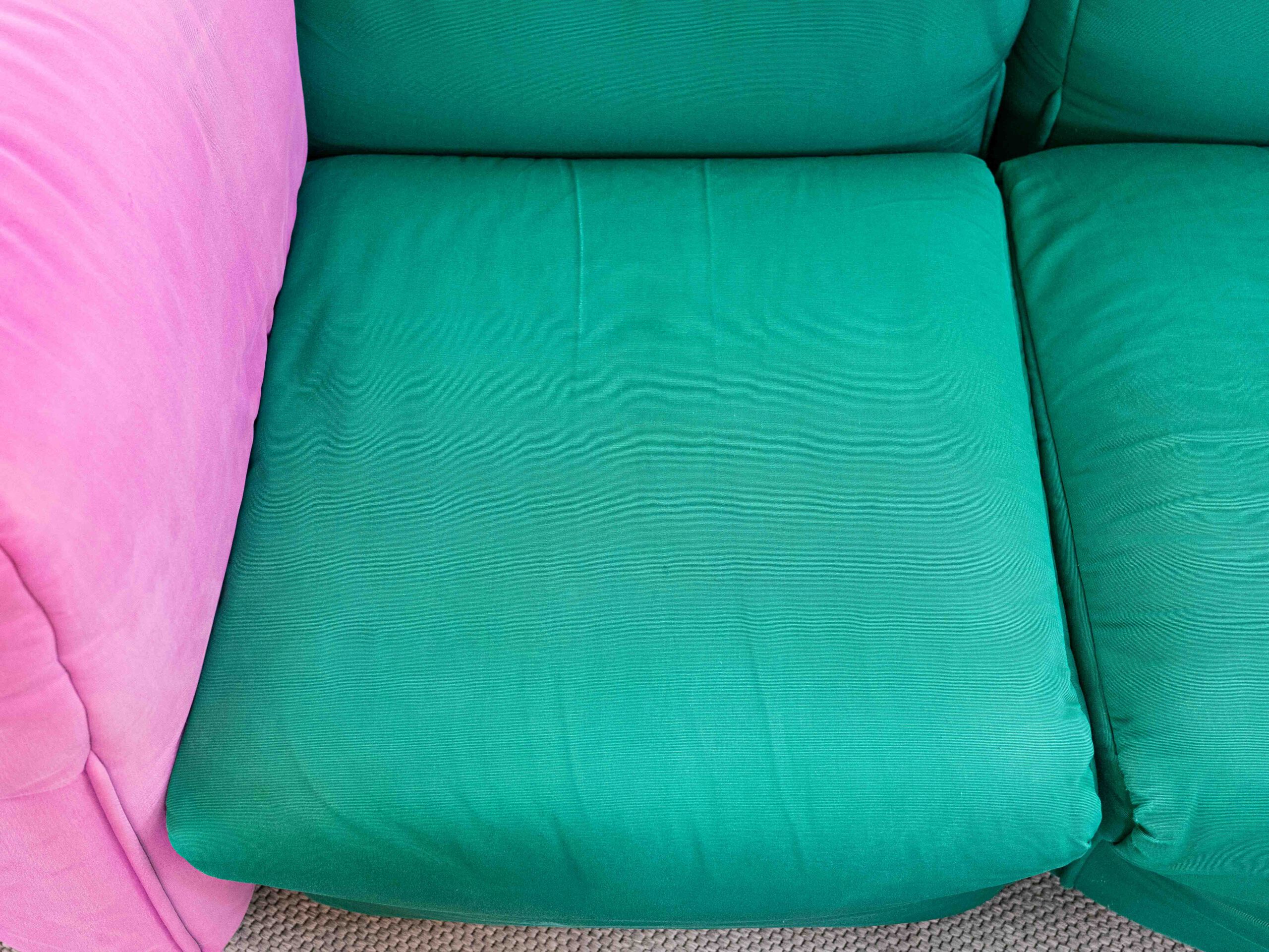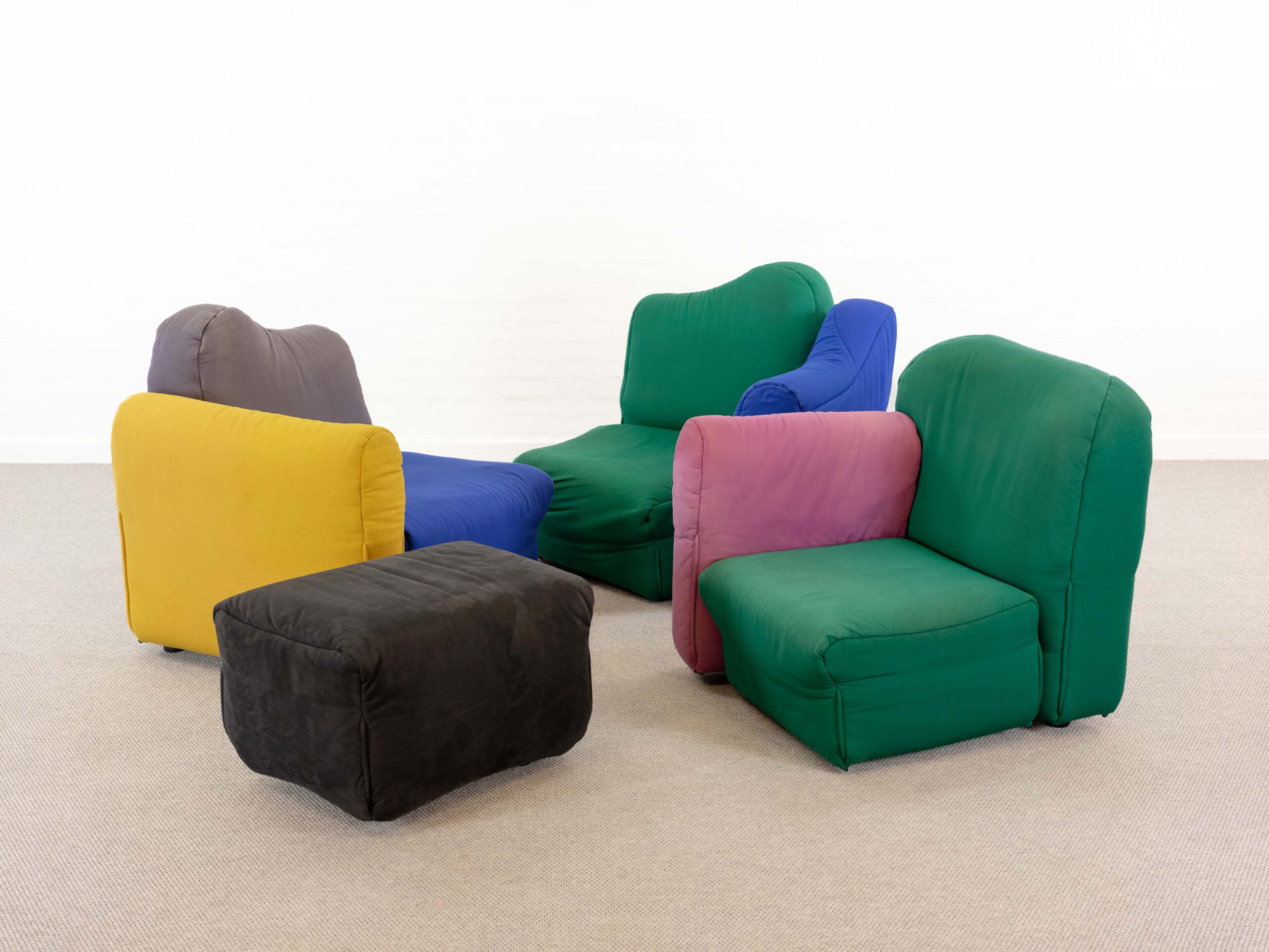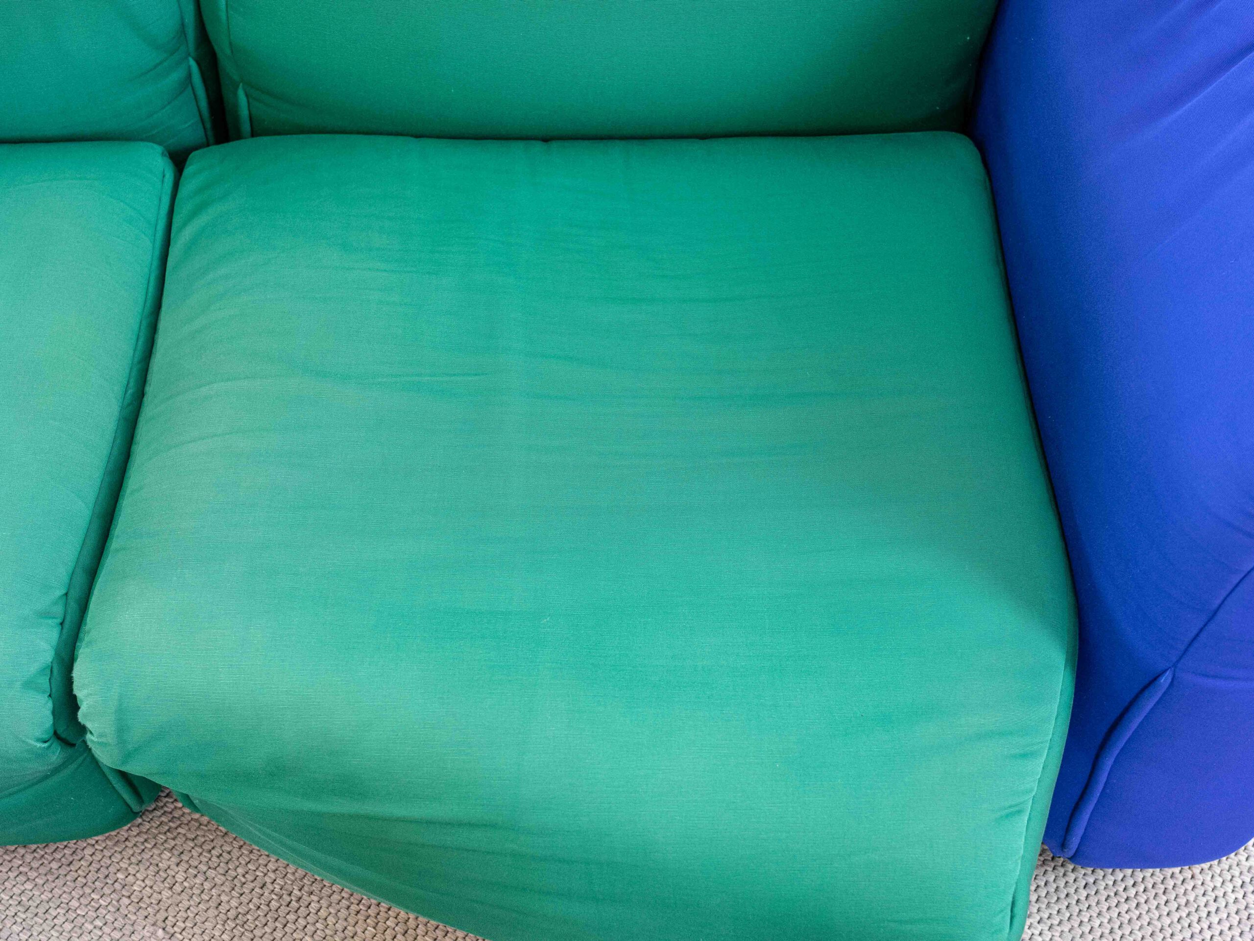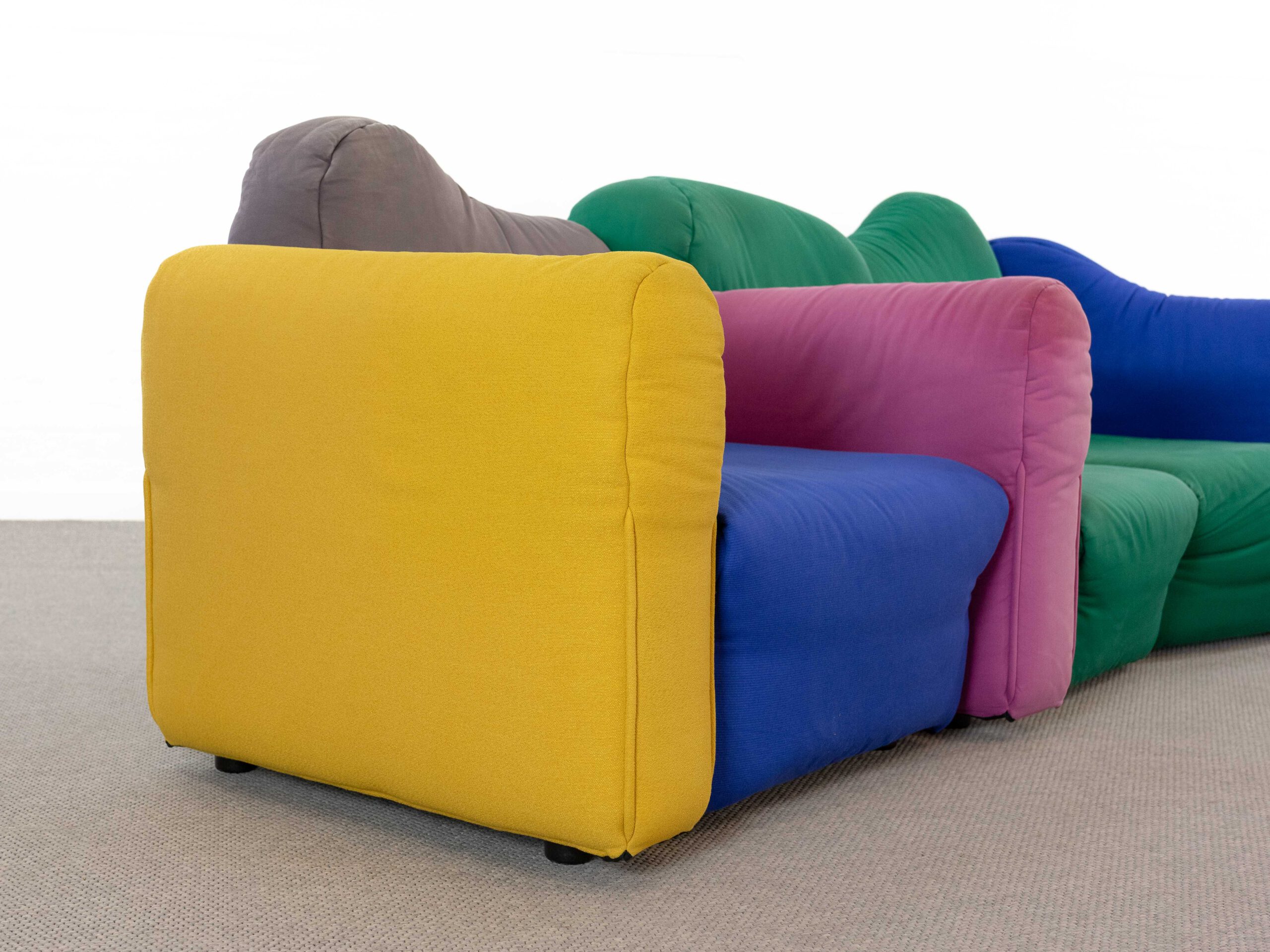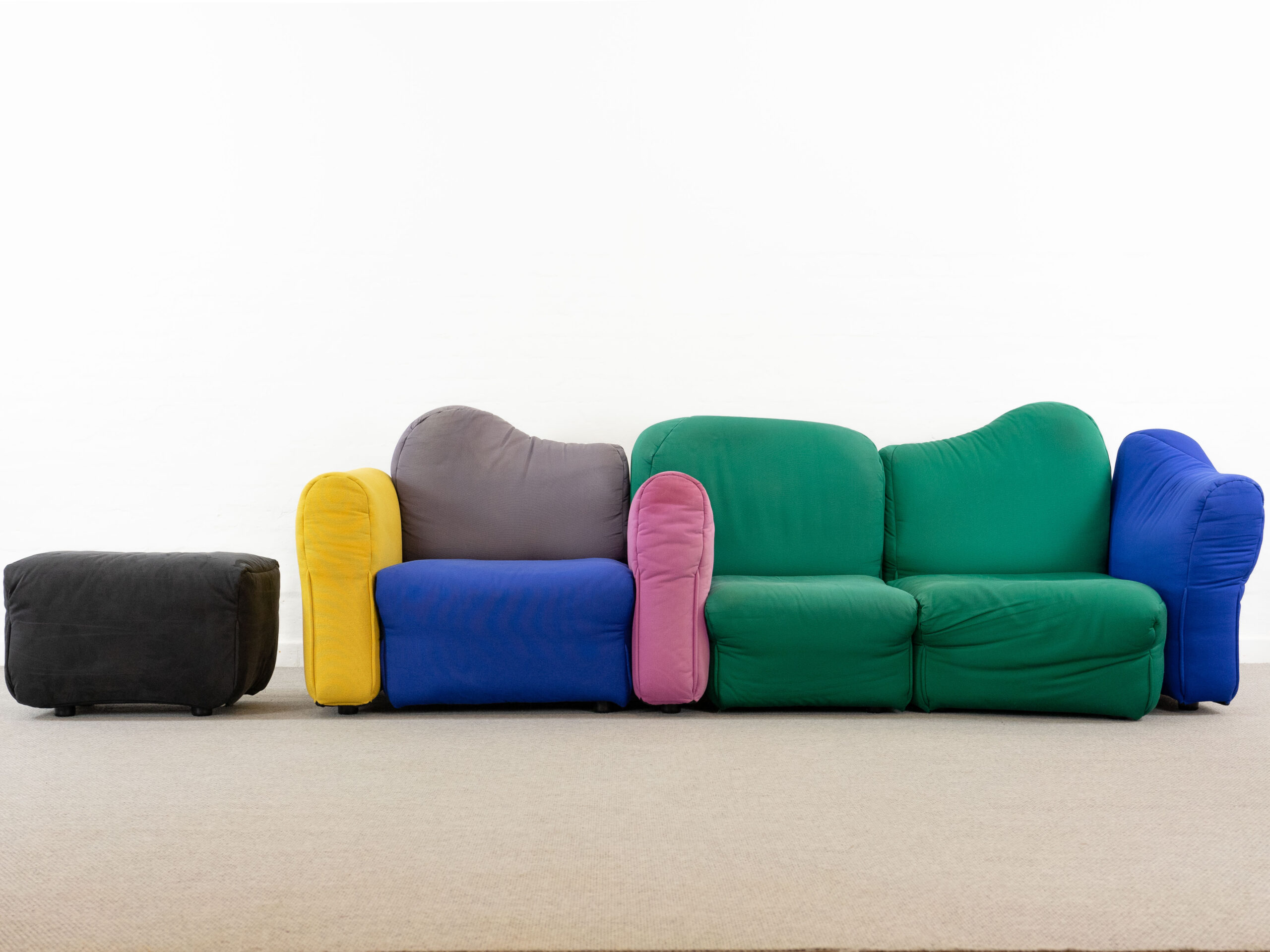 Rare modular Cannaregio Sofa by Gaetano Pesce. Postmodern / Memphis Design from 1986, manufactured by Cassina, Italy. Comes with original footrest in black fabrics. Original Upholsterey in green, blue, grey, yellow and pink fabrics. Extendable with other Cannaregio Modules; Sofa comes with 4 connectors. Cassina Logo on inside of the fabrics. Good used condition. Small stains on left green seat area, strong use at pink armrest, bleaching from sunlight and general use and wear. I gladly send more images on request.