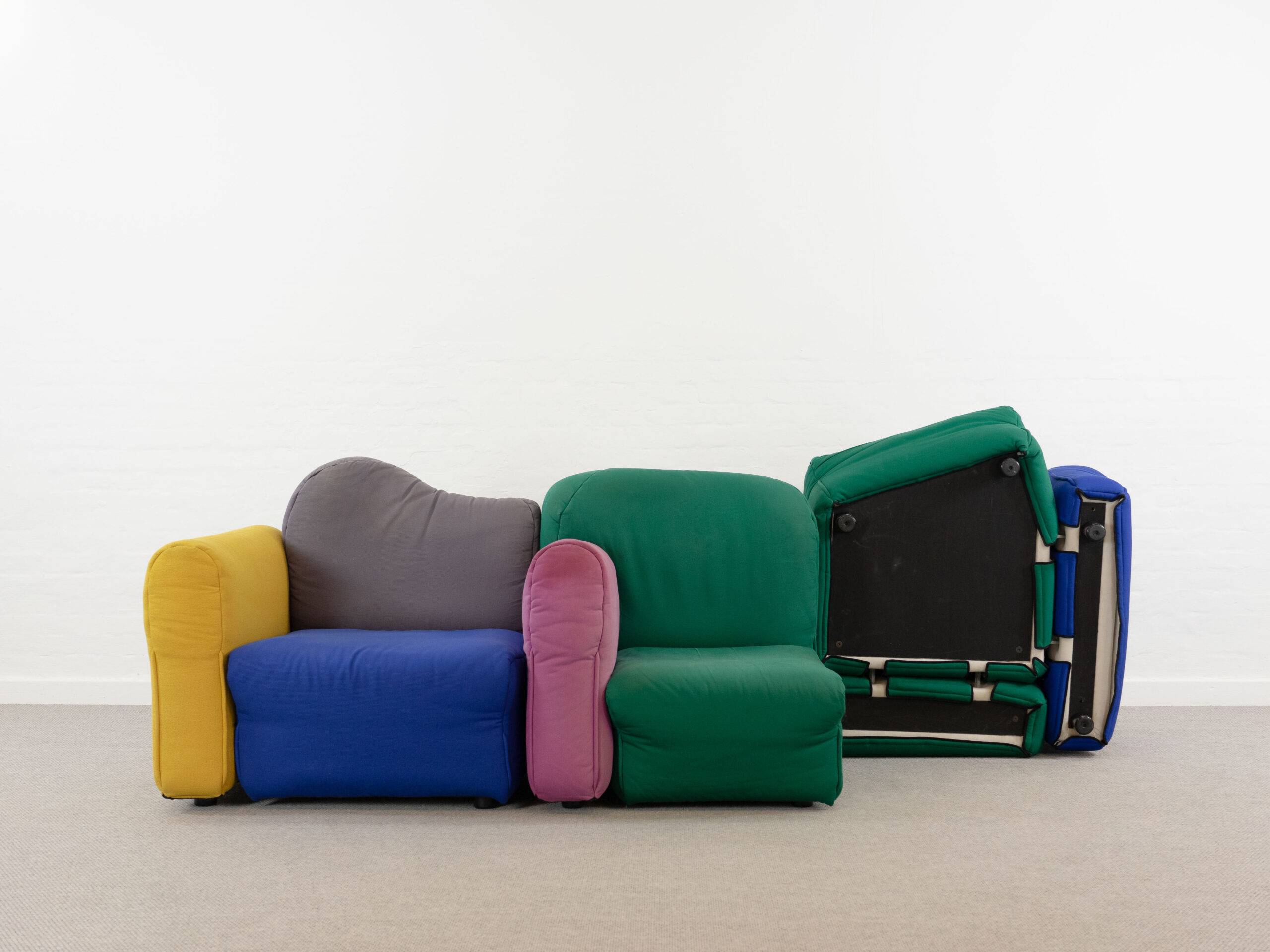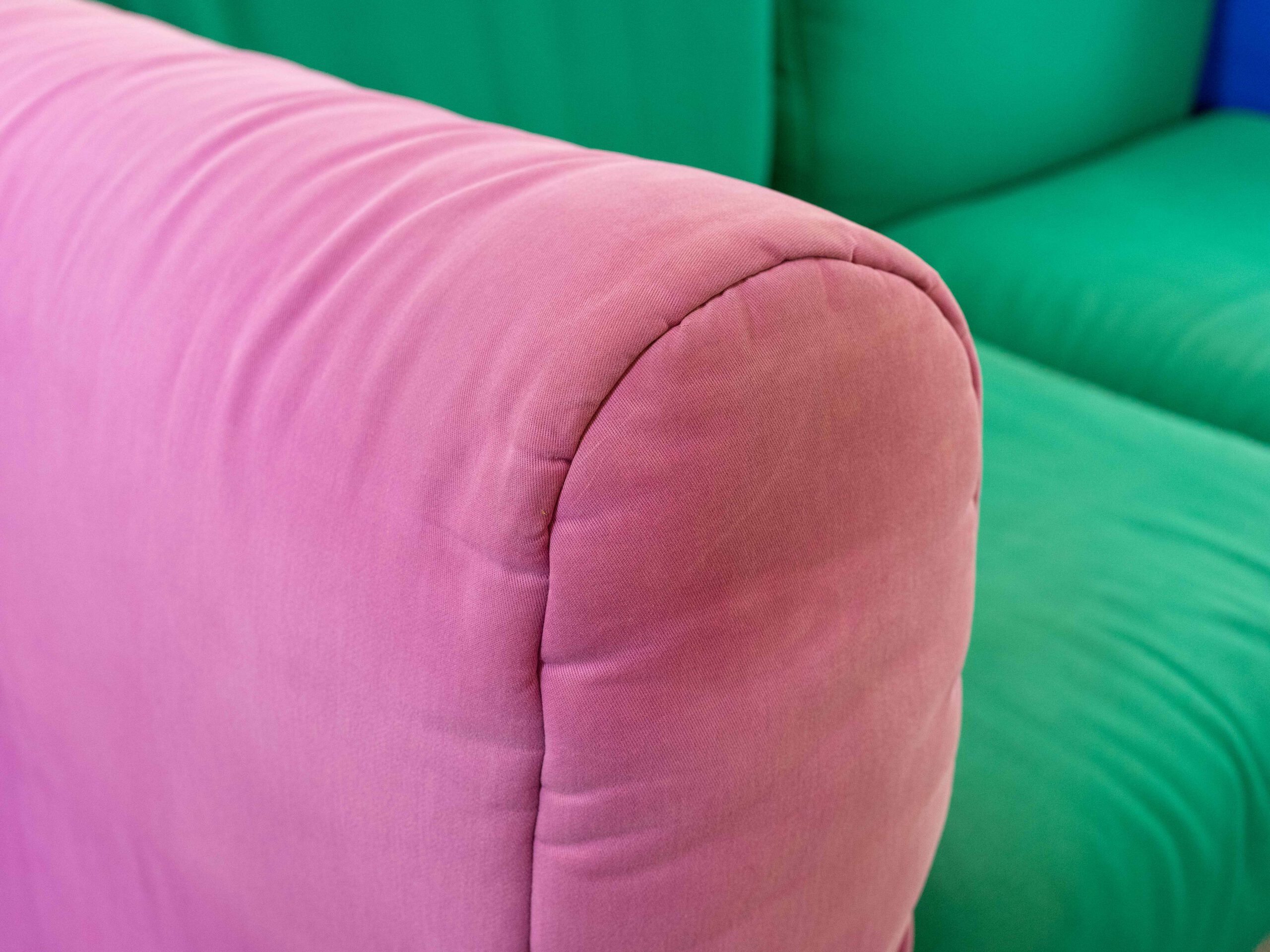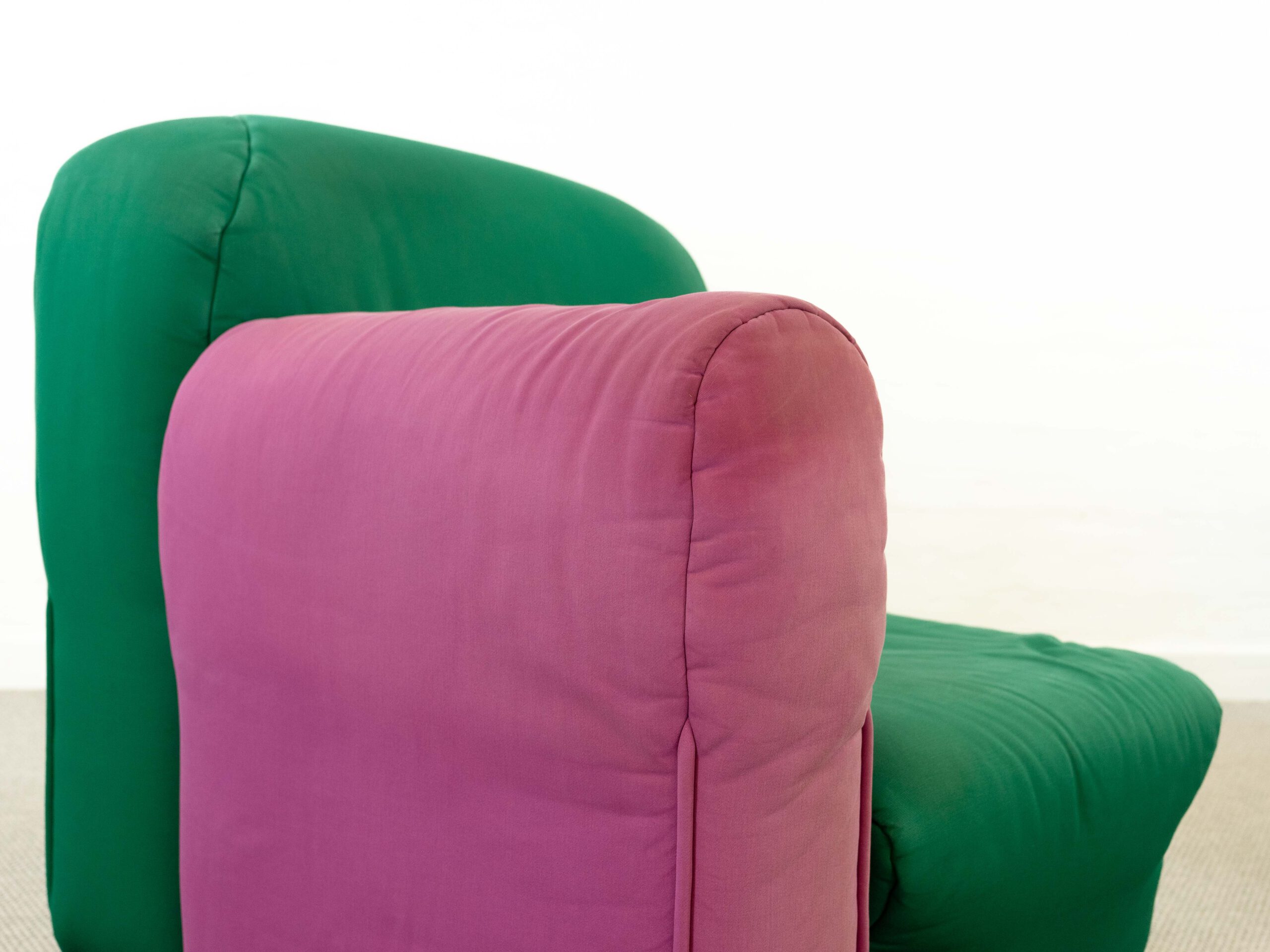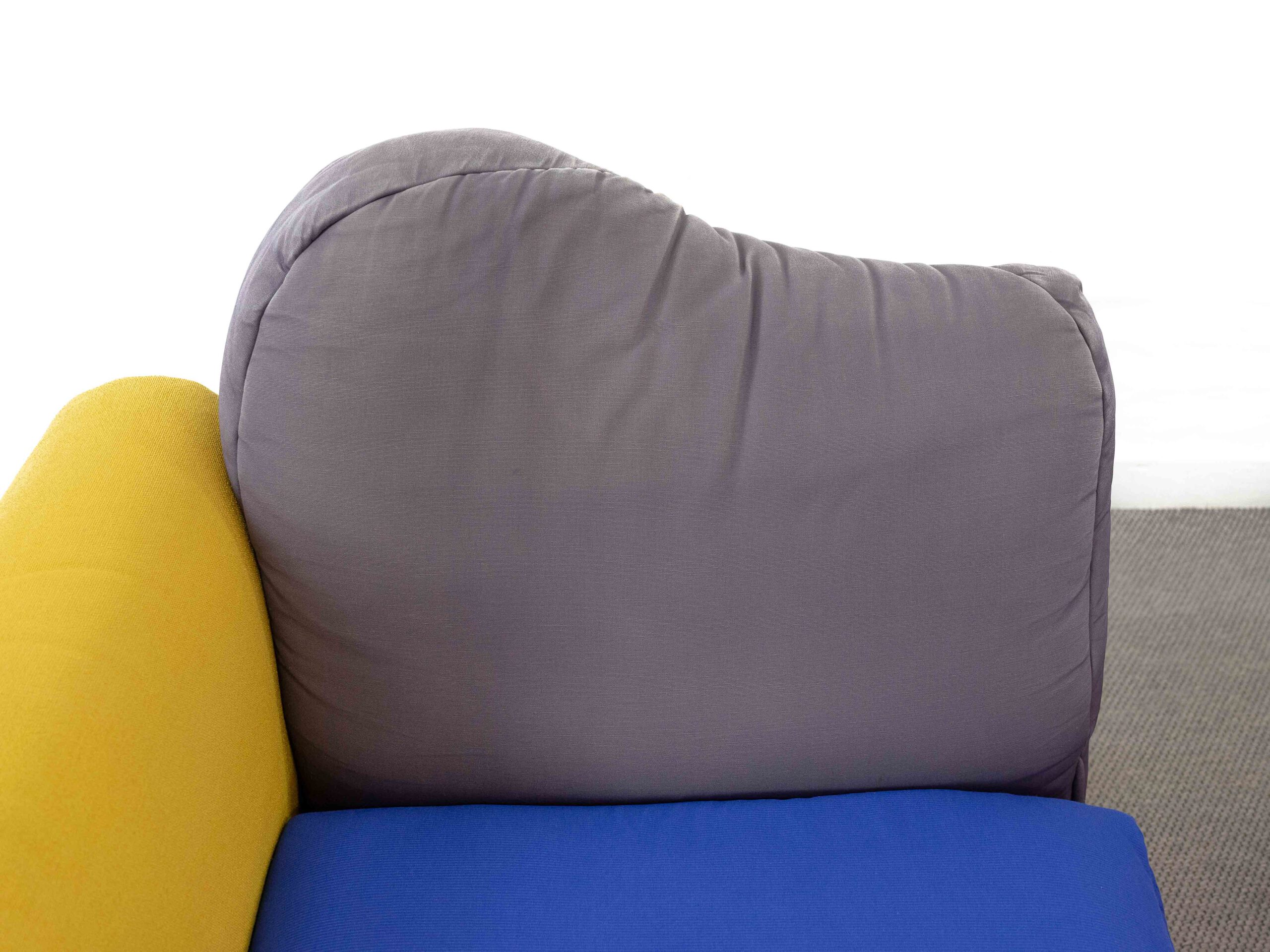Rare modular Cannaregio Sofa by Gaetano Pesce. Postmodern / Memphis Design from 1986, manufactured by Cassina, Italy. Comes with original footrest in black fabrics. Original Upholsterey in green, blue, grey, yellow and pink fabrics. Extendable with other Cannaregio Modules; Sofa comes with 4 connectors. Cassina Logo on inside of the fabrics. Good used condition. Small stains on left green seat area, strong use at pink armrest, bleaching from sunlight and general use and wear. I gladly send more images on request.
