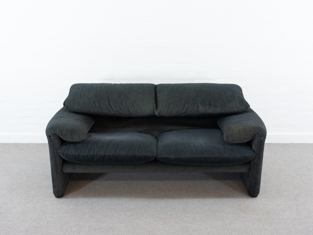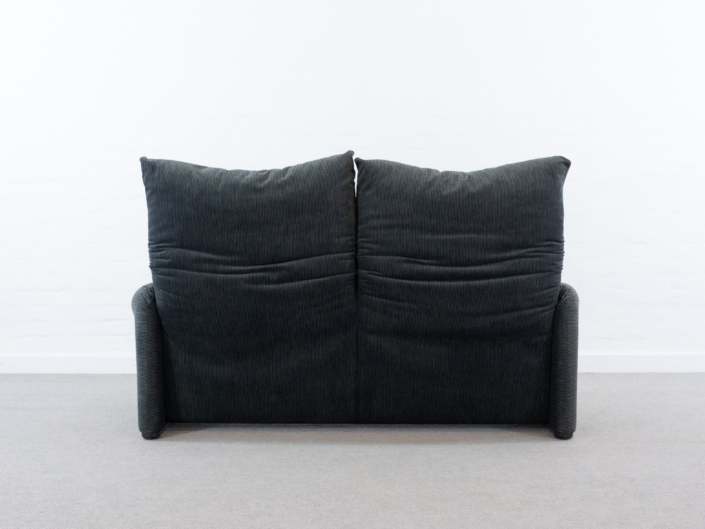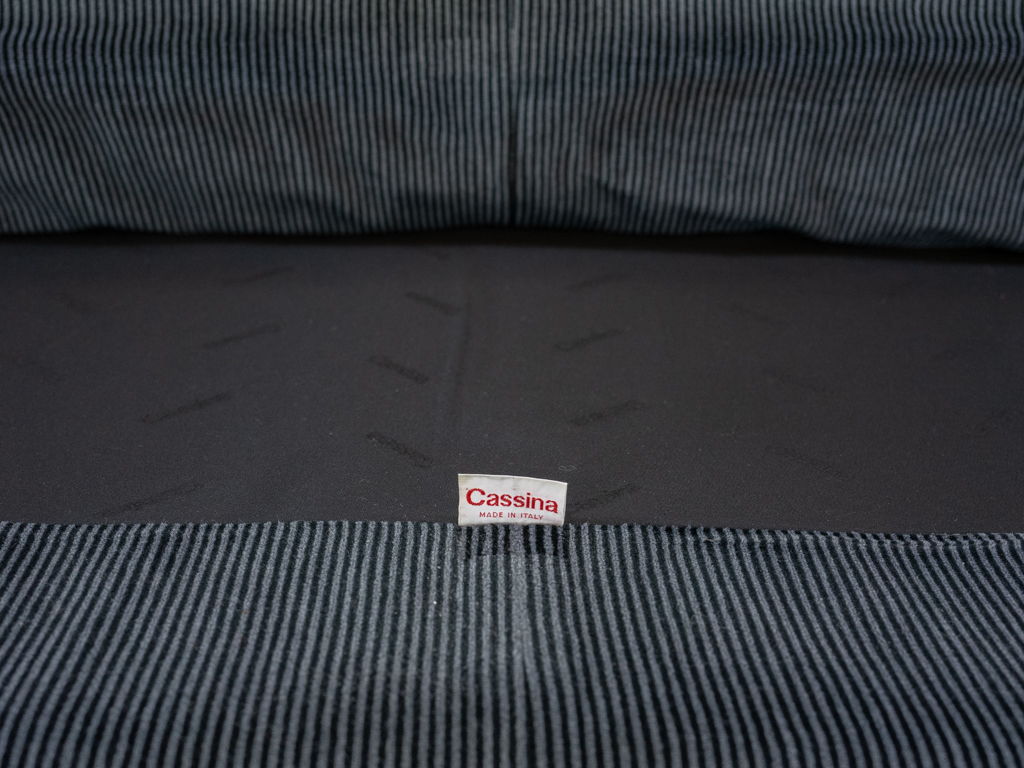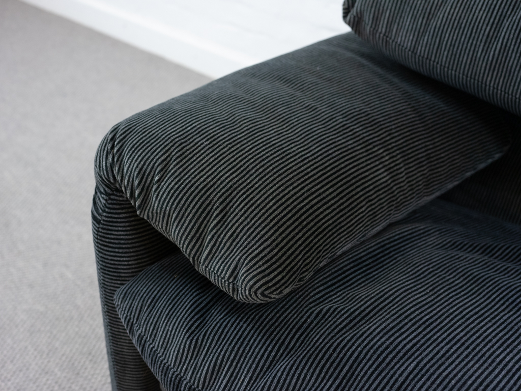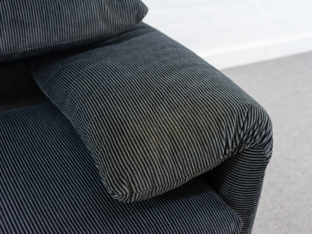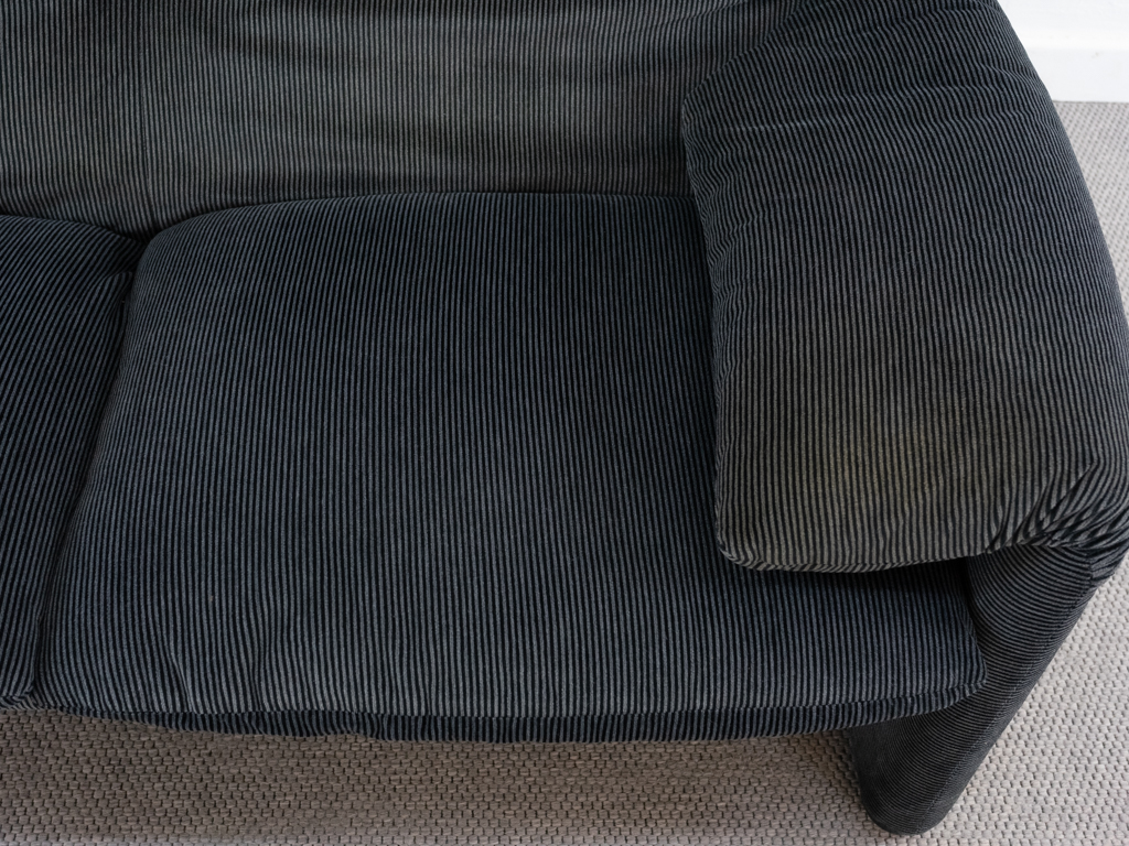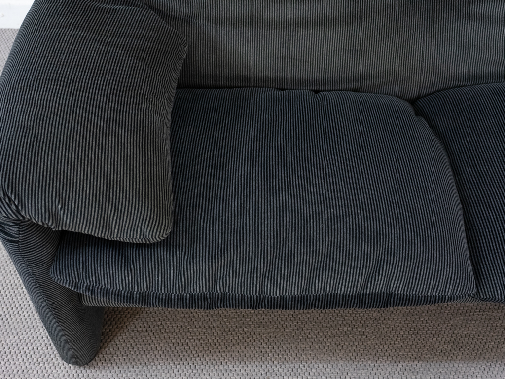Maralunga 2-seat Sofa designed 1973 by Vico Magistretti for Cassina, Italy. The sofa is upholstered in its original grey-blue striped fabrics. Width: 165cm. Non-Smoking Object. Labeled with Cassina Tag and Cassina print in lower fabrics. Good Condition. Signs of use and age. Slight discoloration on right headrest. Can only be seen when backrest is upward folded.