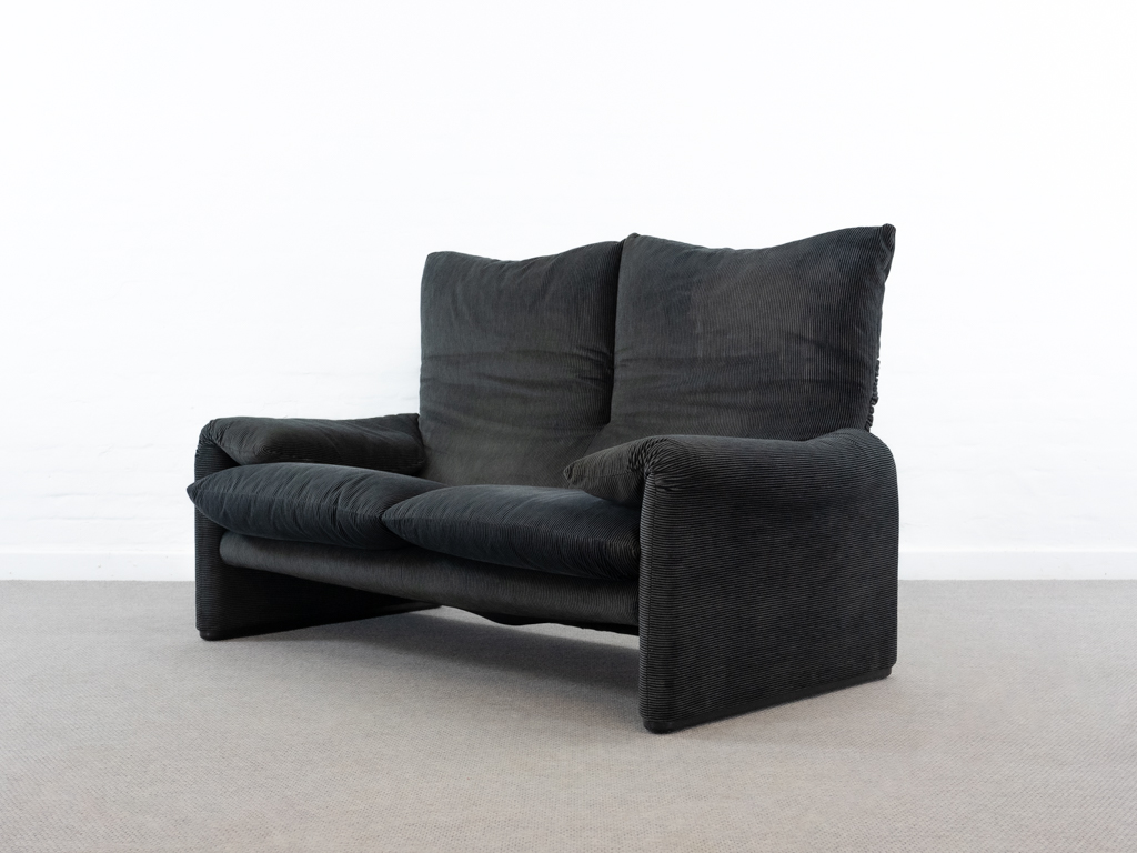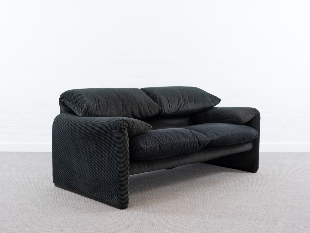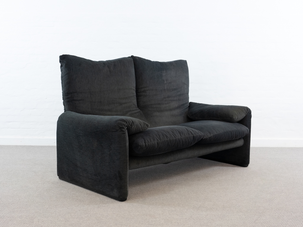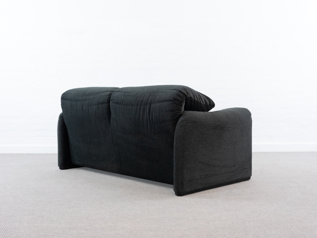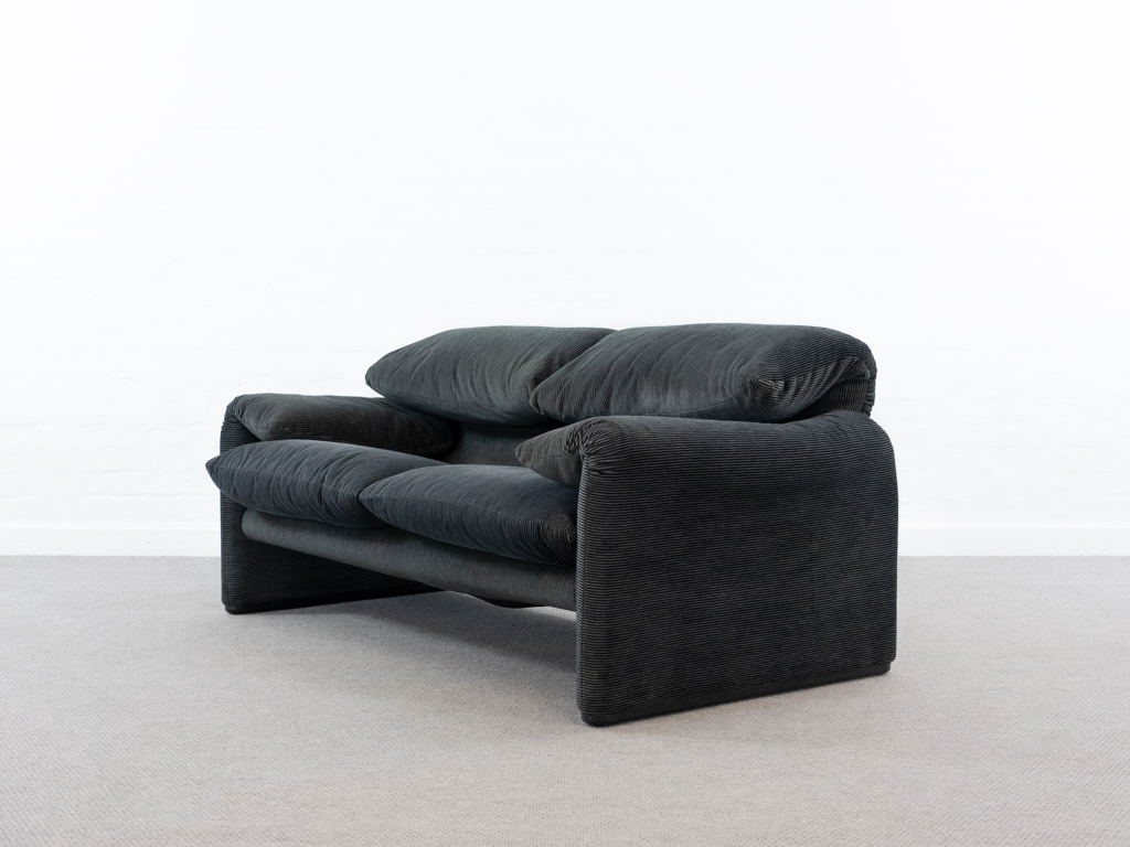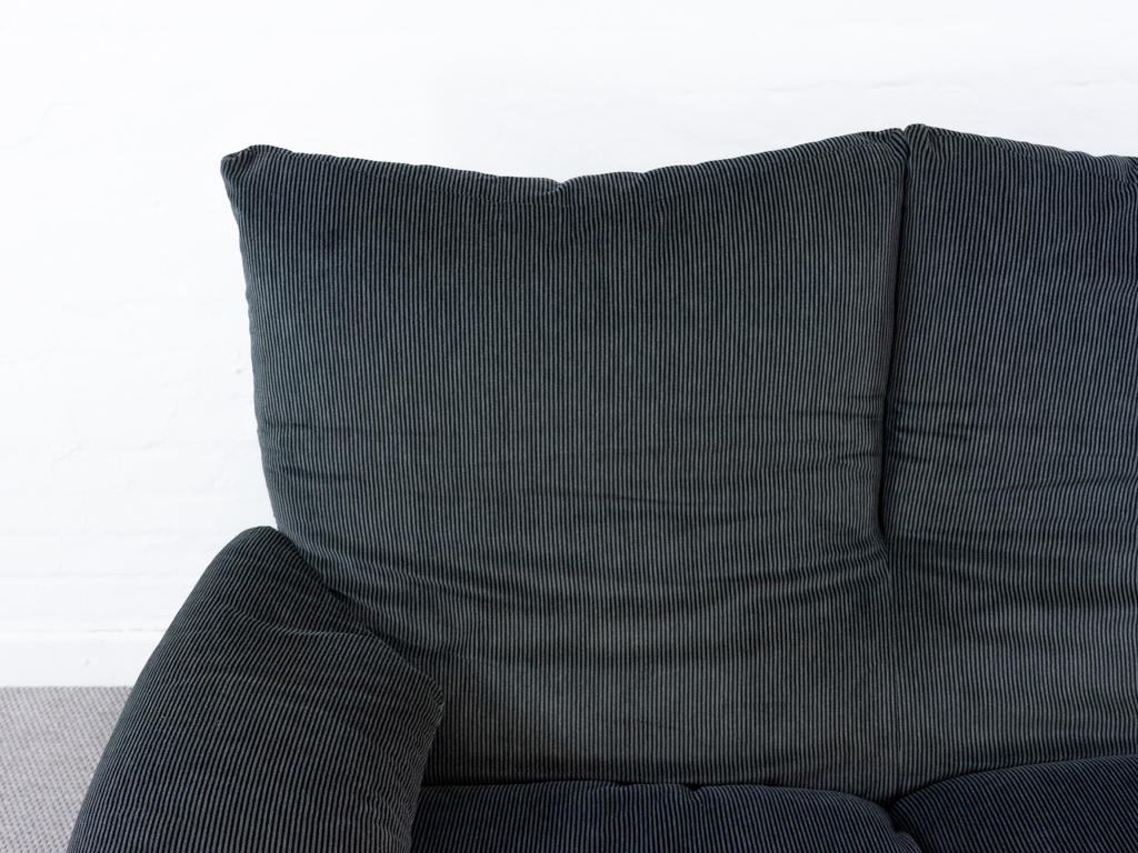 Maralunga 2-seat Sofa designed 1973 by Vico Magistretti for Cassina, Italy. The sofa is upholstered in its original grey-blue striped fabrics. Width: 165cm. Non-Smoking Object. Labeled with Cassina Tag and Cassina print in lower fabrics. Good Condition. Signs of use and age. Slight discoloration on right headrest. Can only be seen when backrest is upward folded.
