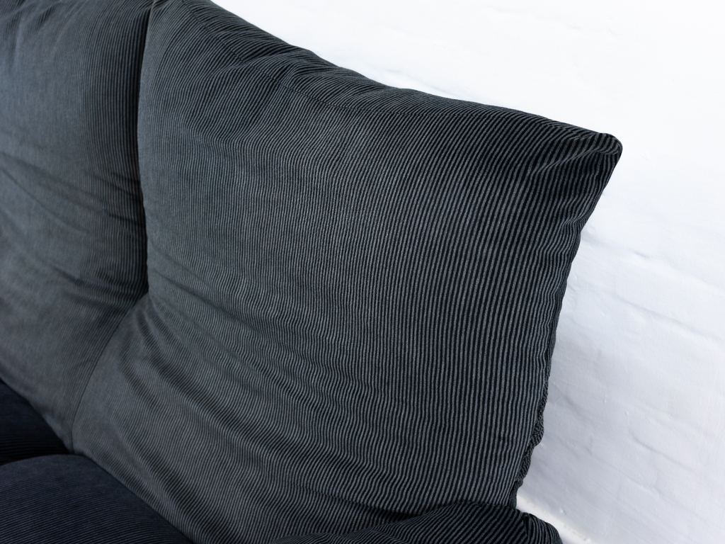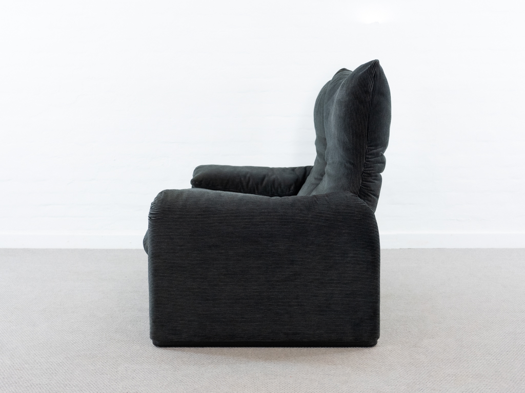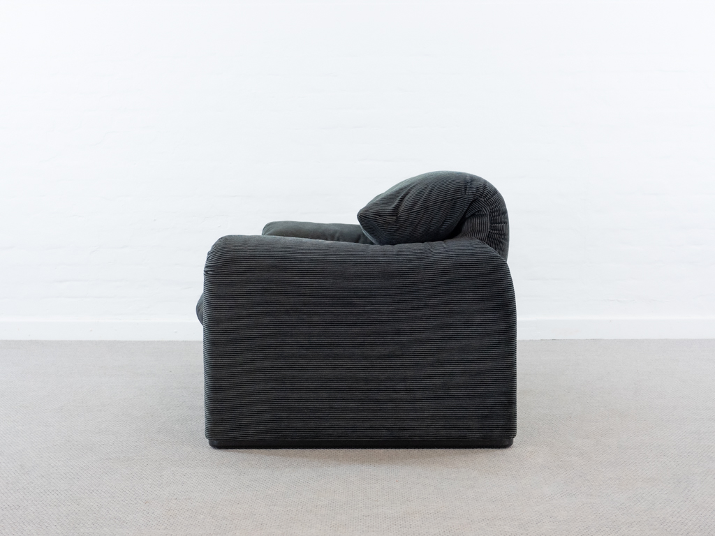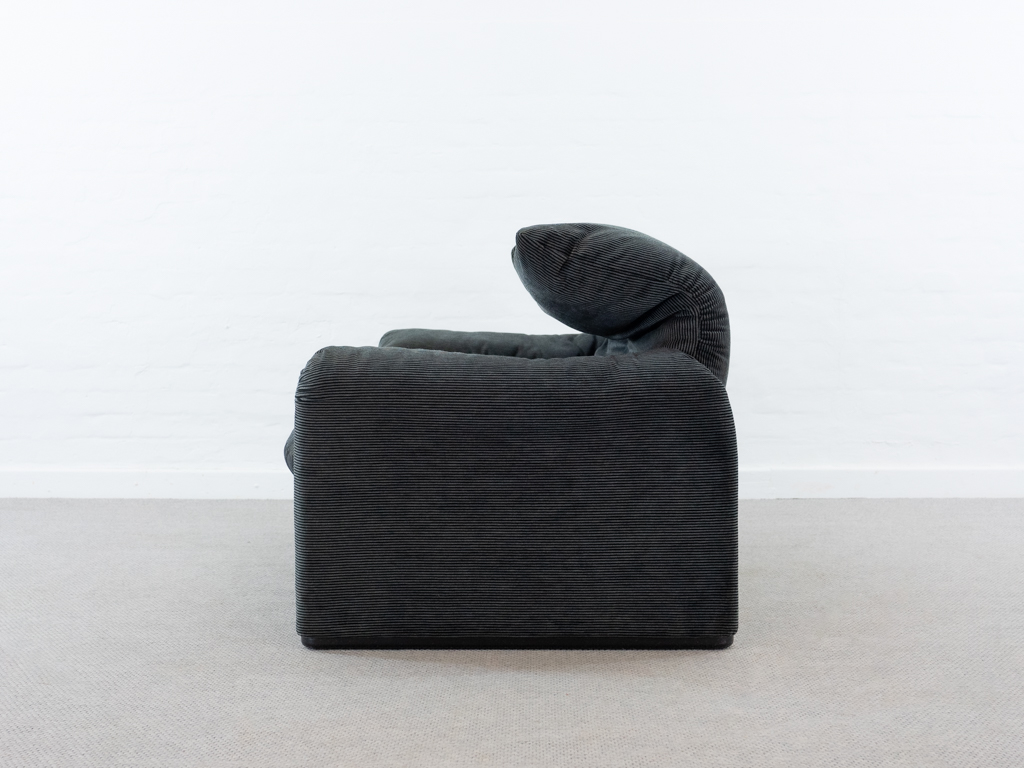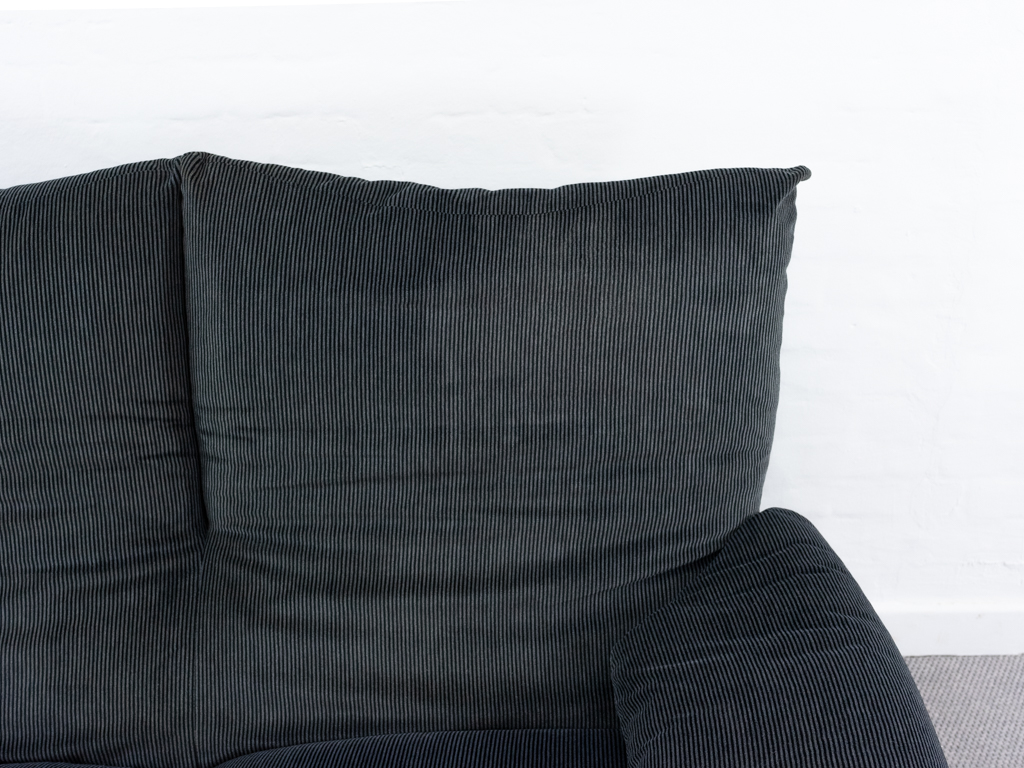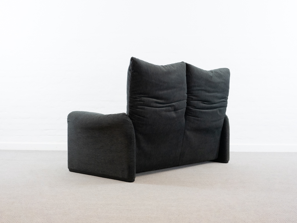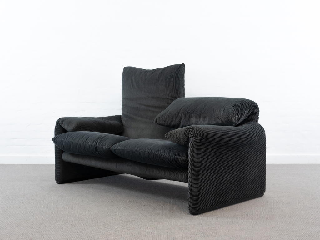 Maralunga 2-seat Sofa designed 1973 by Vico Magistretti for Cassina, Italy. The sofa is upholstered in its original grey-blue striped fabrics. Width: 165cm. Non-Smoking Object. Labeled with Cassina Tag and Cassina print in lower fabrics. Good Condition. Signs of use and age. Slight discoloration on right headrest. Can only be seen when backrest is upward folded.