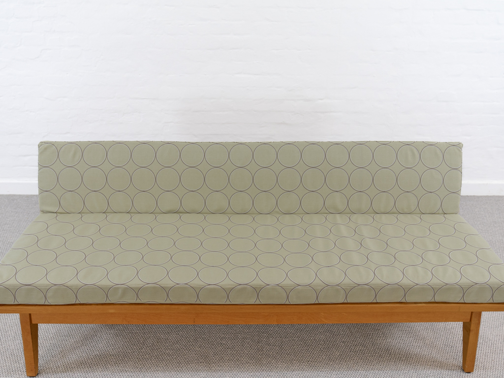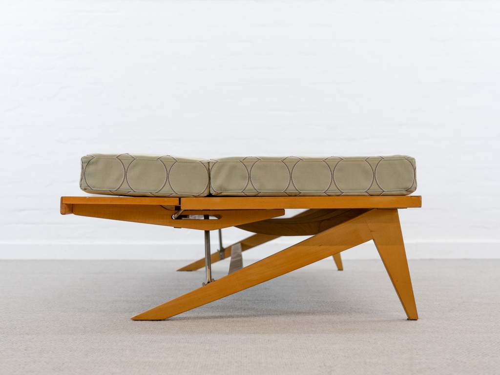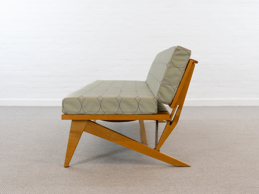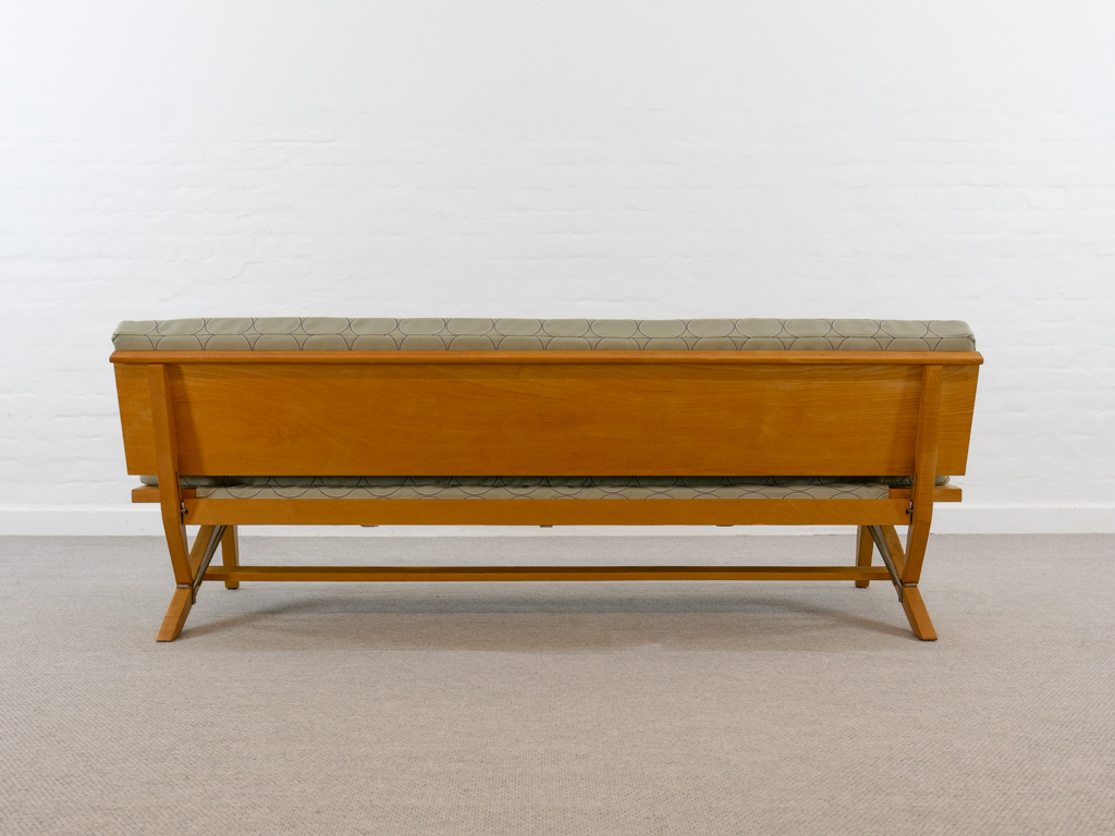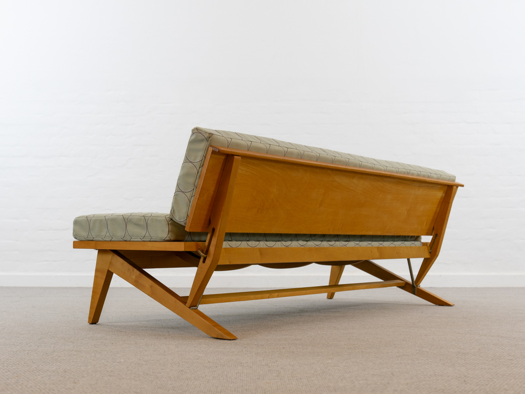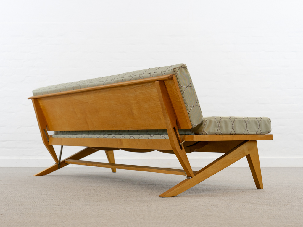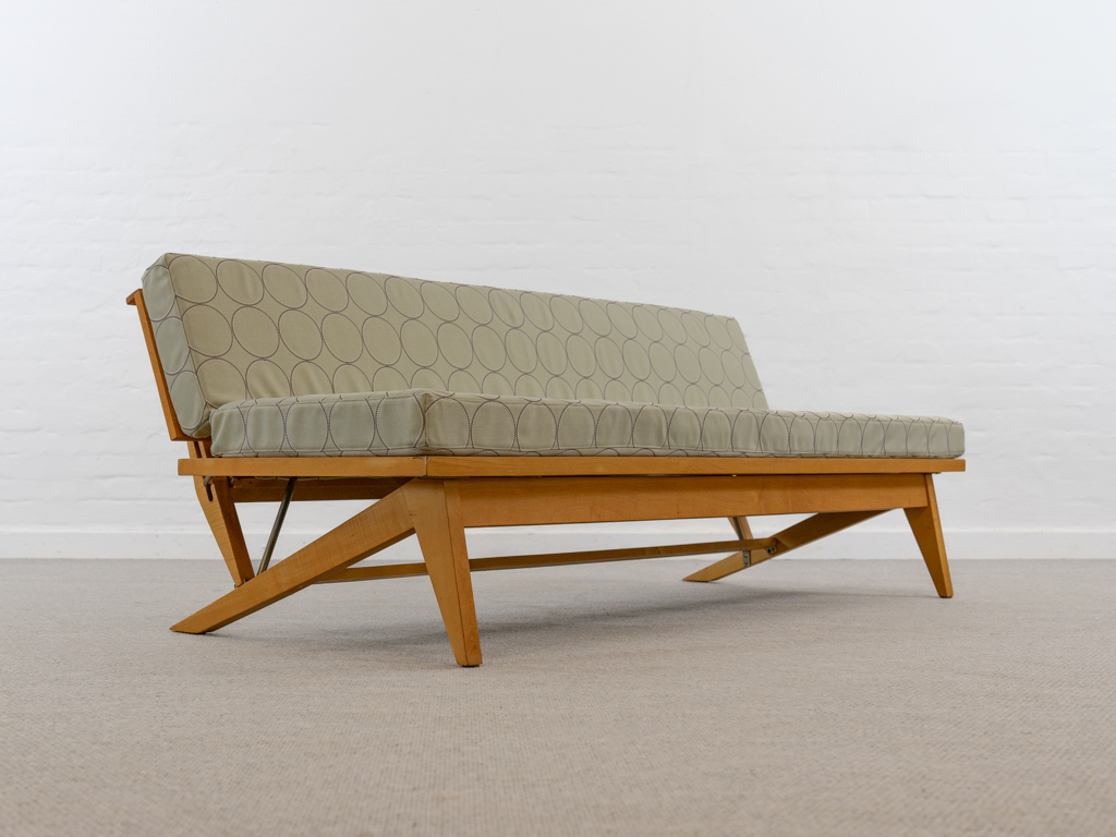 Domus KG sofa bed from the 50s. Great constructive design that shows the design visions and innovative power of the economic miracle years. By means of a simple yet ingenious mechanism, the backrests can be folded down and the sofa transformed into a comfortable reclining surface. The sofa was reupholstered by the previous owner. The circular ornaments on the upholstery fabric are embroidered. The sofa frame is made of beech wood. Signs of use on the wood typical of its age, small abrasion on the front left. Dimensions: W. 190cm, H. 72cm, D. 76cm, seat height: 42cm. Non-smoking object.