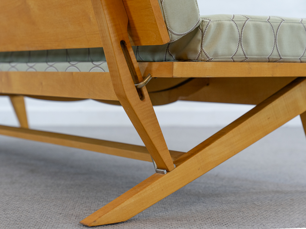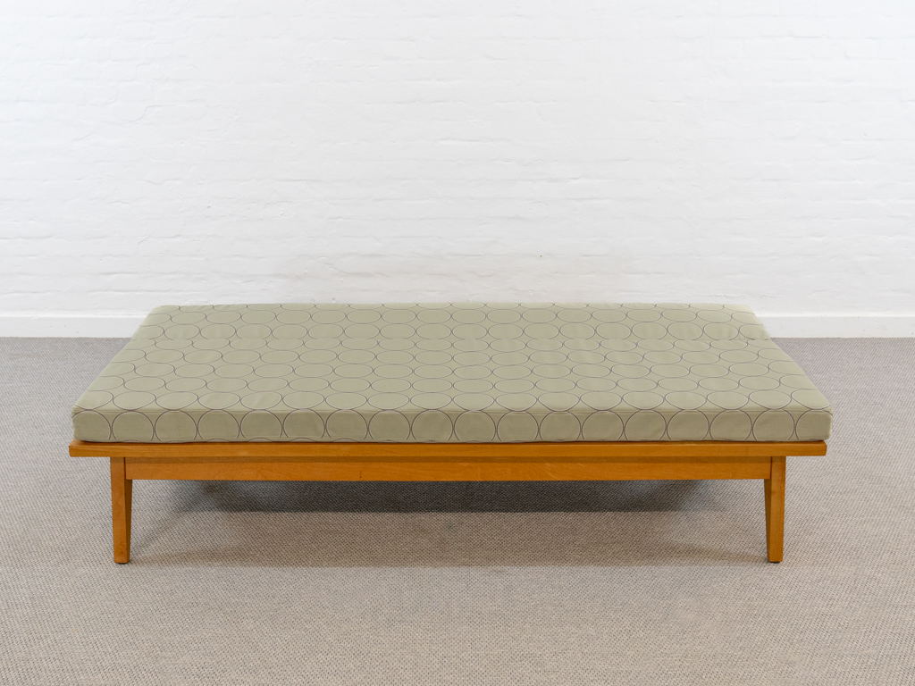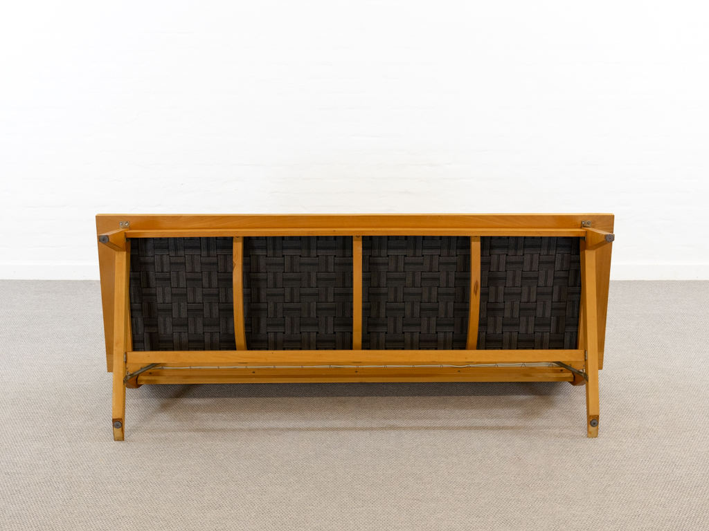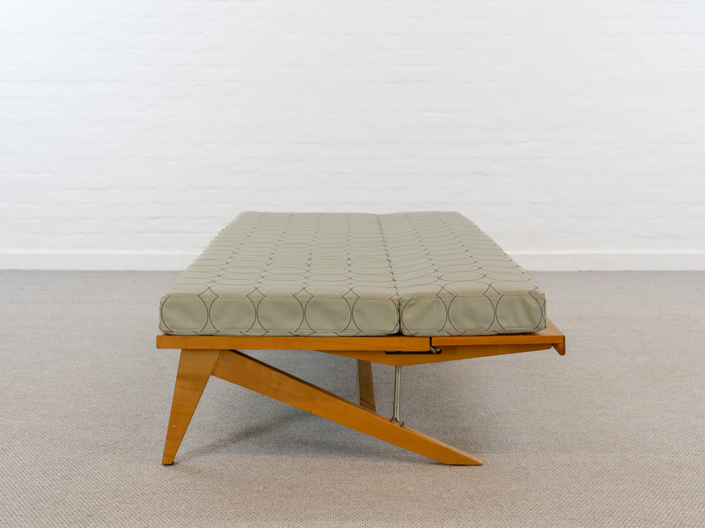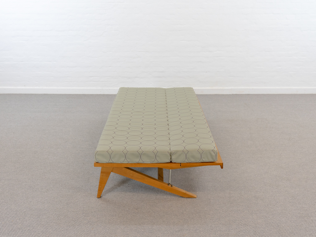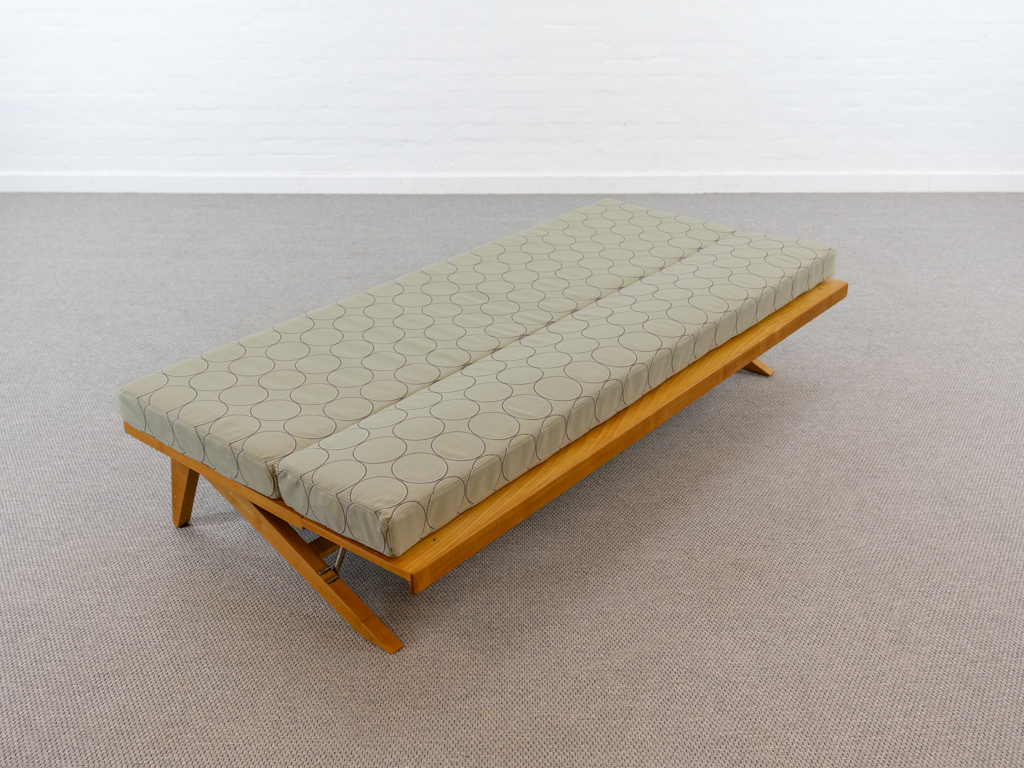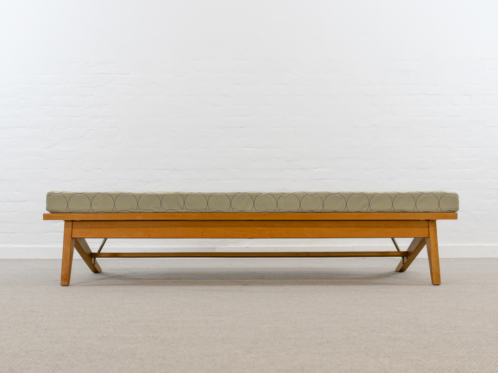 Domus KG sofa bed from the 50s. Great constructive design that shows the design visions and innovative power of the economic miracle years. By means of a simple yet ingenious mechanism, the backrests can be folded down and the sofa transformed into a comfortable reclining surface. The sofa was reupholstered by the previous owner. The circular ornaments on the upholstery fabric are embroidered. The sofa frame is made of beech wood. Signs of use on the wood typical of its age, small abrasion on the front left. Dimensions: W. 190cm, H. 72cm, D. 76cm, seat height: 42cm. Non-smoking object.