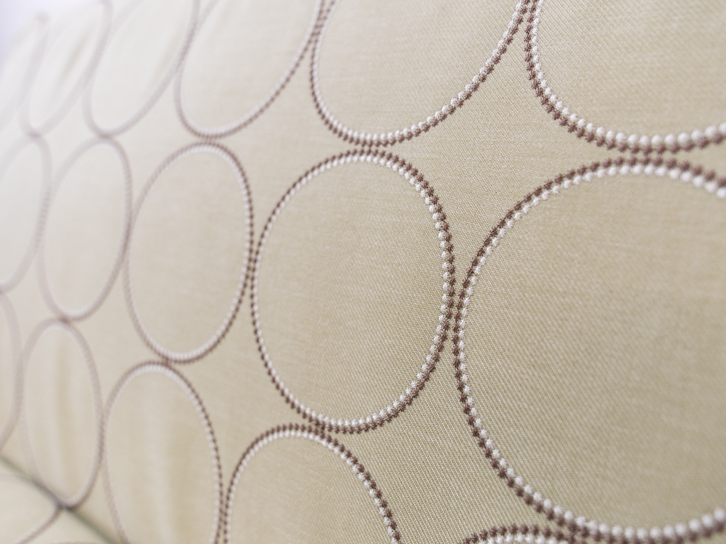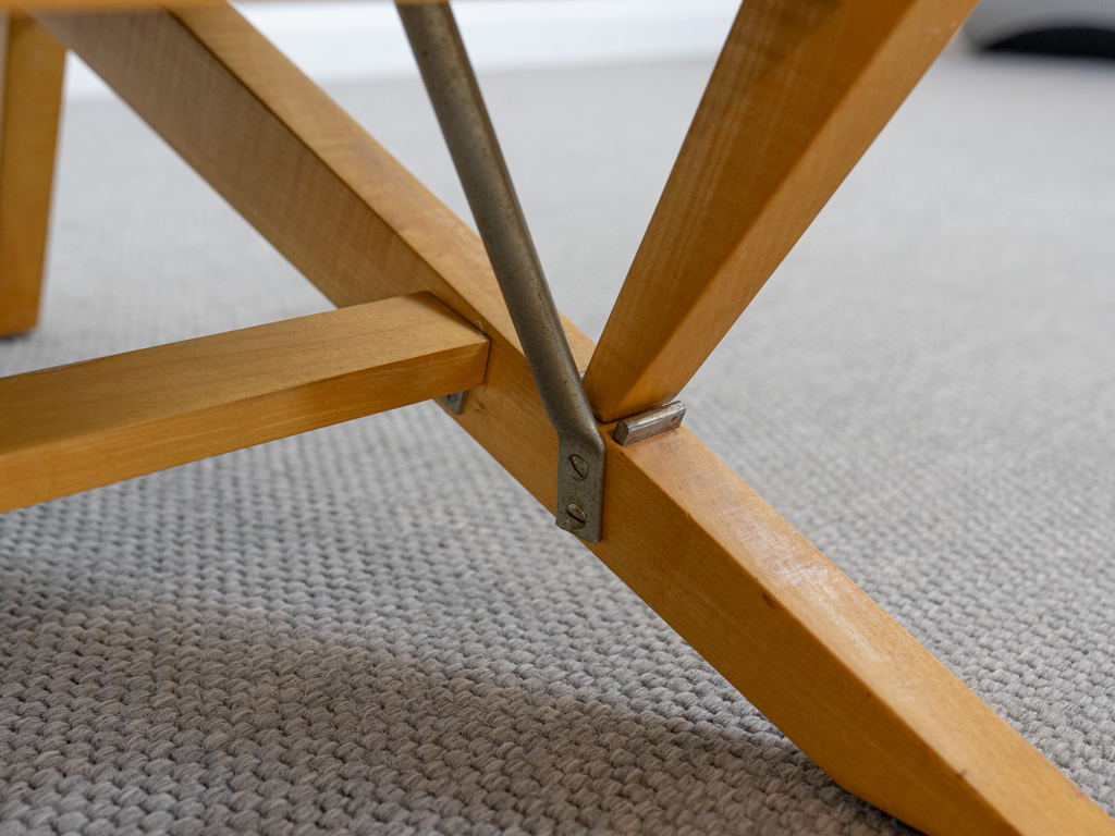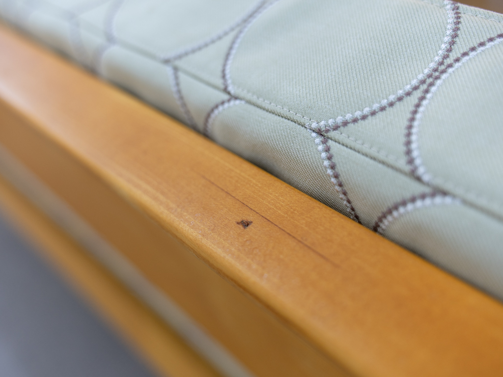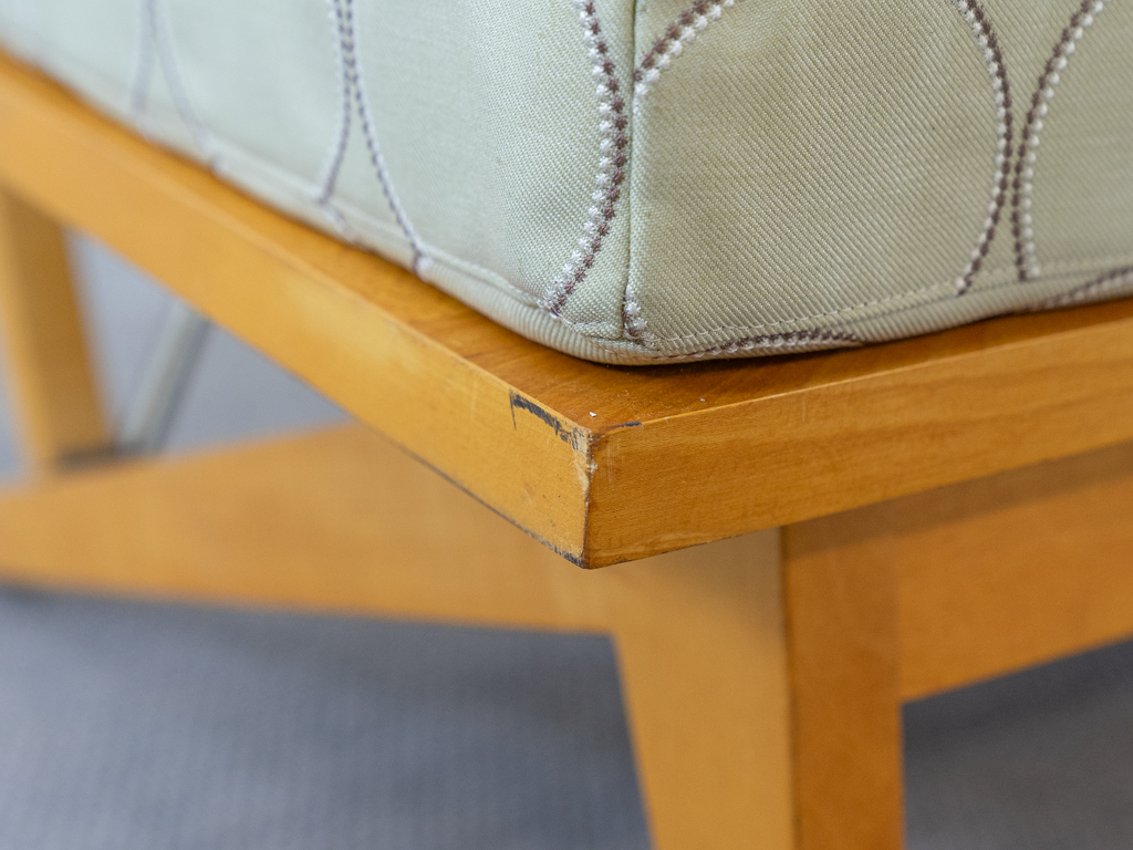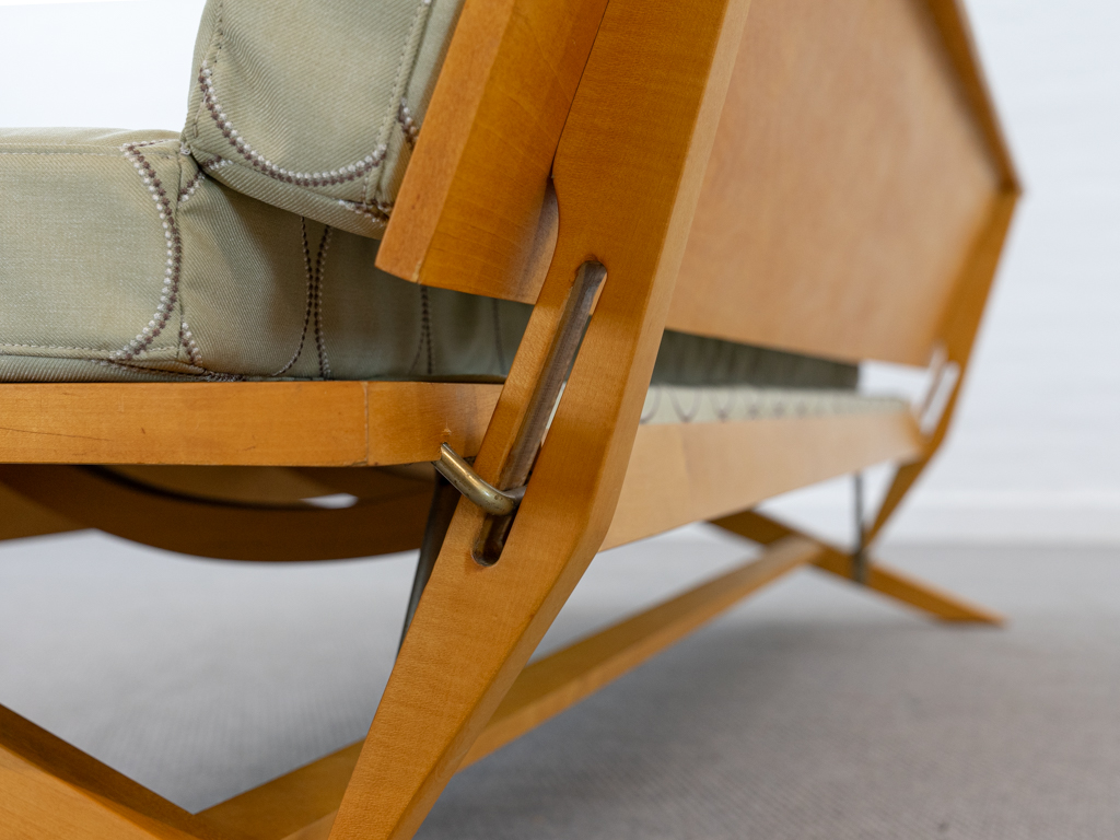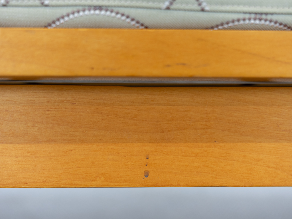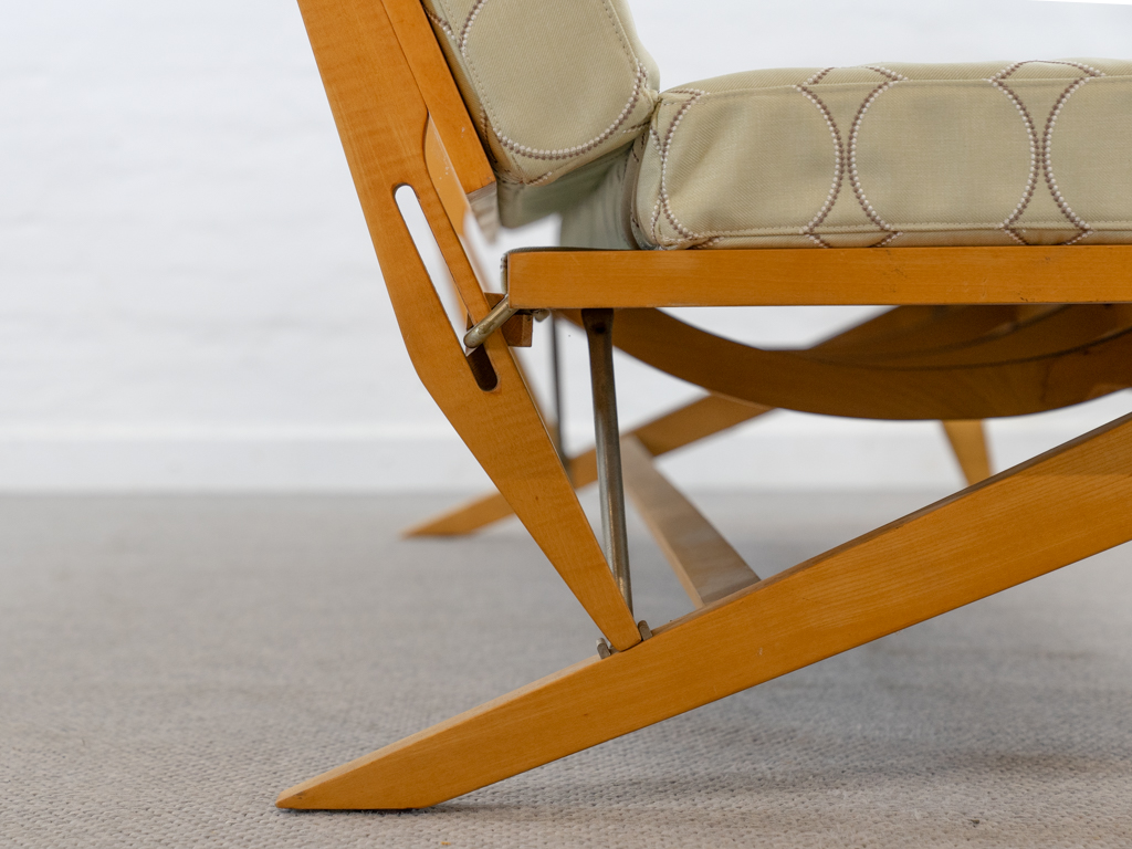 Domus KG sofa bed from the 50s. Great constructive design that shows the design visions and innovative power of the economic miracle years. By means of a simple yet ingenious mechanism, the backrests can be folded down and the sofa transformed into a comfortable reclining surface. The sofa was reupholstered by the previous owner. The circular ornaments on the upholstery fabric are embroidered. The sofa frame is made of beech wood. Signs of use on the wood typical of its age, small abrasion on the front left. Dimensions: W. 190cm, H. 72cm, D. 76cm, seat height: 42cm. Non-smoking object.