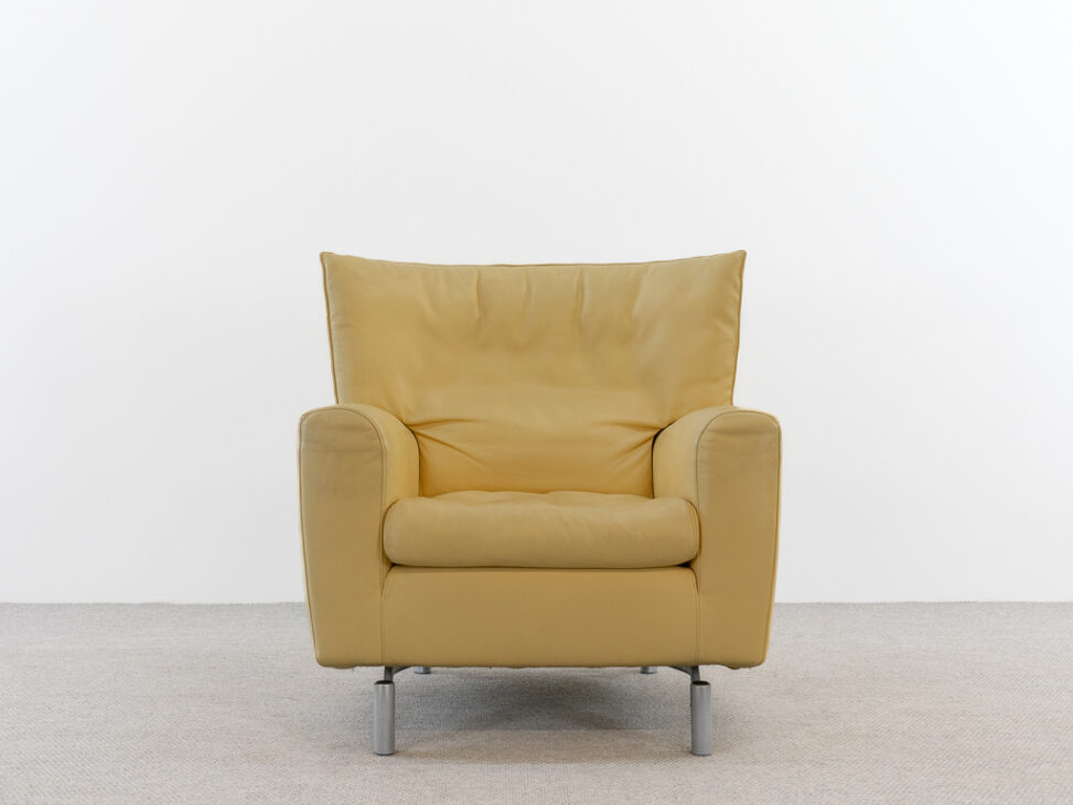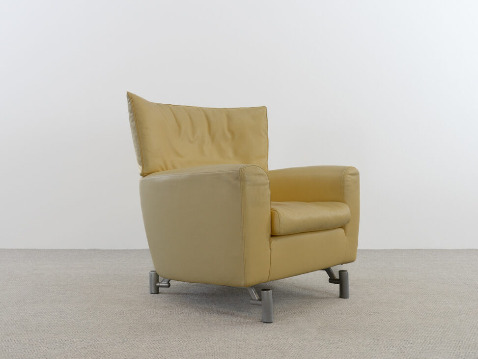 Armchair, “Drop” model, designed by Gerard Van den Berg for Molteni & C. 1990s. Upholstered in original light yellow leather. Manufacturer’s mark on the base. This armchair captivates with its organic, soft form and combines timeless design with comfort and high-quality craftsmanship. Original booklet/product information included. Dimensions: W 90 cm, H 90 cm, D 85 cm; current seat height approx. 42 cm. What makes this armchair special is that the legs can be adjusted using an Allen wrench, allowing the effective seat height to be changed by 2 cm. Good used condition; non-smoking item.