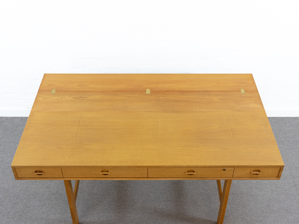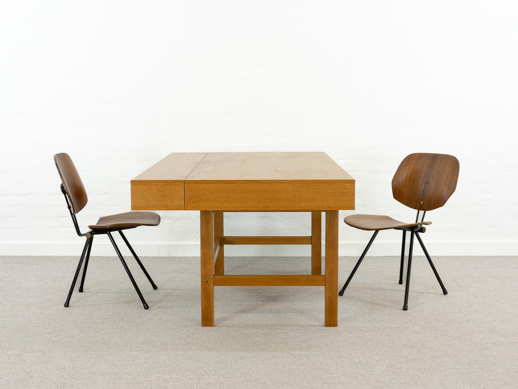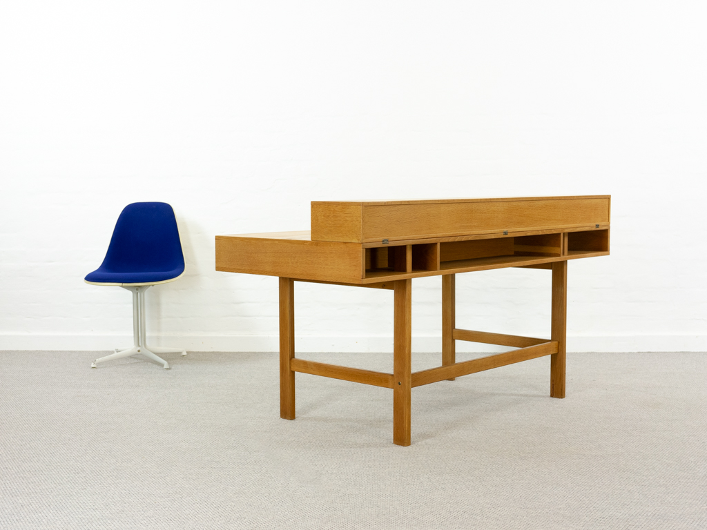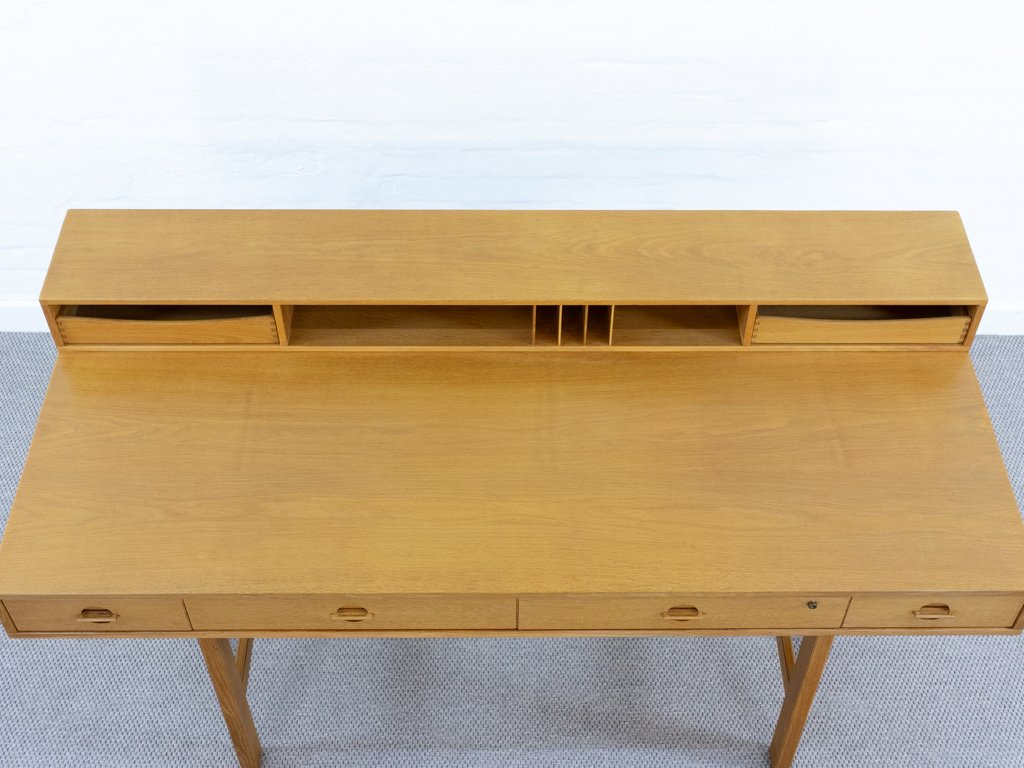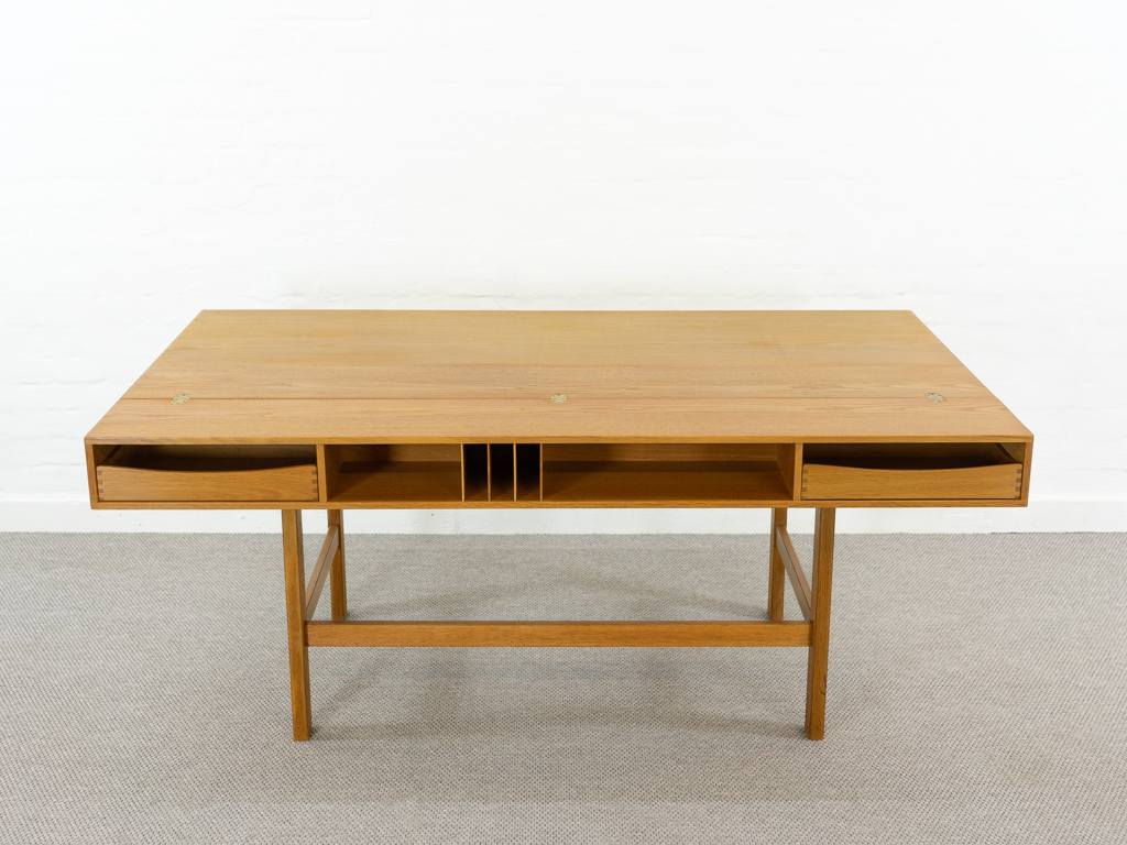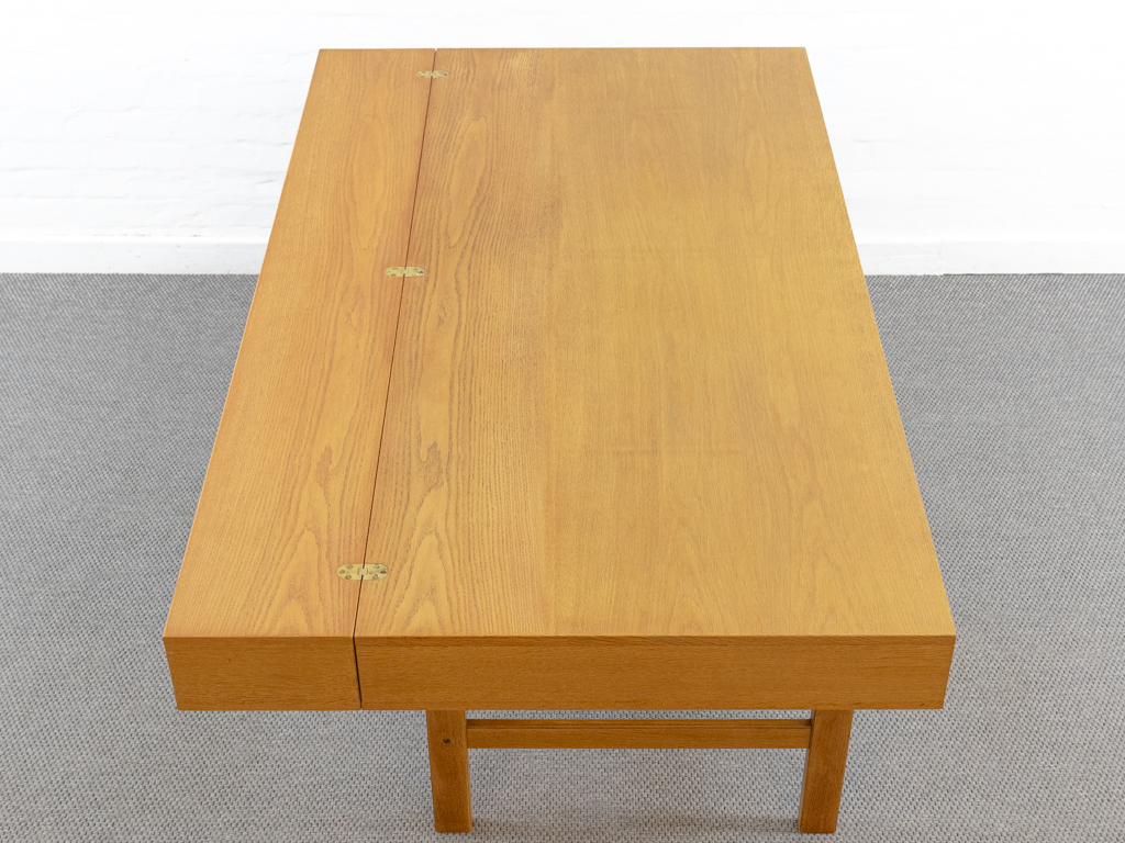 Flip-Top Desk by Jens Quistgaard for Peter Løvig Nielsen, Denmark. A top example of the mid century danish design movement. The top piece/shelf is hinged and the table can be converted in a larger working table-top for 2 people. The table is executed in oakwood. Labeled underneath with Lovig stamp and year of manufacture (1970). Very good condition. The chairs which are shown are not part of this offer.